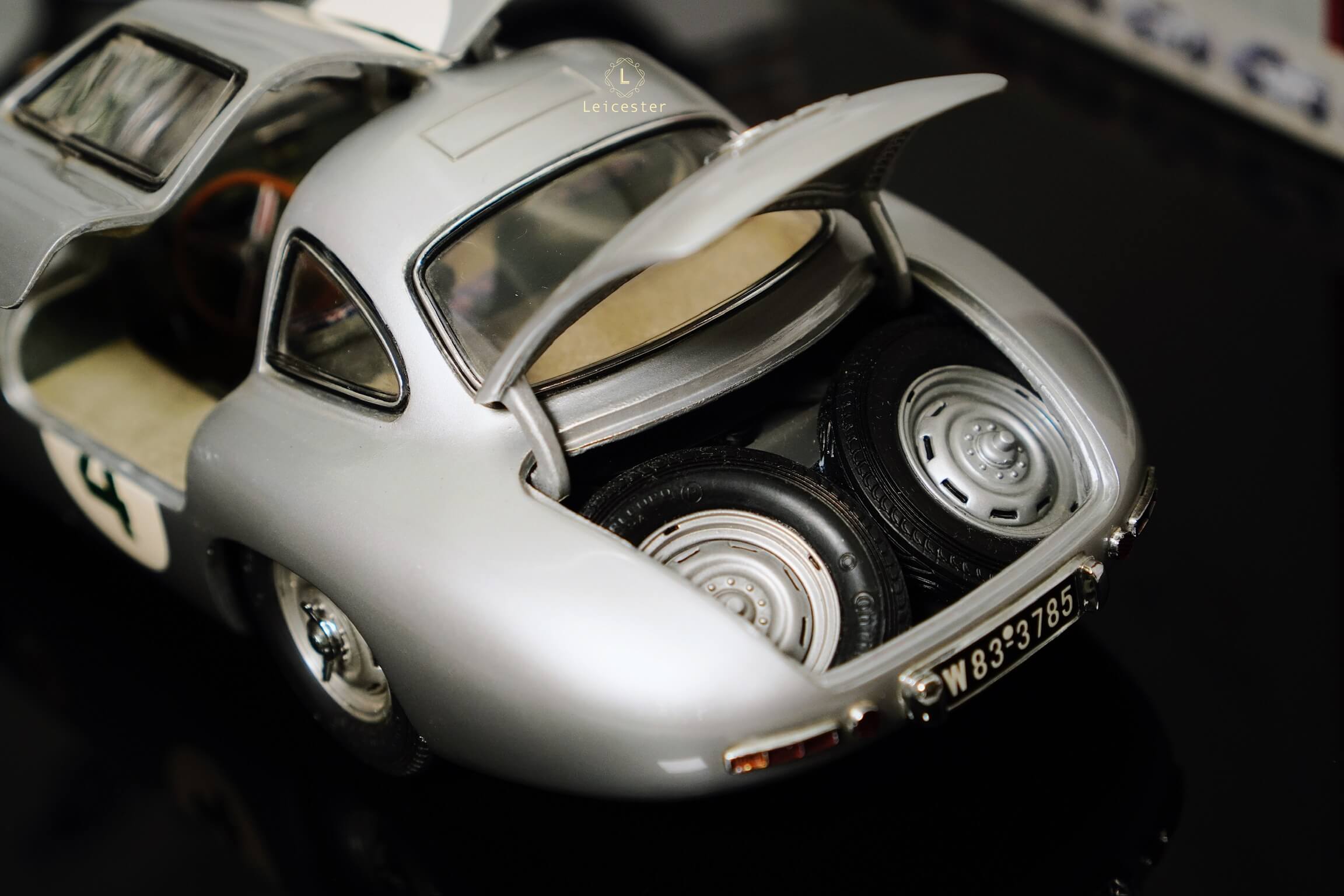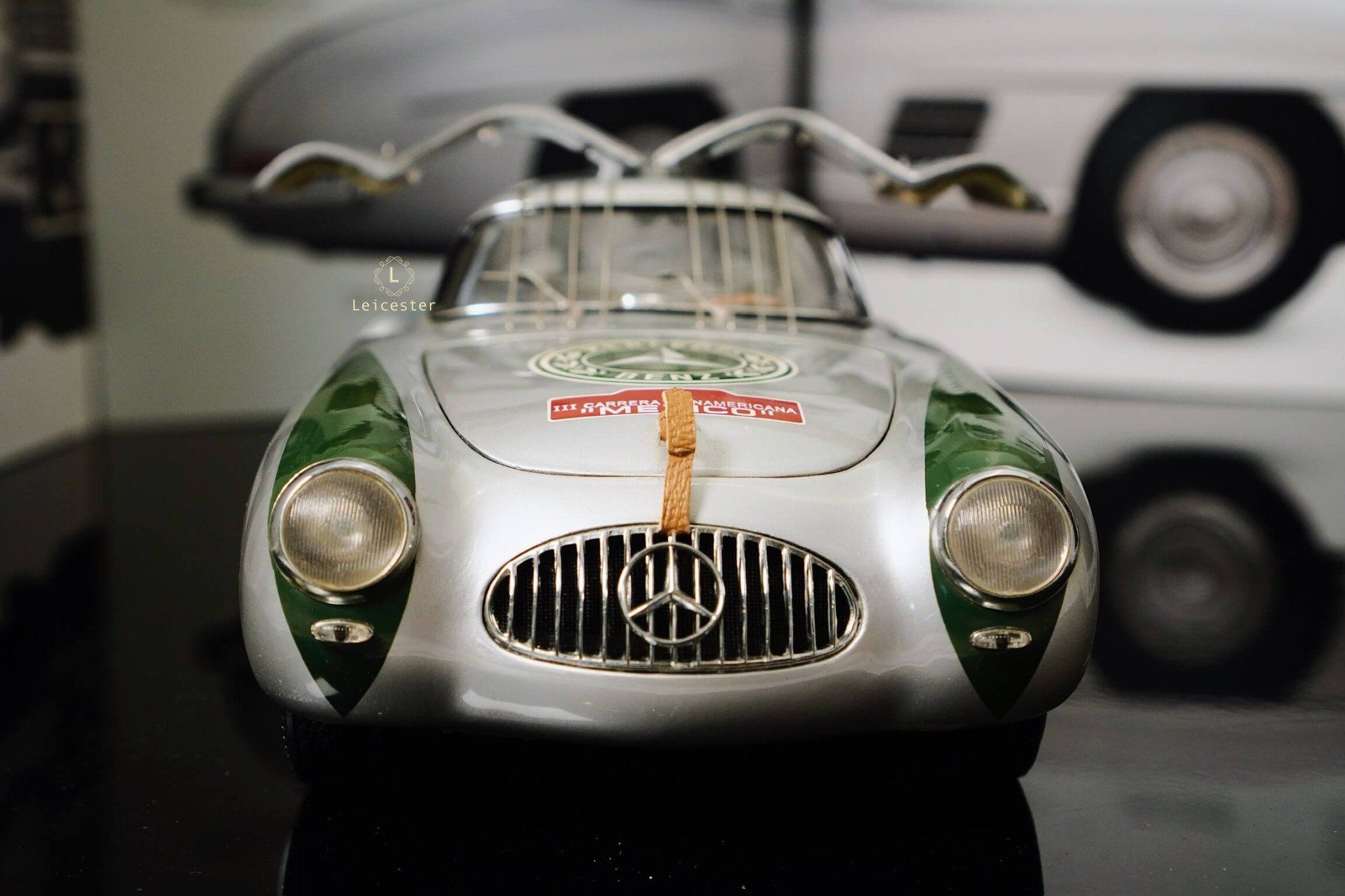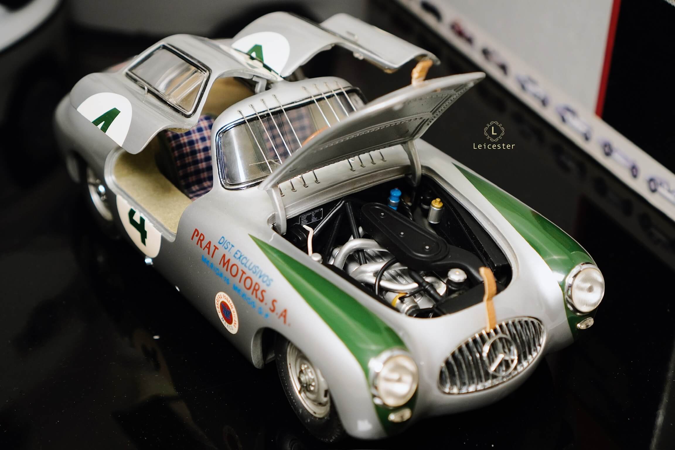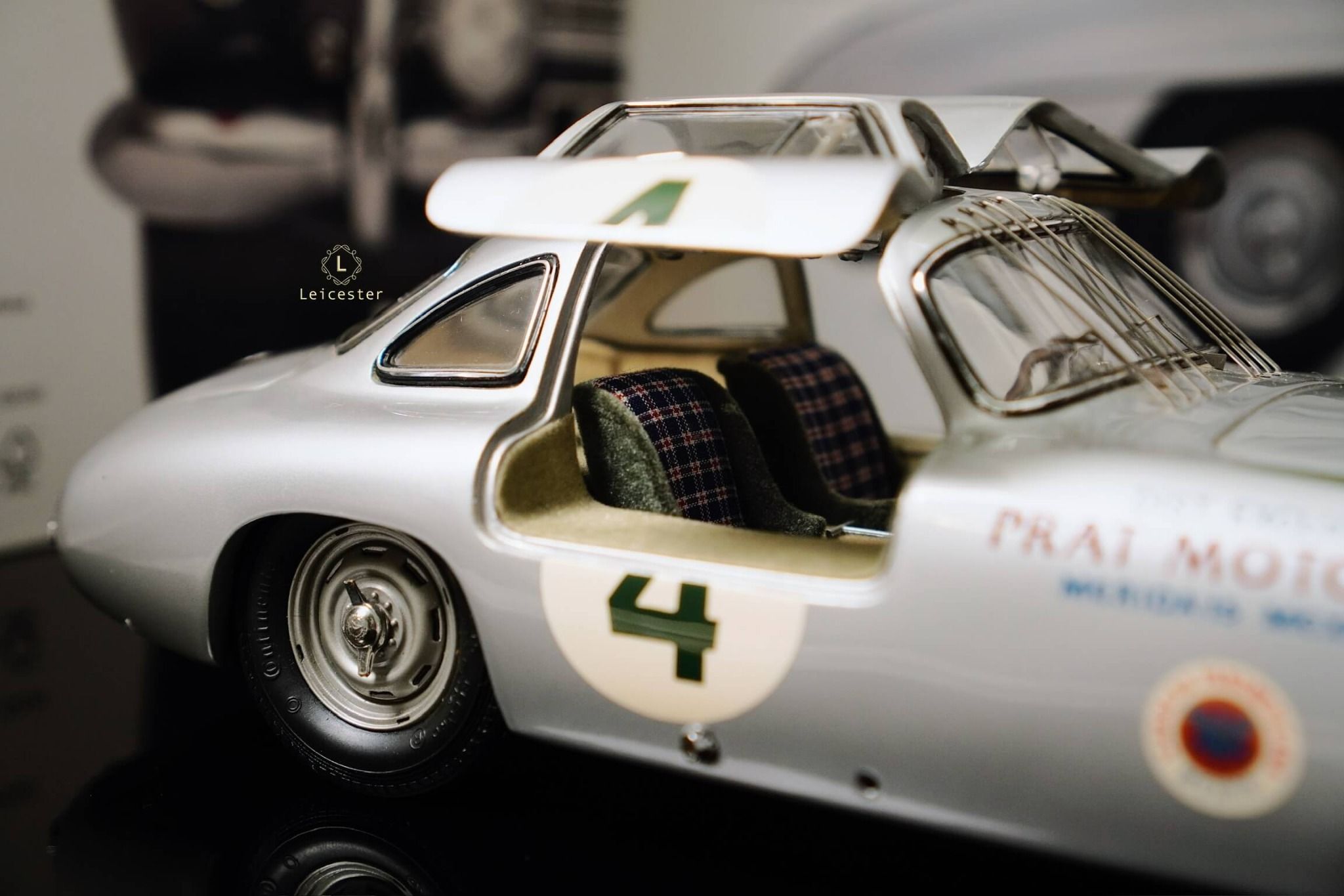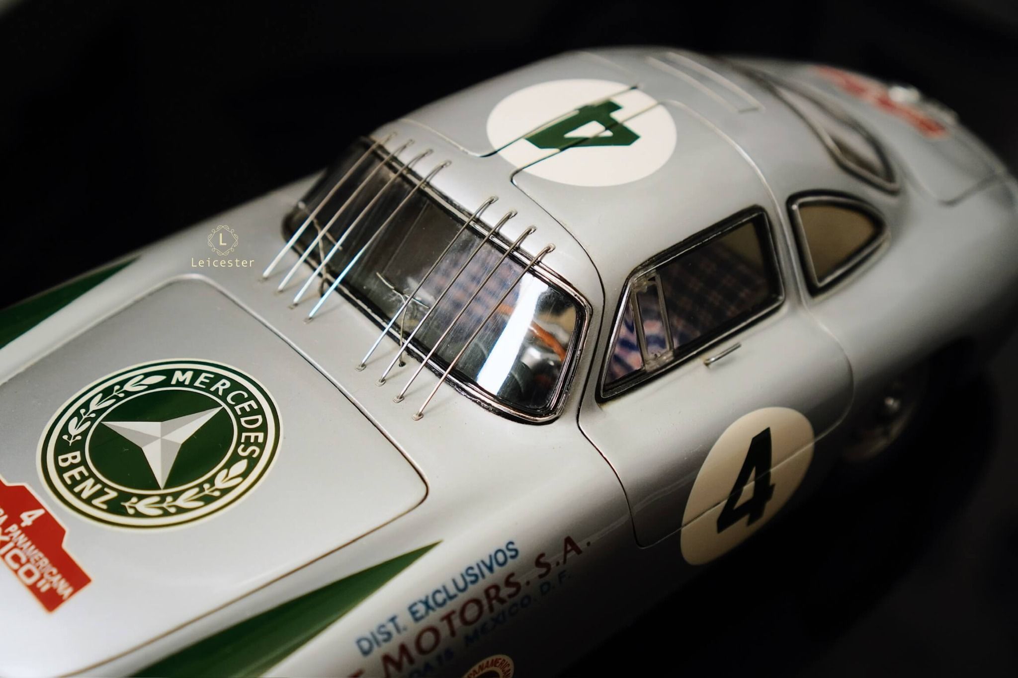 Khoác lên mình lớp sơn bạc ánh kim biểu trưng cho đội đua Mercedes, chiếc mô hình mang tem số “4” cùng logo Prat Motors S.A. – Mexico D.F., gợi nhớ tinh thần Panamericana 1952 huyền thoại. Cánh cửa “gullwing” mở lên nhẹ nhàng phô bày nội thất vải caro cổ điển, từng đường nét, bánh xe, gương và cụm đèn đều được tái hiện chính xác đến từng chi tiết. Khoang hành lý phía sau có thể mở, hé lộ kết cấu cơ khí tinh xảo – minh chứng cho đẳng cấp chế tác thủ công của CMC Đức.