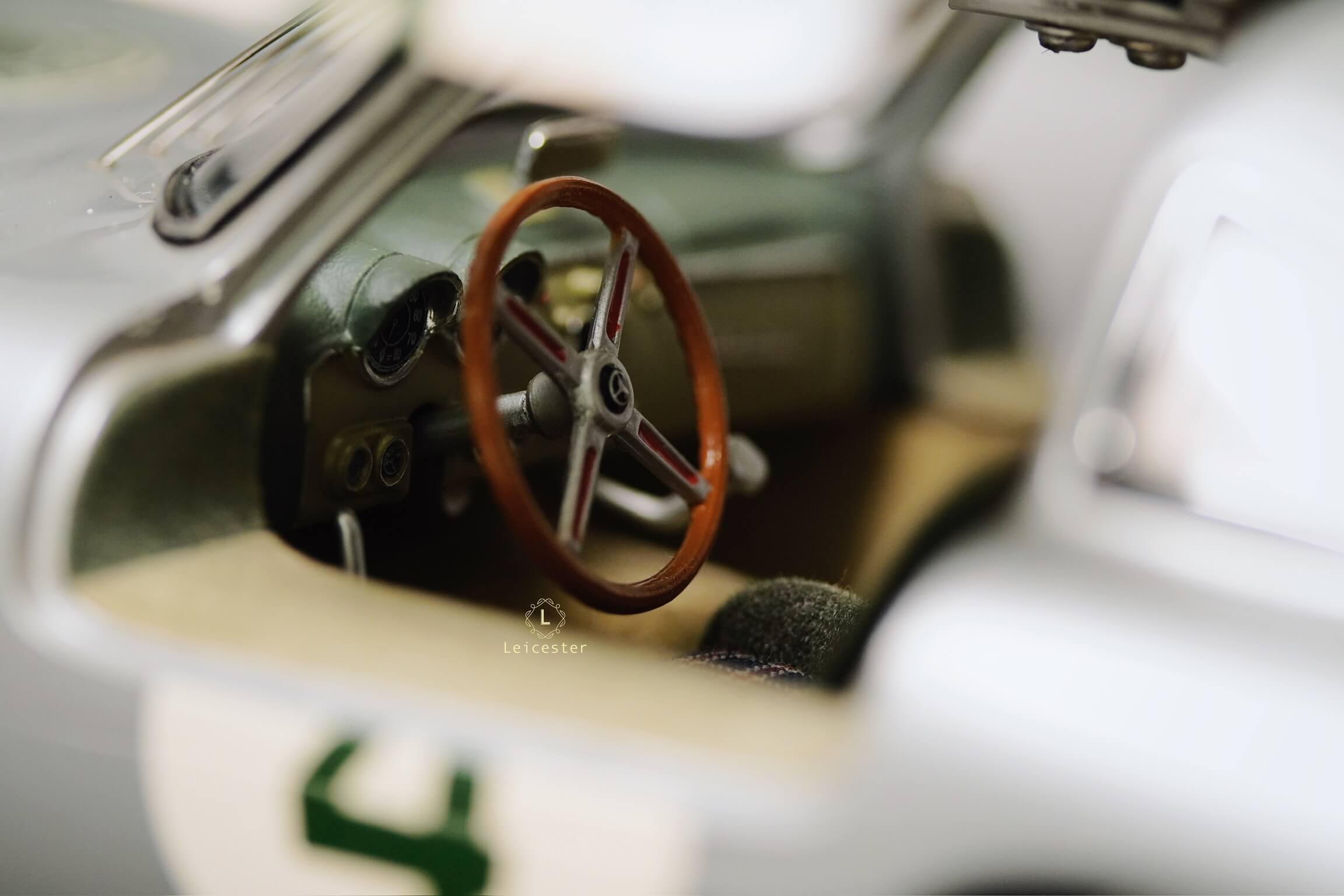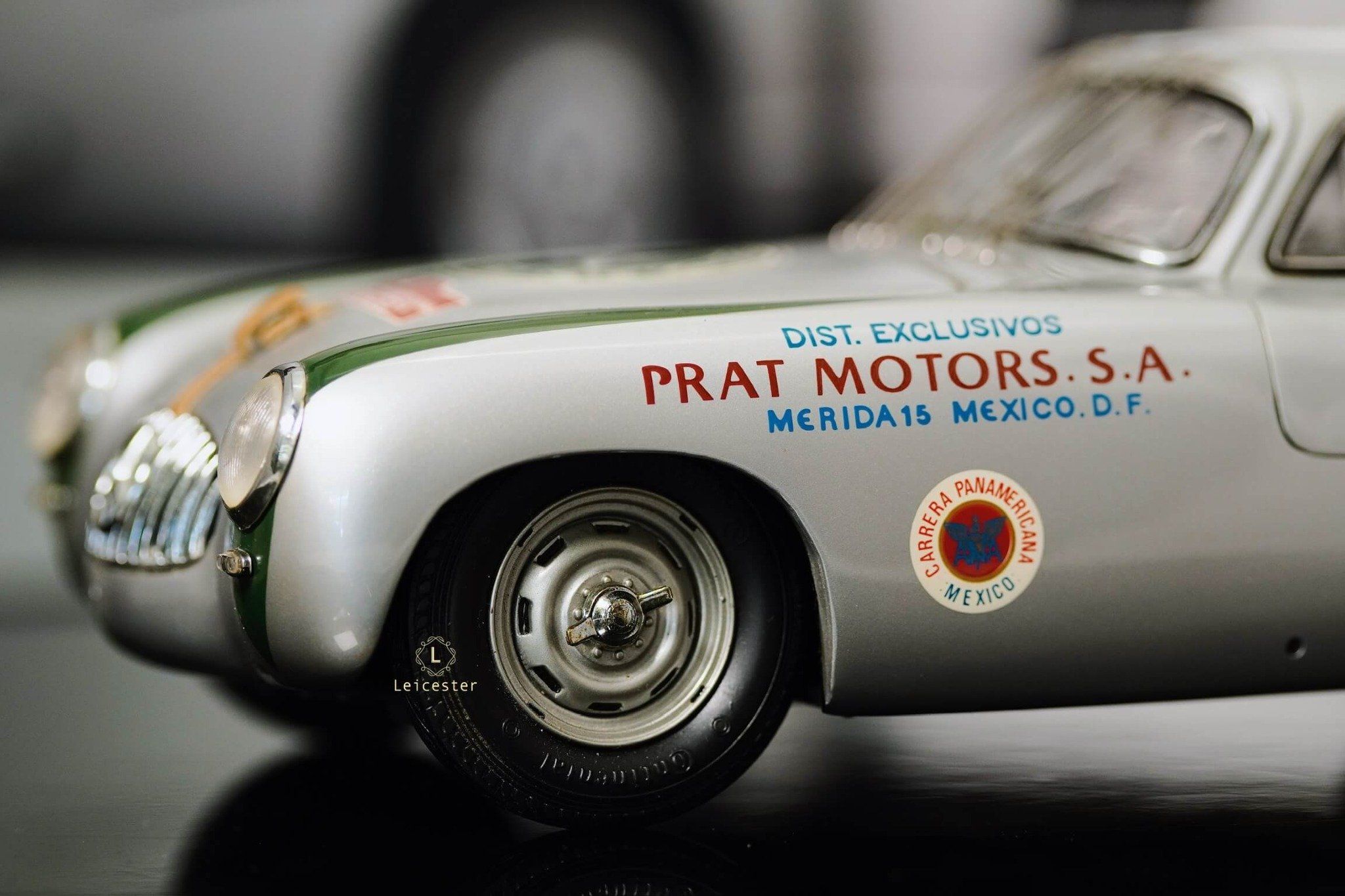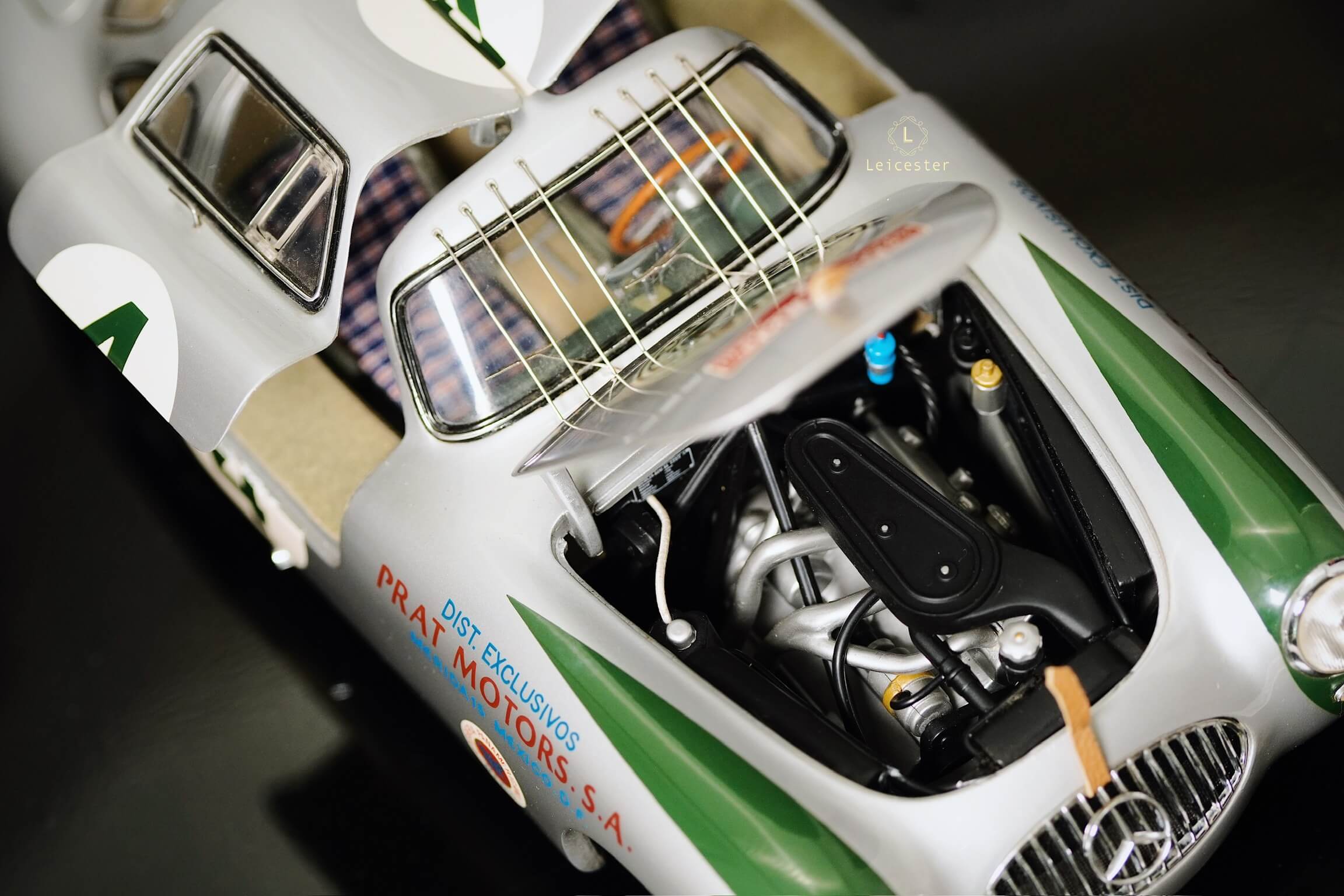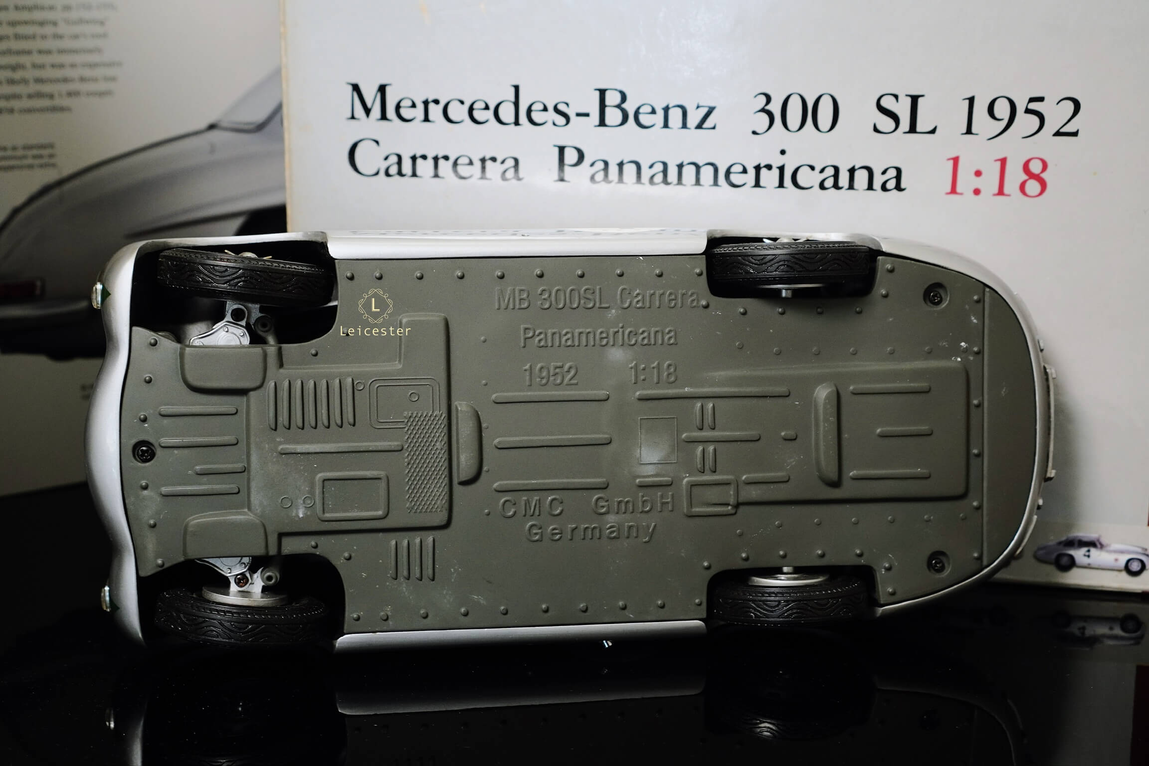 Khoác lên mình lớp sơn bạc ánh kim biểu trưng cho đội đua Mercedes, chiếc mô hình mang tem số “4” cùng logo Prat Motors S.A. – Mexico D.F., gợi nhớ tinh thần Panamericana 1952 huyền thoại. Cánh cửa “gullwing” mở lên nhẹ nhàng phô bày nội thất vải caro cổ điển, từng đường nét, bánh xe, gương và cụm đèn đều được tái hiện chính xác đến từng chi tiết. Khoang hành lý phía sau có thể mở, hé lộ kết cấu cơ khí tinh xảo – minh chứng cho đẳng cấp chế tác thủ công của CMC Đức.