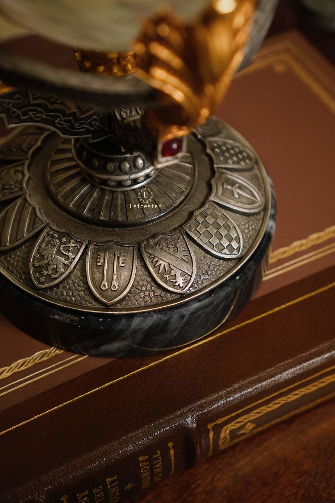 Chất liệu: Thuỷ tinh, thiếc điêu khắc mạ vàng, đá cẩm thạch.