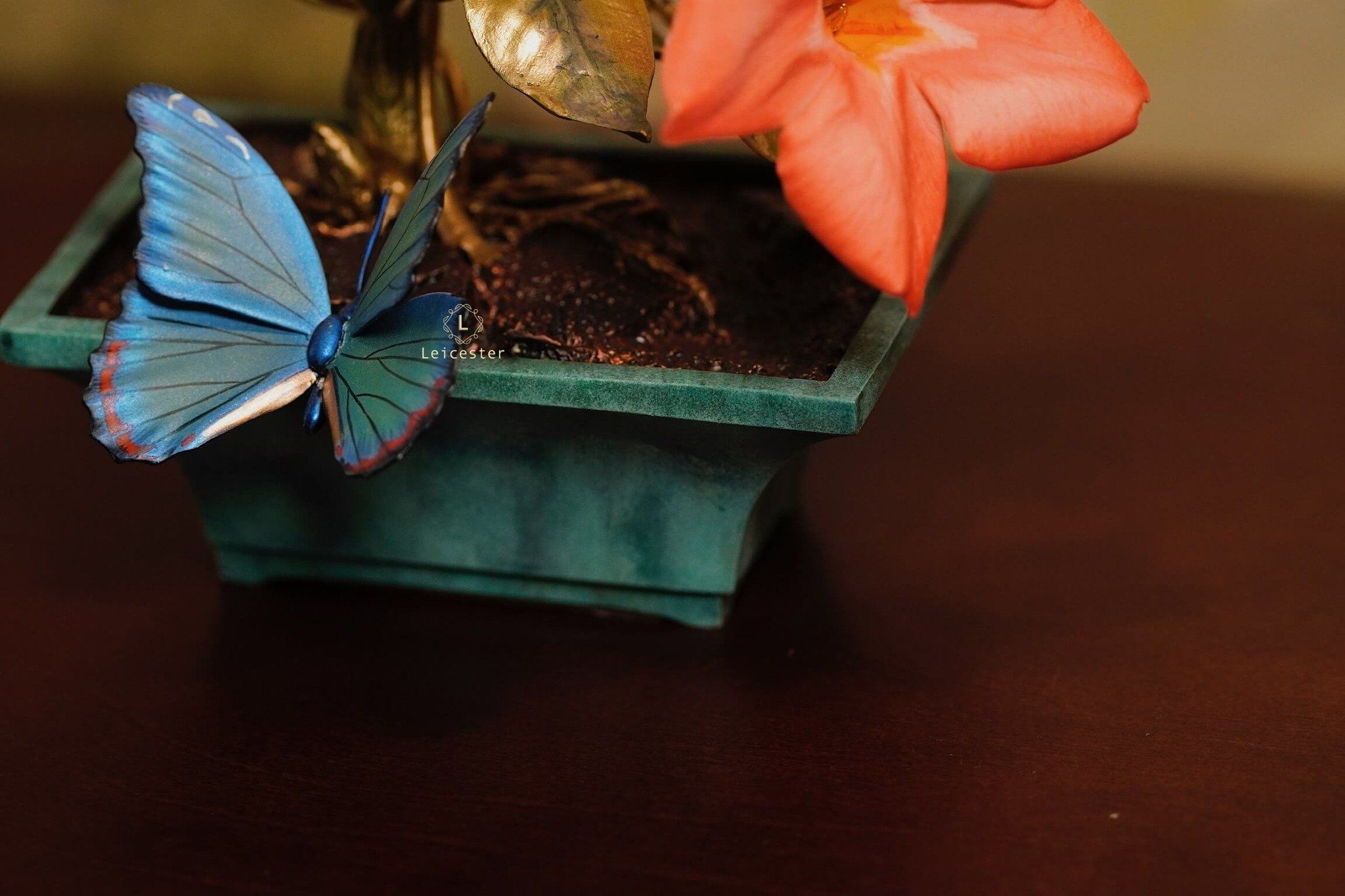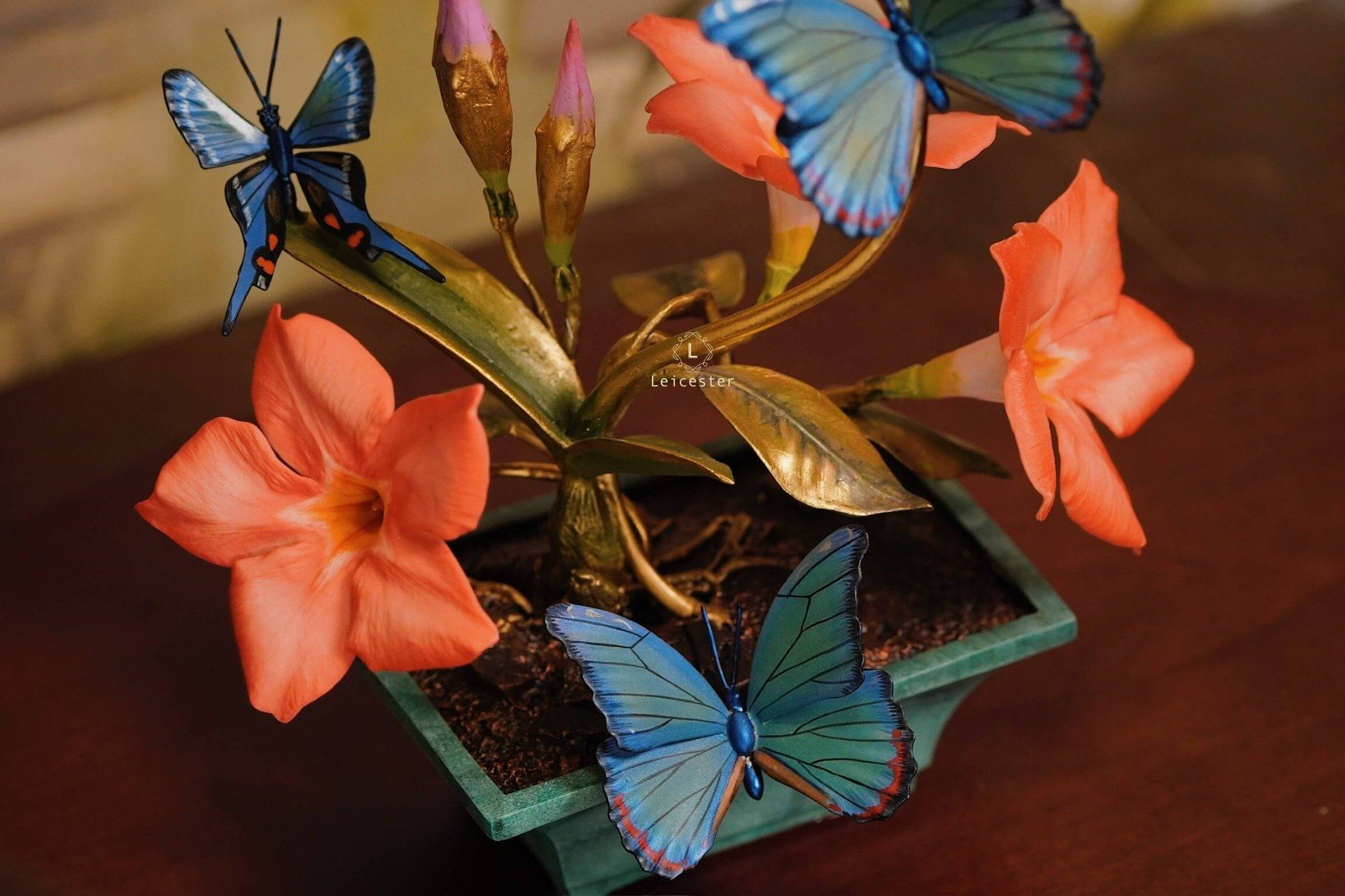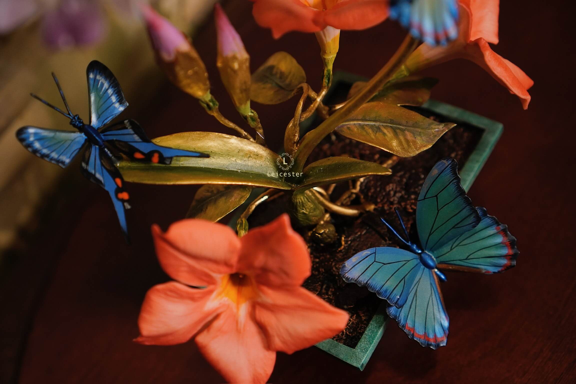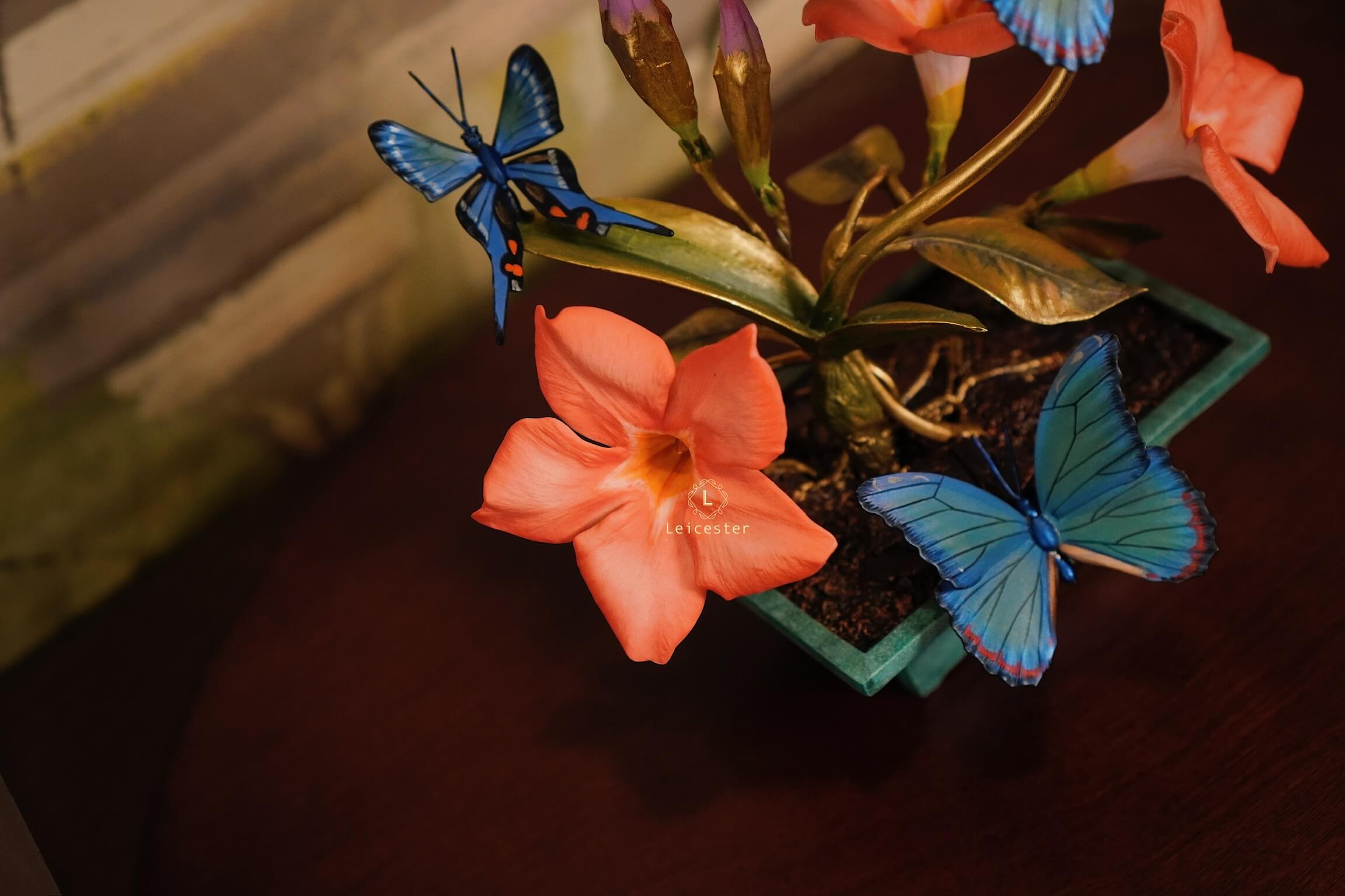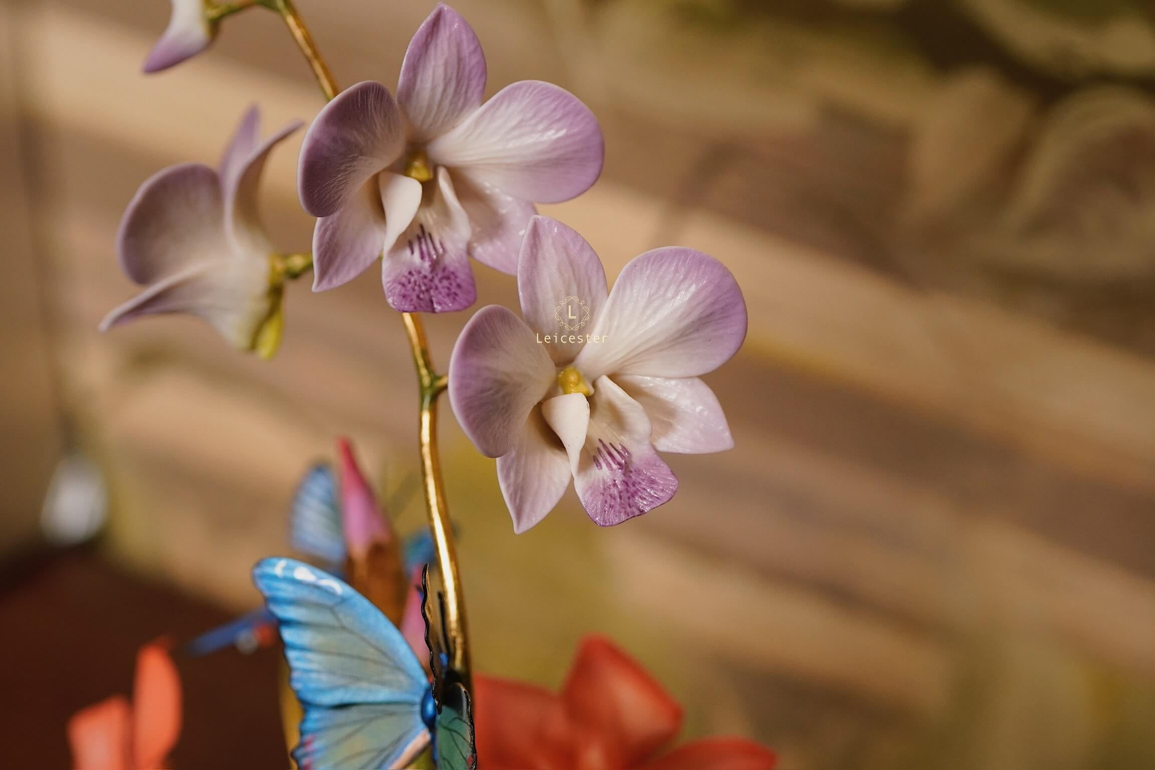 Mô hình Jewels of Flight được chế tác từ đồng kết hợp với phần đế phủ patina xanh cổ điển nâng đỡ những cành đồng uốn lượn tinh xảo. Trên đó, các bông lan Dendrobium tím nhạt bằng sứ xen cùng cụm Mandevilla đỏ rực sơn tay tạo nên điểm nhấn đầy sức sống. Bốn cánh bướm Blue Morpho và Metal Mark phủ sắc xà cừ ánh lam, trong veo như đang chao liệng giữa khu vườn mùa sớm. Tất cả hòa quyện thành một tiểu cảnh sang trọng, hài hòa và đậm tính nghệ thuật - một tác phẩm không chỉ giàu khí chất mà còn mang thông điệp về sự chuyển mình và nguồn năng lượng sống tích cực.