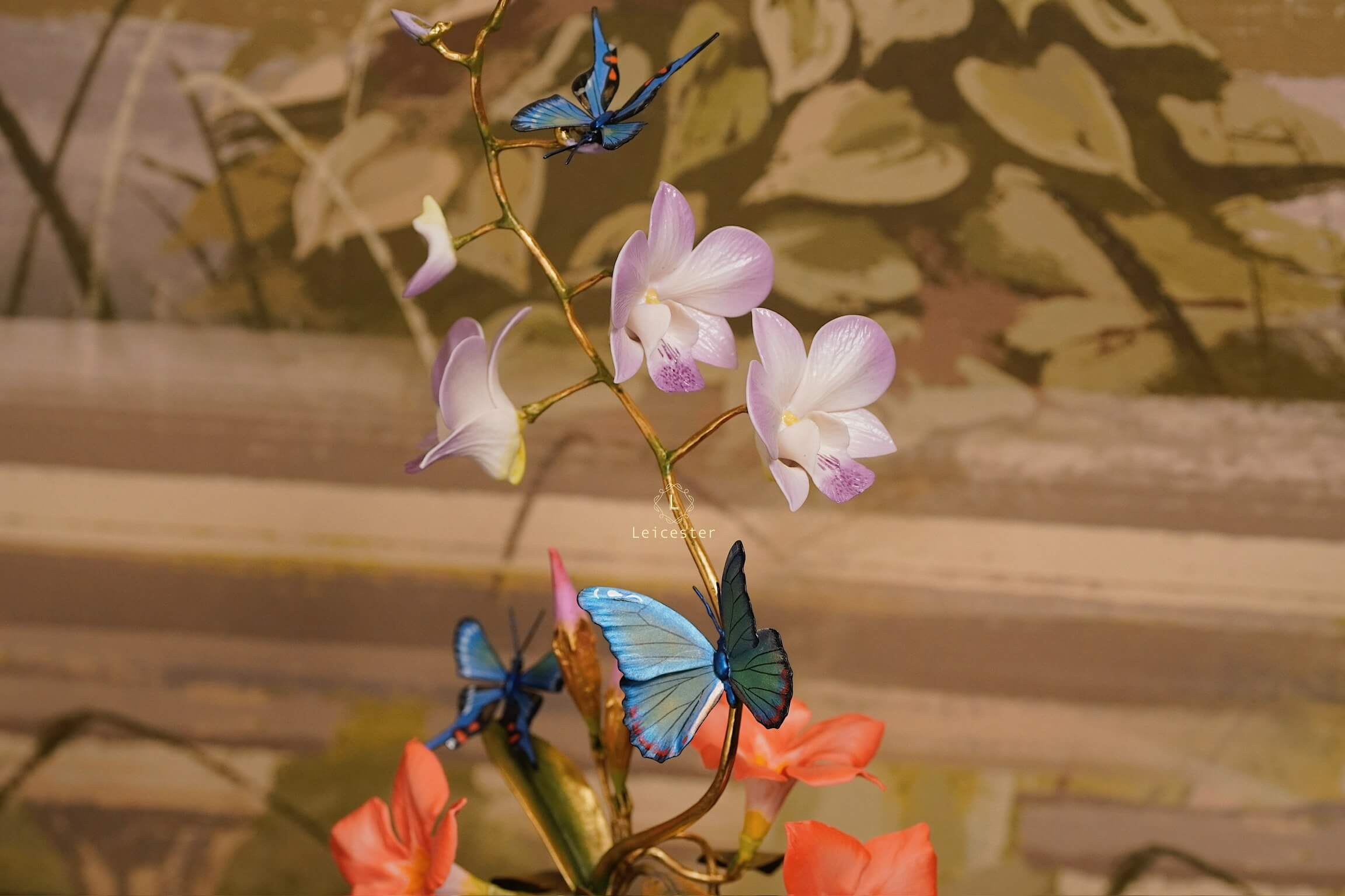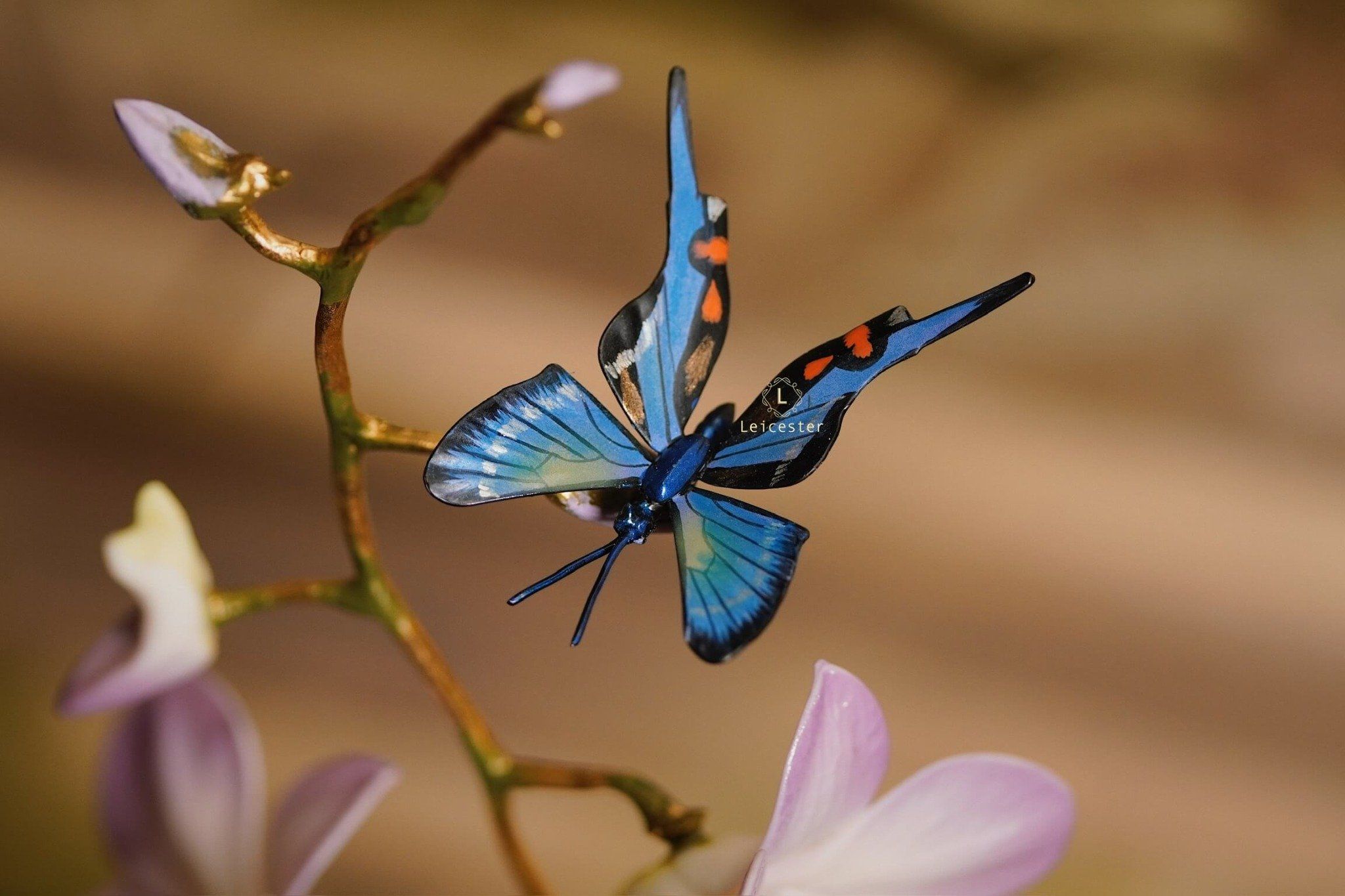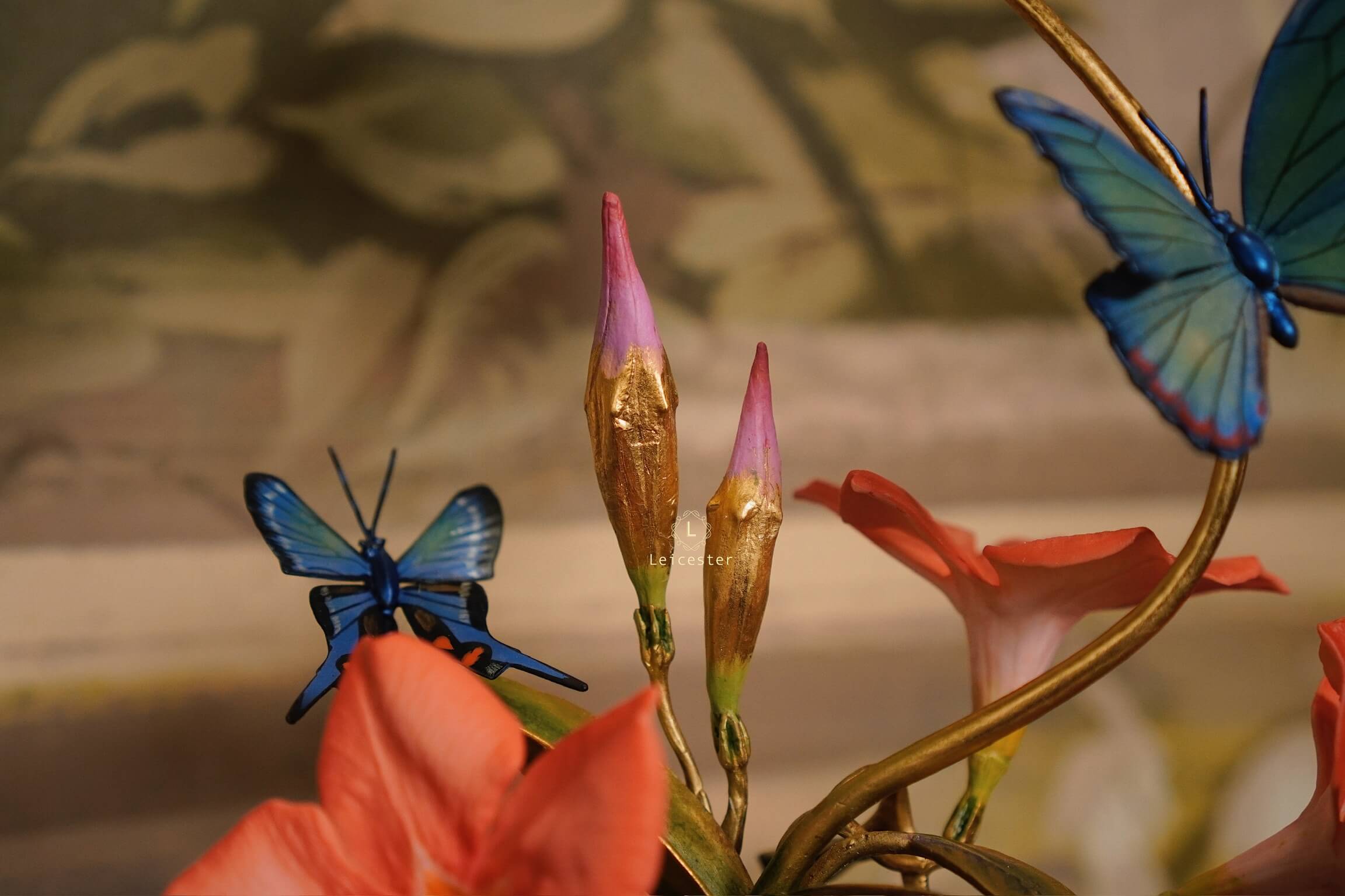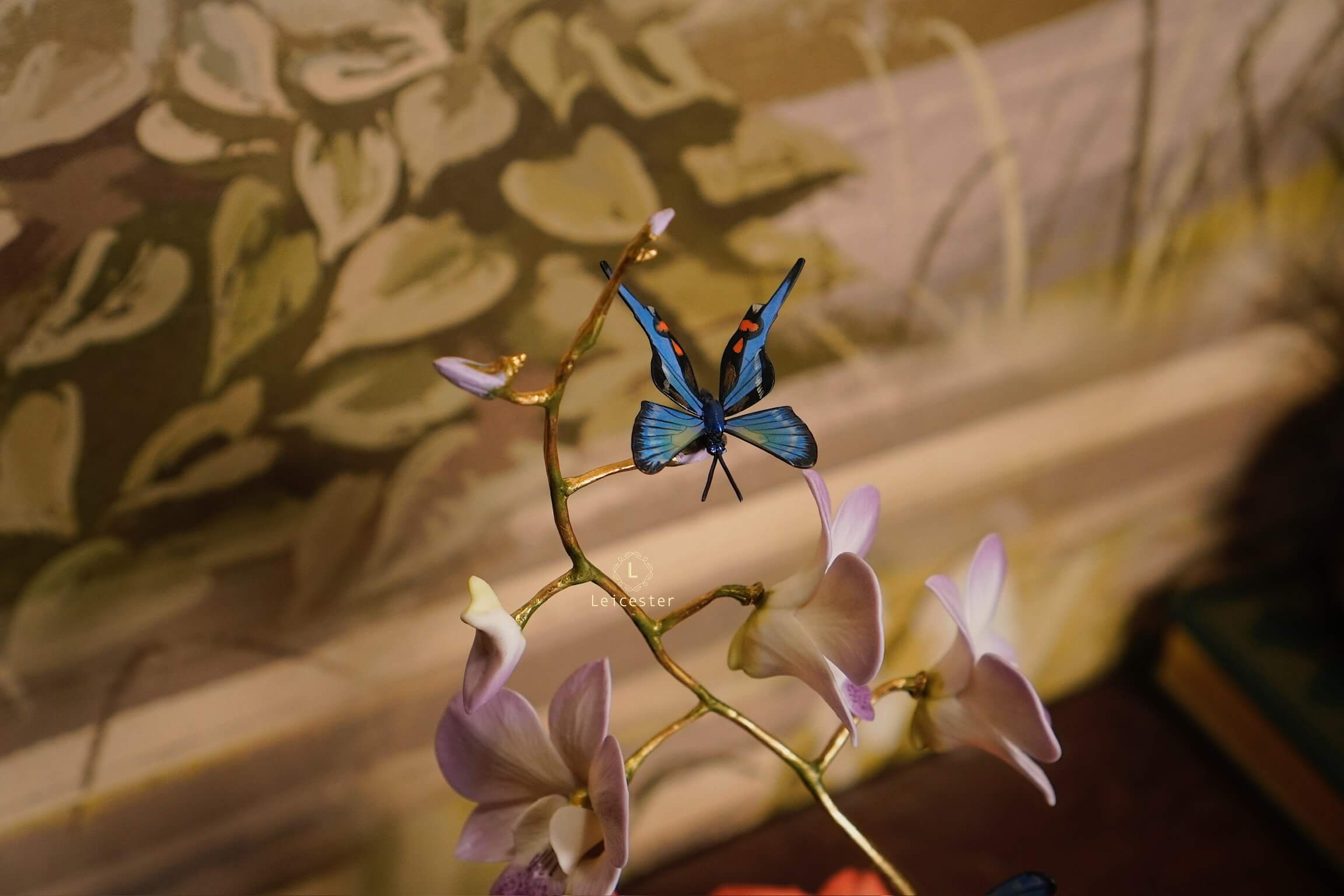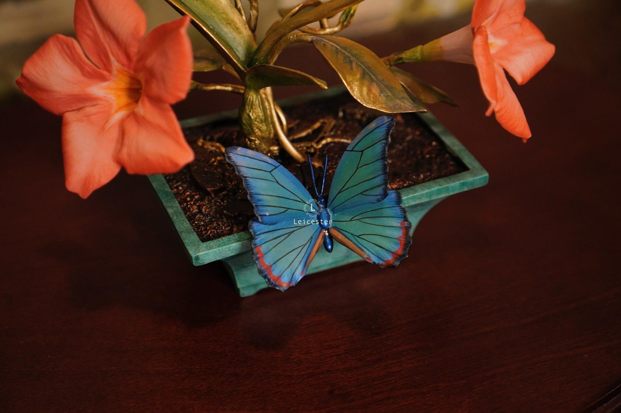 Mô hình Jewels of Flight được chế tác từ đồng kết hợp với phần đế phủ patina xanh cổ điển nâng đỡ những cành đồng uốn lượn tinh xảo. Trên đó, các bông lan Dendrobium tím nhạt bằng sứ xen cùng cụm Mandevilla đỏ rực sơn tay tạo nên điểm nhấn đầy sức sống. Bốn cánh bướm Blue Morpho và Metal Mark phủ sắc xà cừ ánh lam, trong veo như đang chao liệng giữa khu vườn mùa sớm. Tất cả hòa quyện thành một tiểu cảnh sang trọng, hài hòa và đậm tính nghệ thuật - một tác phẩm không chỉ giàu khí chất mà còn mang thông điệp về sự chuyển mình và nguồn năng lượng sống tích cực.