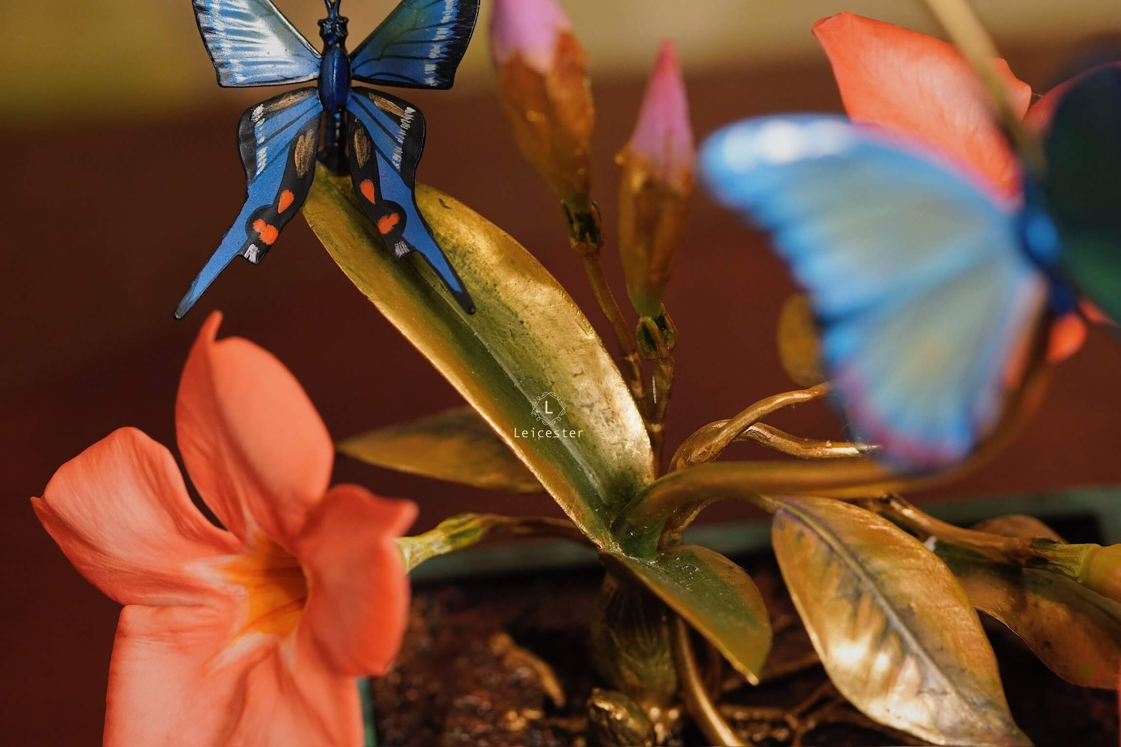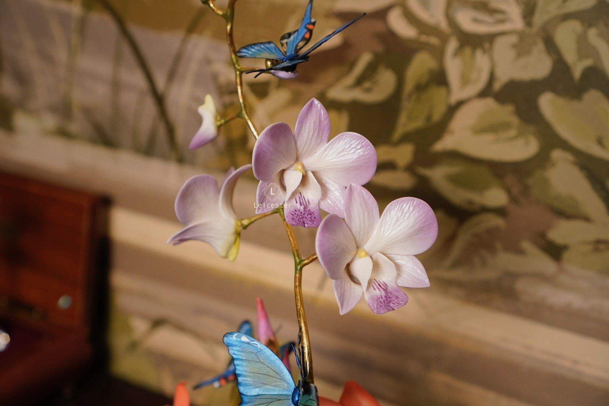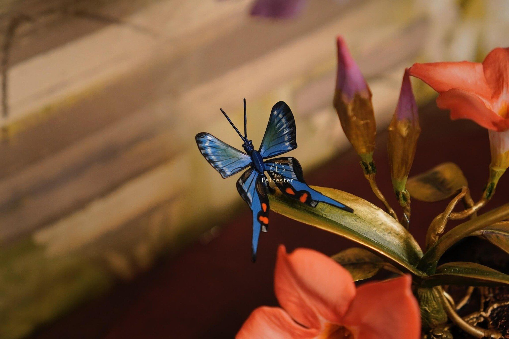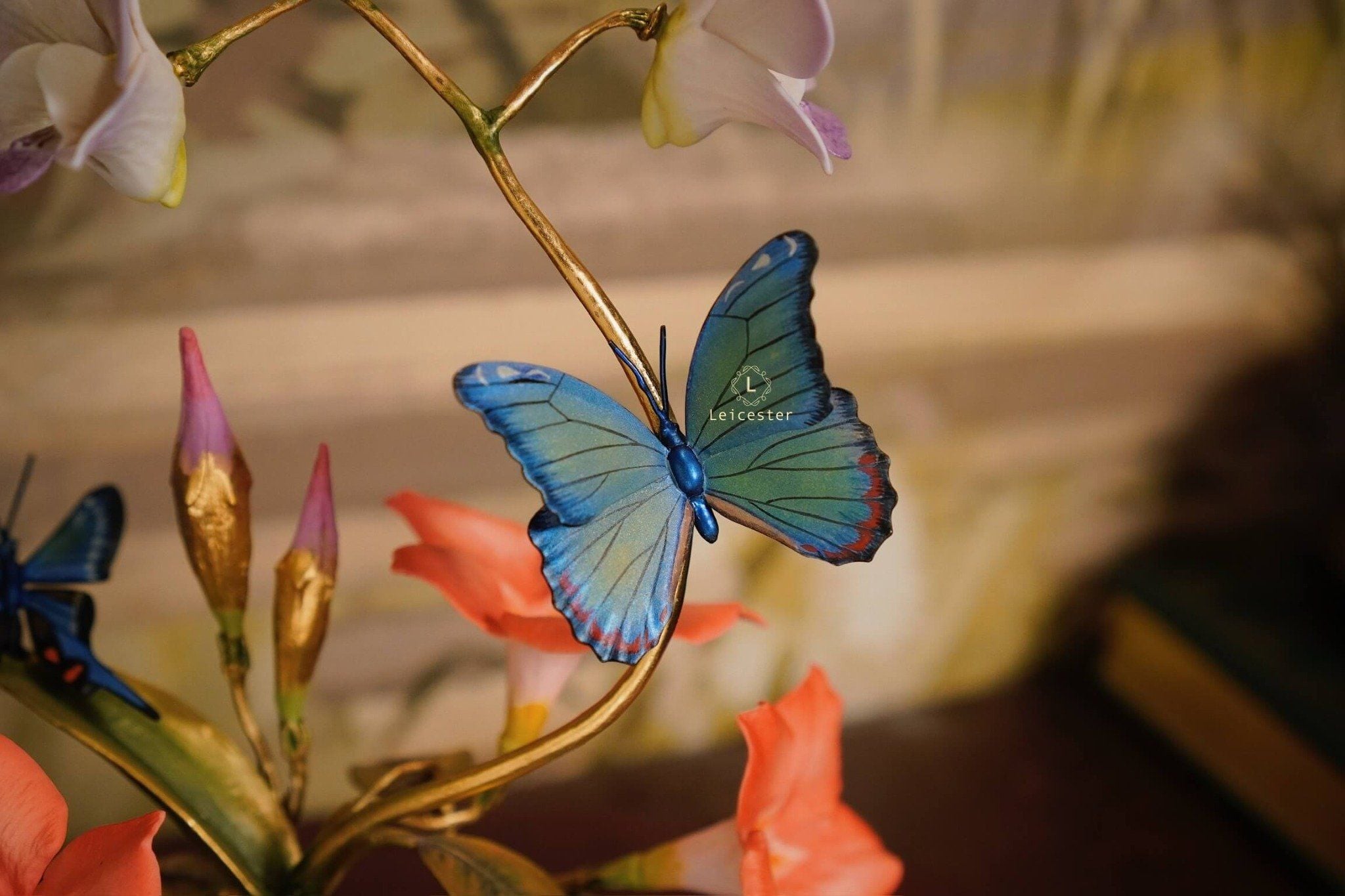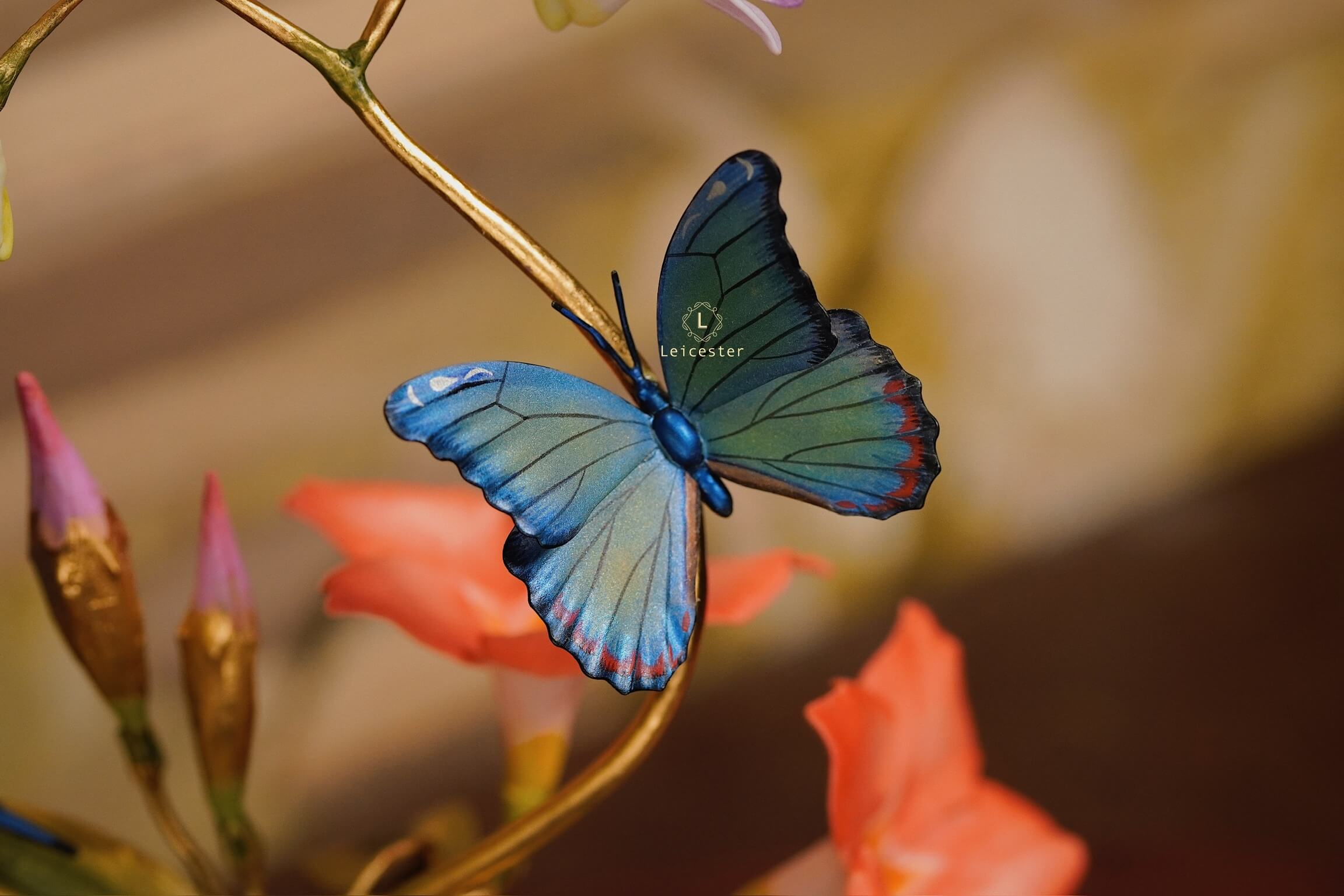 Mô hình Jewels of Flight được chế tác từ đồng kết hợp với phần đế phủ patina xanh cổ điển nâng đỡ những cành đồng uốn lượn tinh xảo. Trên đó, các bông lan Dendrobium tím nhạt bằng sứ xen cùng cụm Mandevilla đỏ rực sơn tay tạo nên điểm nhấn đầy sức sống. Bốn cánh bướm Blue Morpho và Metal Mark phủ sắc xà cừ ánh lam, trong veo như đang chao liệng giữa khu vườn mùa sớm. Tất cả hòa quyện thành một tiểu cảnh sang trọng, hài hòa và đậm tính nghệ thuật - một tác phẩm không chỉ giàu khí chất mà còn mang thông điệp về sự chuyển mình và nguồn năng lượng sống tích cực.