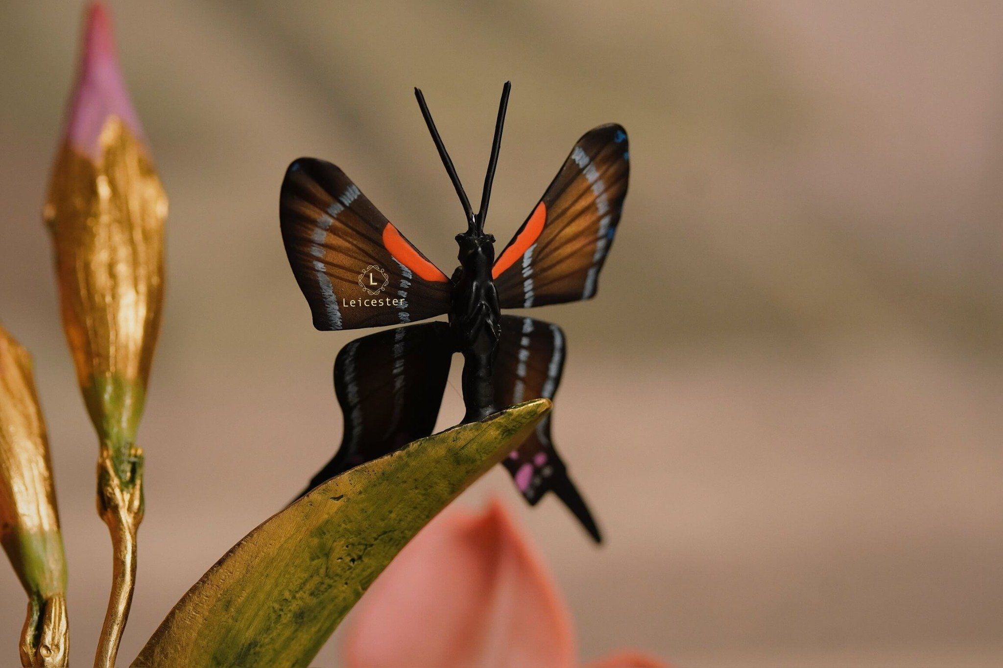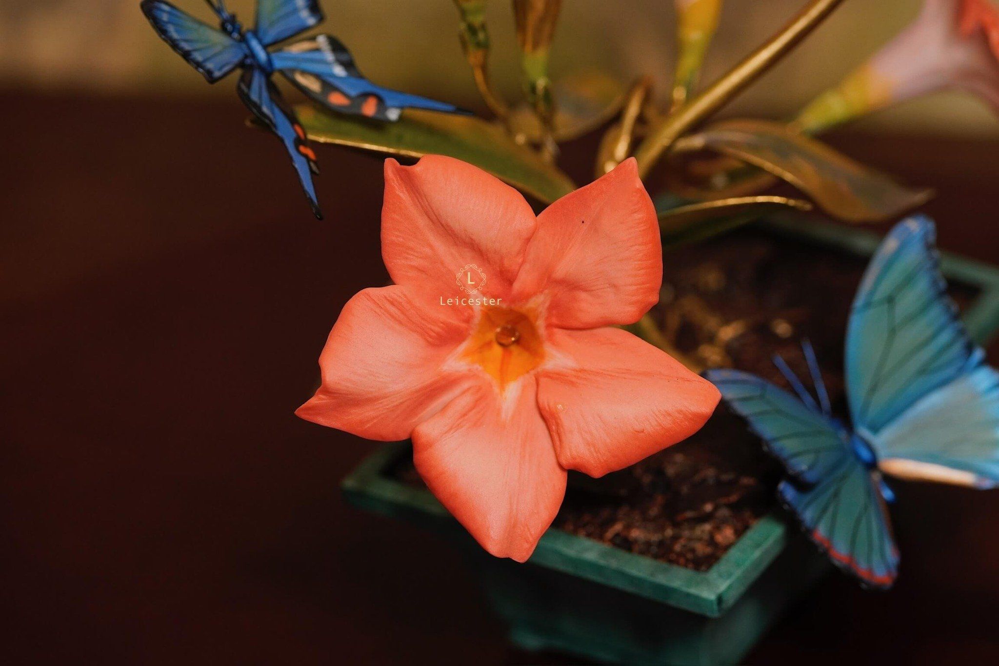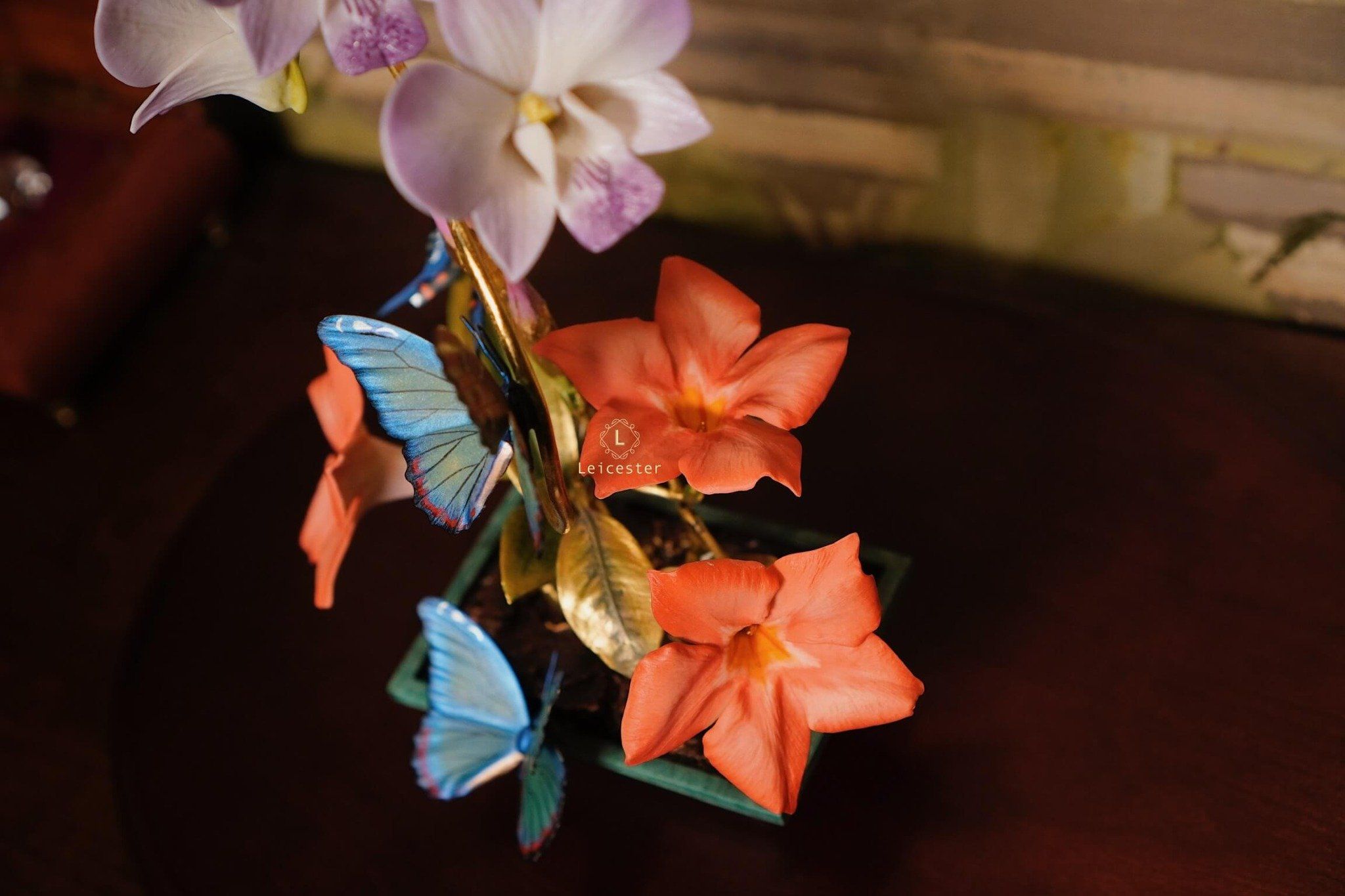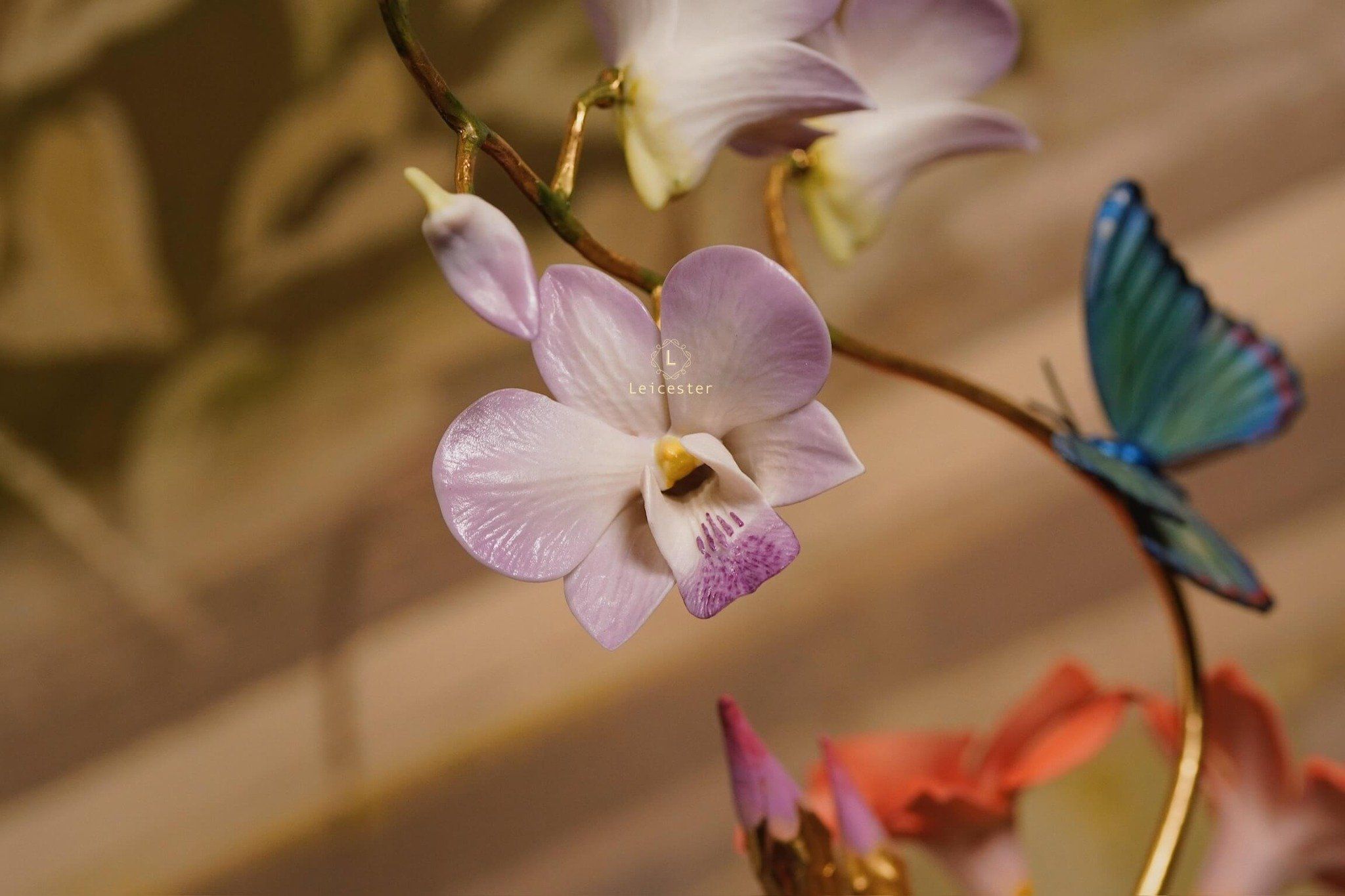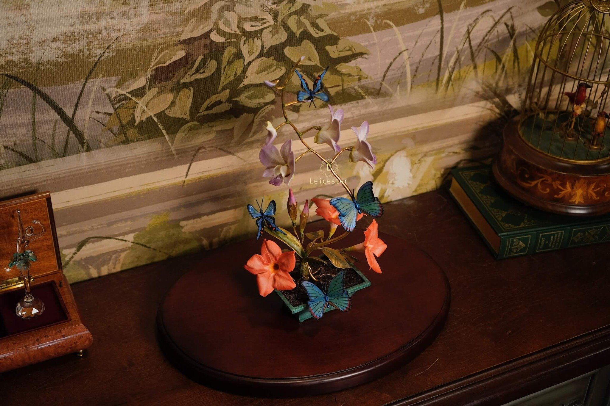Mô hình Jewels of Flight được chế tác từ đồng kết hợp với phần đế phủ patina xanh cổ điển nâng đỡ những cành đồng uốn lượn tinh xảo. Trên đó, các bông lan Dendrobium tím nhạt bằng sứ xen cùng cụm Mandevilla đỏ rực sơn tay tạo nên điểm nhấn đầy sức sống. Bốn cánh bướm Blue Morpho và Metal Mark phủ sắc xà cừ ánh lam, trong veo như đang chao liệng giữa khu vườn mùa sớm. Tất cả hòa quyện thành một tiểu cảnh sang trọng, hài hòa và đậm tính nghệ thuật - một tác phẩm không chỉ giàu khí chất mà còn mang thông điệp về sự chuyển mình và nguồn năng lượng sống tích cực.