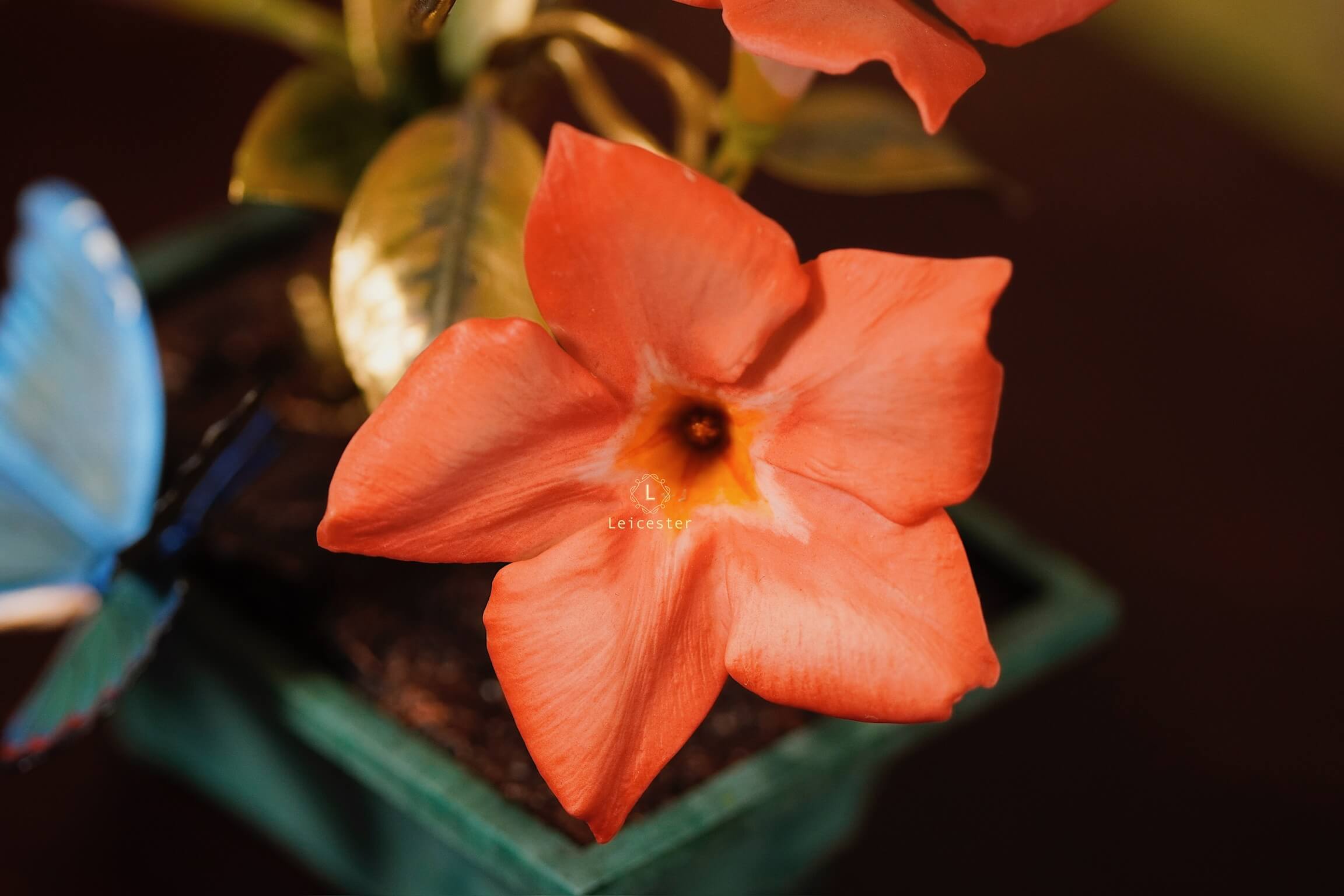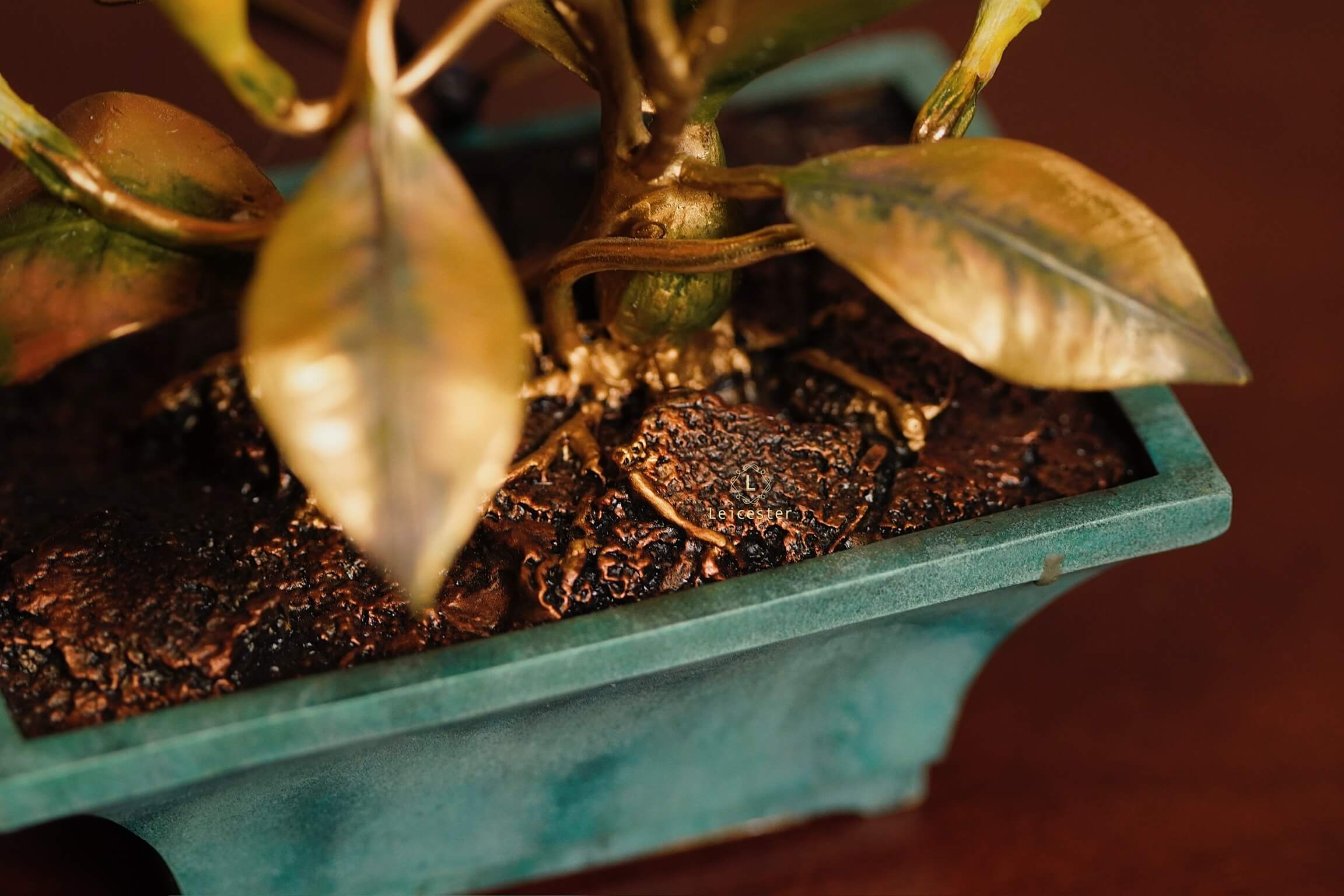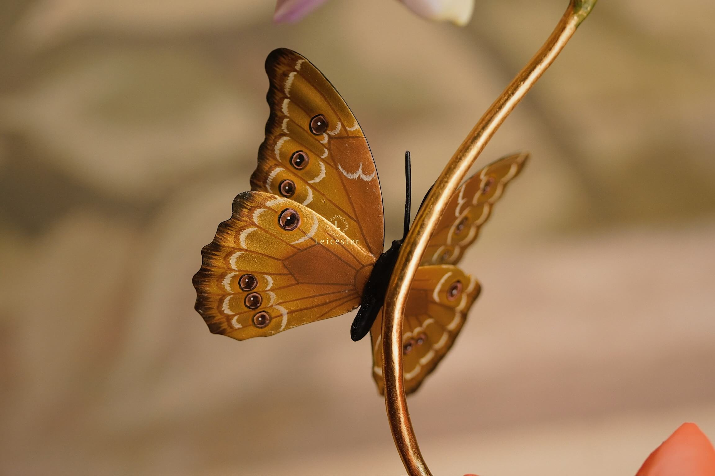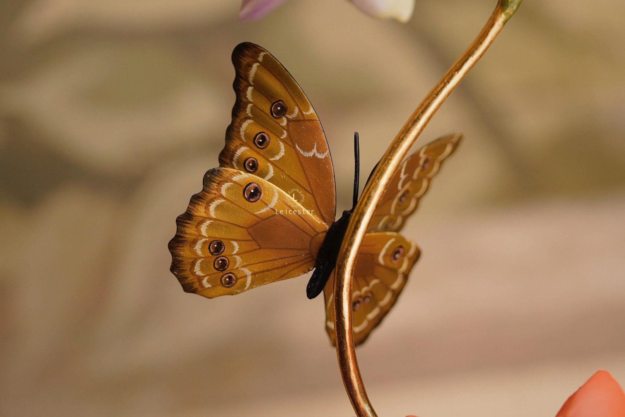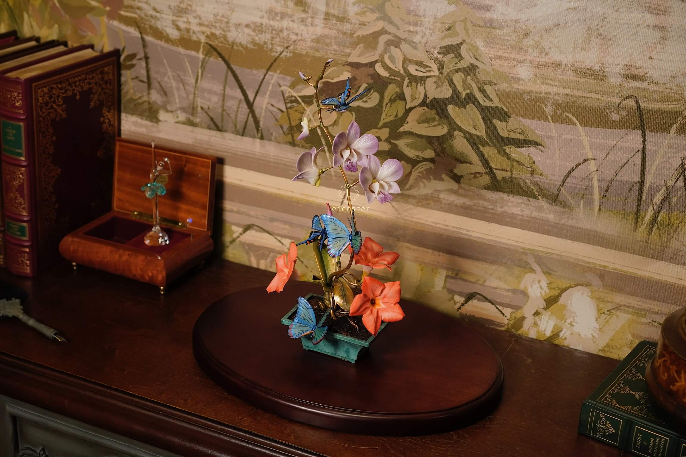 Mô hình Jewels of Flight được chế tác từ đồng kết hợp với phần đế phủ patina xanh cổ điển nâng đỡ những cành đồng uốn lượn tinh xảo. Trên đó, các bông lan Dendrobium tím nhạt bằng sứ xen cùng cụm Mandevilla đỏ rực sơn tay tạo nên điểm nhấn đầy sức sống. Bốn cánh bướm Blue Morpho và Metal Mark phủ sắc xà cừ ánh lam, trong veo như đang chao liệng giữa khu vườn mùa sớm. Tất cả hòa quyện thành một tiểu cảnh sang trọng, hài hòa và đậm tính nghệ thuật - một tác phẩm không chỉ giàu khí chất mà còn mang thông điệp về sự chuyển mình và nguồn năng lượng sống tích cực.