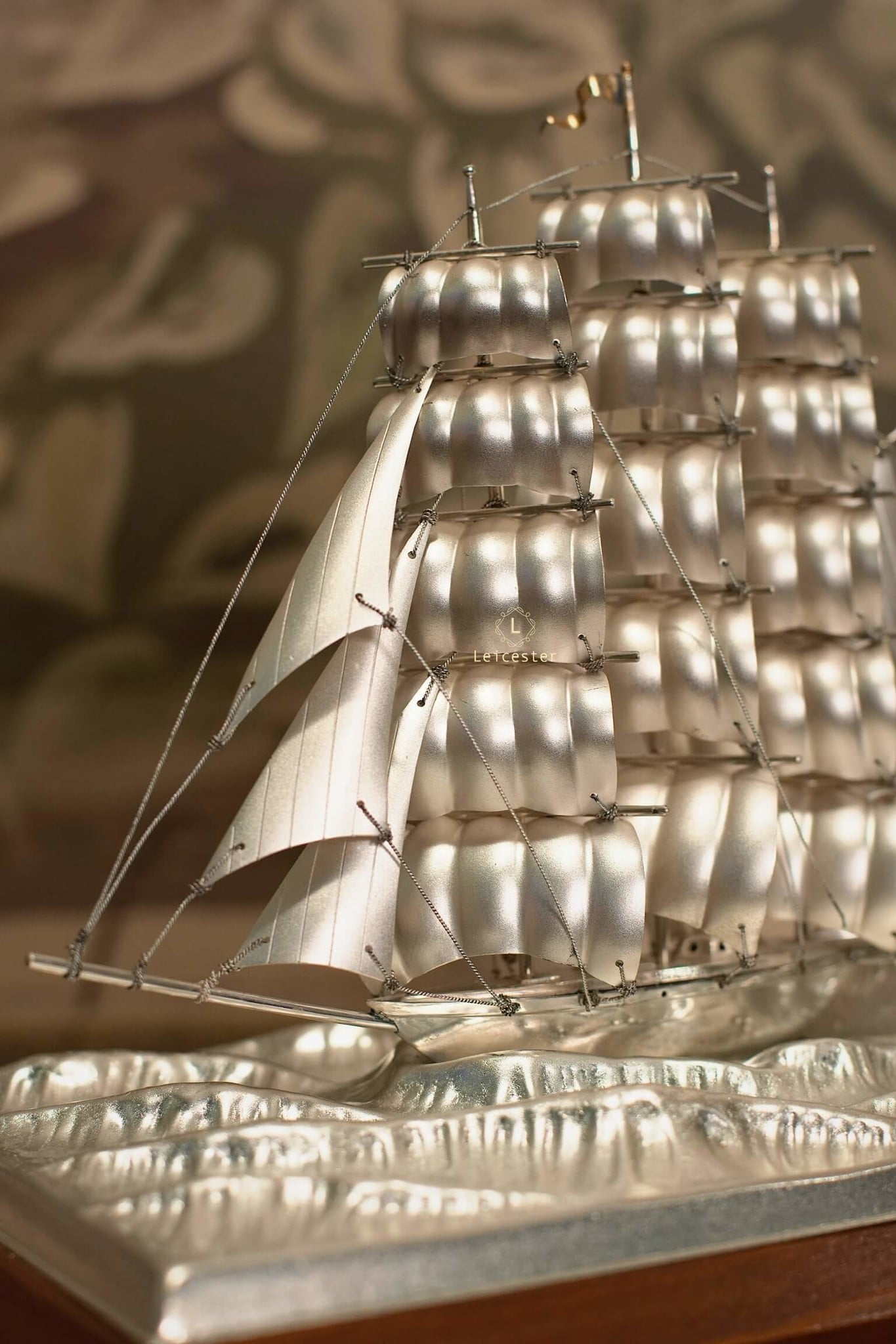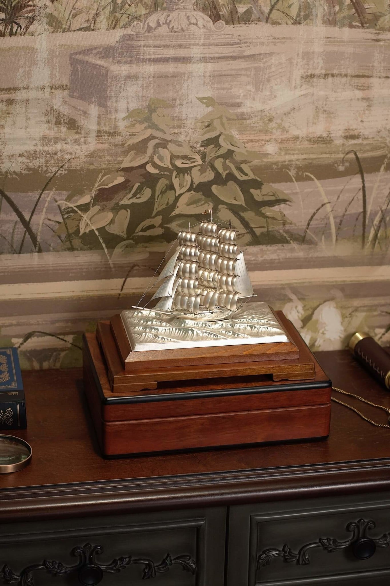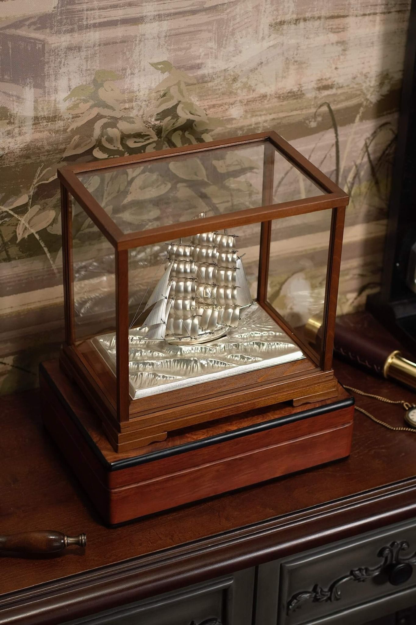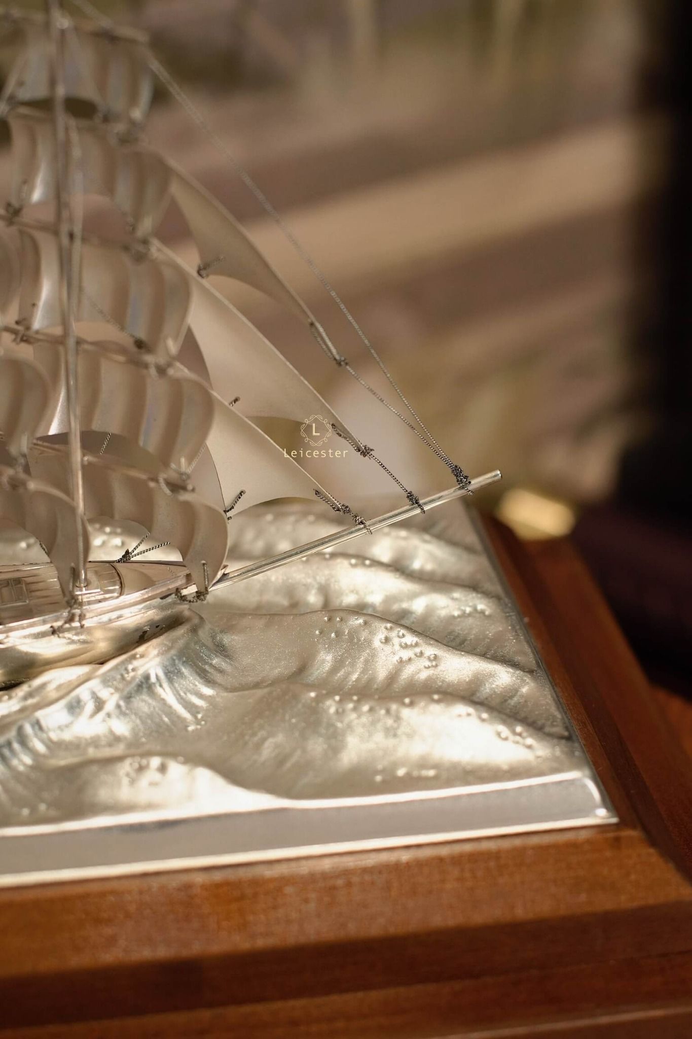 Thuyền được đặt trong một hộp kính khung gỗ sang trọng, chất liệu được khắc trên mạn thuyền. Với thiết kế đẹp mắt và tinh tế này, thích hợp trưng bày để bàn hoặc trong phòng làm việc, mang ý nghĩa thuận buồm xuôi gió trong công việc cũng như may mắn, thuận lợi trong kinh doanh.