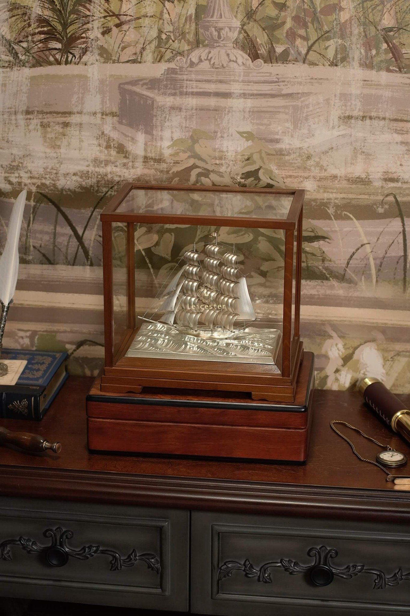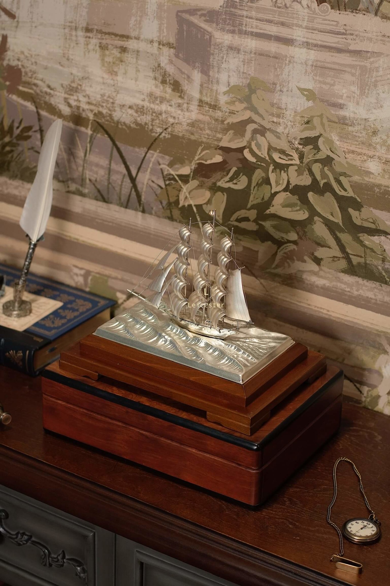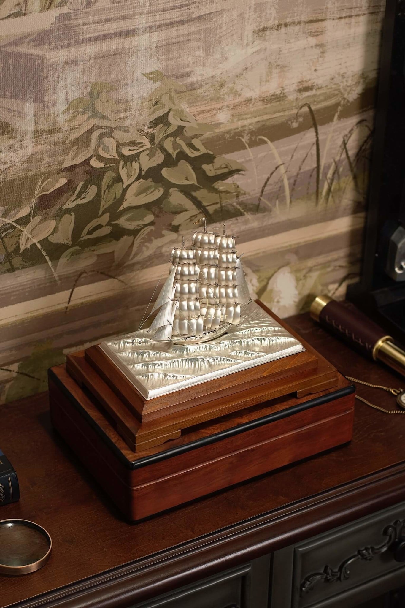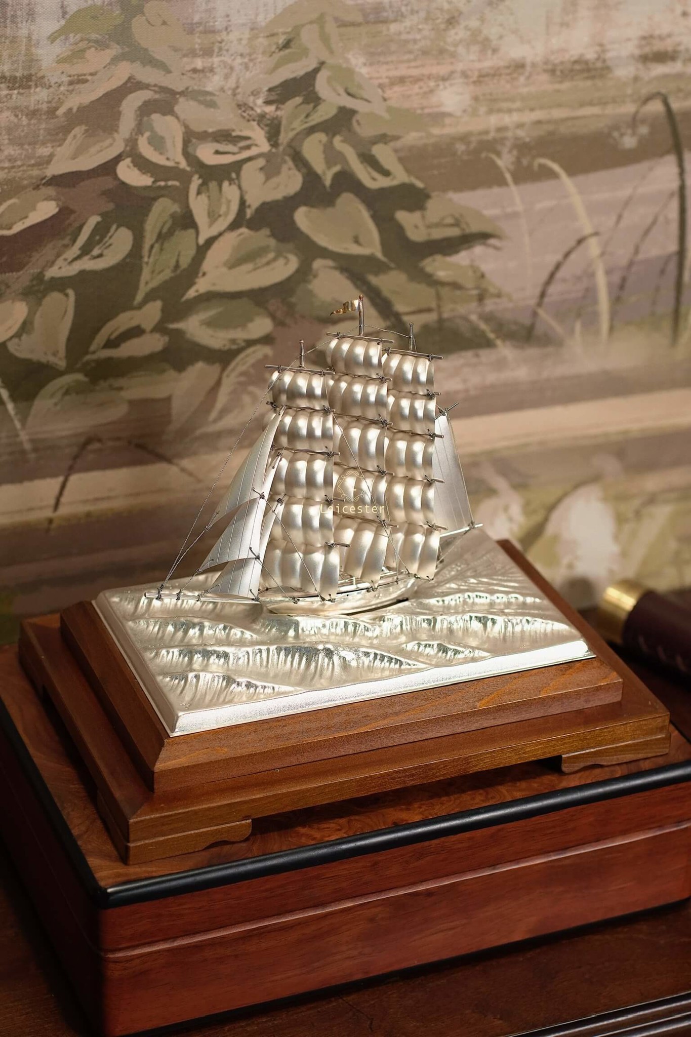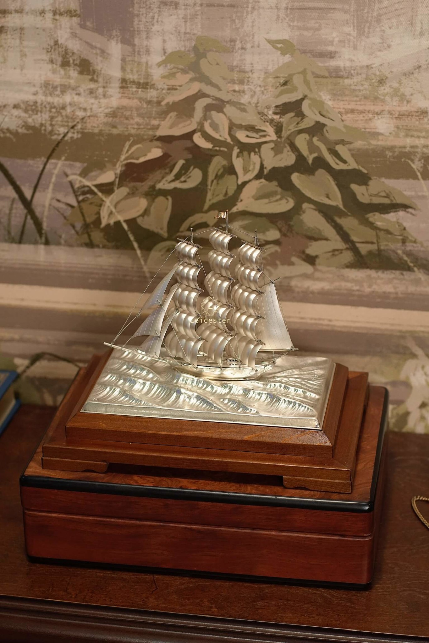 Thuyền được đặt trong một hộp kính khung gỗ sang trọng, chất liệu được khắc trên mạn thuyền. Với thiết kế đẹp mắt và tinh tế này, thích hợp trưng bày để bàn hoặc trong phòng làm việc, mang ý nghĩa thuận buồm xuôi gió trong công việc cũng như may mắn, thuận lợi trong kinh doanh.