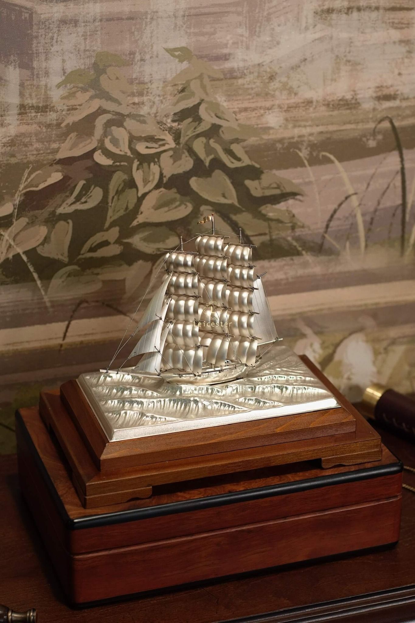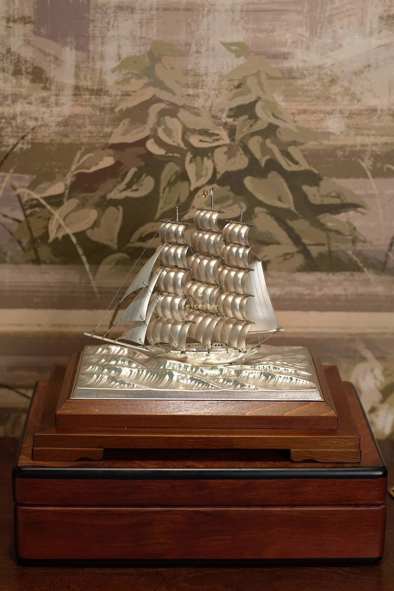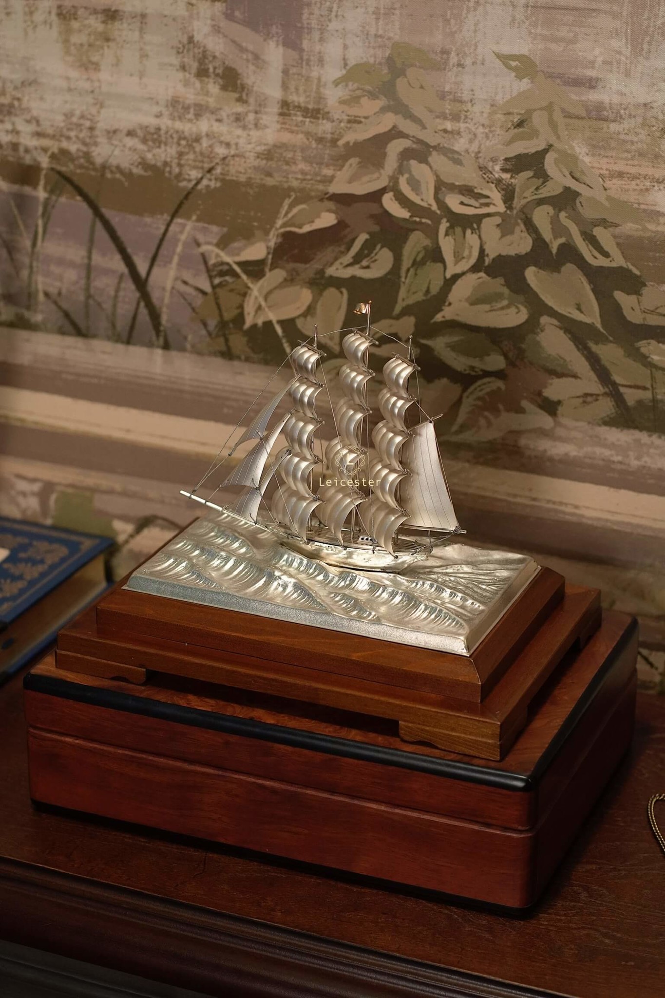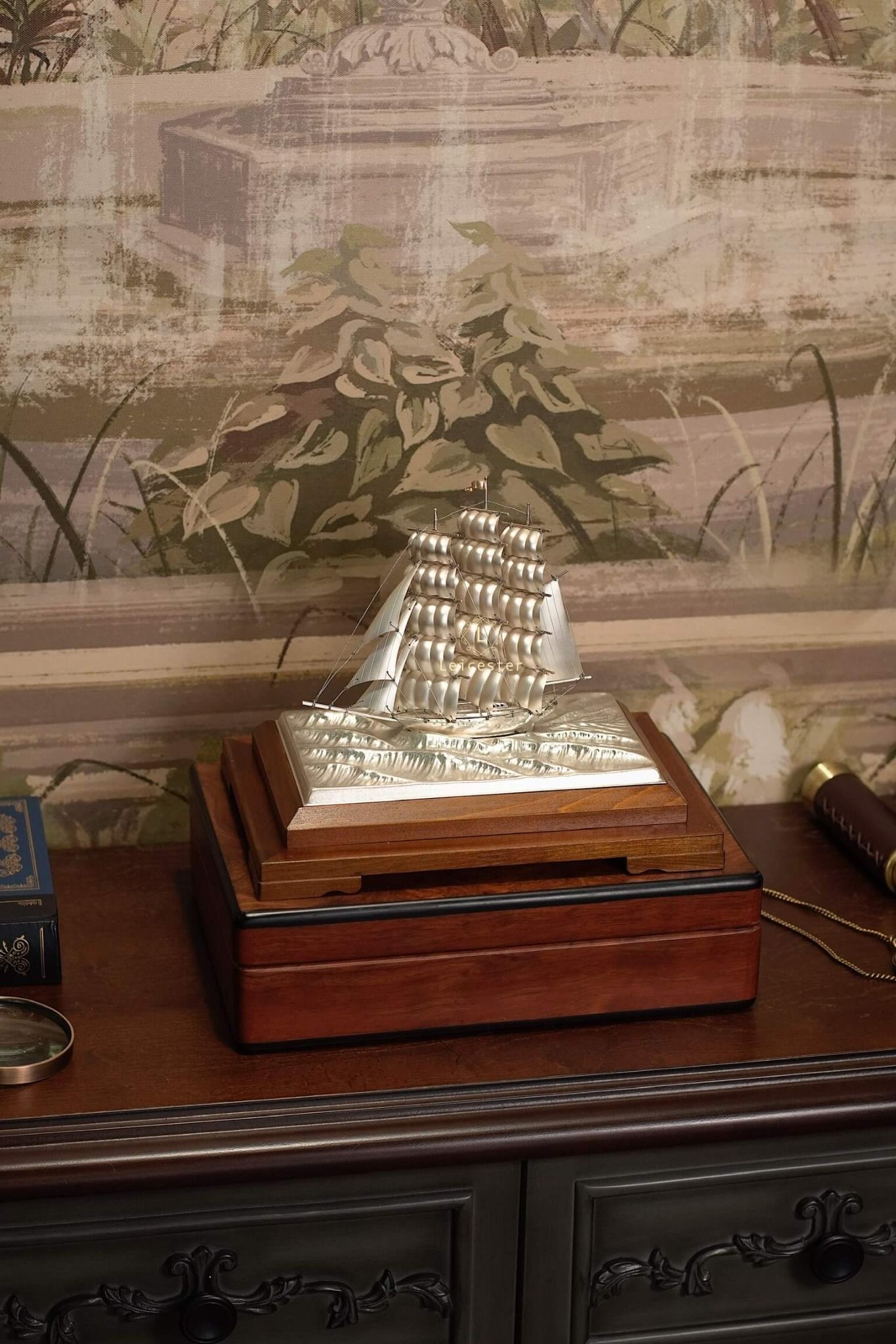 Thuyền được đặt trong một hộp kính khung gỗ sang trọng, chất liệu được khắc trên mạn thuyền. Với thiết kế đẹp mắt và tinh tế này, thích hợp trưng bày để bàn hoặc trong phòng làm việc, mang ý nghĩa thuận buồm xuôi gió trong công việc cũng như may mắn, thuận lợi trong kinh doanh.