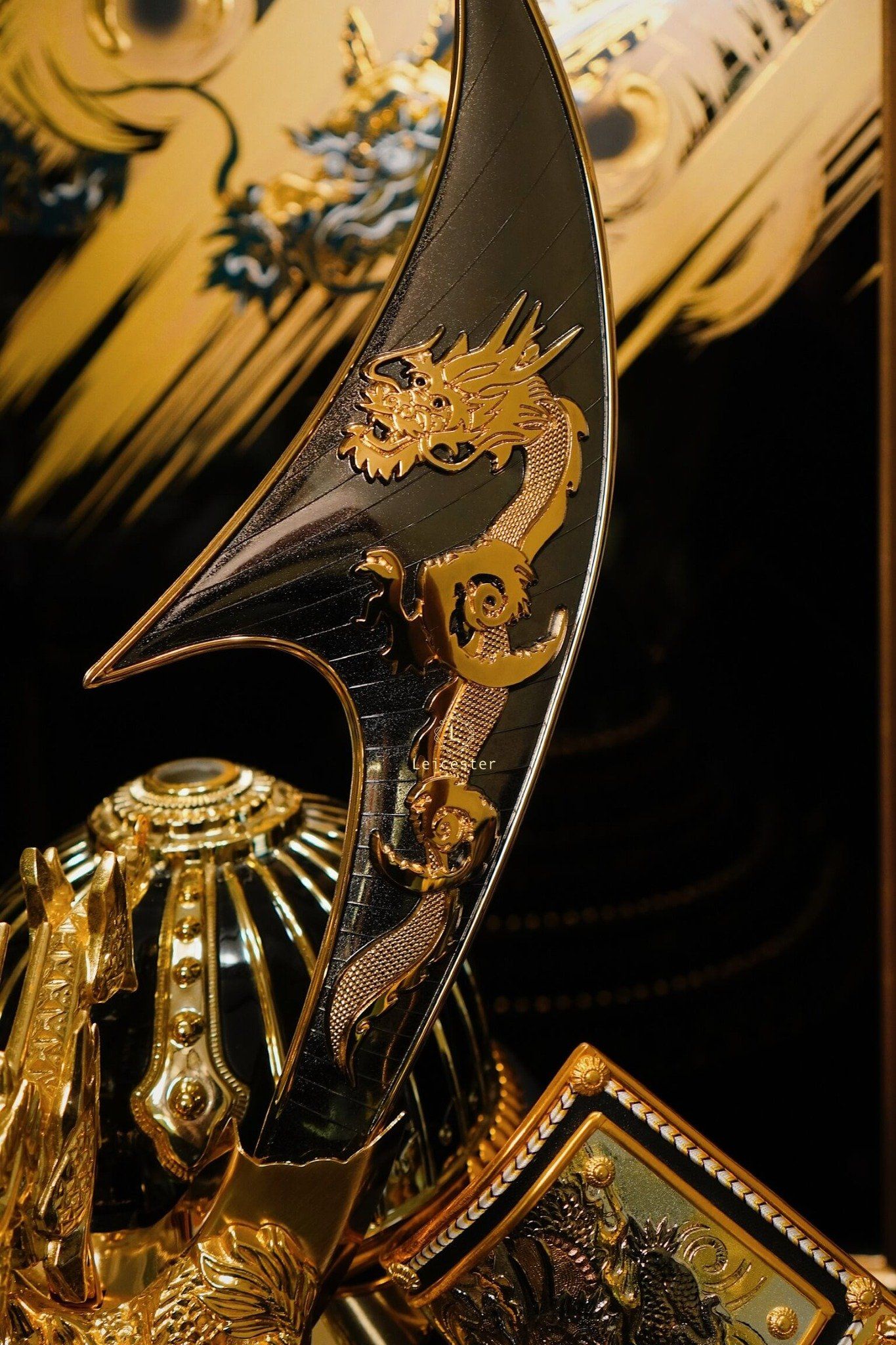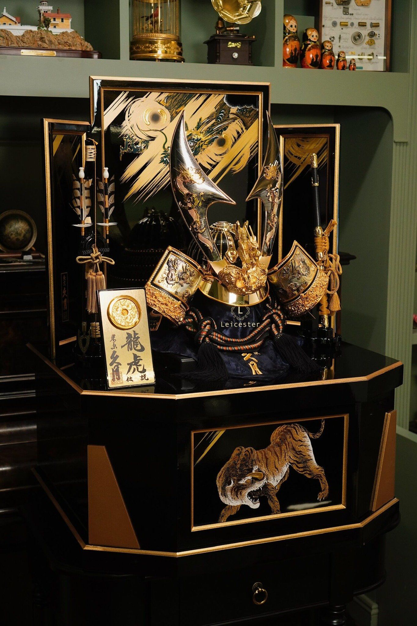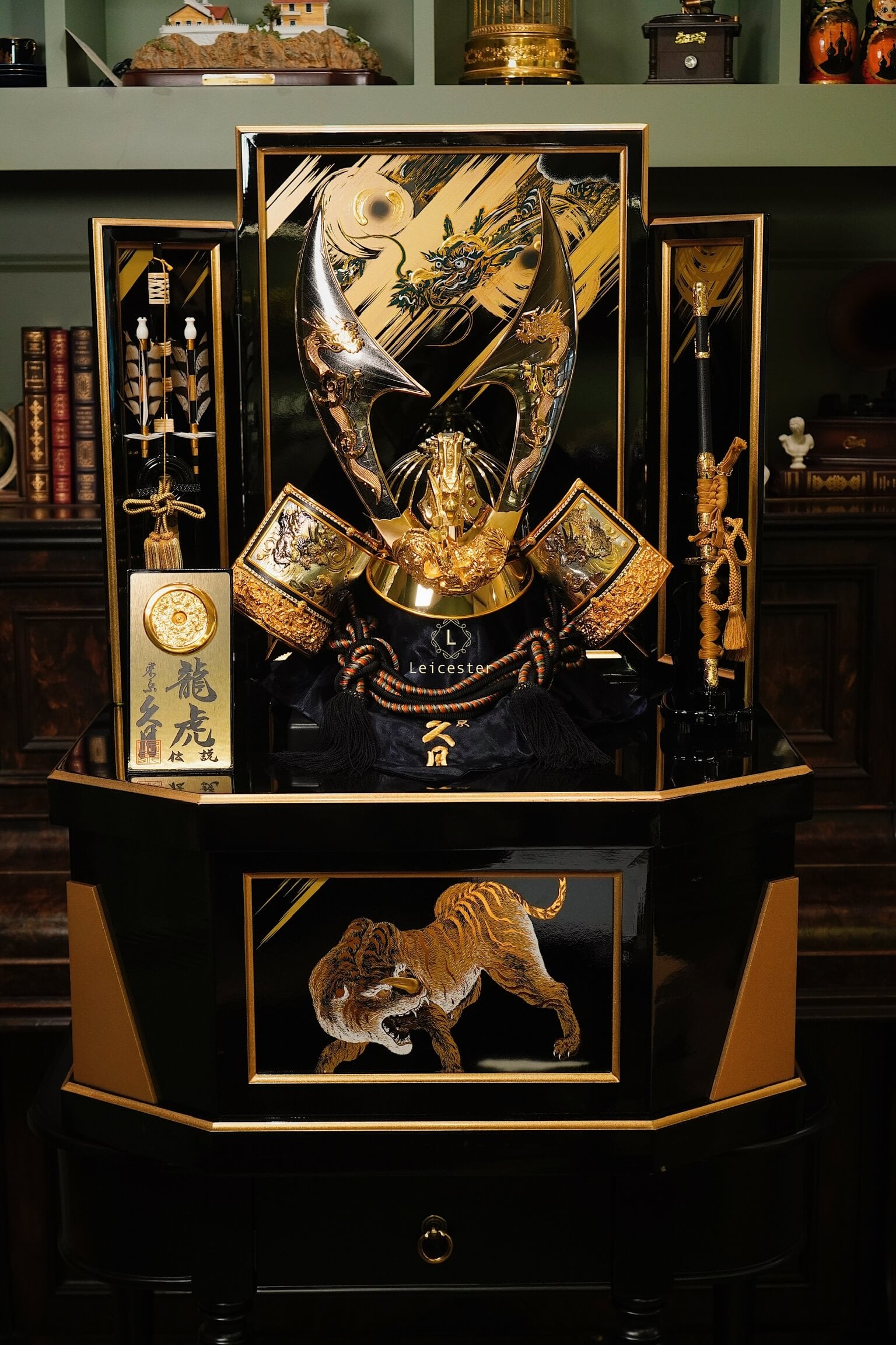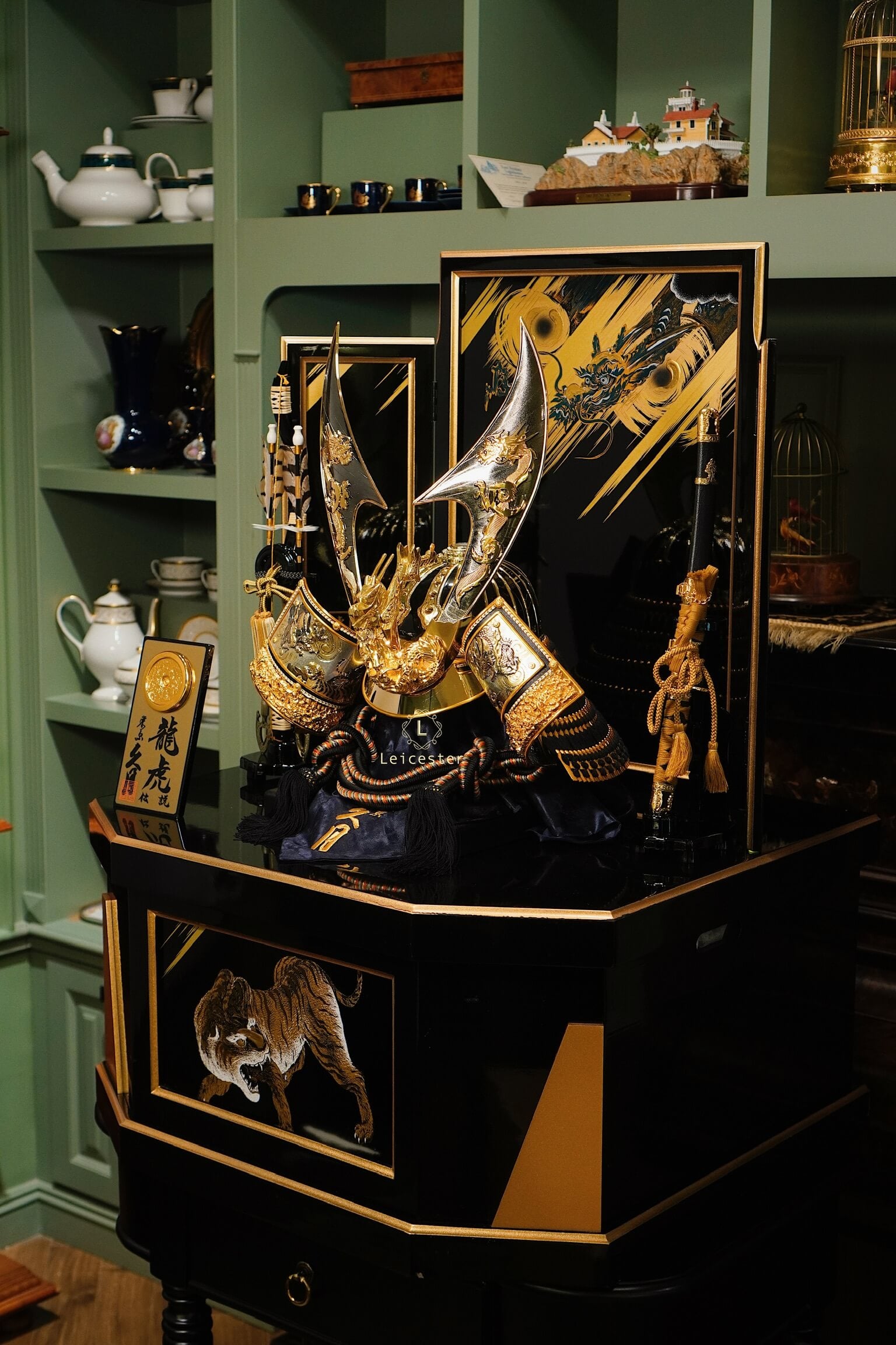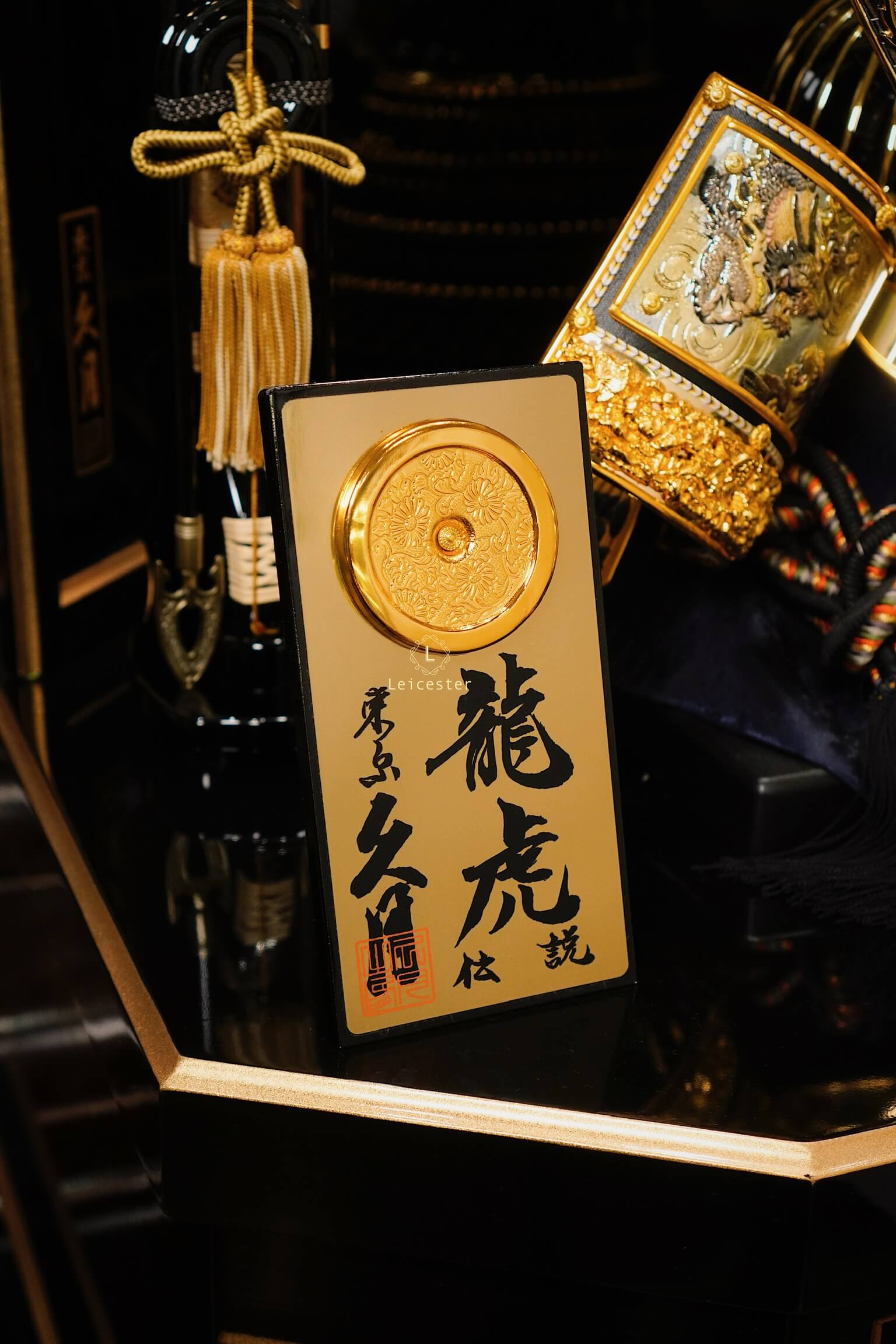 Long Hổ Chi Giáp nổi bật với mũ Kabuto mạ vàng 24K, khắc họa hình tượng rồng vàng và hổ vờn mây - biểu trưng cho trí tuệ và sức mạnh. Hai sừng cong hình trăng khuyết gợi dấu ấn của Date Masamune - vị lãnh chúa huyền thoại thời Chiến Quốc. Tổng thể phối màu đen sơn mài, vàng hoàng kim và lụa tím quý tộc, kết hợp cùng bình phong rồng bay hổ múa đã tạo nên vẻ oai hùng, uy nghi mà vẫn thanh nhã, là một tác phẩm nghệ thuật đậm chất tinh thần Samurai.