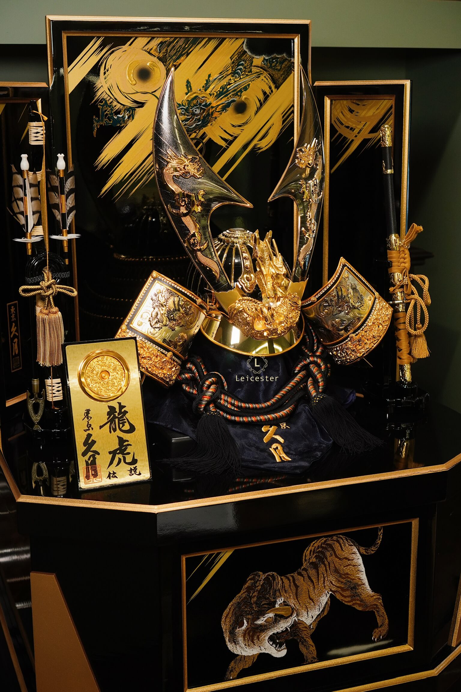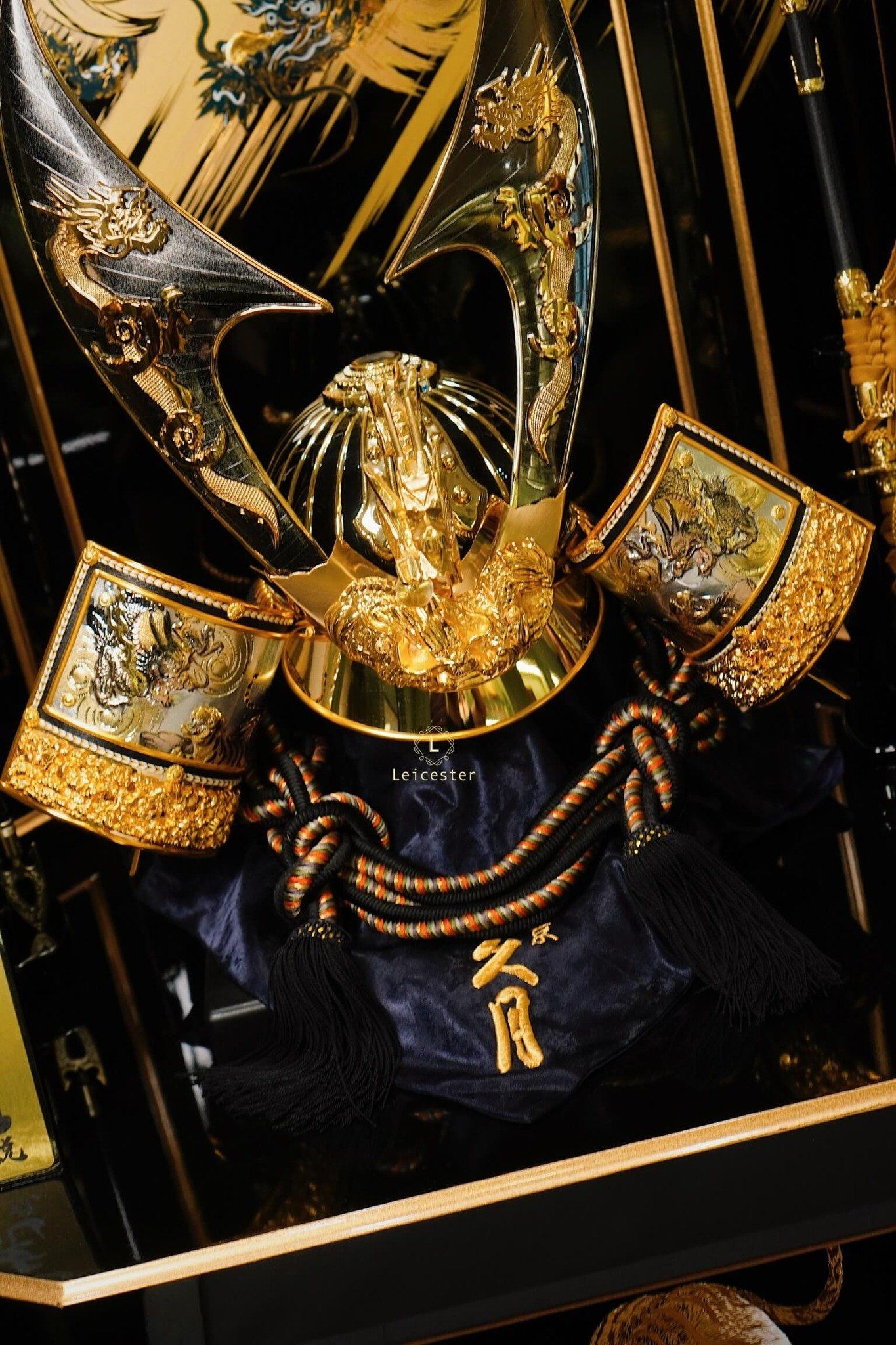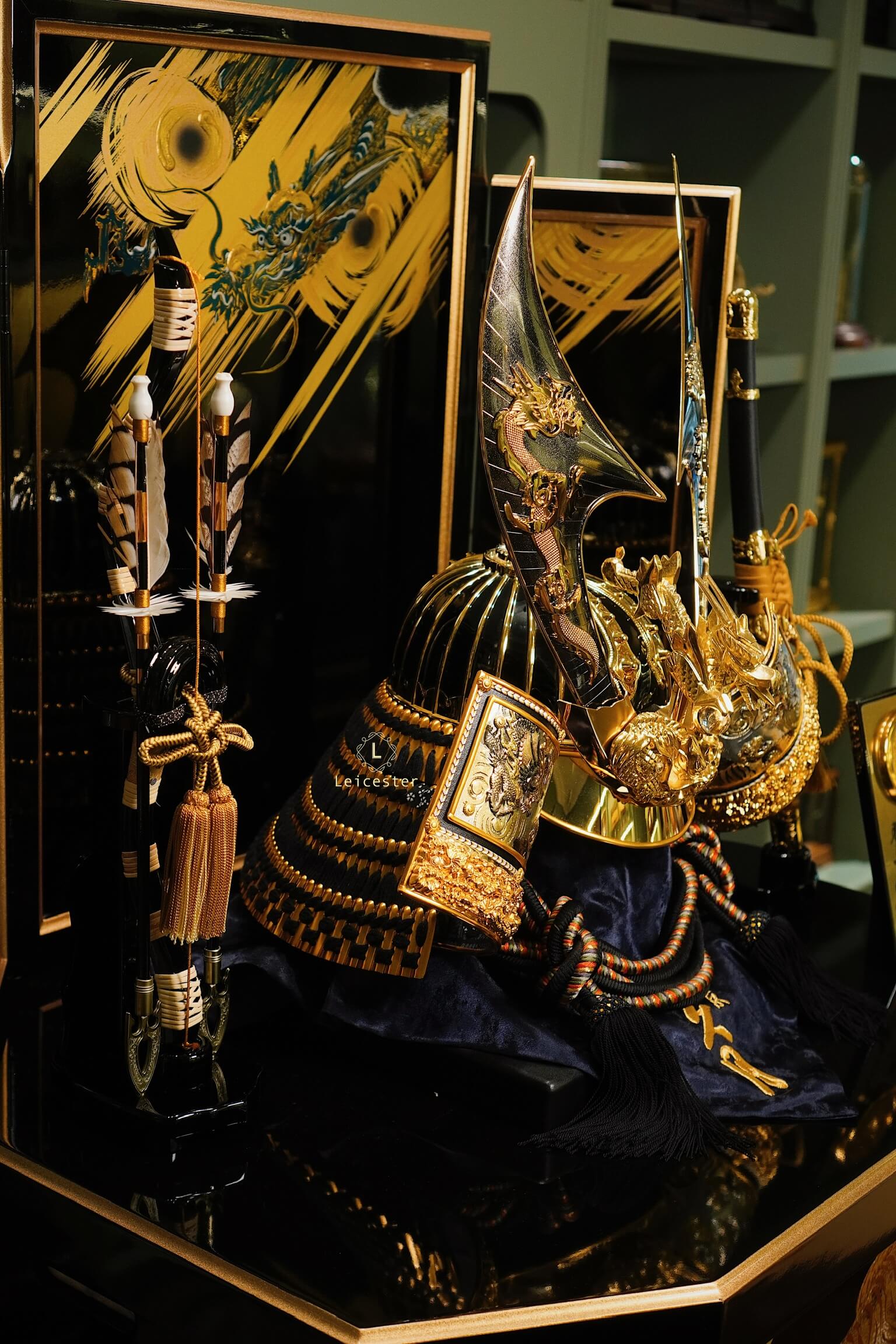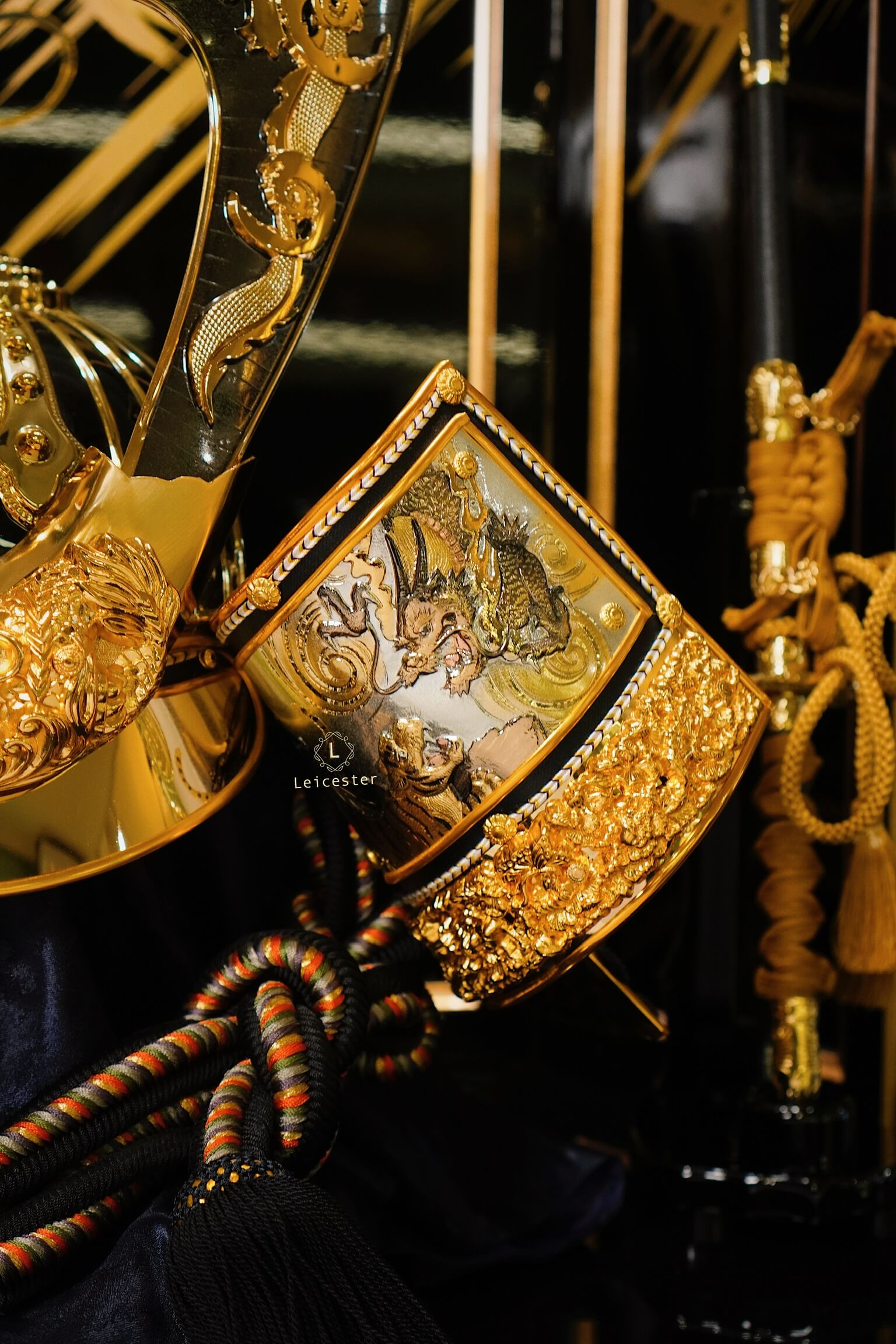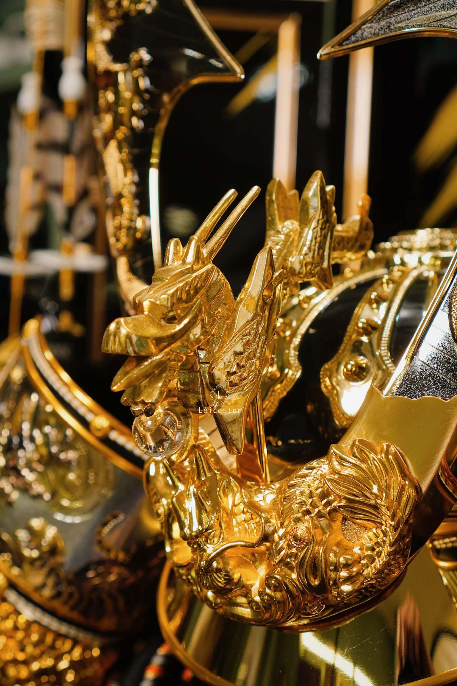 Long Hổ Chi Giáp nổi bật với mũ Kabuto mạ vàng 24K, khắc họa hình tượng rồng vàng và hổ vờn mây - biểu trưng cho trí tuệ và sức mạnh. Hai sừng cong hình trăng khuyết gợi dấu ấn của Date Masamune - vị lãnh chúa huyền thoại thời Chiến Quốc. Tổng thể phối màu đen sơn mài, vàng hoàng kim và lụa tím quý tộc, kết hợp cùng bình phong rồng bay hổ múa đã tạo nên vẻ oai hùng, uy nghi mà vẫn thanh nhã, là một tác phẩm nghệ thuật đậm chất tinh thần Samurai.