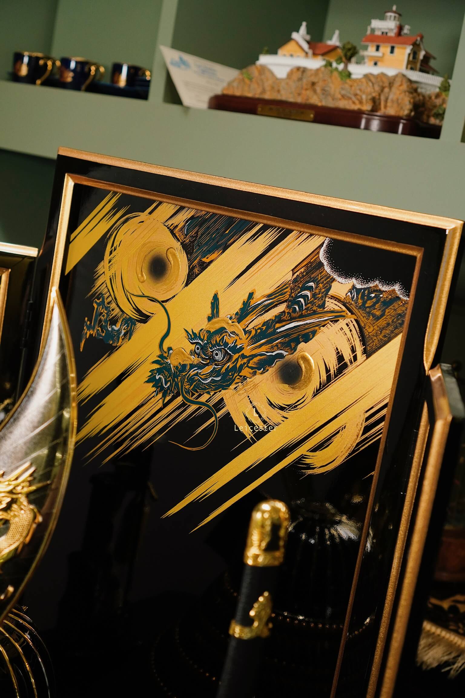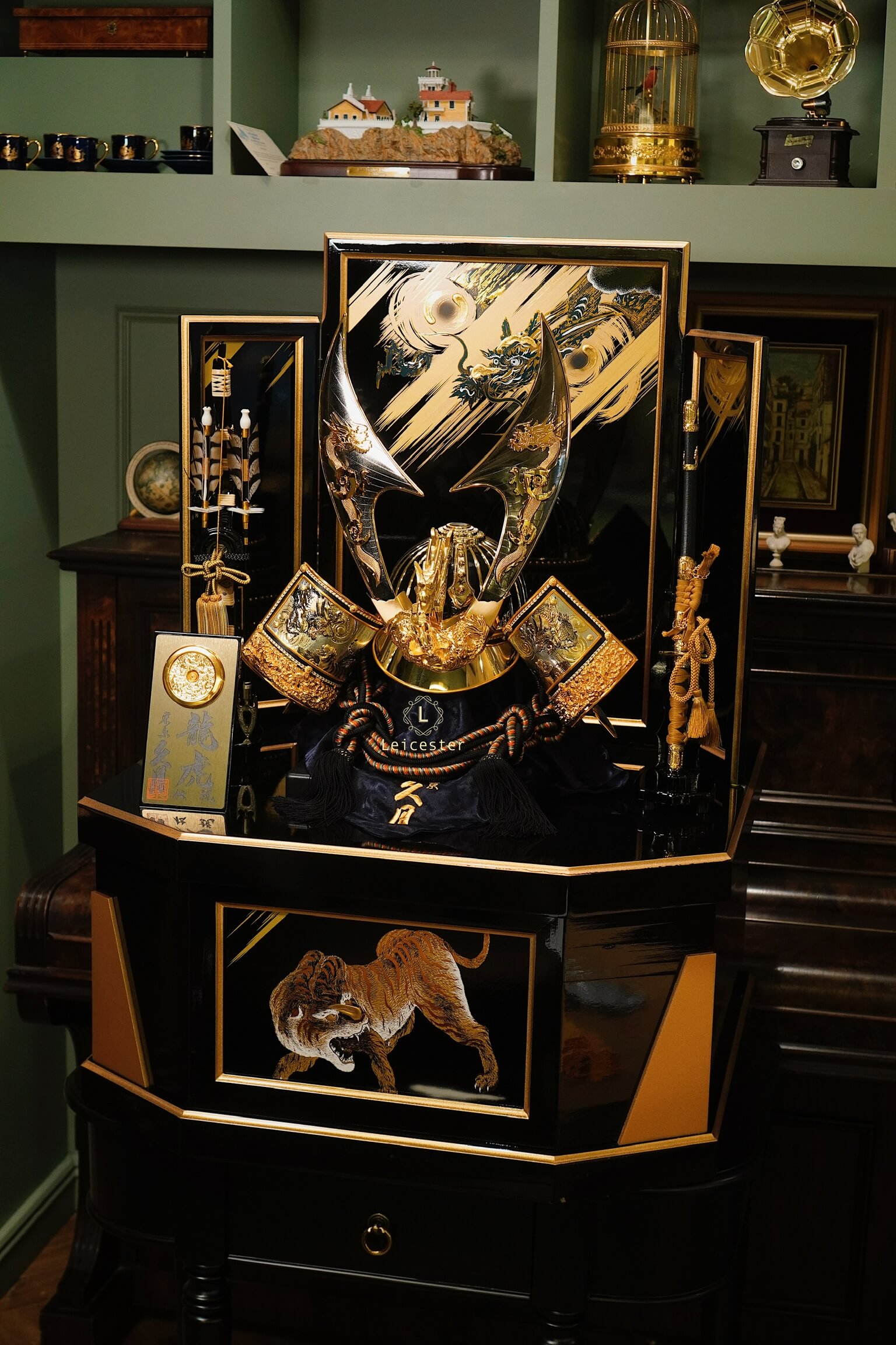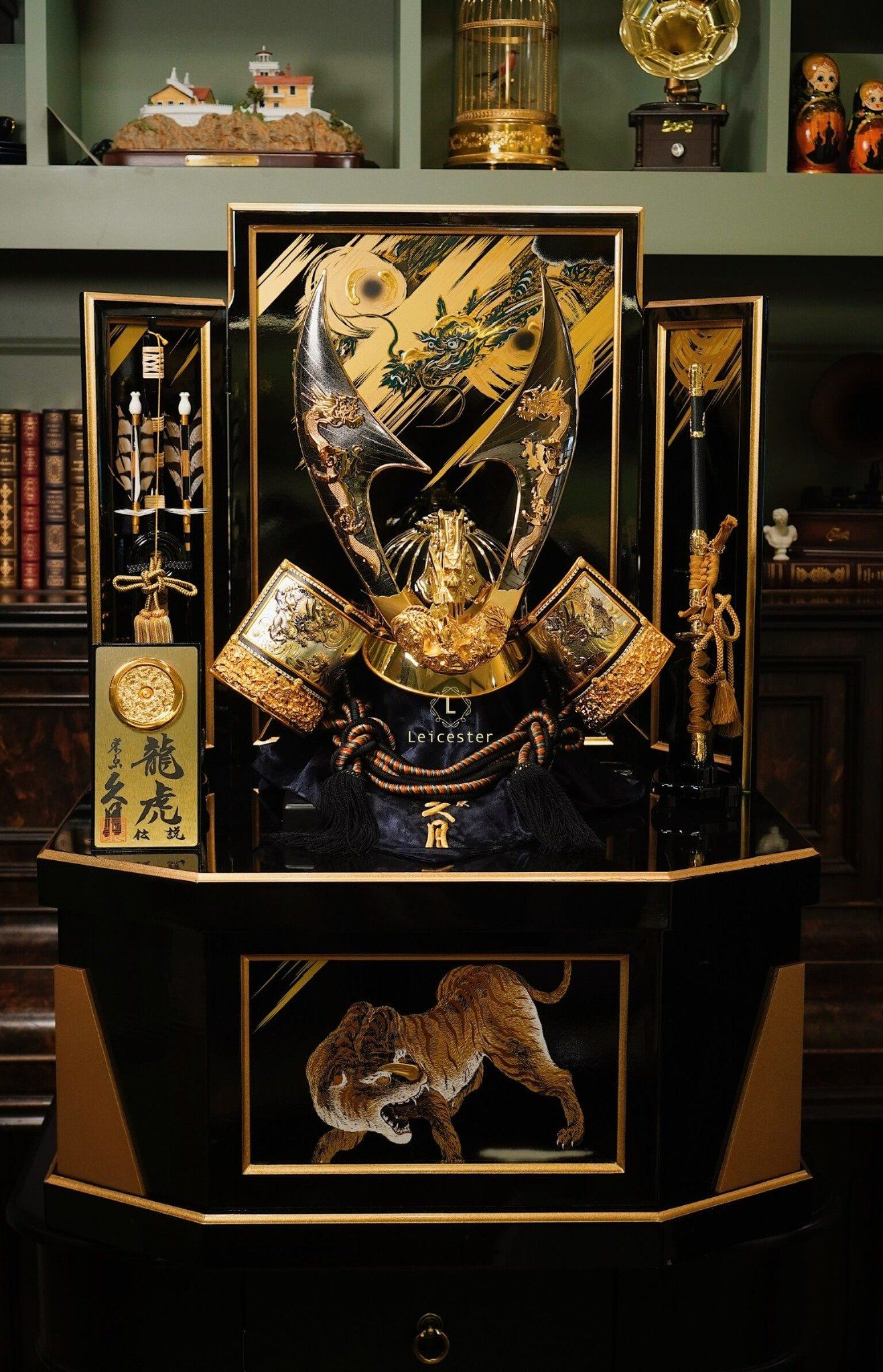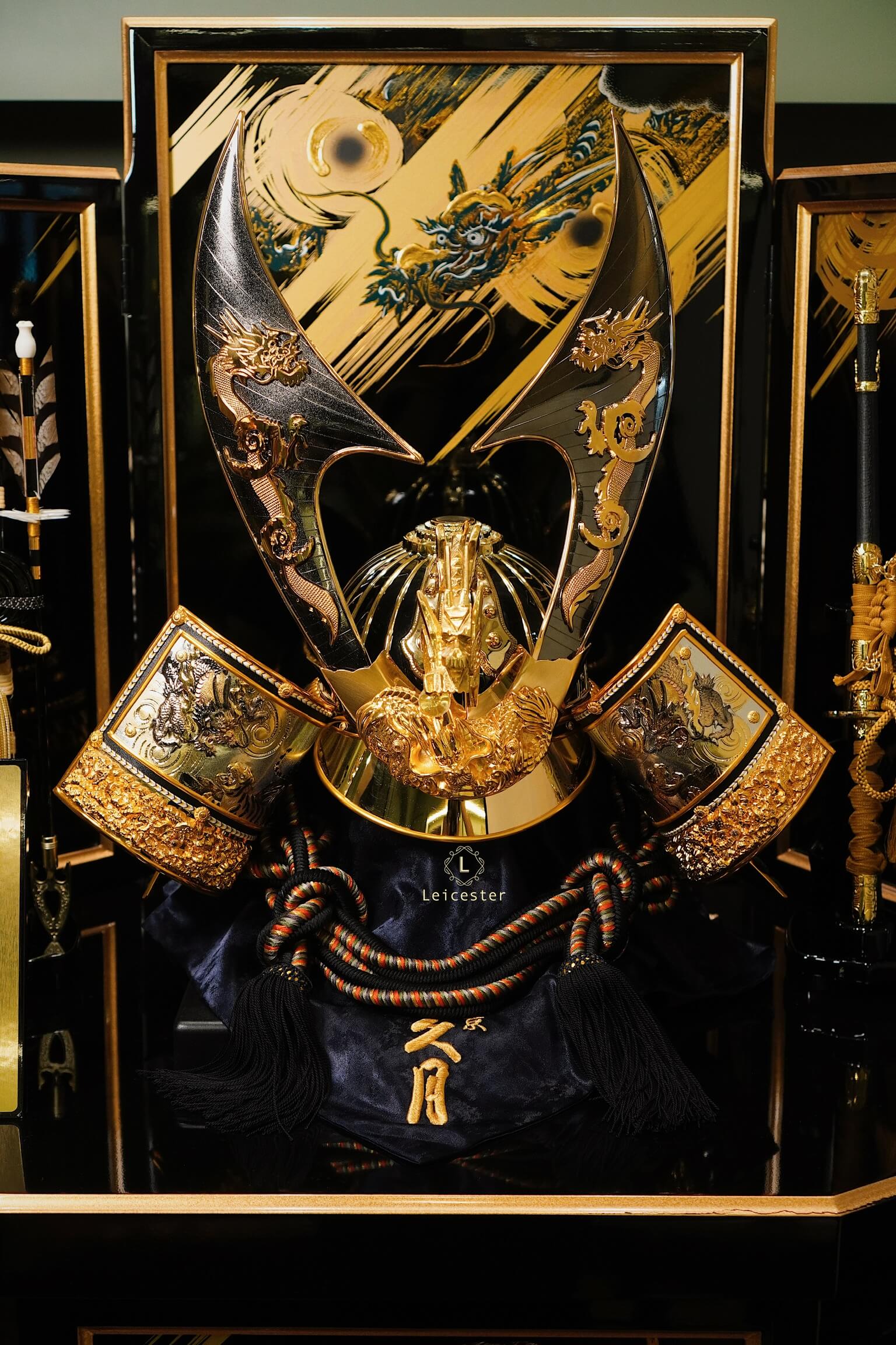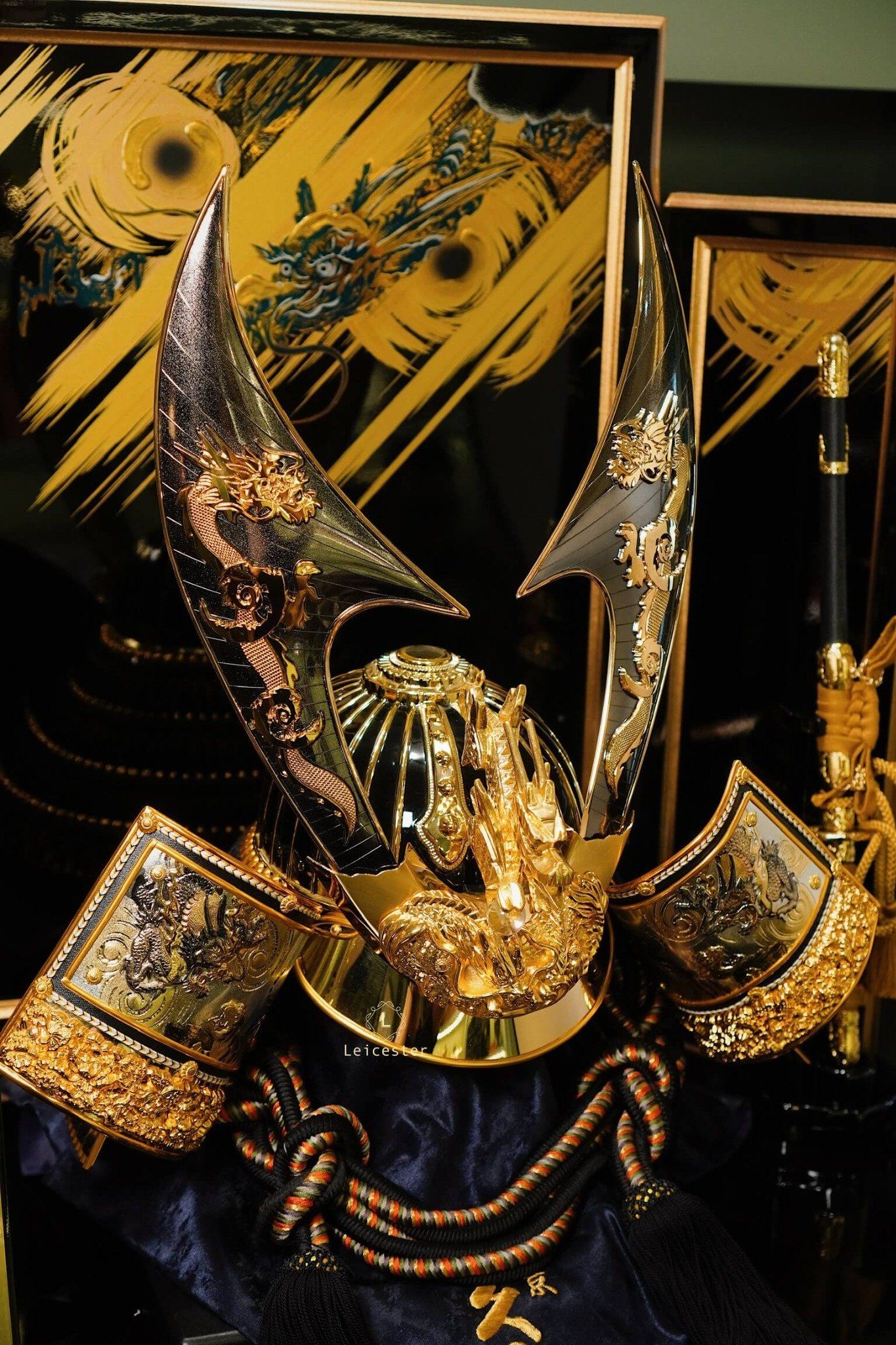 Long Hổ Chi Giáp nổi bật với mũ Kabuto mạ vàng 24K, khắc họa hình tượng rồng vàng và hổ vờn mây - biểu trưng cho trí tuệ và sức mạnh. Hai sừng cong hình trăng khuyết gợi dấu ấn của Date Masamune - vị lãnh chúa huyền thoại thời Chiến Quốc. Tổng thể phối màu đen sơn mài, vàng hoàng kim và lụa tím quý tộc, kết hợp cùng bình phong rồng bay hổ múa đã tạo nên vẻ oai hùng, uy nghi mà vẫn thanh nhã, là một tác phẩm nghệ thuật đậm chất tinh thần Samurai.