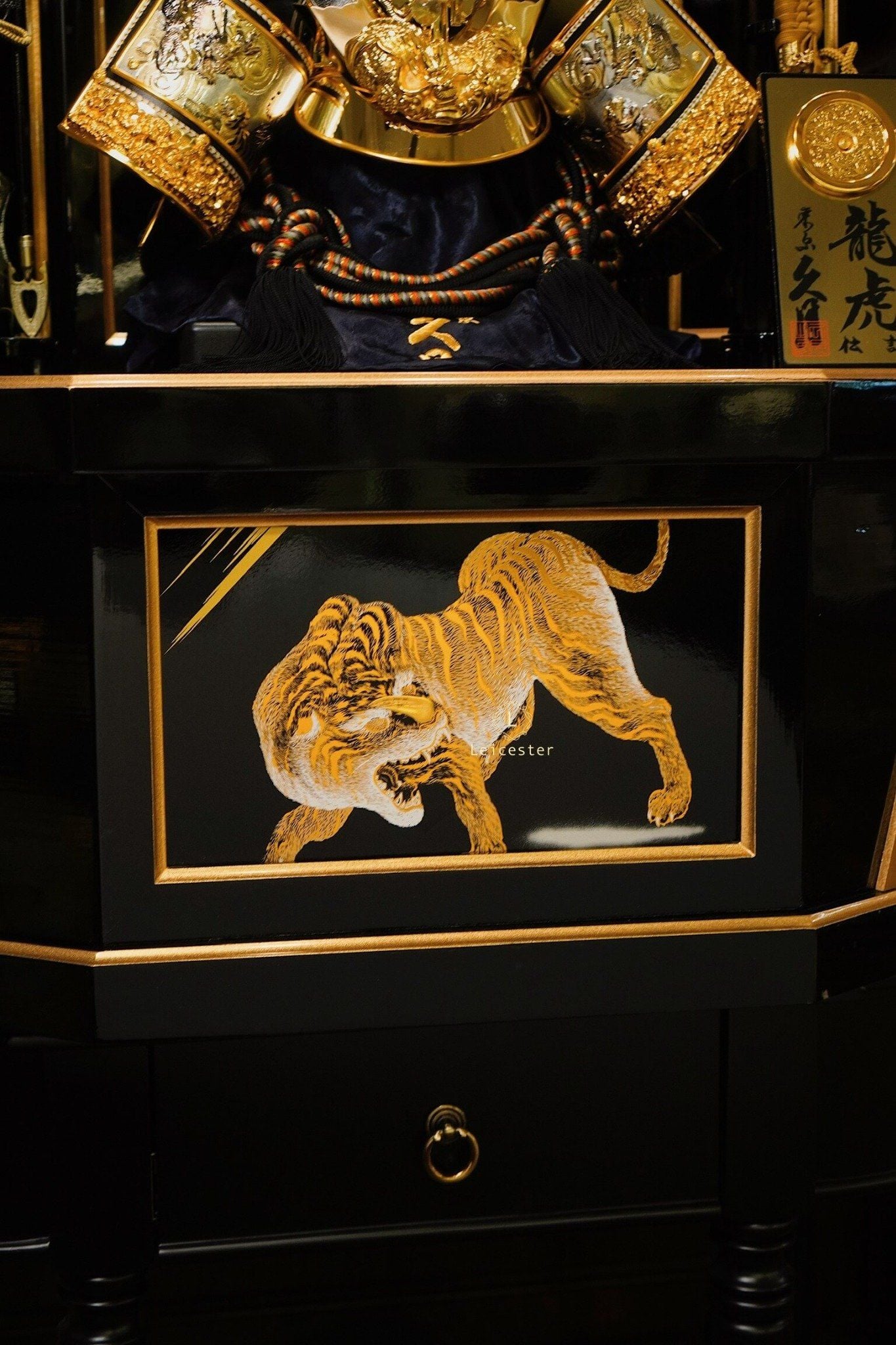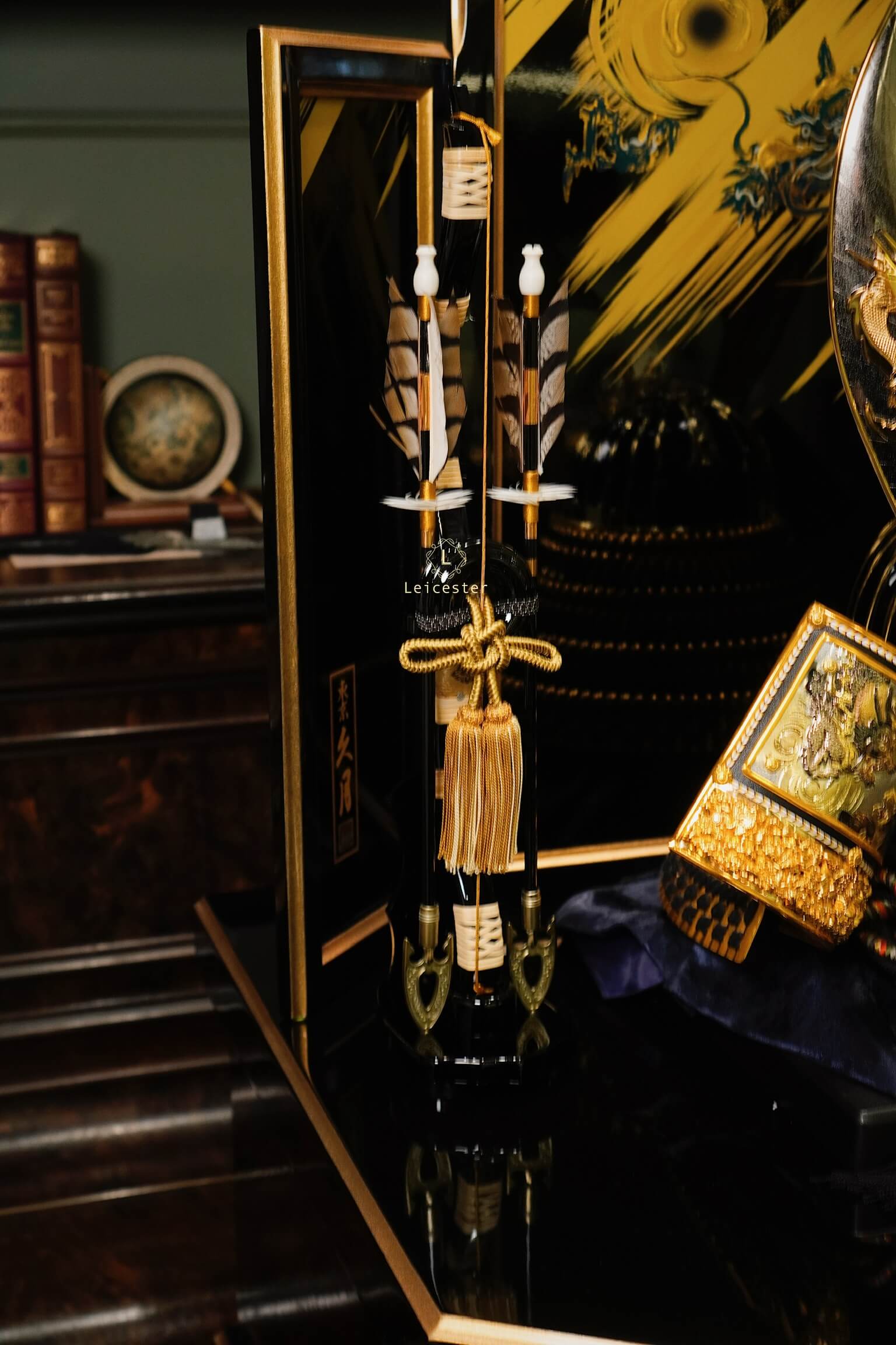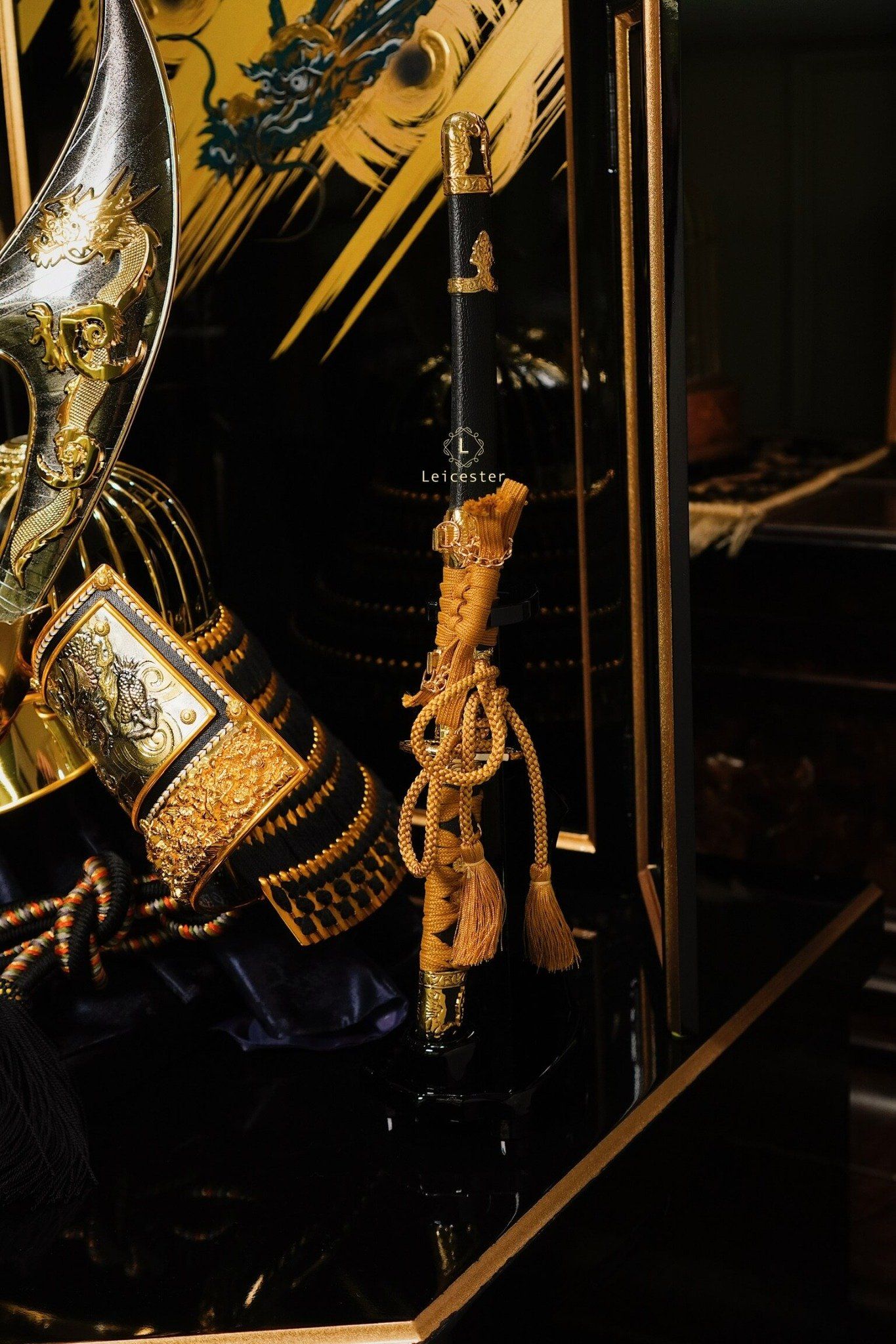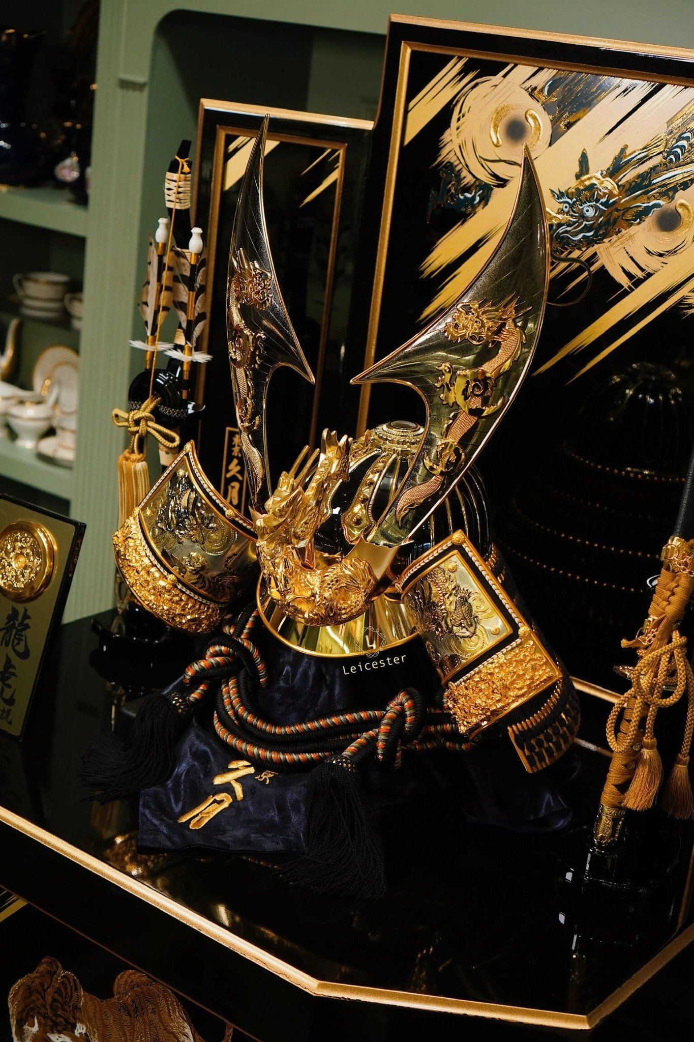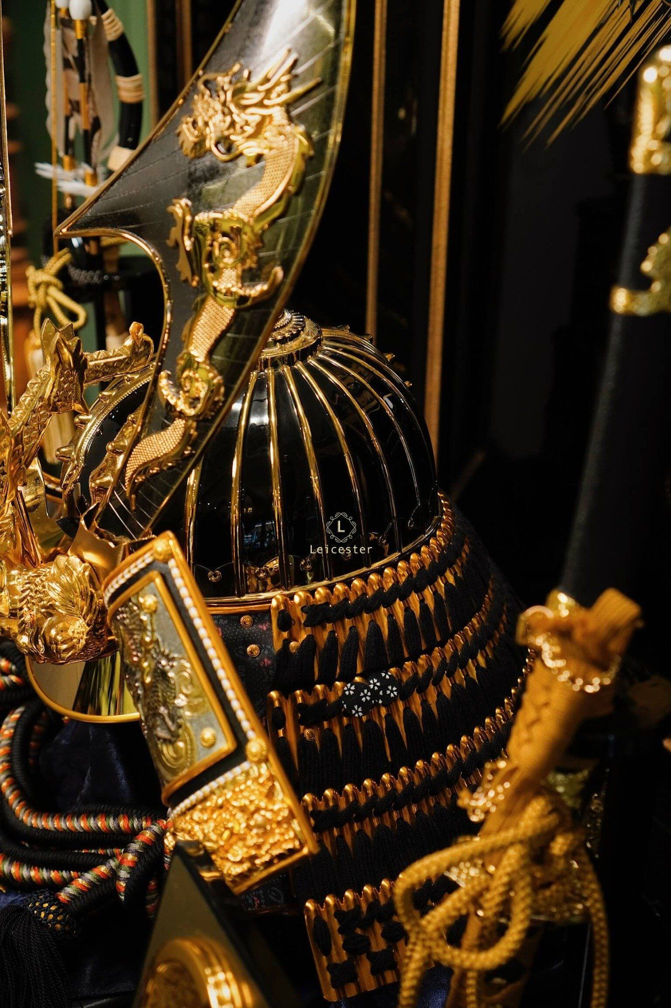 Long Hổ Chi Giáp nổi bật với mũ Kabuto mạ vàng 24K, khắc họa hình tượng rồng vàng và hổ vờn mây - biểu trưng cho trí tuệ và sức mạnh. Hai sừng cong hình trăng khuyết gợi dấu ấn của Date Masamune - vị lãnh chúa huyền thoại thời Chiến Quốc. Tổng thể phối màu đen sơn mài, vàng hoàng kim và lụa tím quý tộc, kết hợp cùng bình phong rồng bay hổ múa đã tạo nên vẻ oai hùng, uy nghi mà vẫn thanh nhã, là một tác phẩm nghệ thuật đậm chất tinh thần Samurai.