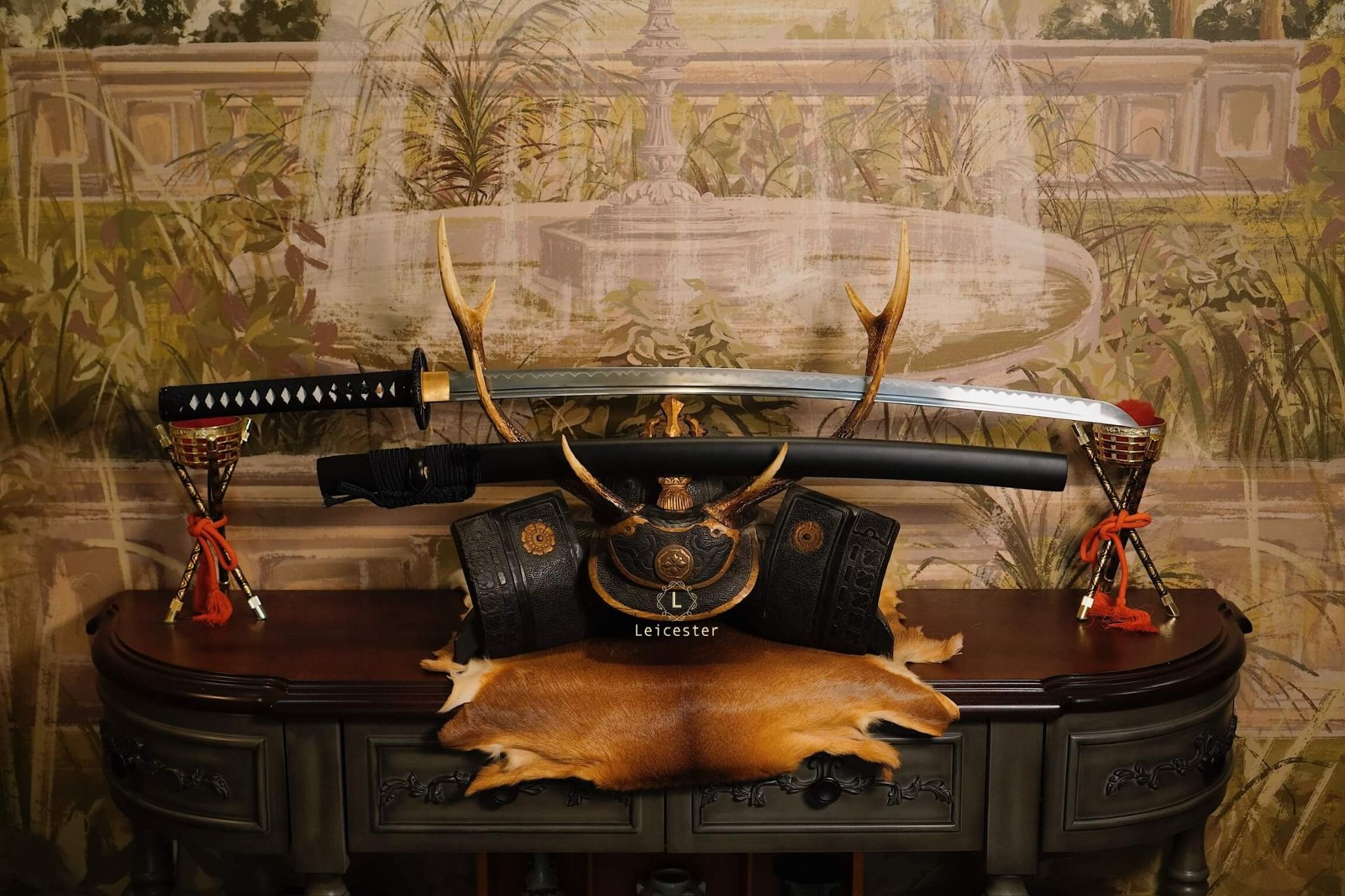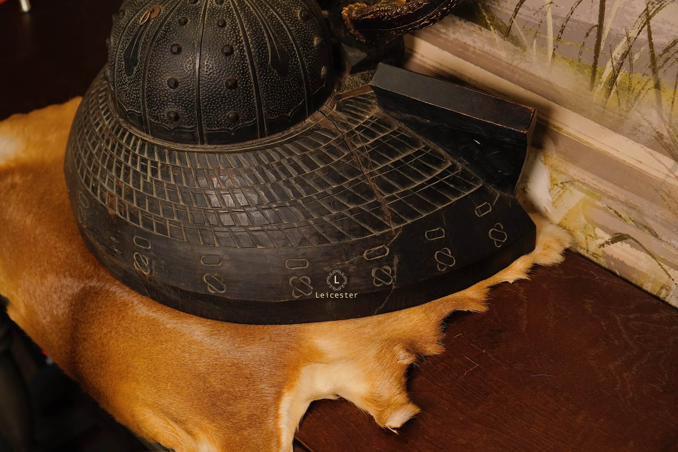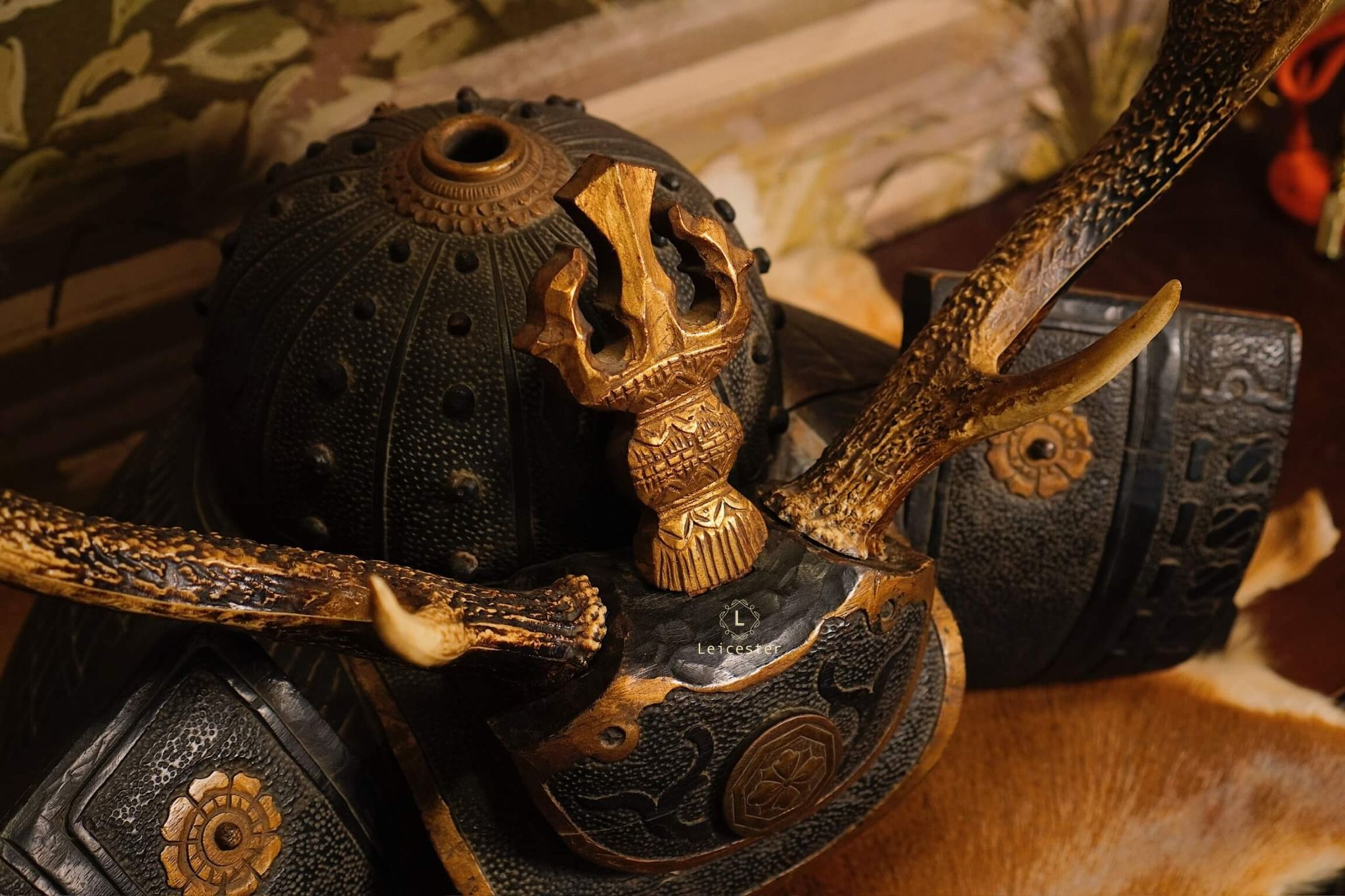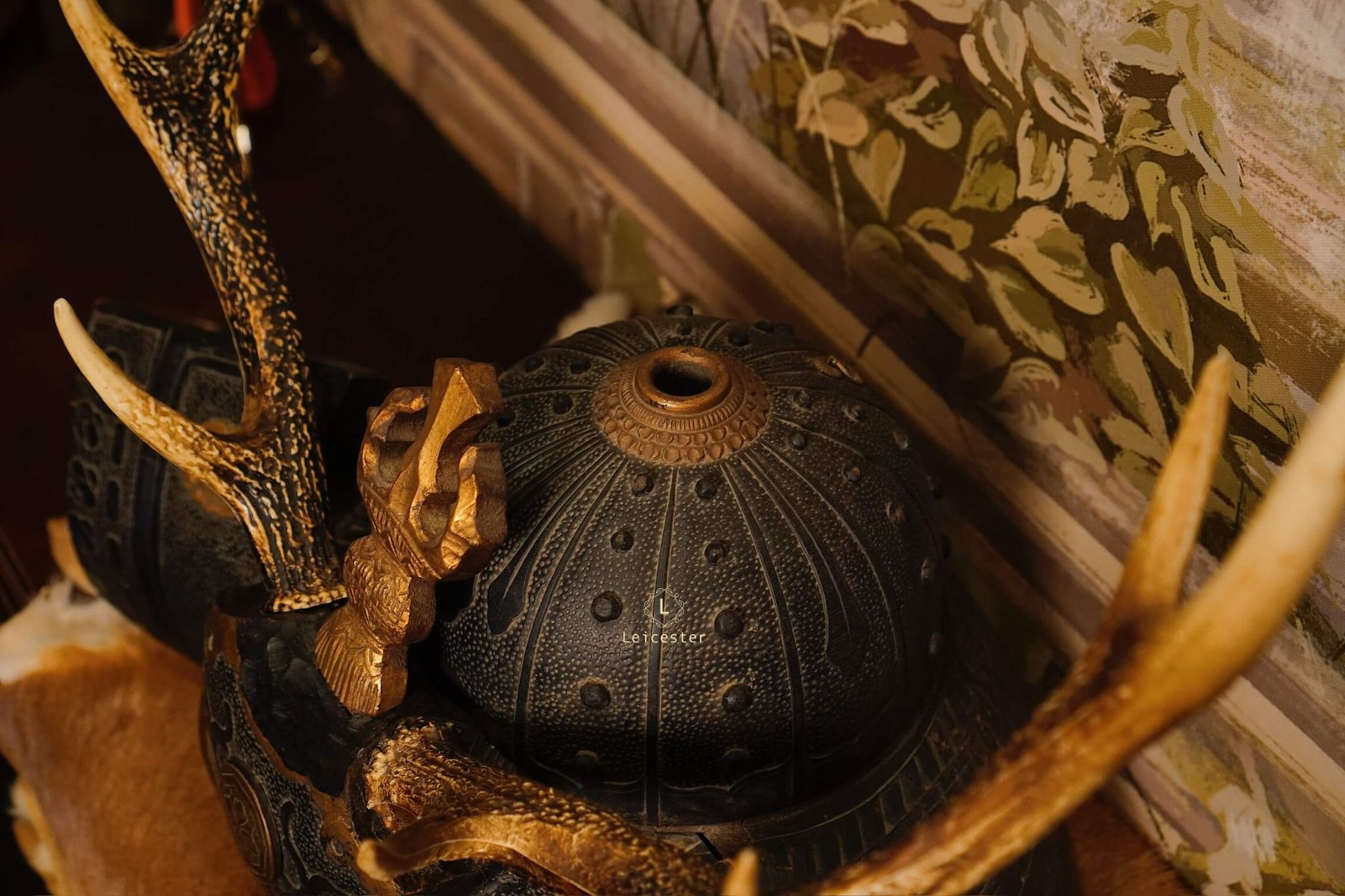 Mũ giáp samurai được chạm khắc thủ công hoàn toàn từ gỗ tự nhiên, thể hiện sự công phu và tinh tế của nghệ nhân cùng với điểm nhấn đặc biệt là hai chiếc sừng hươu - biểu tượng cho sức mạnh thiên nhiên, sự bền bỉ và khả năng sống sót qua thử thách khắc nghiệt. Đi kèm theo là thanh katana với vỏ bao bằng gỗ.