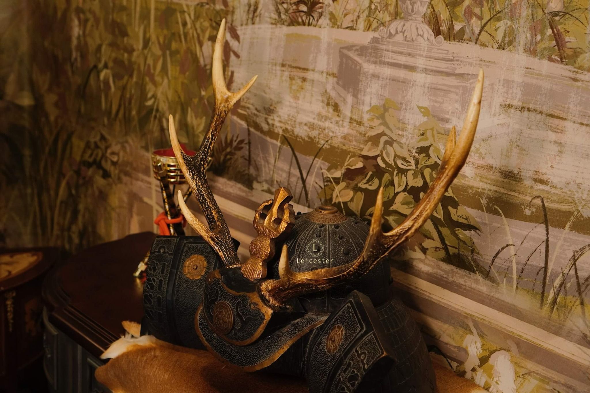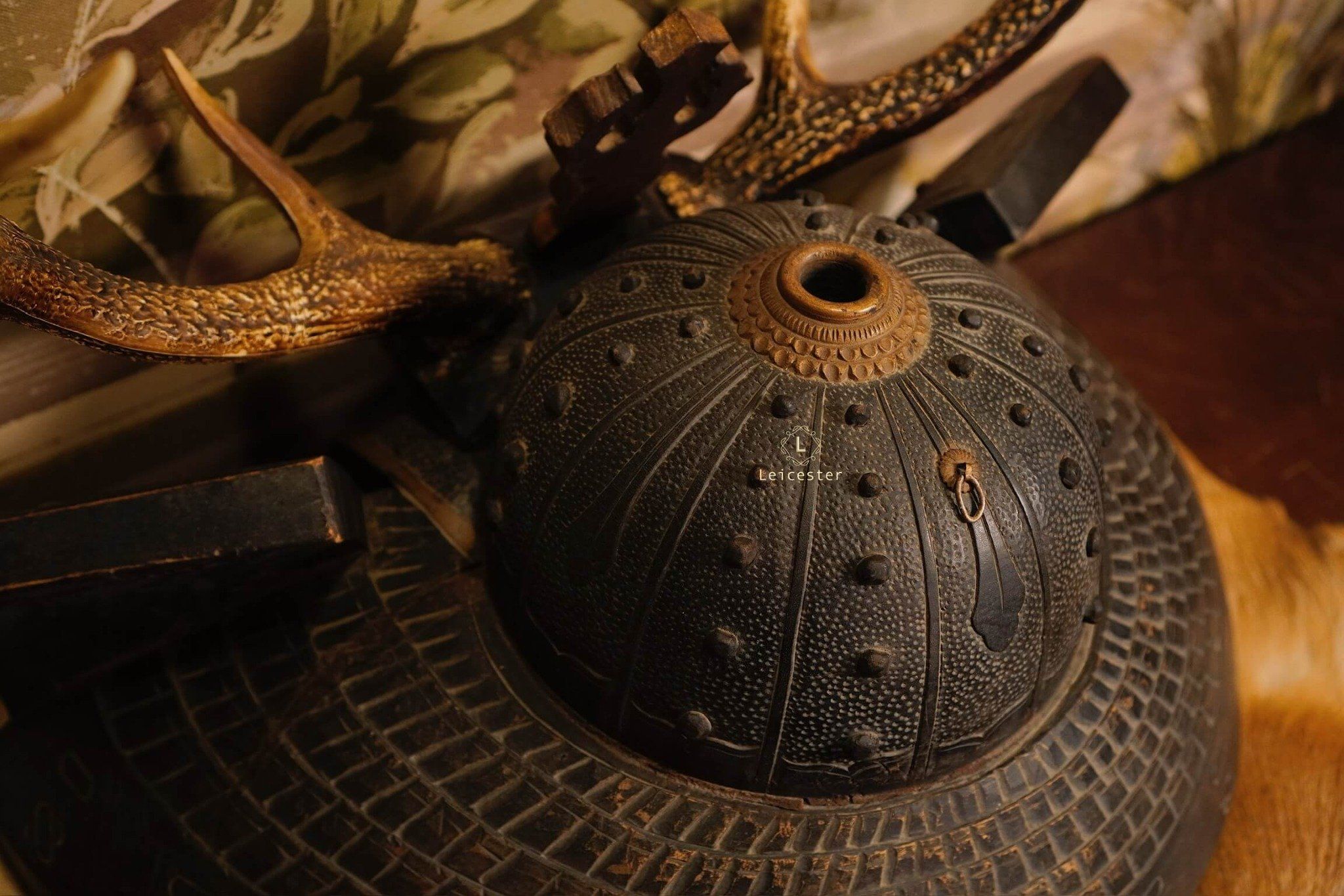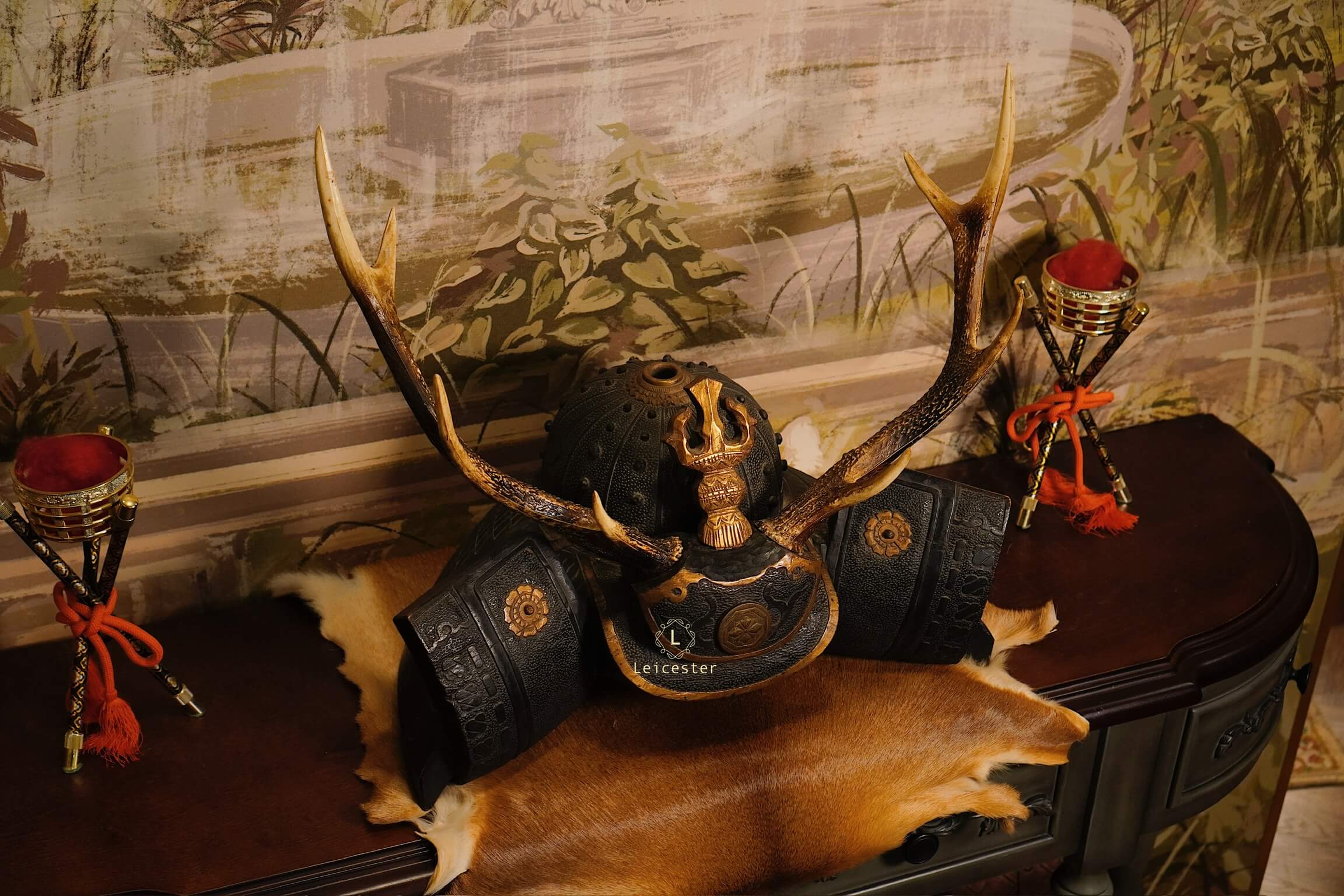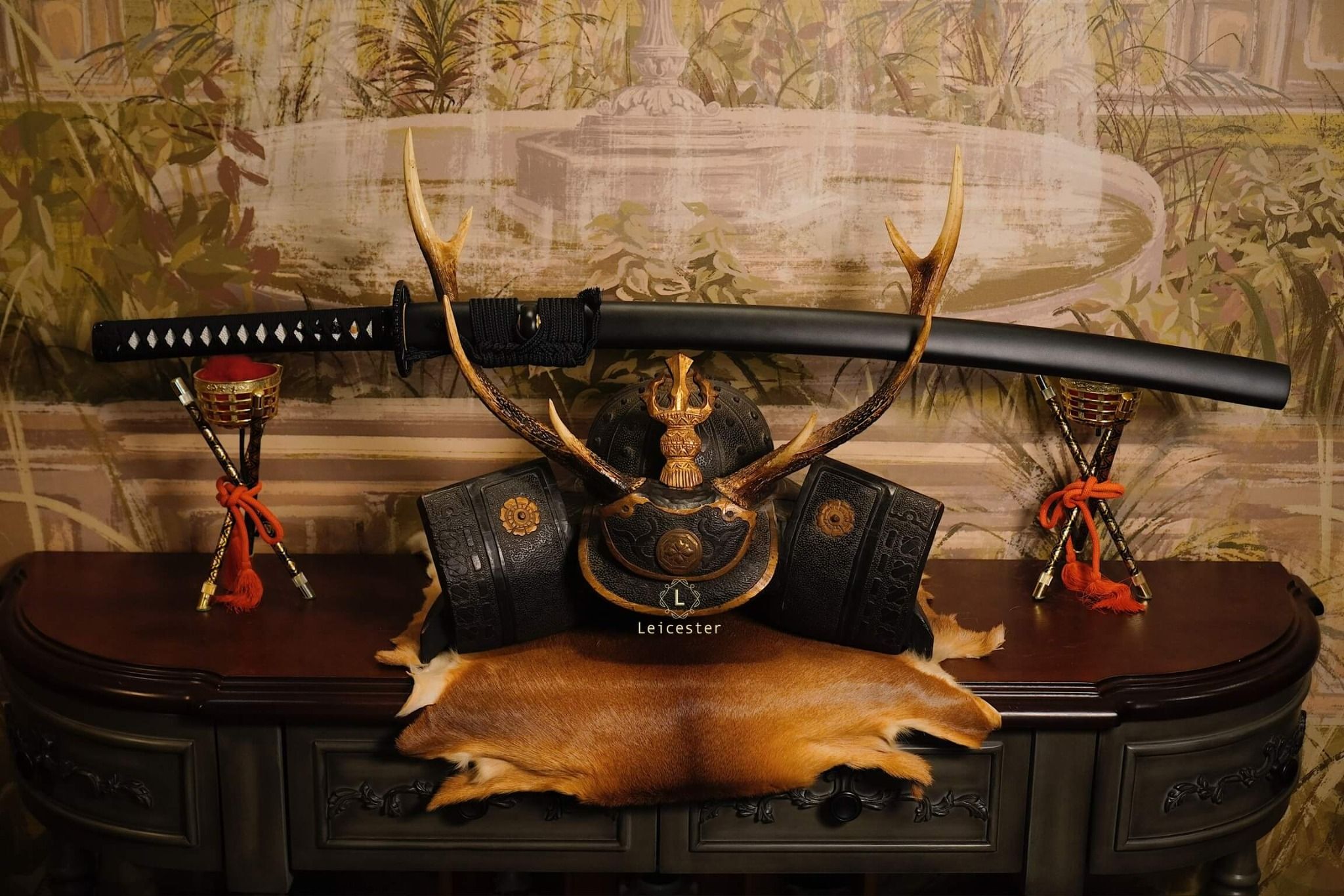 Mũ giáp samurai được chạm khắc thủ công hoàn toàn từ gỗ tự nhiên, thể hiện sự công phu và tinh tế của nghệ nhân cùng với điểm nhấn đặc biệt là hai chiếc sừng hươu - biểu tượng cho sức mạnh thiên nhiên, sự bền bỉ và khả năng sống sót qua thử thách khắc nghiệt. Đi kèm theo là thanh katana với vỏ bao bằng gỗ.