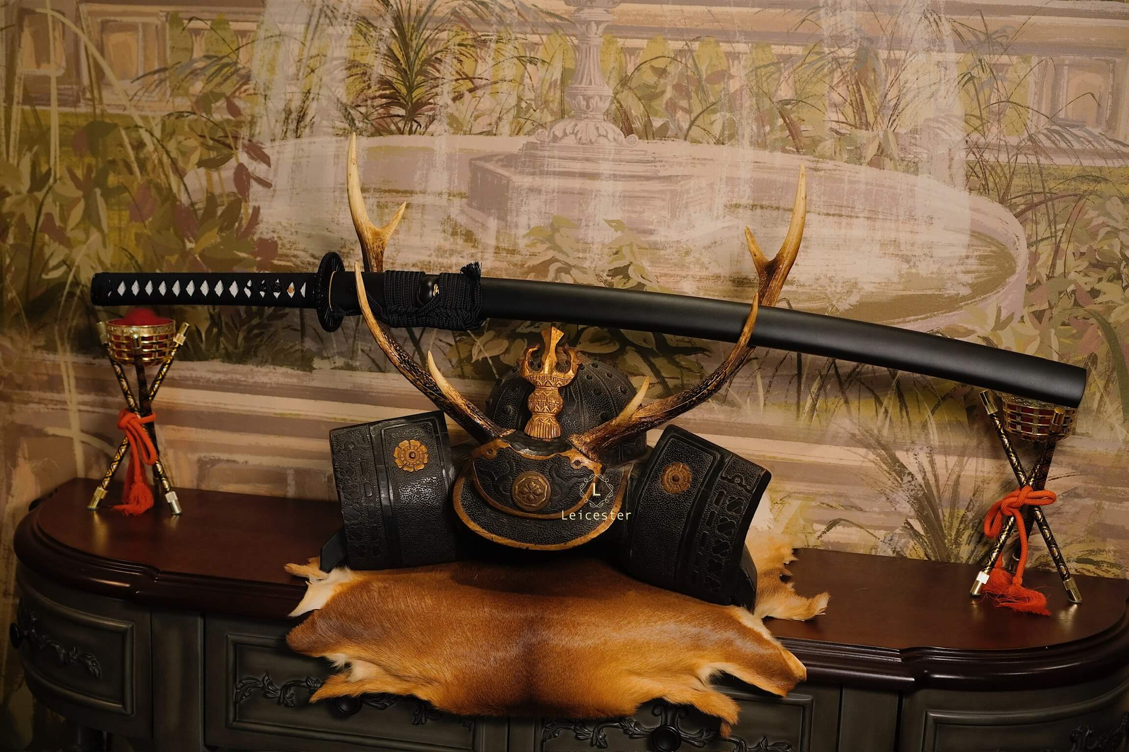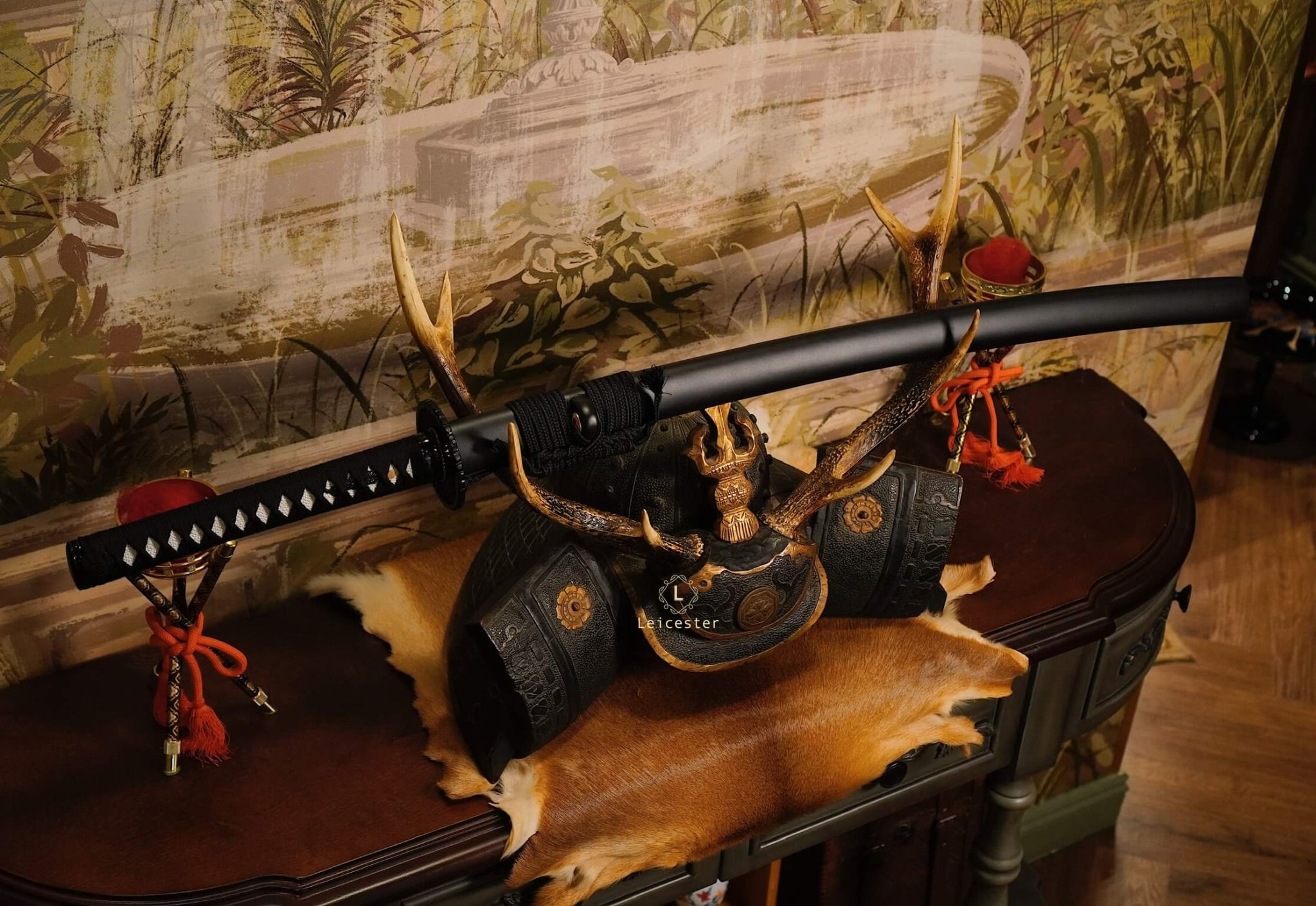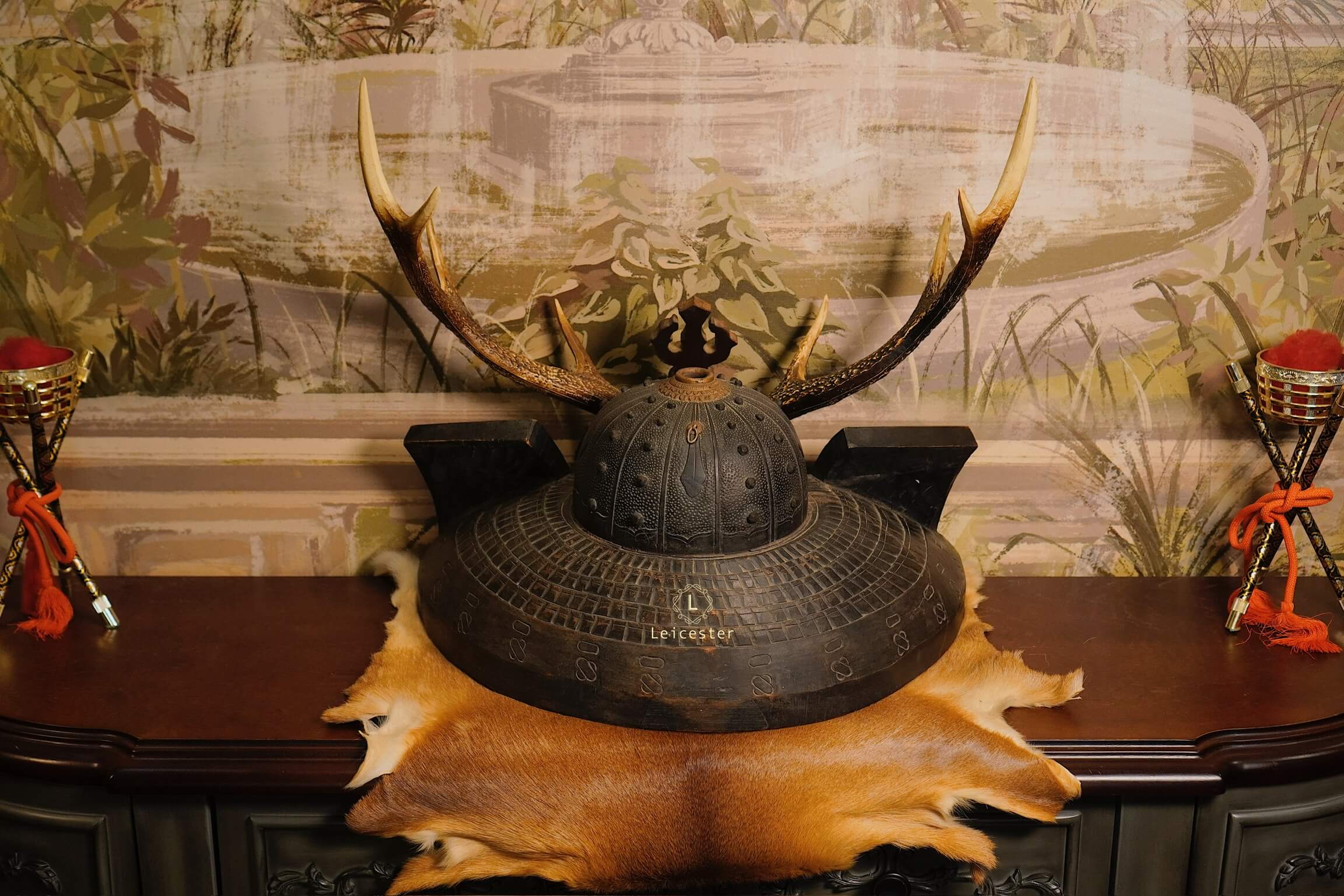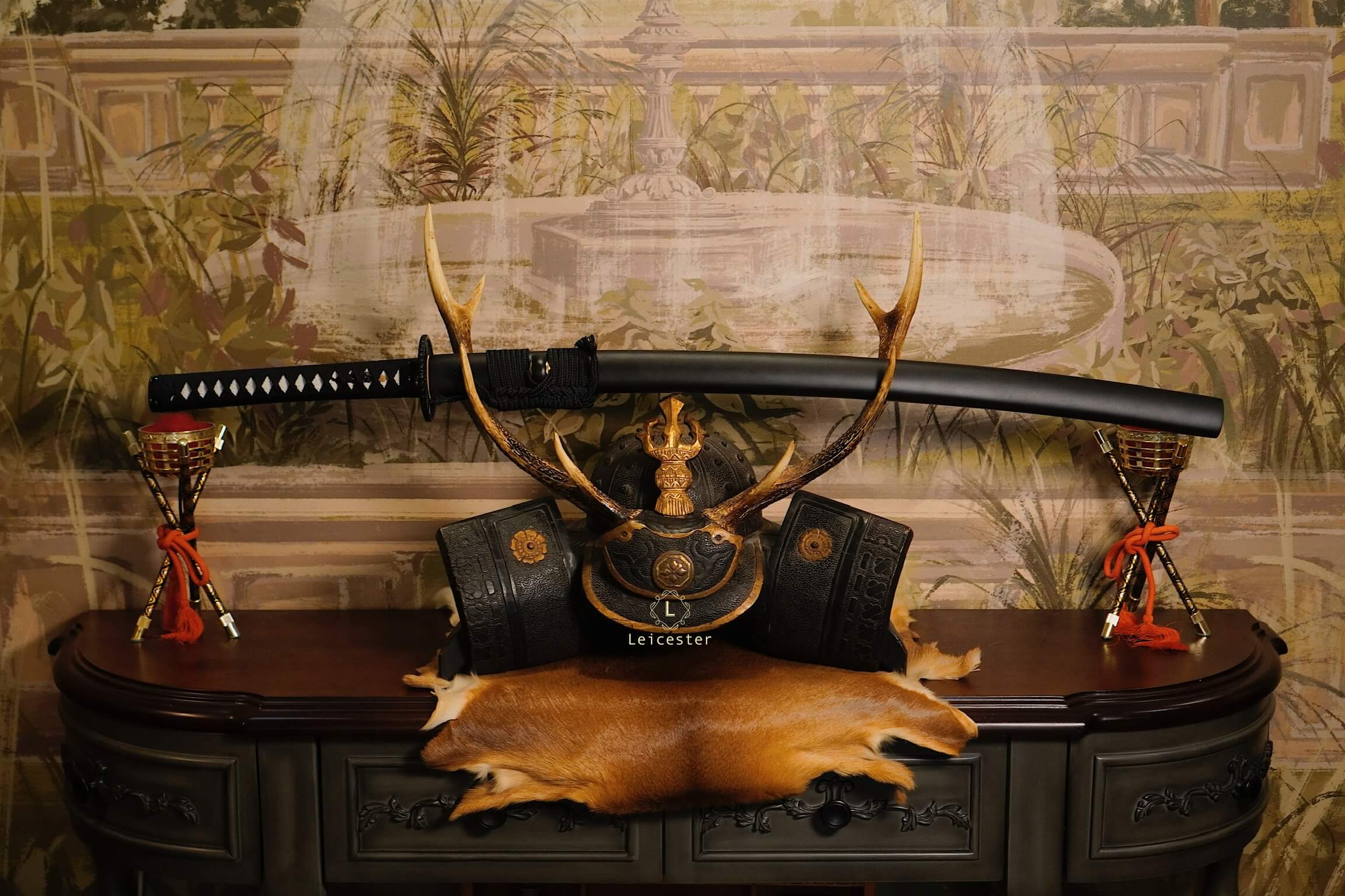 Mũ giáp samurai được chạm khắc thủ công hoàn toàn từ gỗ tự nhiên, thể hiện sự công phu và tinh tế của nghệ nhân cùng với điểm nhấn đặc biệt là hai chiếc sừng hươu - biểu tượng cho sức mạnh thiên nhiên, sự bền bỉ và khả năng sống sót qua thử thách khắc nghiệt. Đi kèm theo là thanh katana với vỏ bao bằng gỗ.