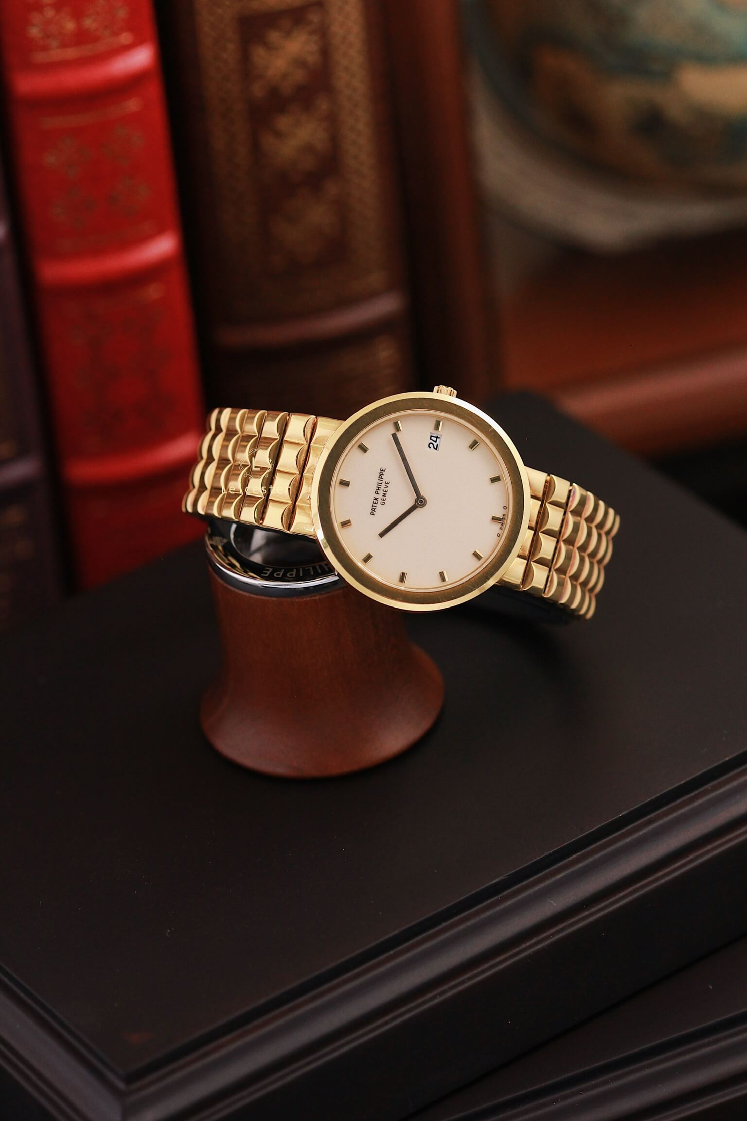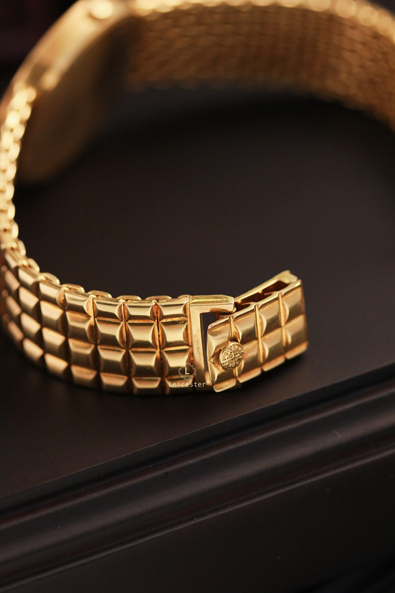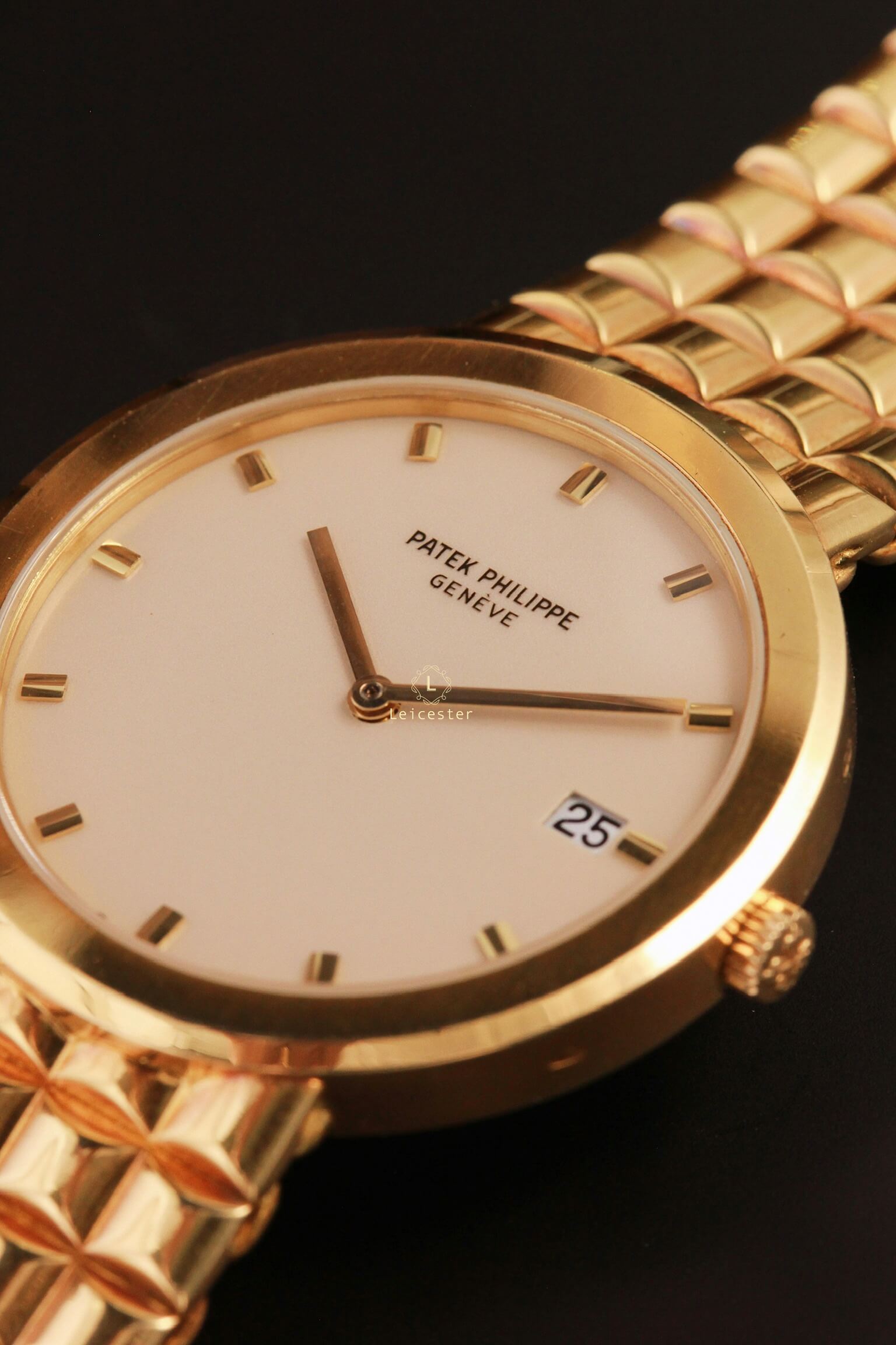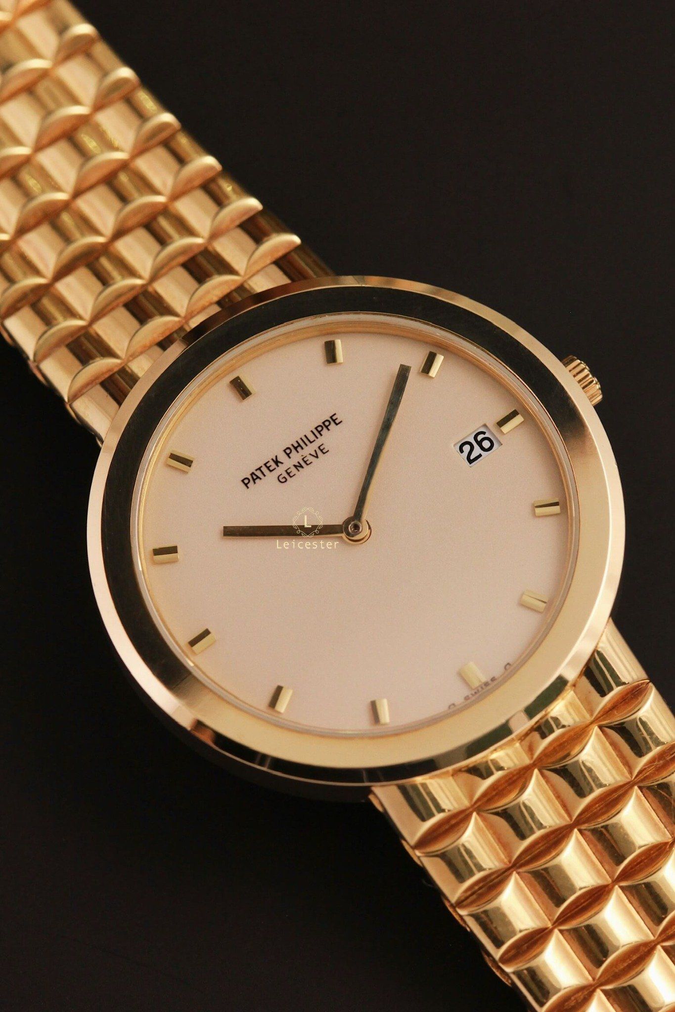 Vỏ tròn cổ điển kết hợp dây vàng liền nguyên bản (integrated bracelet) tạo nên tổng thể liền lạc, sang trọng và uy nghiêm – một thiết kế rất được ưa chuộng trong thời kỳ hoàng kim của đồng hồ vàng thập niên 80.