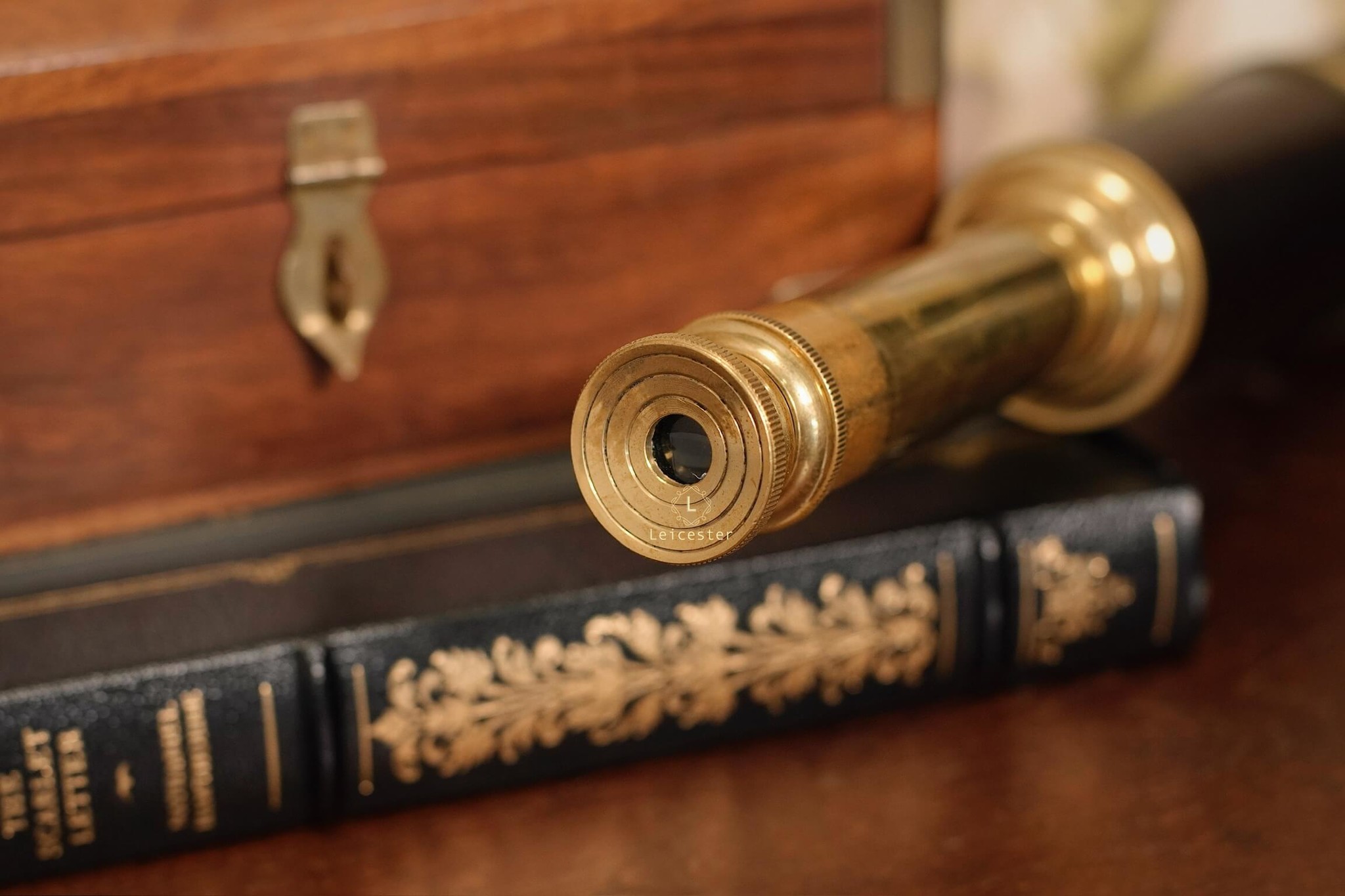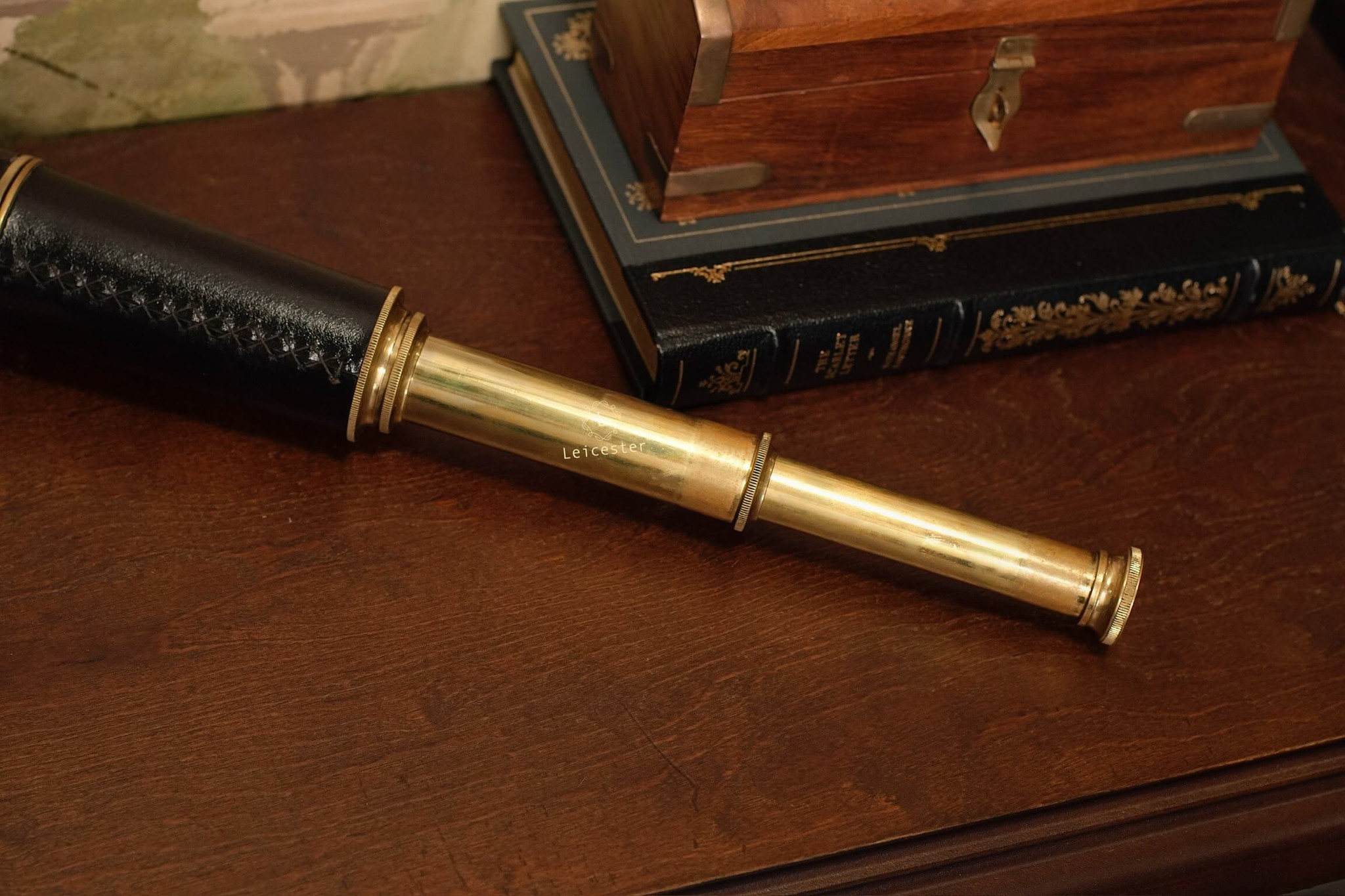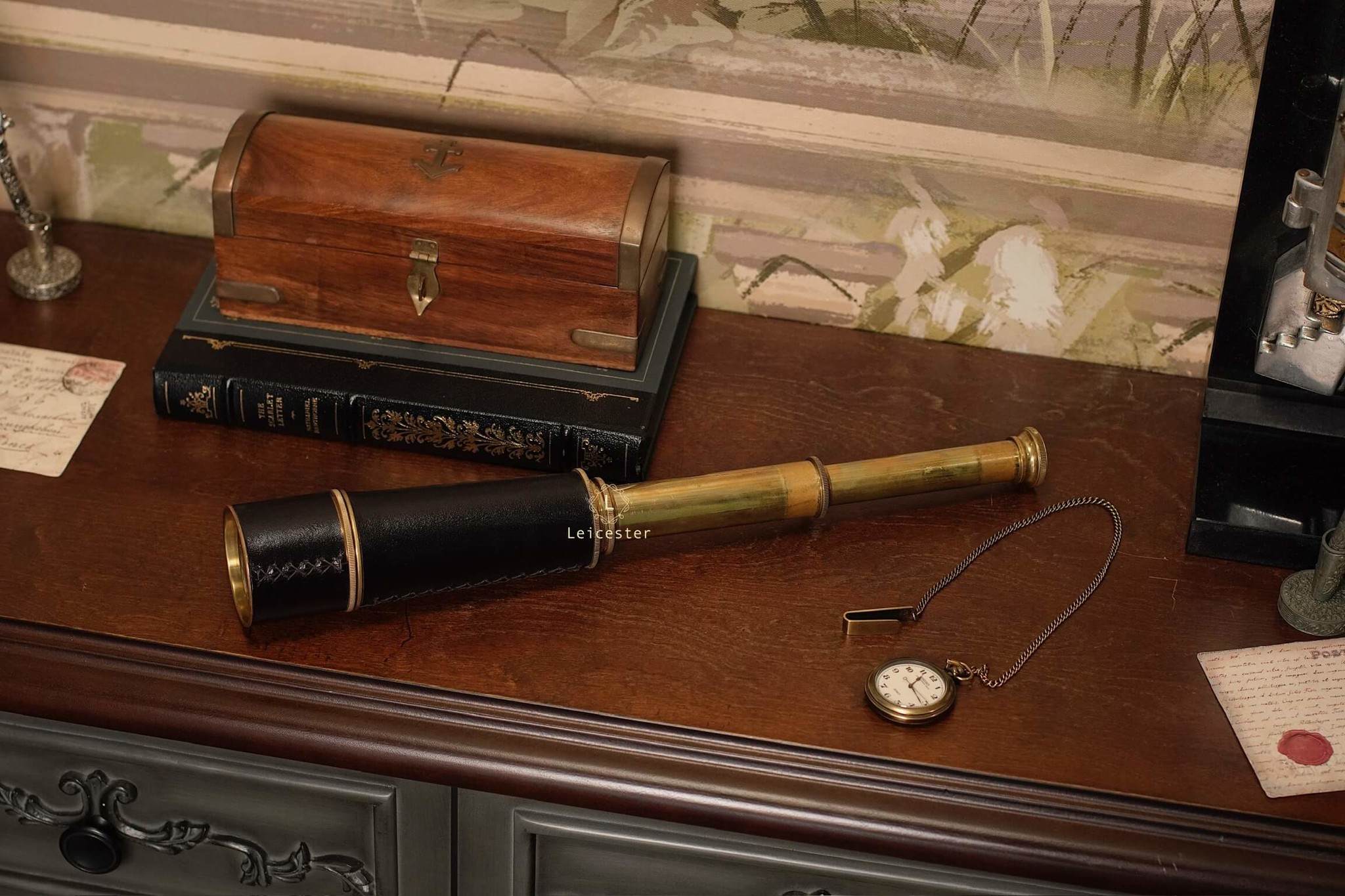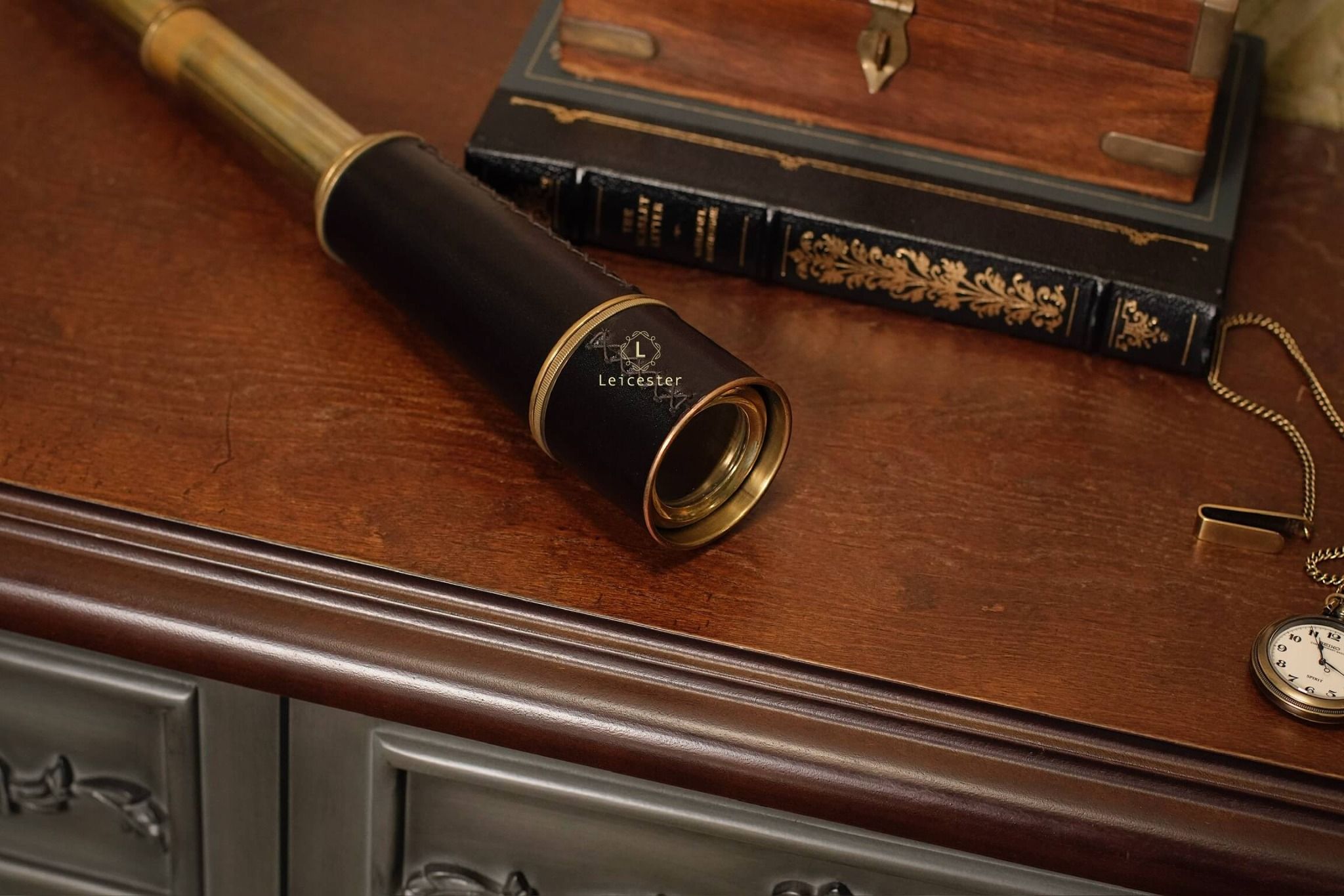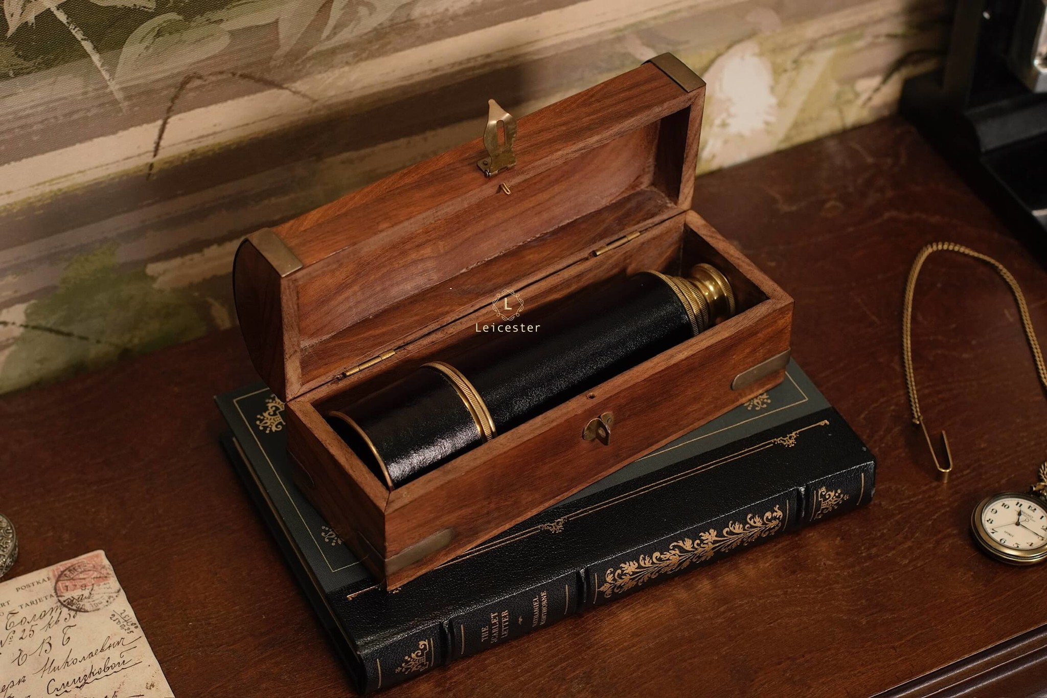 Kính viễn vọng bằng đồng thau cổ điển được bọc da với thấu kính 5X, được đặt gọn gàng trong hộp gỗ.