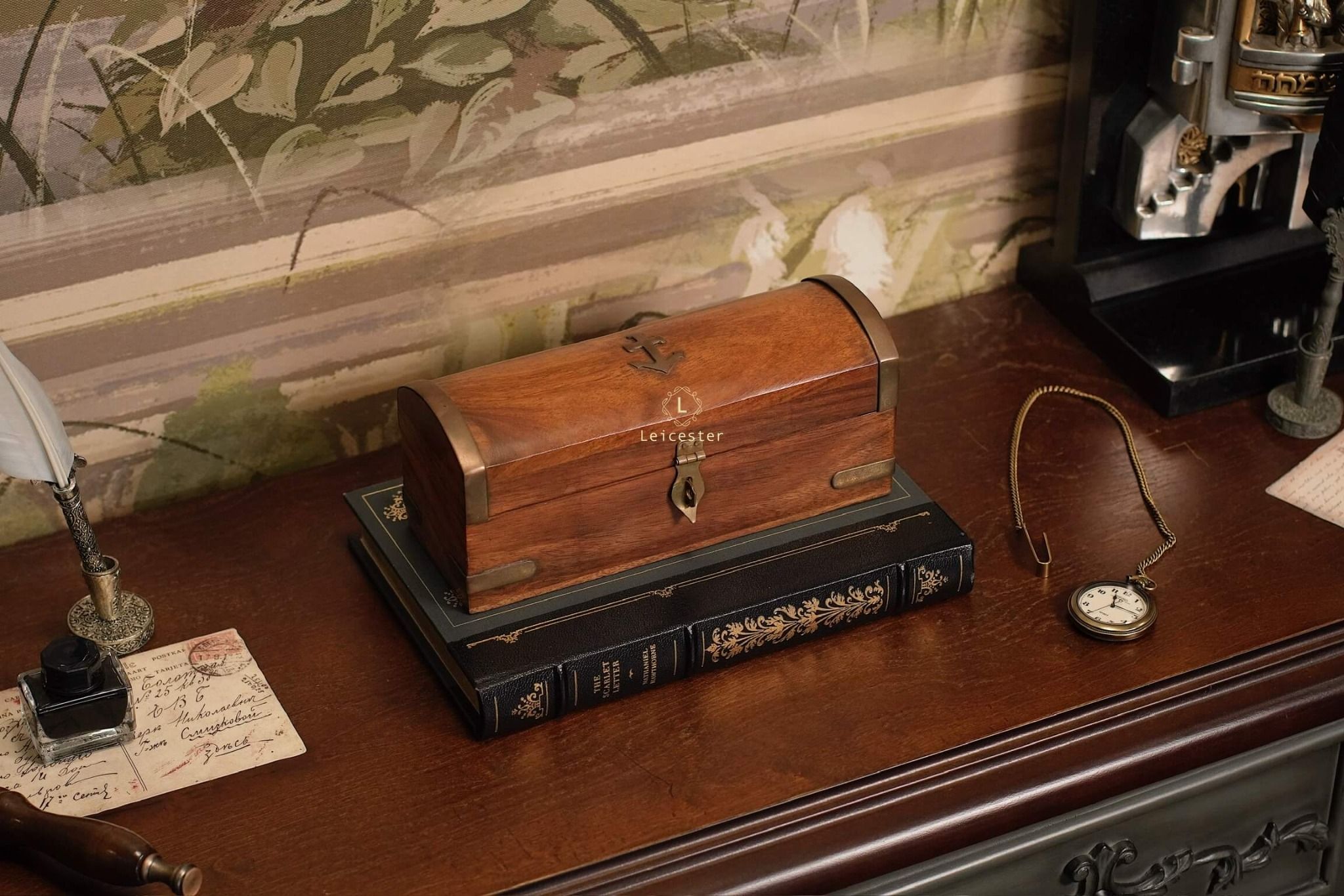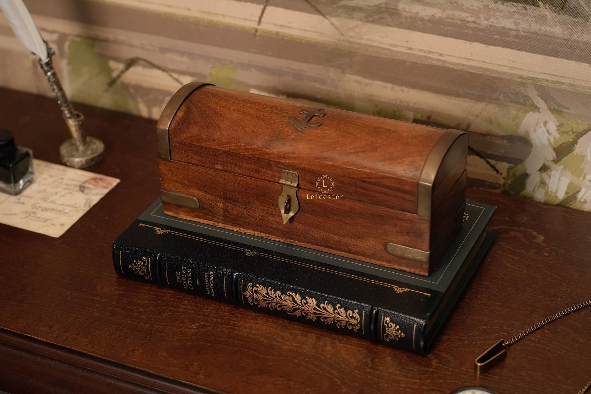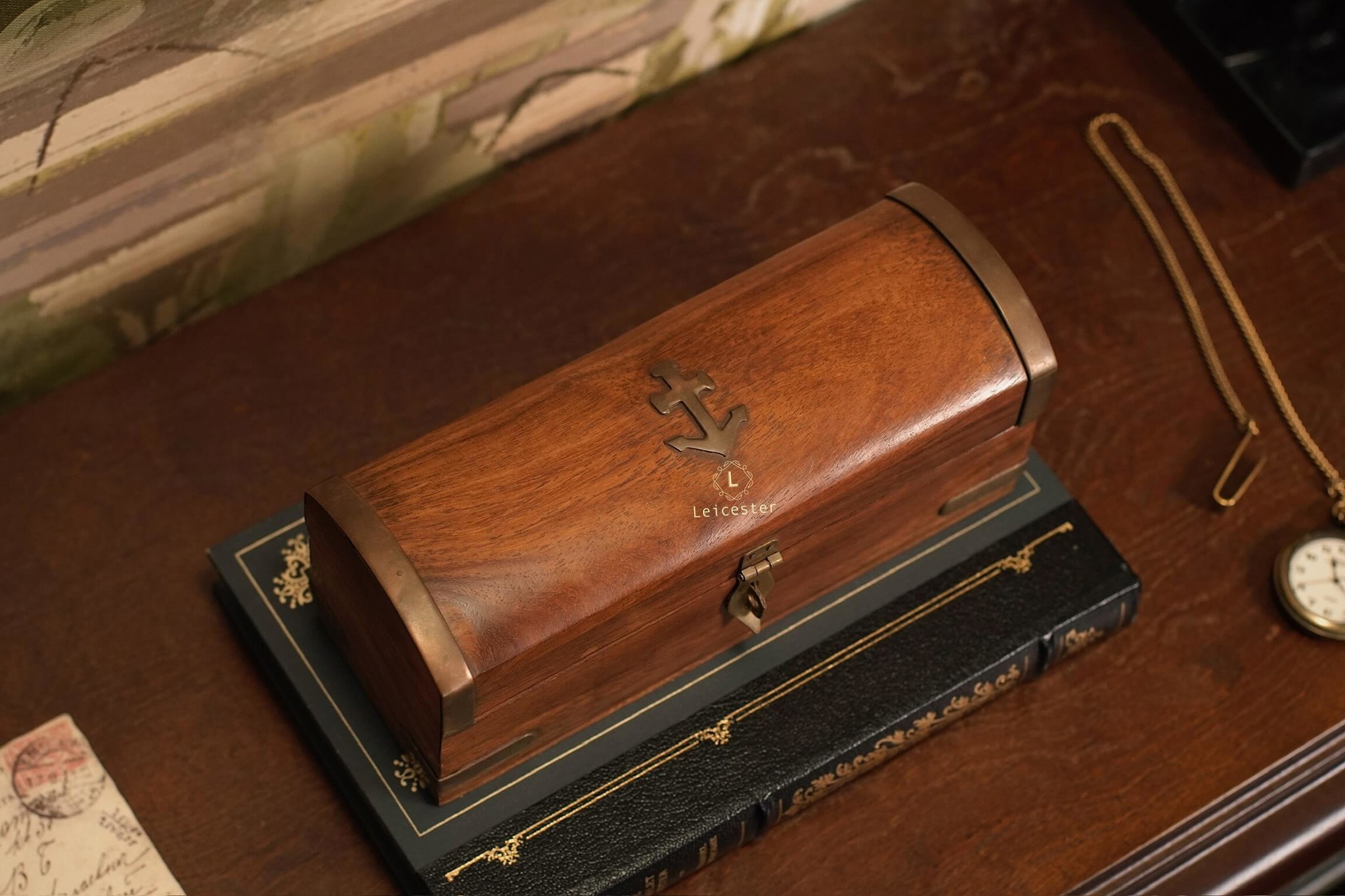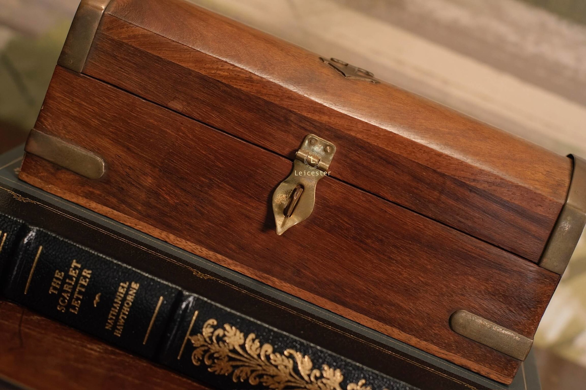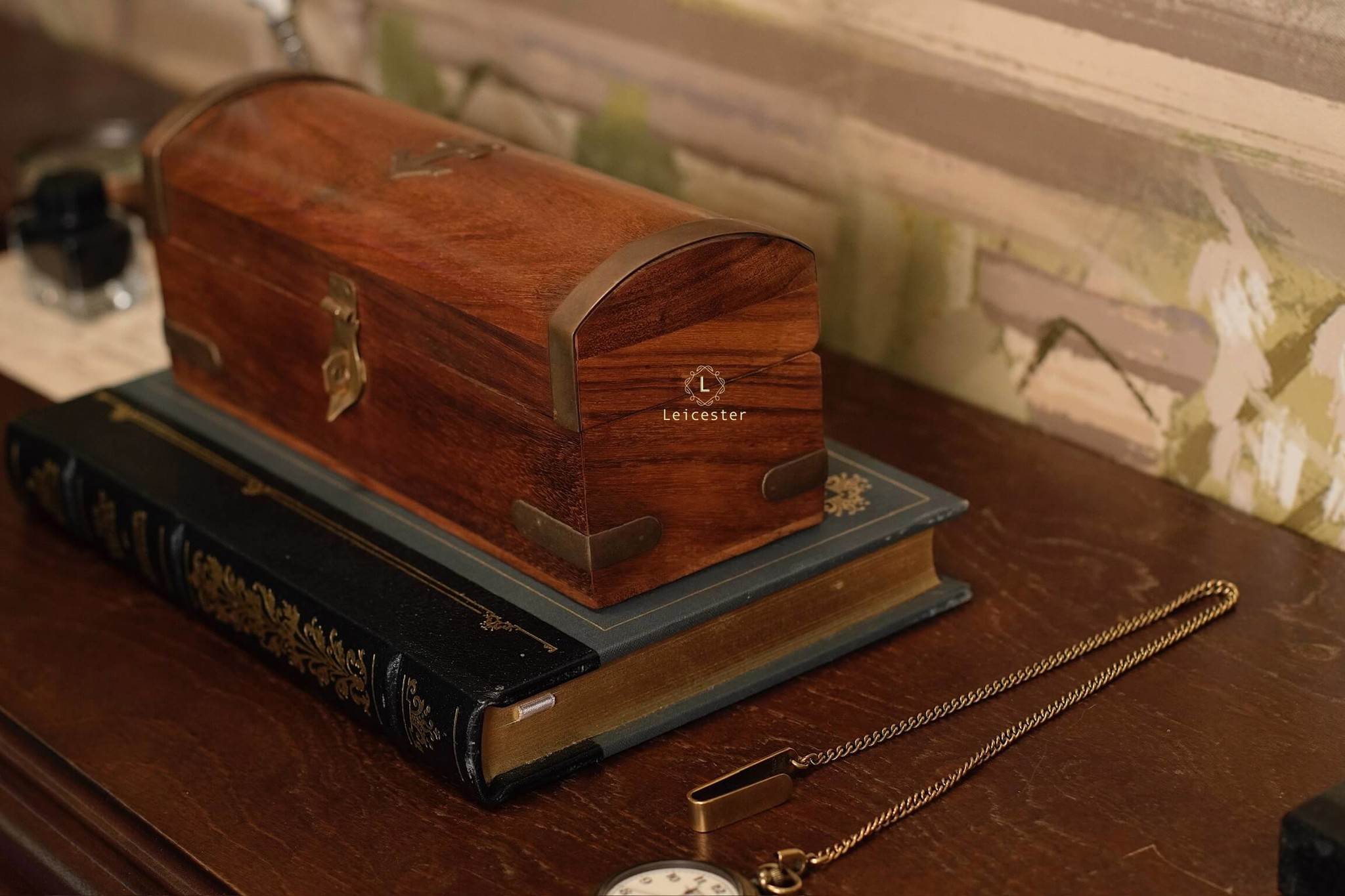 Kính viễn vọng bằng đồng thau cổ điển được bọc da với thấu kính 5X, được đặt gọn gàng trong hộp gỗ.