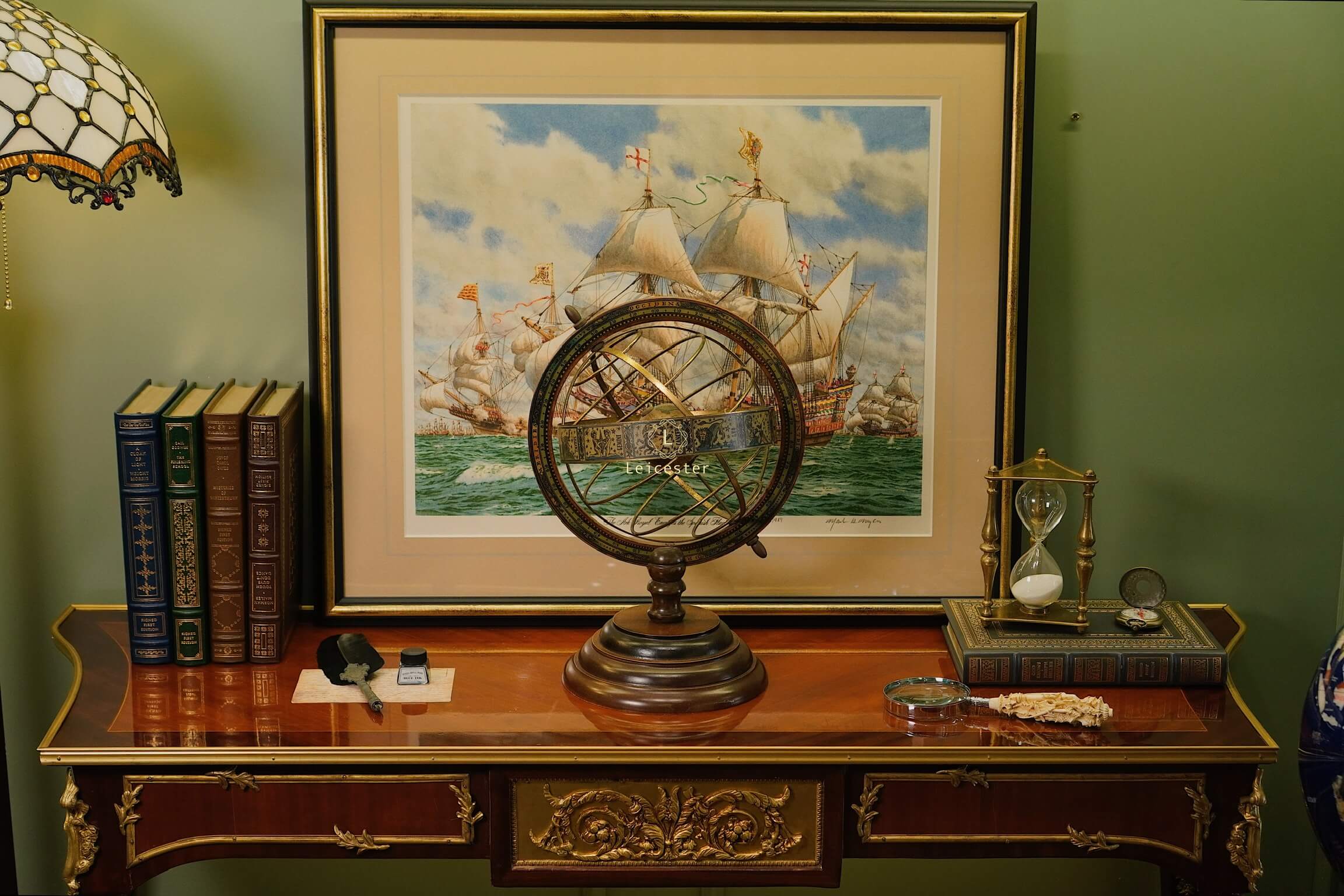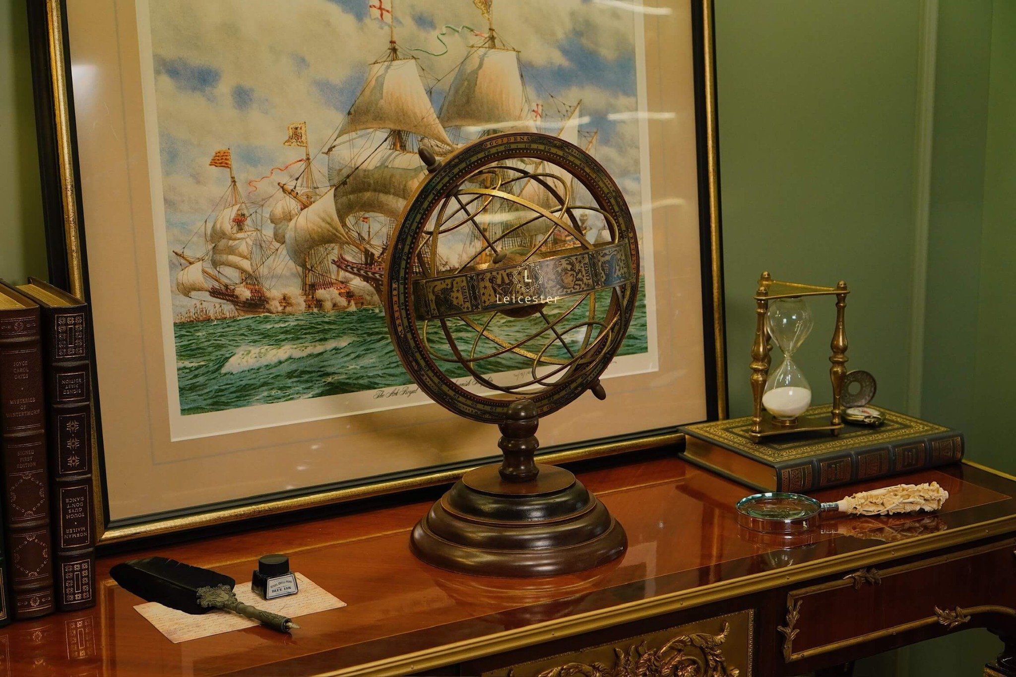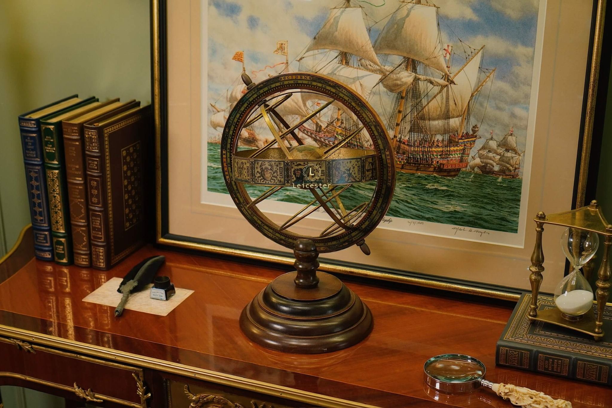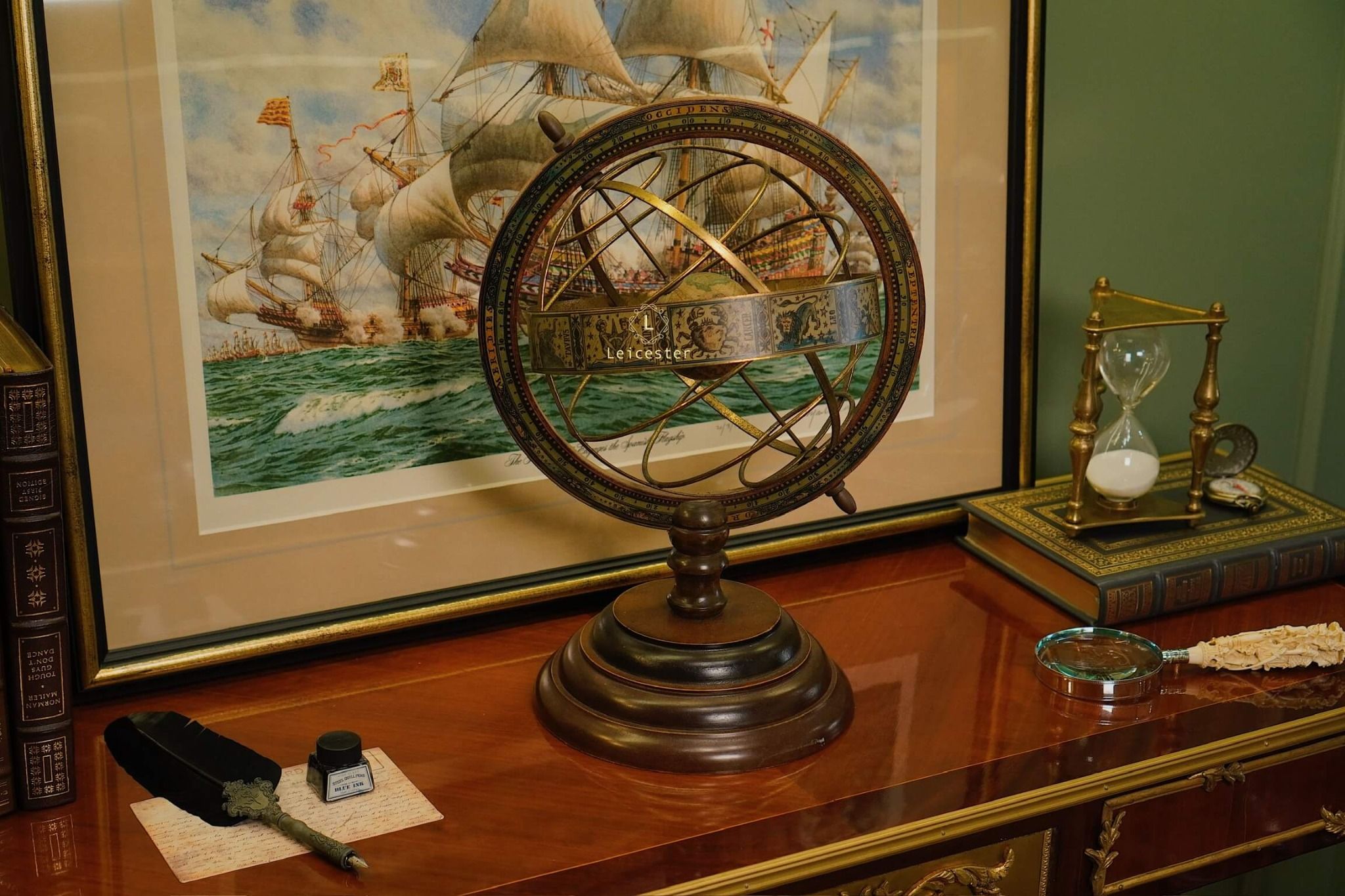 Được lấy cảm hứng từ những mô hình thiên văn học thời Phục Hưng, quả cầu Armillary Sphere mô phỏng chuyển động các thiên thể qua hệ thống vòng đồng patina cổ xếp lồng vào nhau, xoay quanh trái đất thu nhỏ ở trung tâm. Trên các vòng in thủ công 12 cung hoàng đạo ký hiệu Latin, tạo điểm nhấn vintage đậm chất Châu Âu. Armillary Sphere phù hợp mọi vị trí trưng bày, từ bàn làm việc đến kệ sách, giữ sự gọn gàng nhưng vẫn cuốn hút.