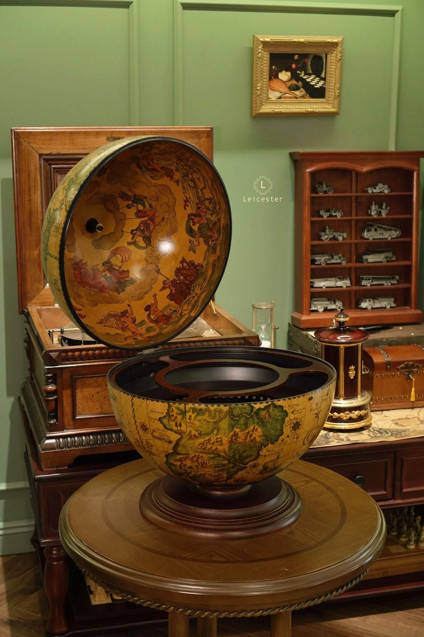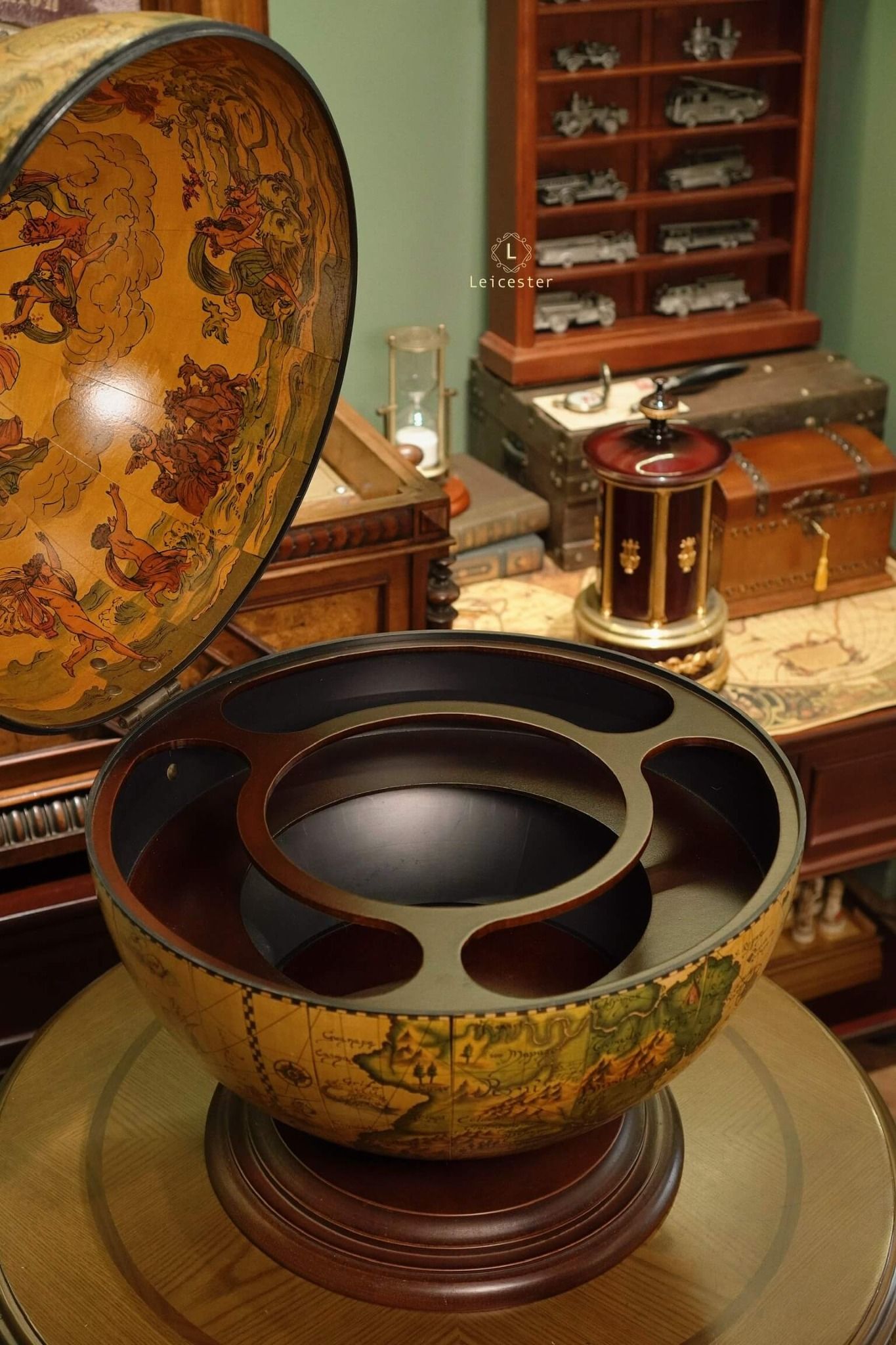 Quầy bar hình quả địa cầu, giúp có không gian đựng cho các loại rượu và ly yêu thích. Quả địa cầu được trang trí bằng bản đồ trung cổ.