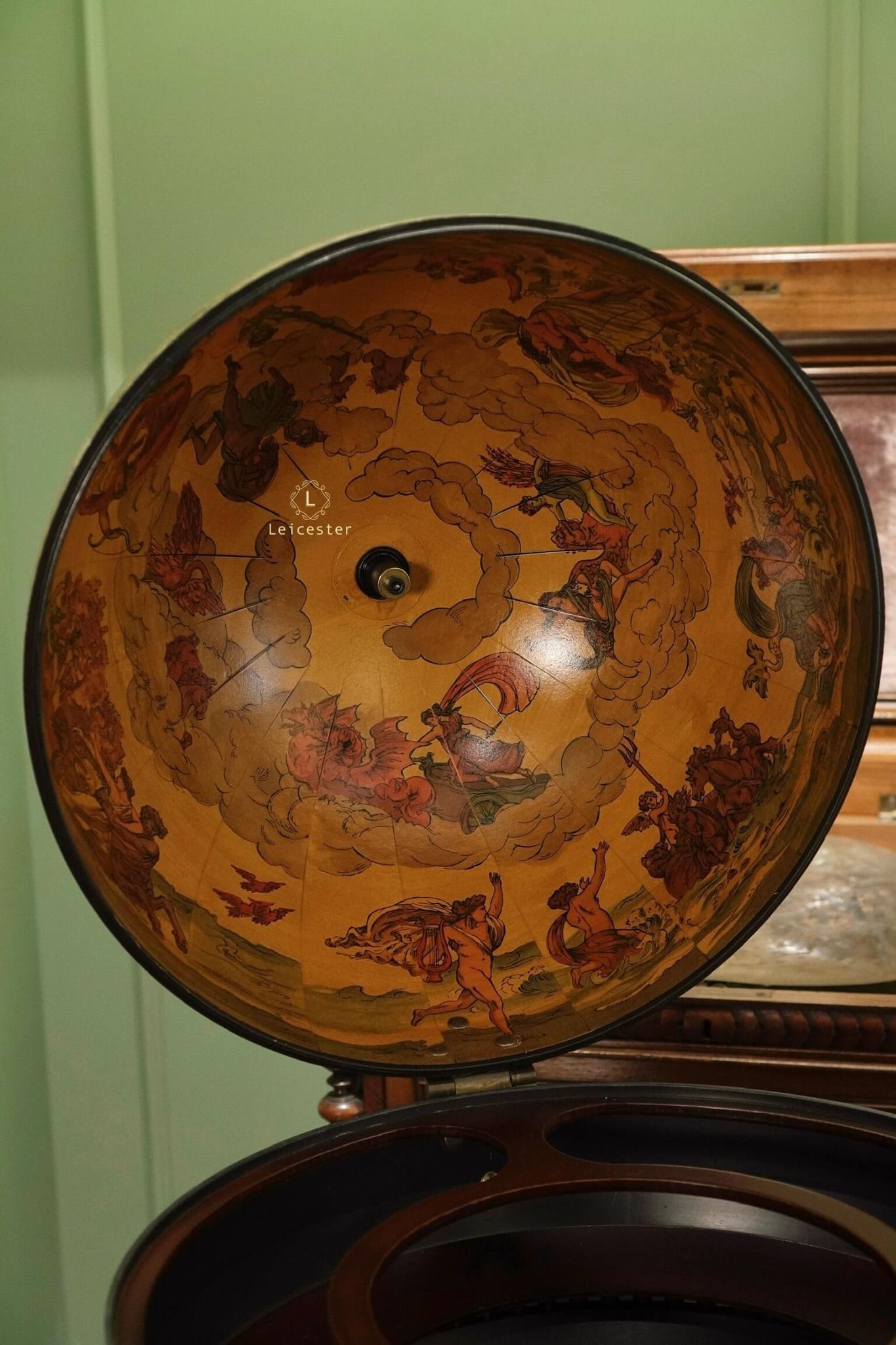 Bản đồ địa cầu độc đáo của thế giới cũ này có các dấu hiệu và tháng hoàng đạo được in chìm trên vòng ngoài của giá đỡ.