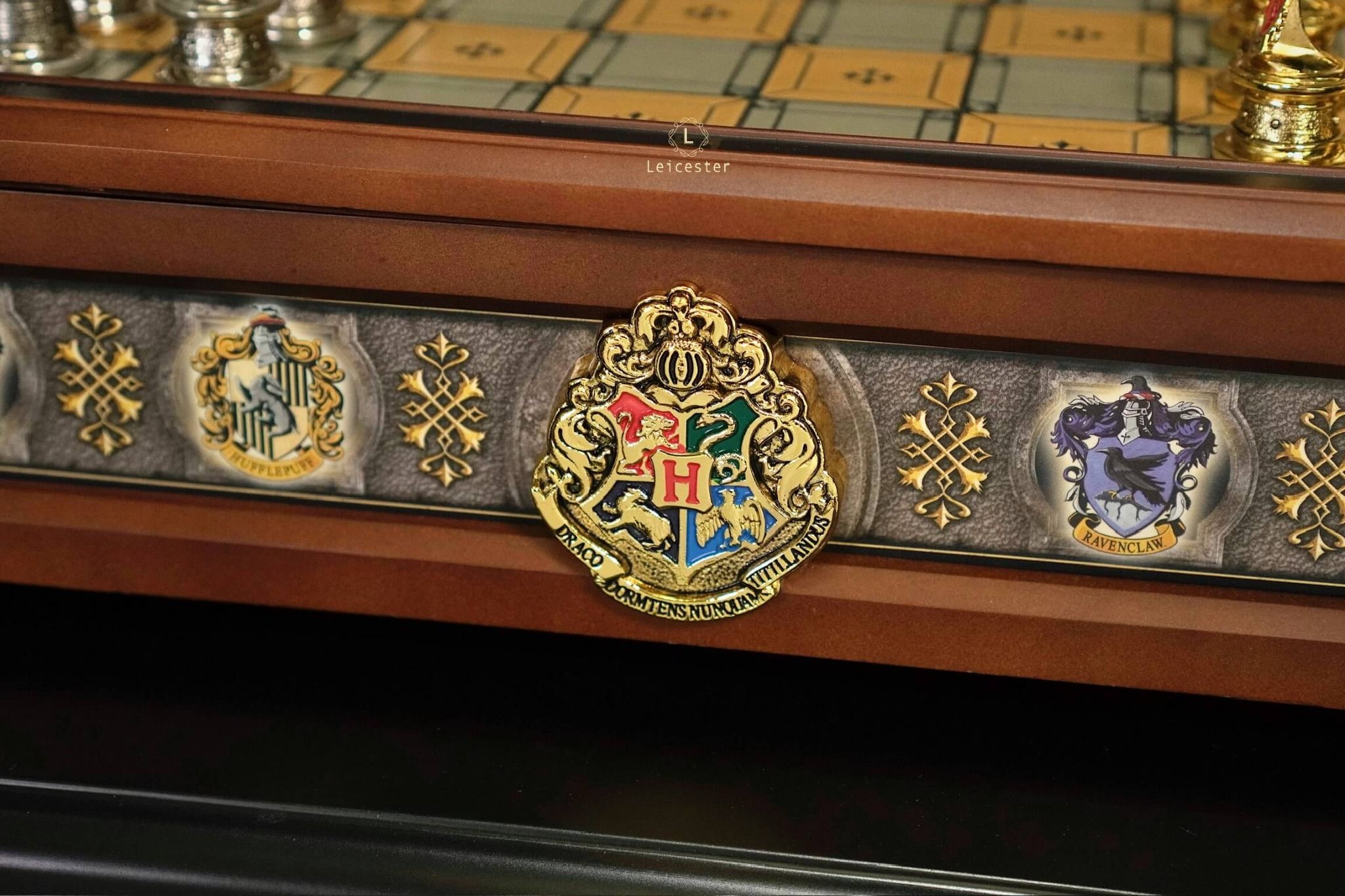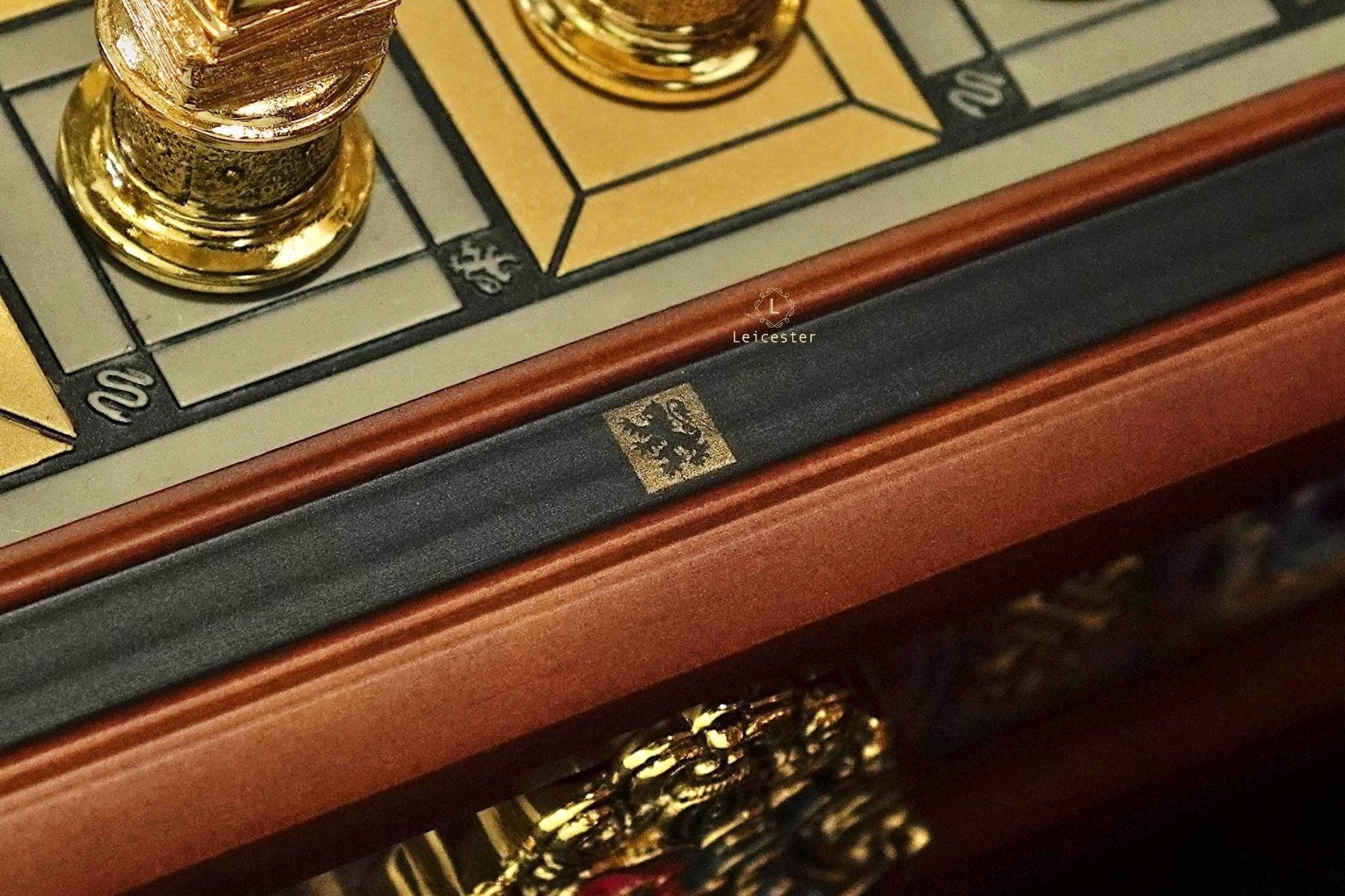Bàn cờ được làm bằng gỗ, mạ vàng 24K, bên trong có ngăn đựng cờ