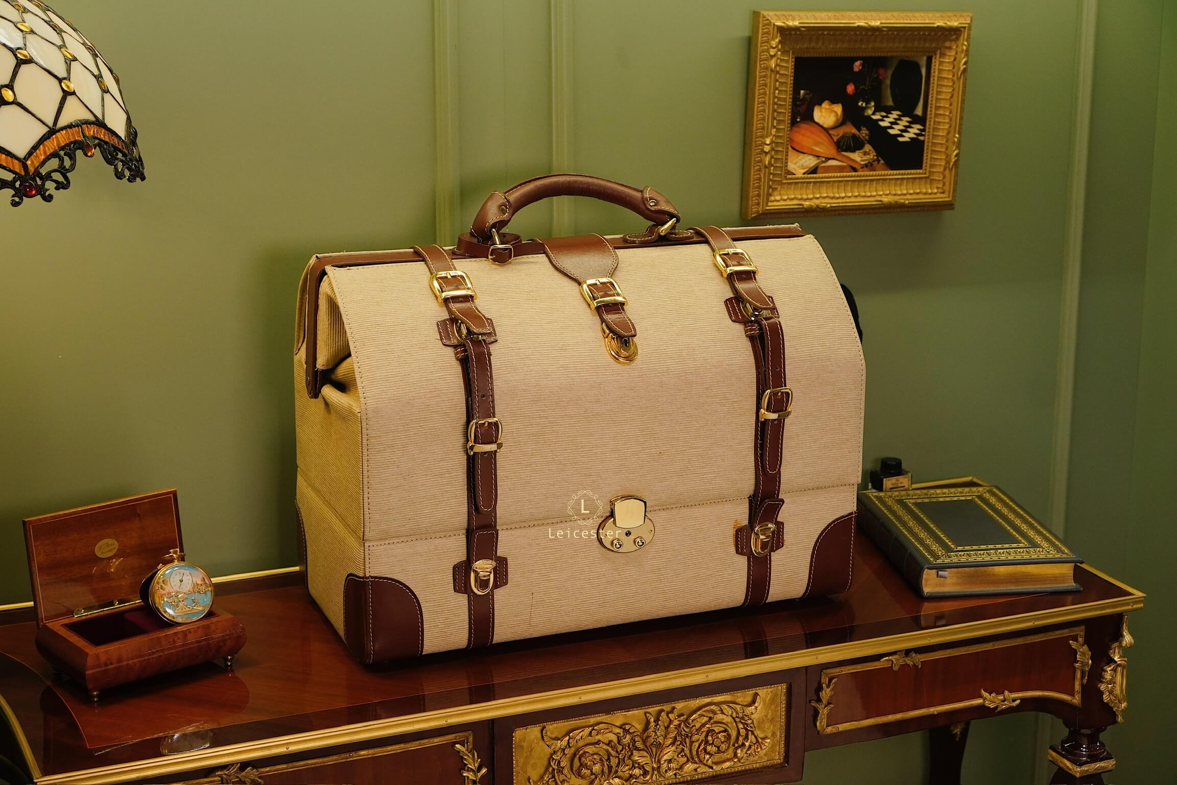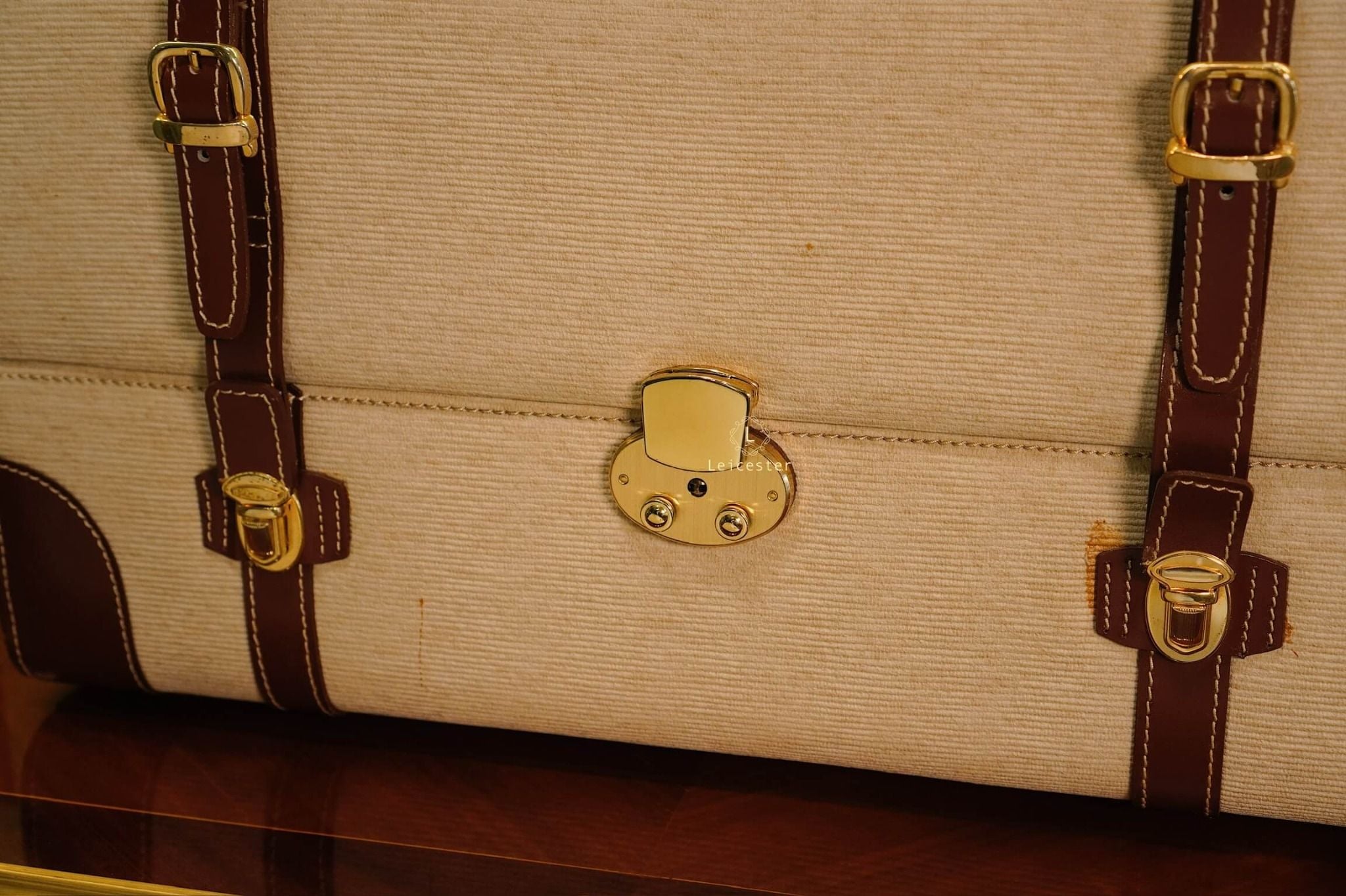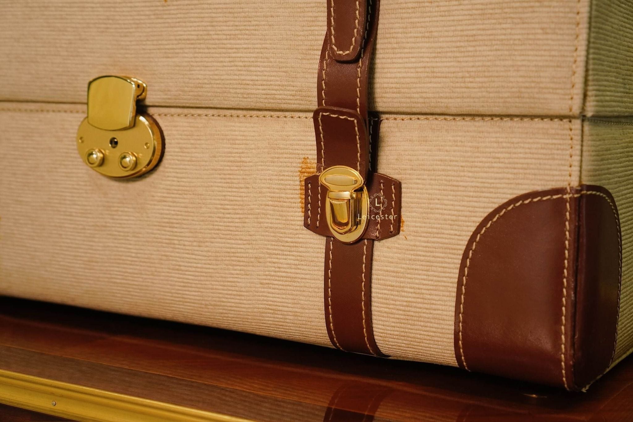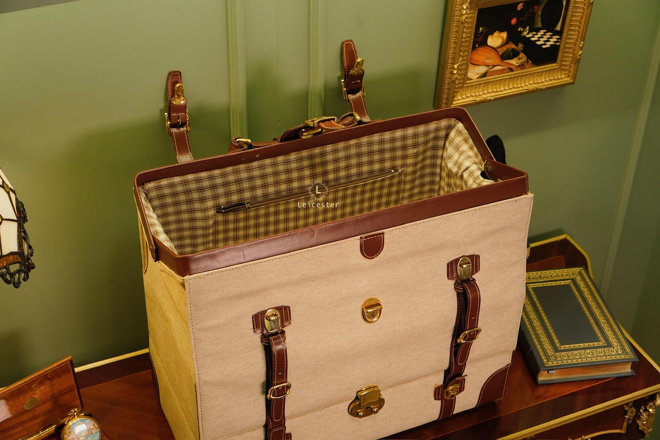 Chiếc túi có phom hộp cứng cáp, thân vải canvas màu ngà thanh lịch, đường viền da nâu sậm và các chi tiết khóa kim loại mạ vàng sáng bóng. Tất cả đều được lựa chọn kỹ lưỡng, không phô trương, nhưng toát nên một khí chất vintage sang trọng, Đây không chỉ là chiếc túi bảo vệ hành lý mà còn thể hiện đẳng cấp và phong cách sống sang trọng.