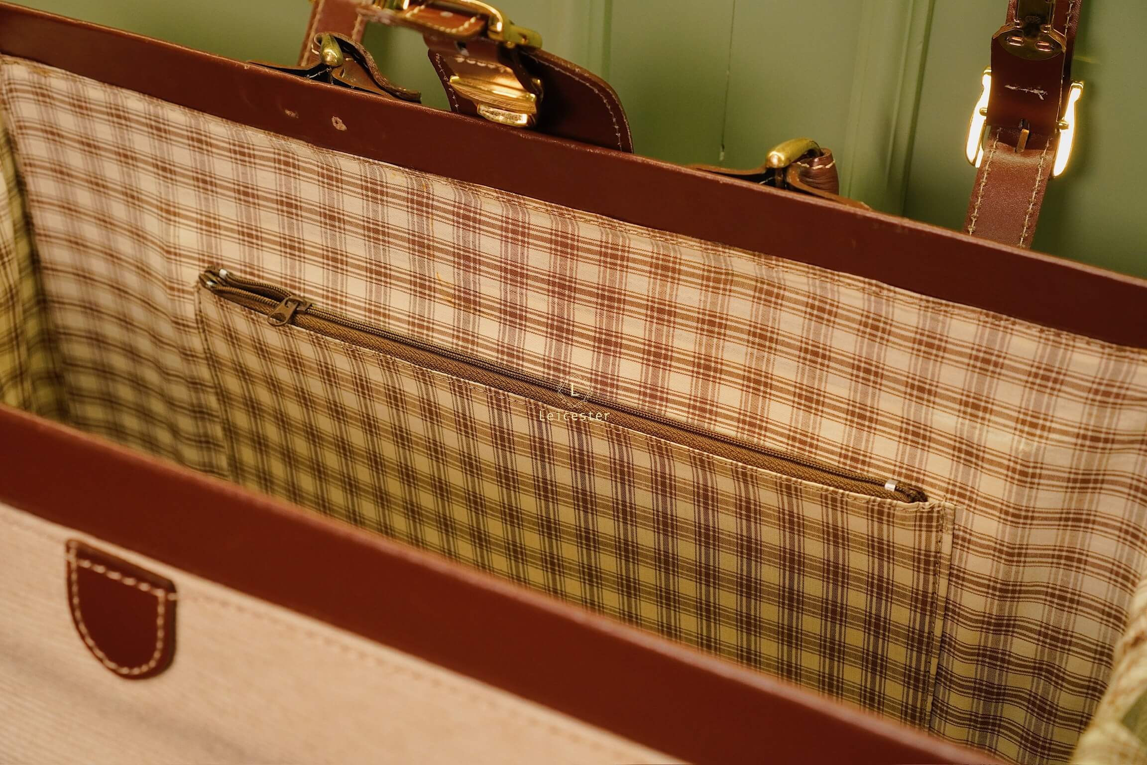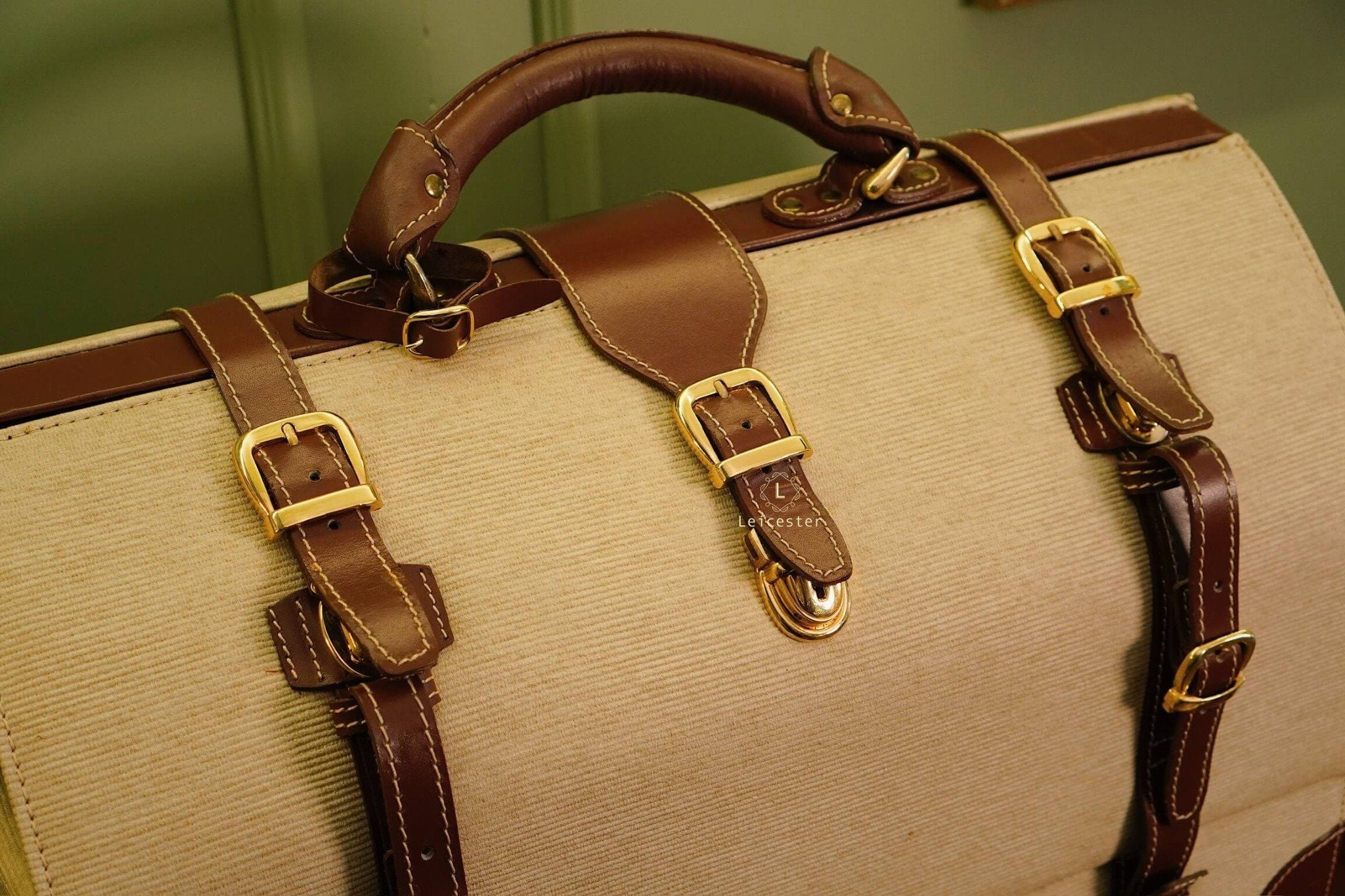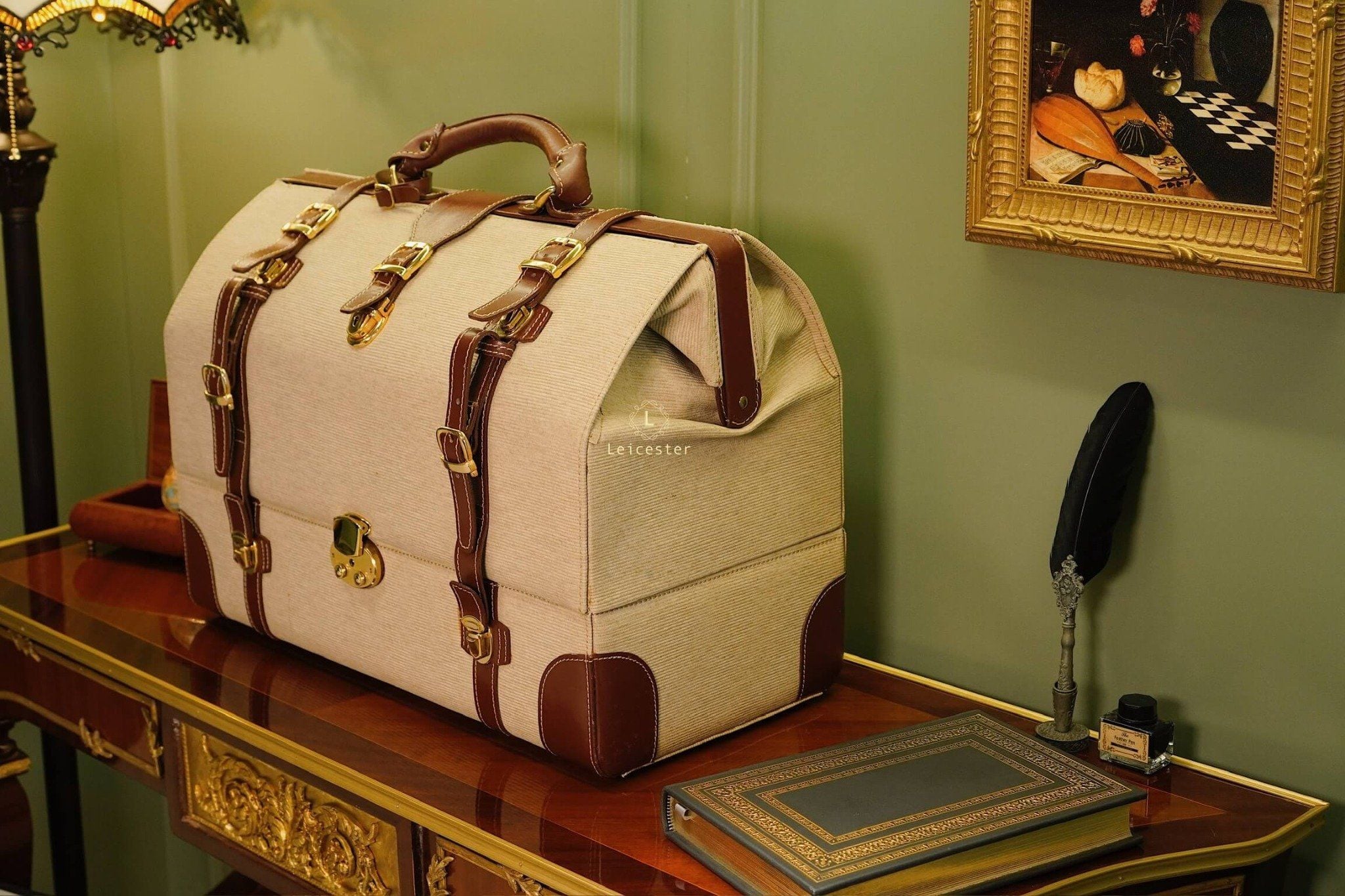 Chiếc túi có phom hộp cứng cáp, thân vải canvas màu ngà thanh lịch, đường viền da nâu sậm và các chi tiết khóa kim loại mạ vàng sáng bóng. Tất cả đều được lựa chọn kỹ lưỡng, không phô trương, nhưng toát nên một khí chất vintage sang trọng, Đây không chỉ là chiếc túi bảo vệ hành lý mà còn thể hiện đẳng cấp và phong cách sống sang trọng.