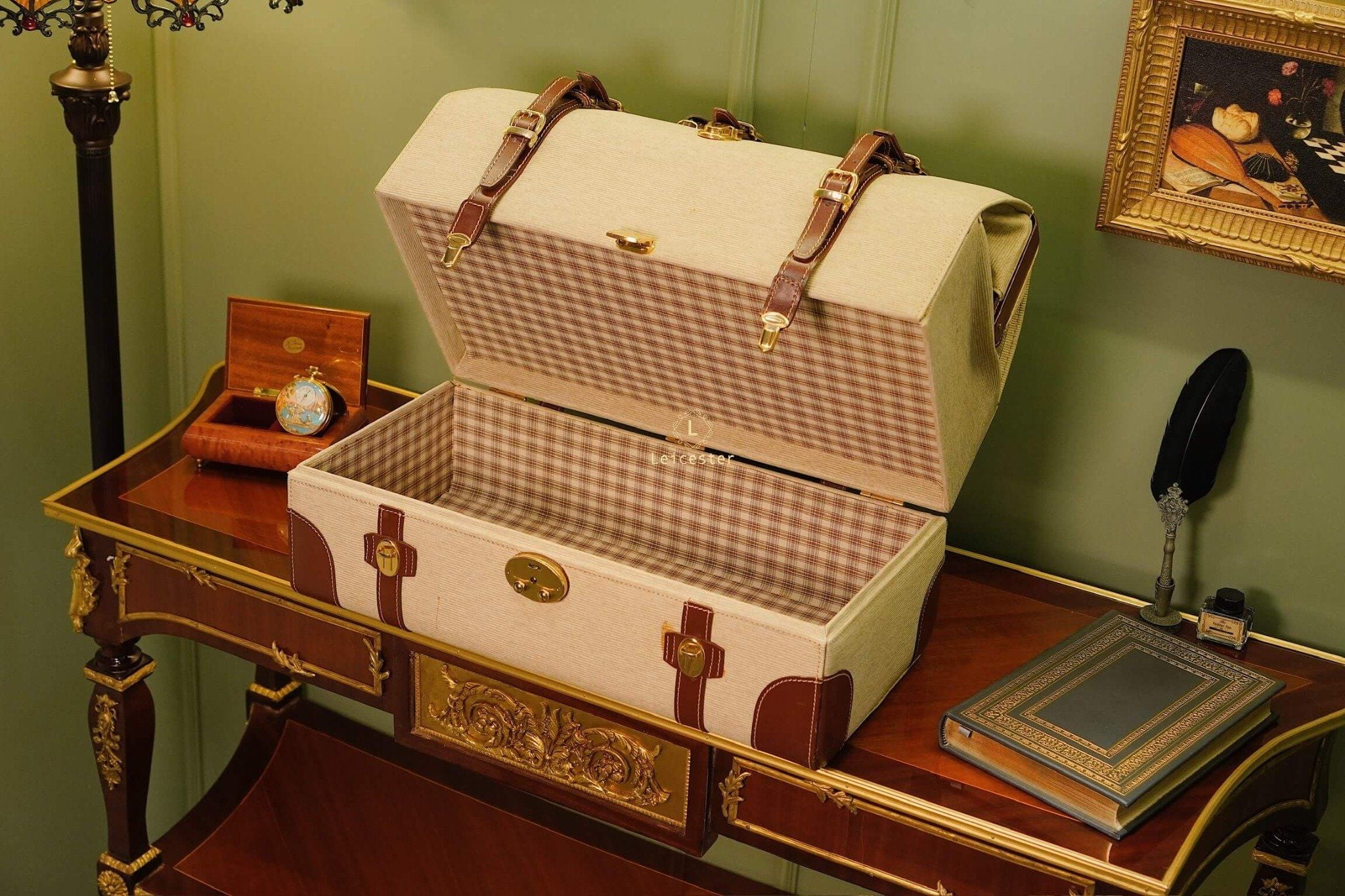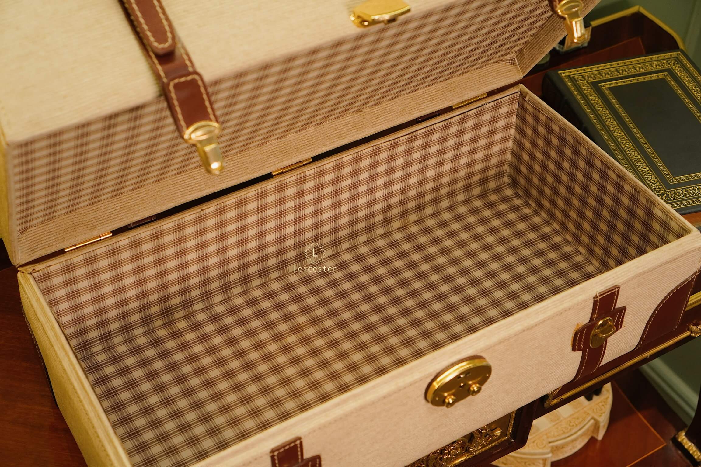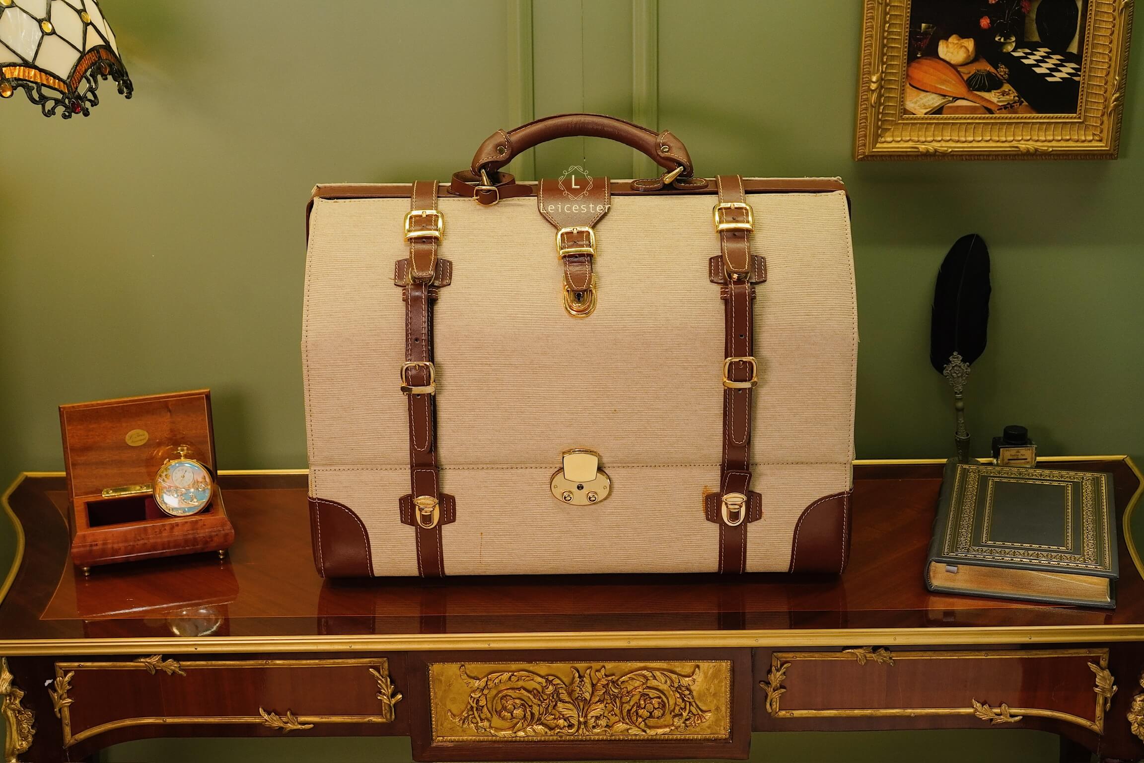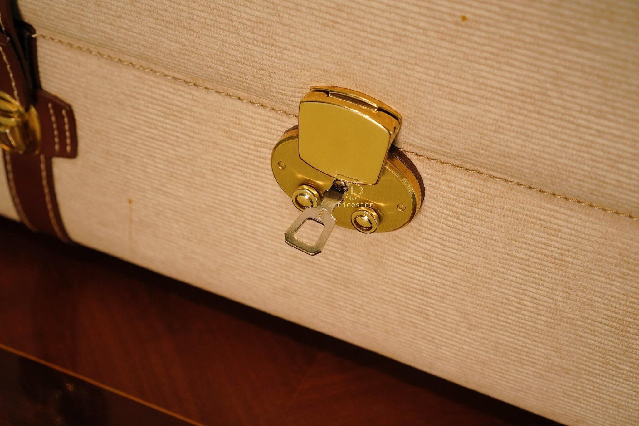 Chiếc túi có phom hộp cứng cáp, thân vải canvas màu ngà thanh lịch, đường viền da nâu sậm và các chi tiết khóa kim loại mạ vàng sáng bóng. Tất cả đều được lựa chọn kỹ lưỡng, không phô trương, nhưng toát nên một khí chất vintage sang trọng, Đây không chỉ là chiếc túi bảo vệ hành lý mà còn thể hiện đẳng cấp và phong cách sống sang trọng.