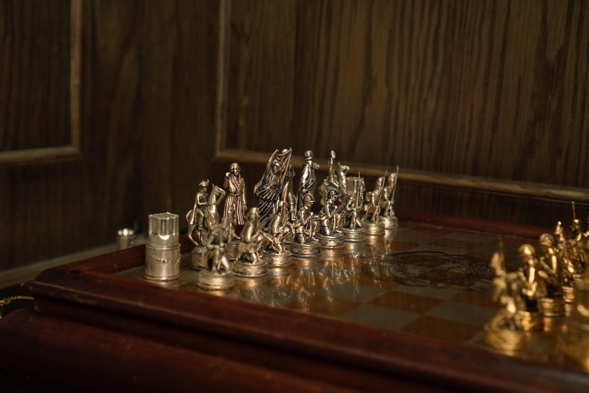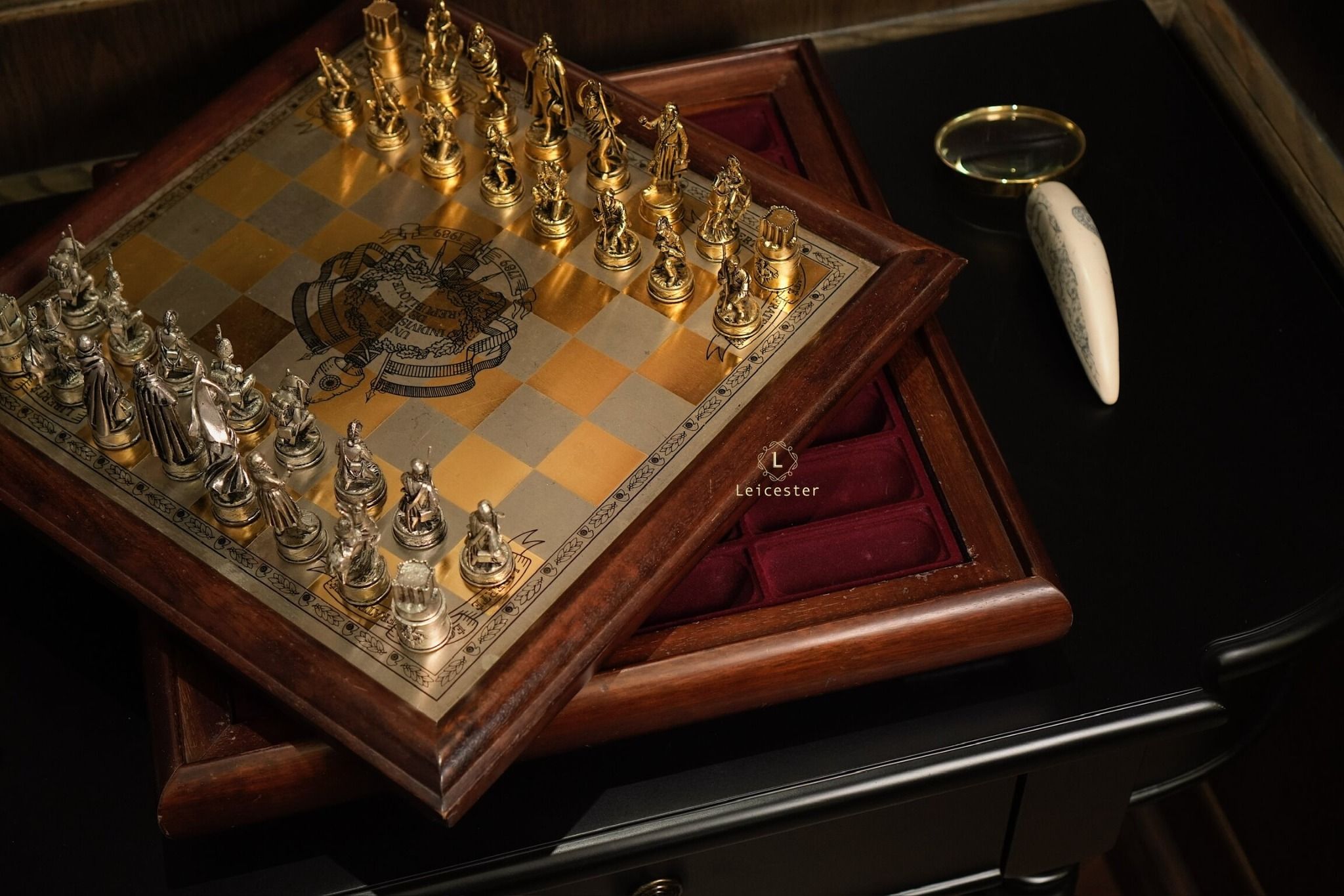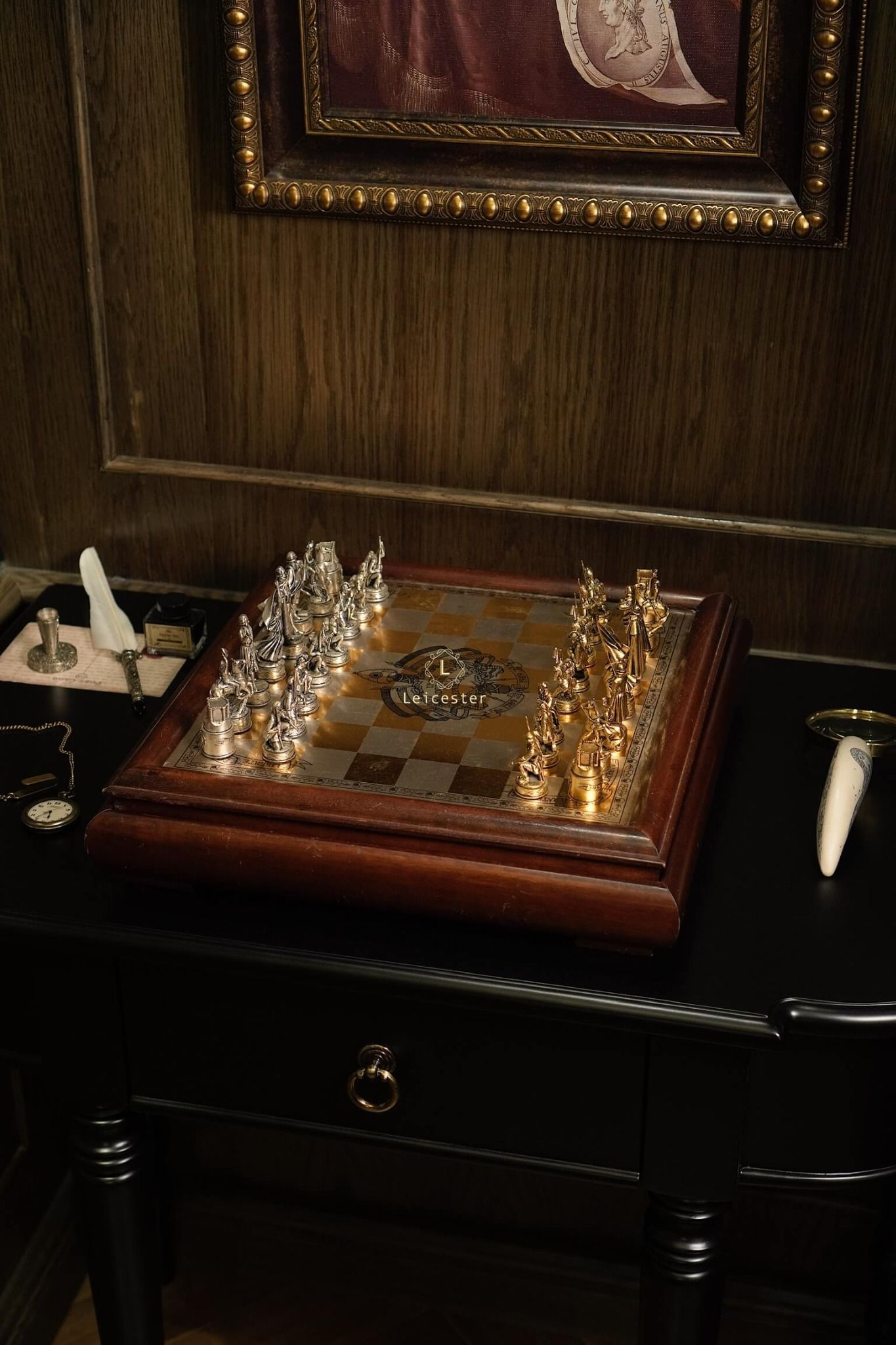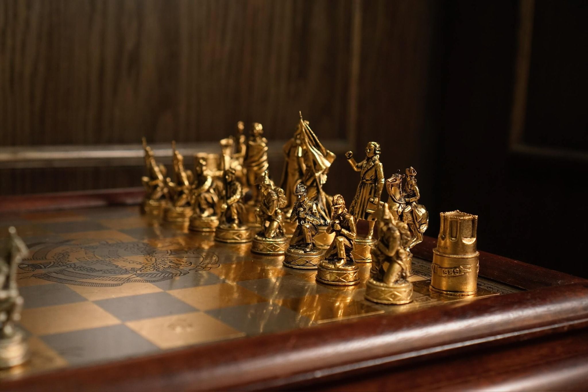 Bàn cờ: gỗ gụ, mặt bàn cờ kim loại mạ vàng và bạc