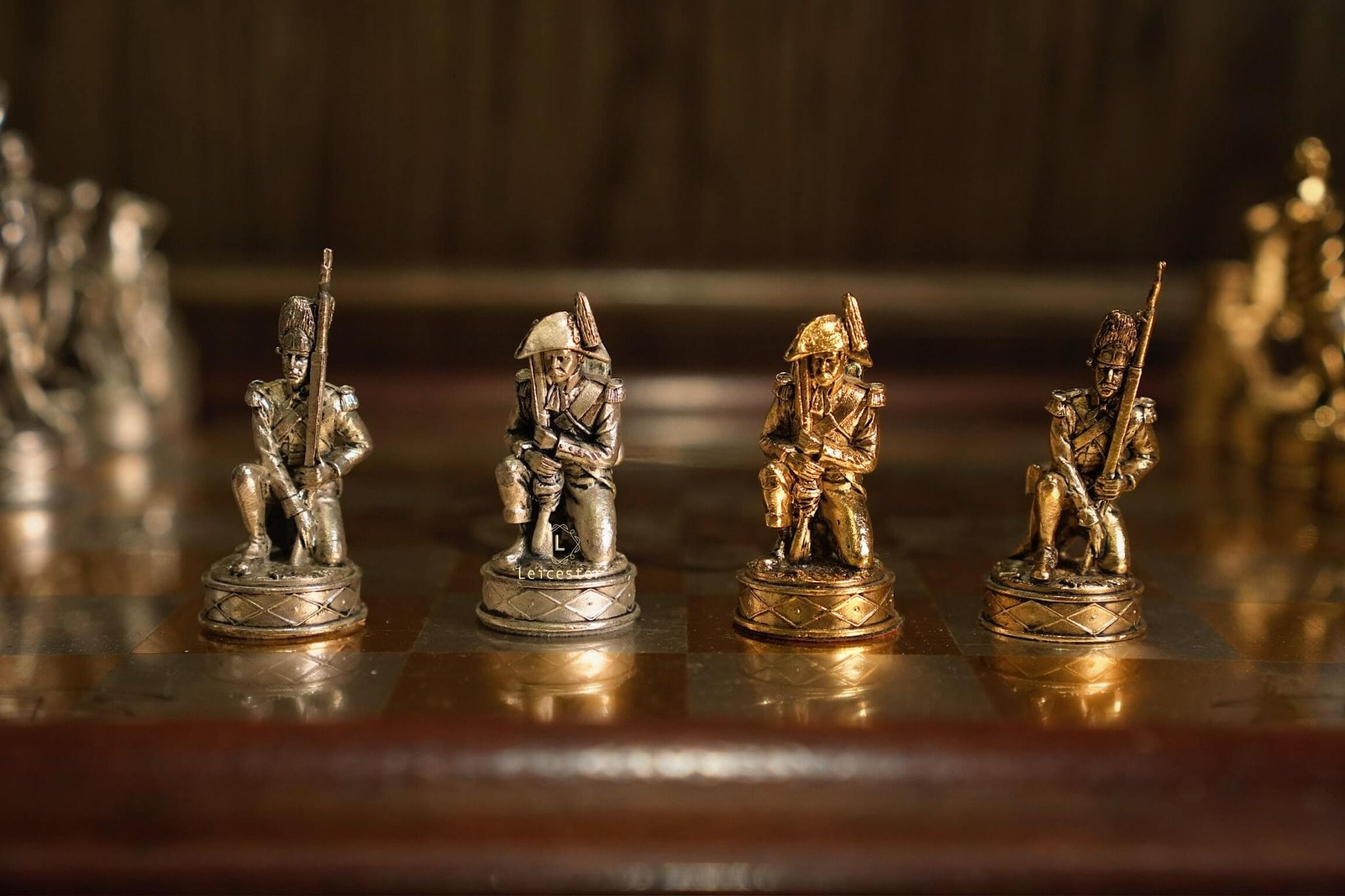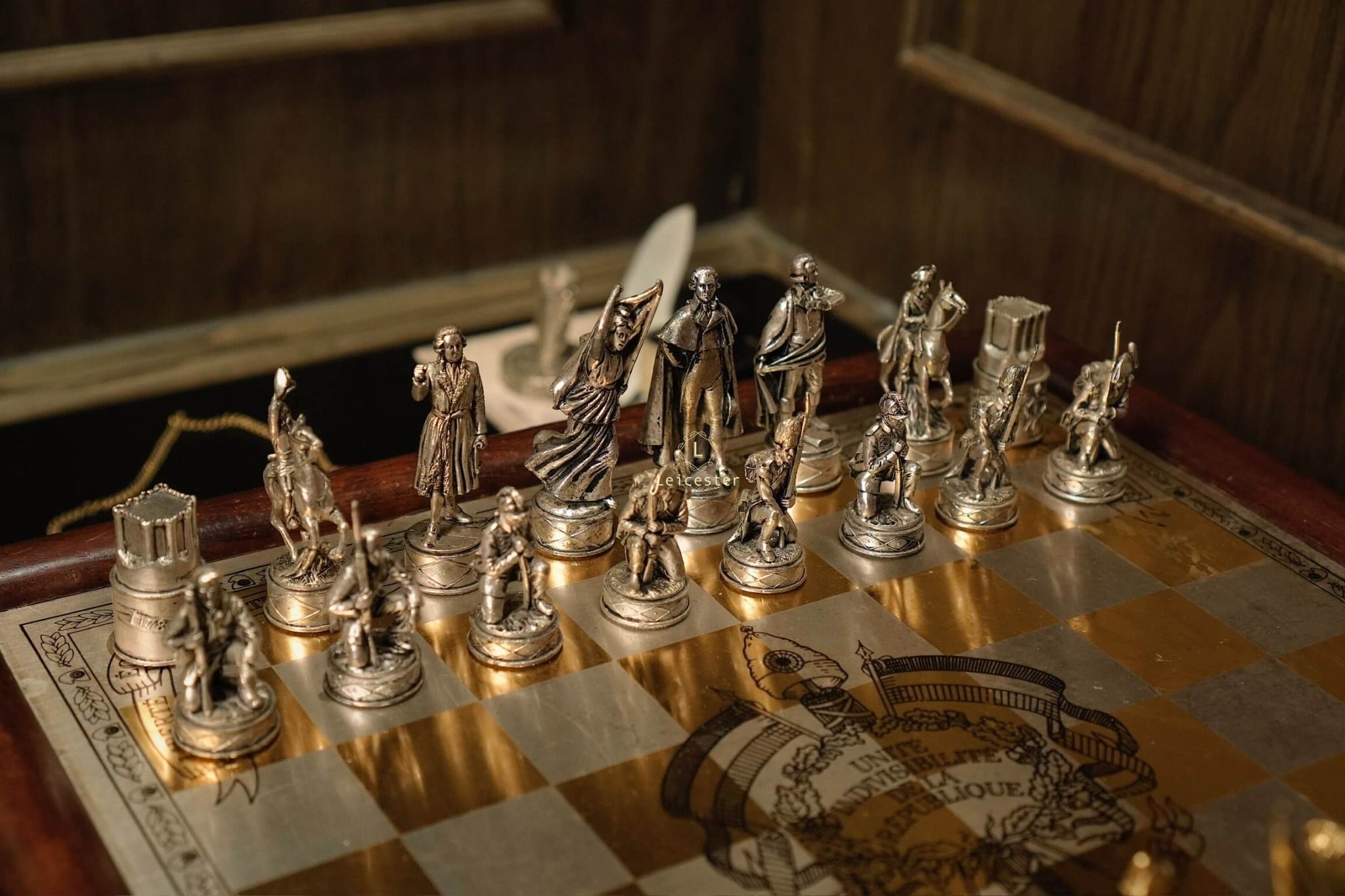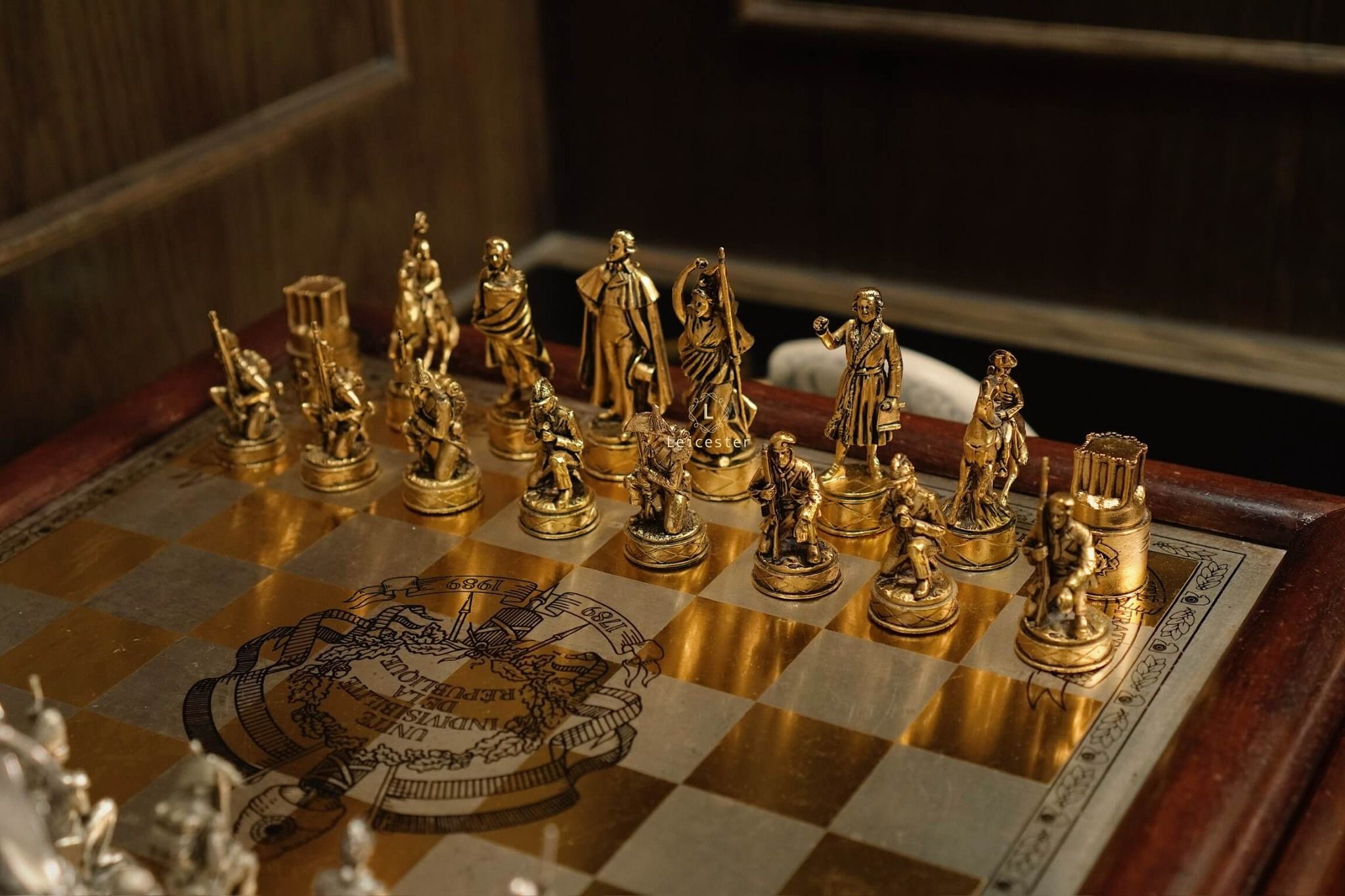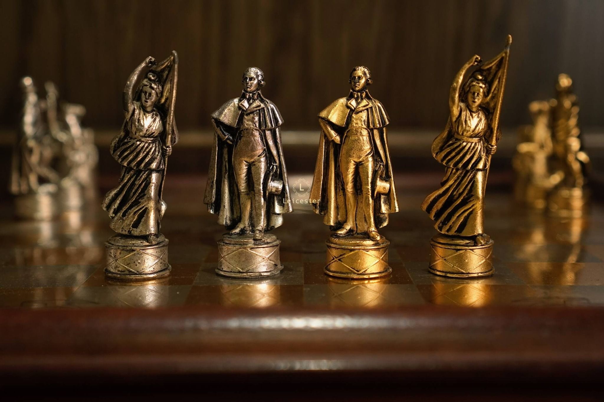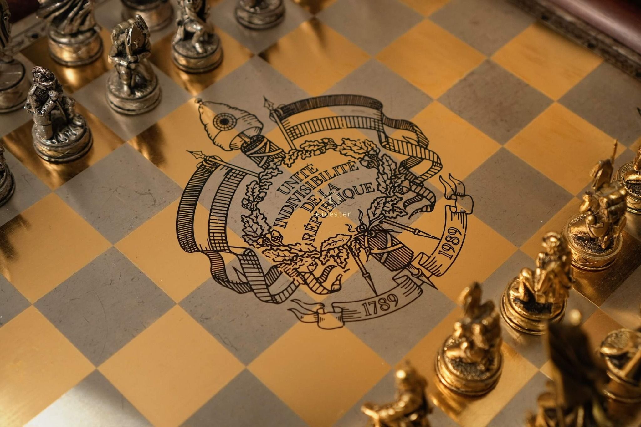 Bộ cờ vua này được phát hành chỉ bằng cách đăng ký thông qua Franklin Mint vào năm 1989 để kỷ niệm 200 năm thời kỳ Cách mạng Pháp. 32 quân cờ pewter tinh xảo được mạ vàng 22K và bạc 995, là những tác phẩm điêu khắc chân dung đích thực. Bàn cờ bằng gỗ gụ đánh bóng chắc chắn, mặt bàn cờ được khảm một tấm kim loại với các ô vuông mạ vàng và bạc, ở bốn góc có khẩu hiệu cách mạng Pháp “Liberte ‘Egalite’and Fraternite”, ở giữa bàn cờ. có biểu tượng cuộc cách mạng Pháp và đọc Unite ‘Indivisiblite’ De la republique “.