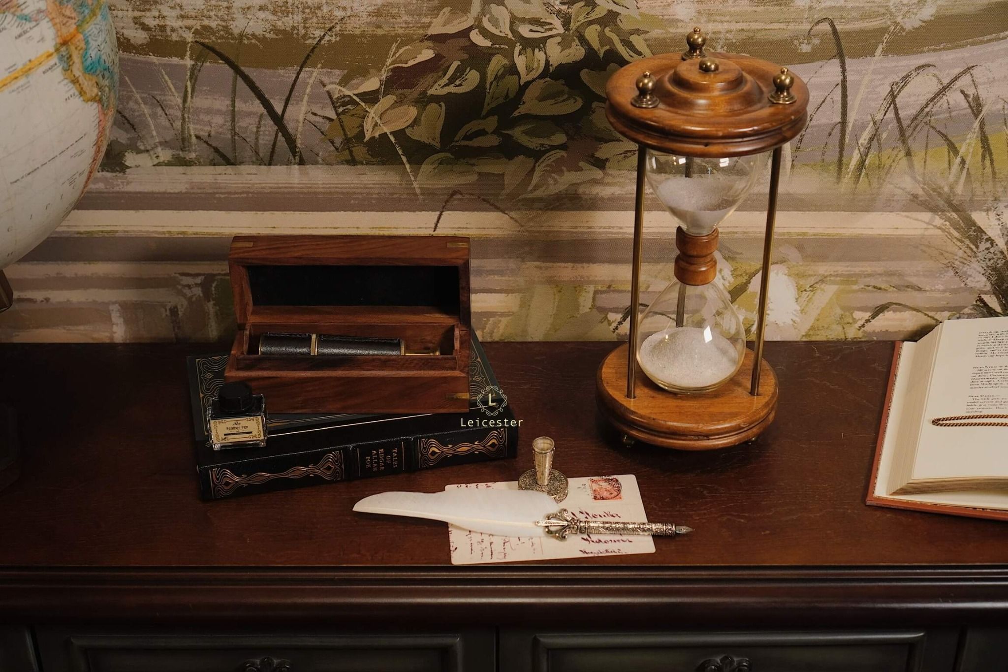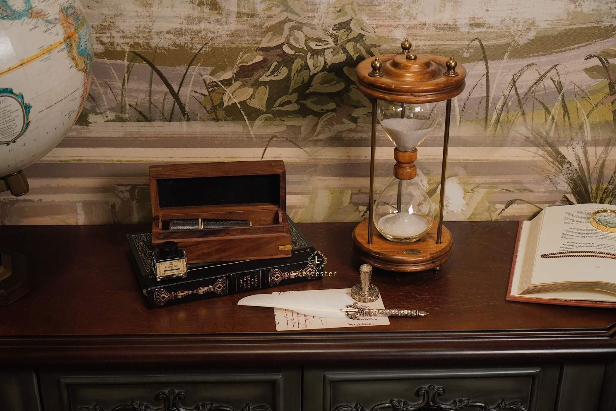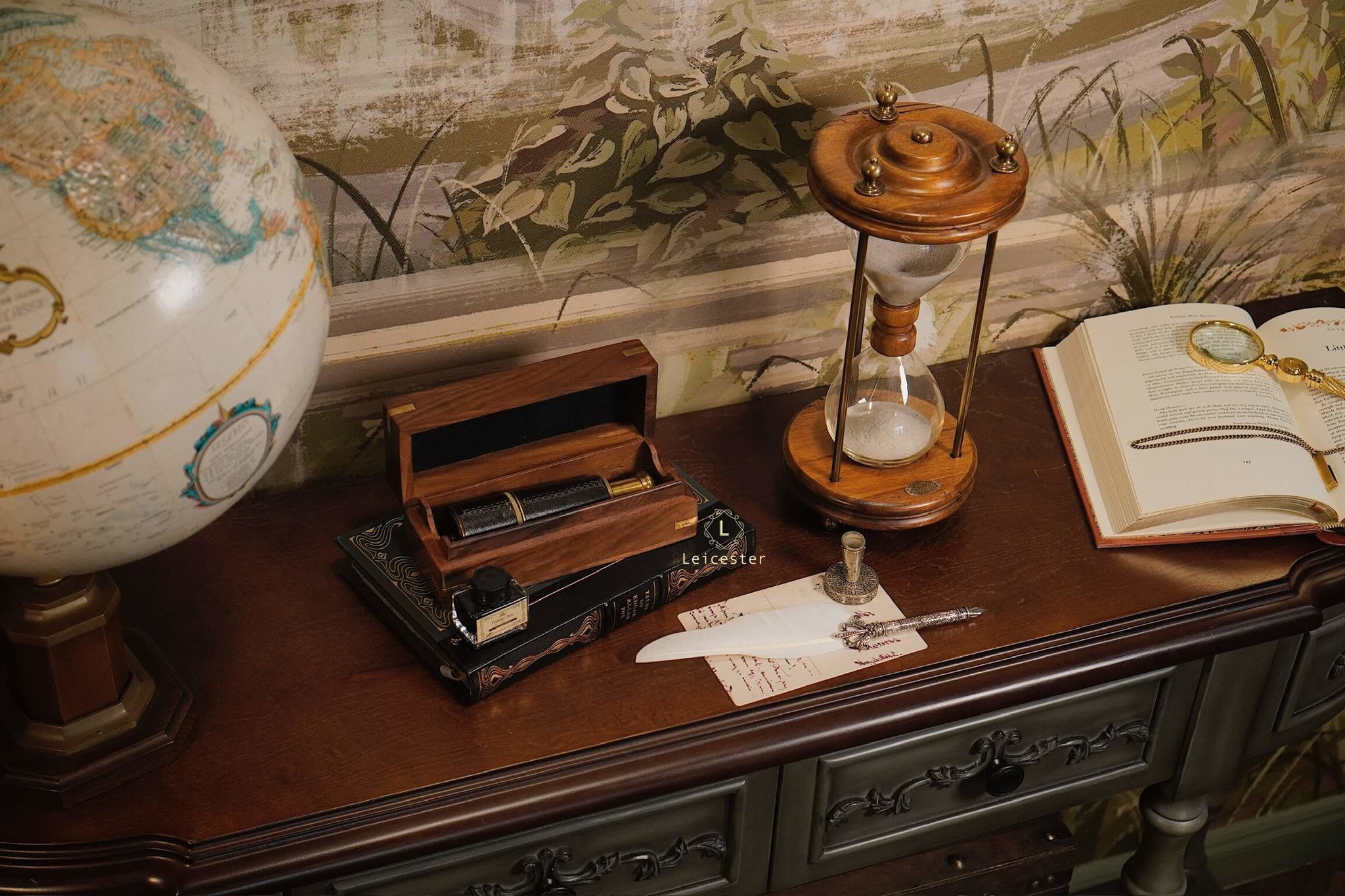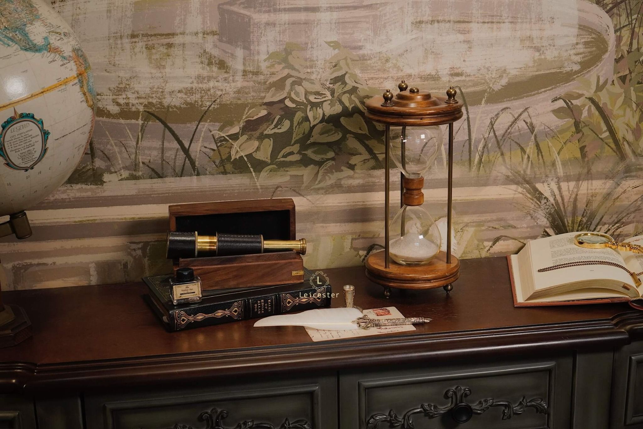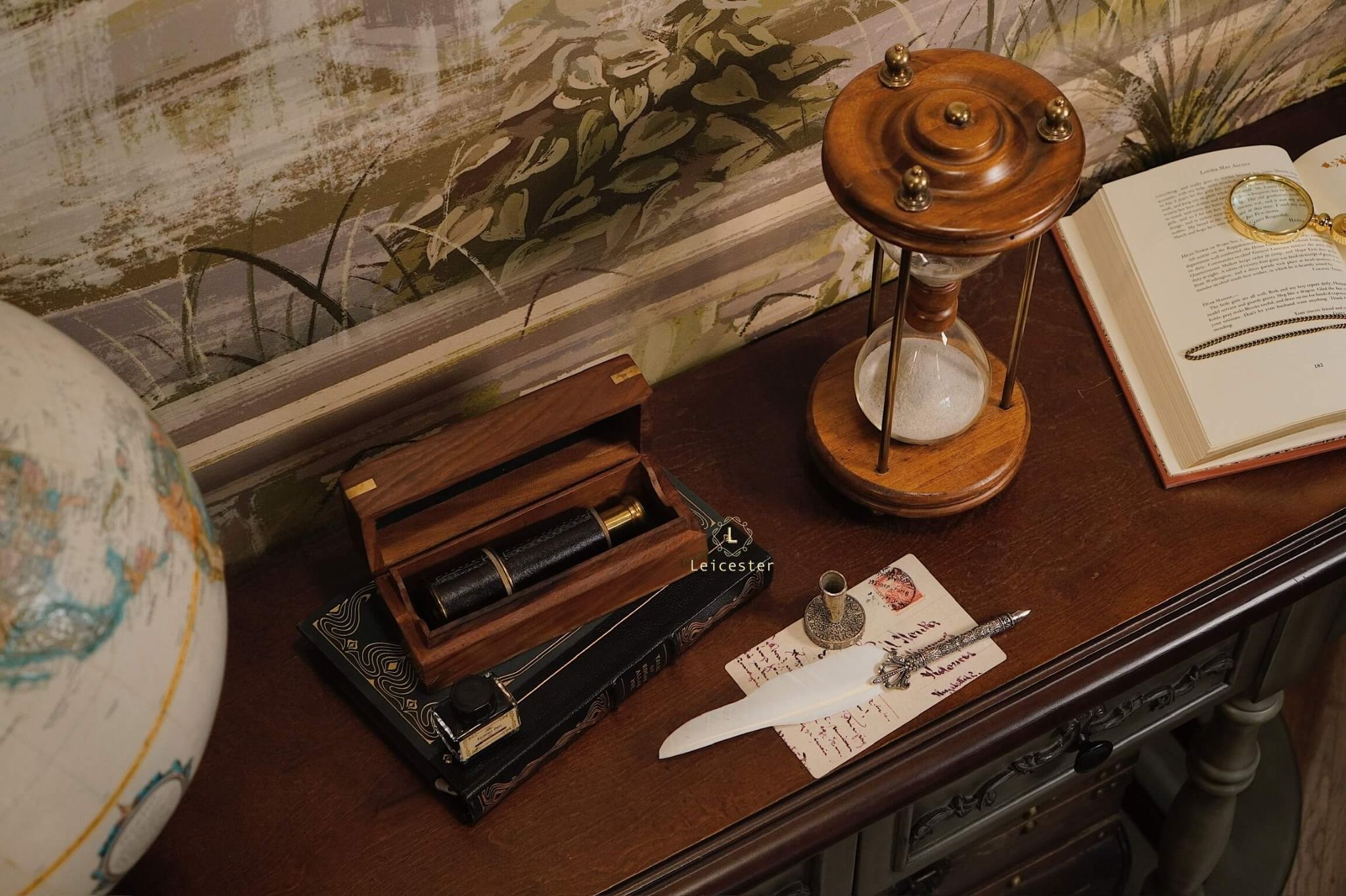 Chất liệu: Gỗ, kính, đồng, cát mịn