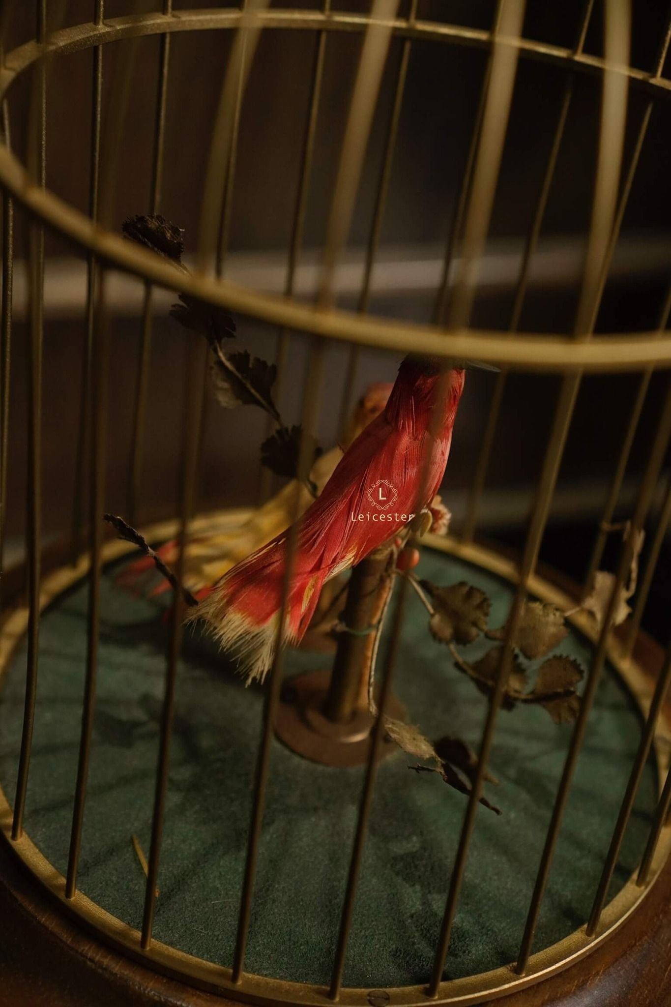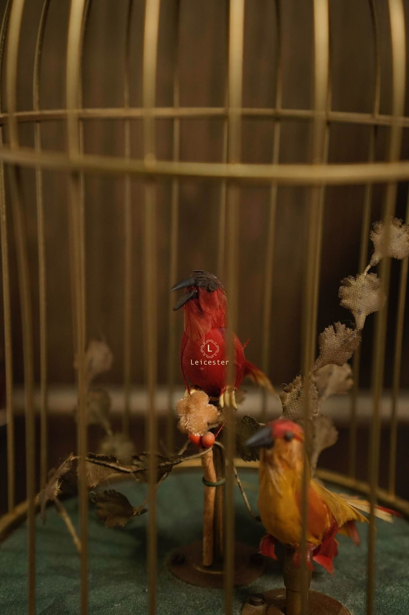 Chất liệu: Lông chim thật, thép mạ vàng, đế gỗ khảm hoa văn, được hoàn thiện thủ công.