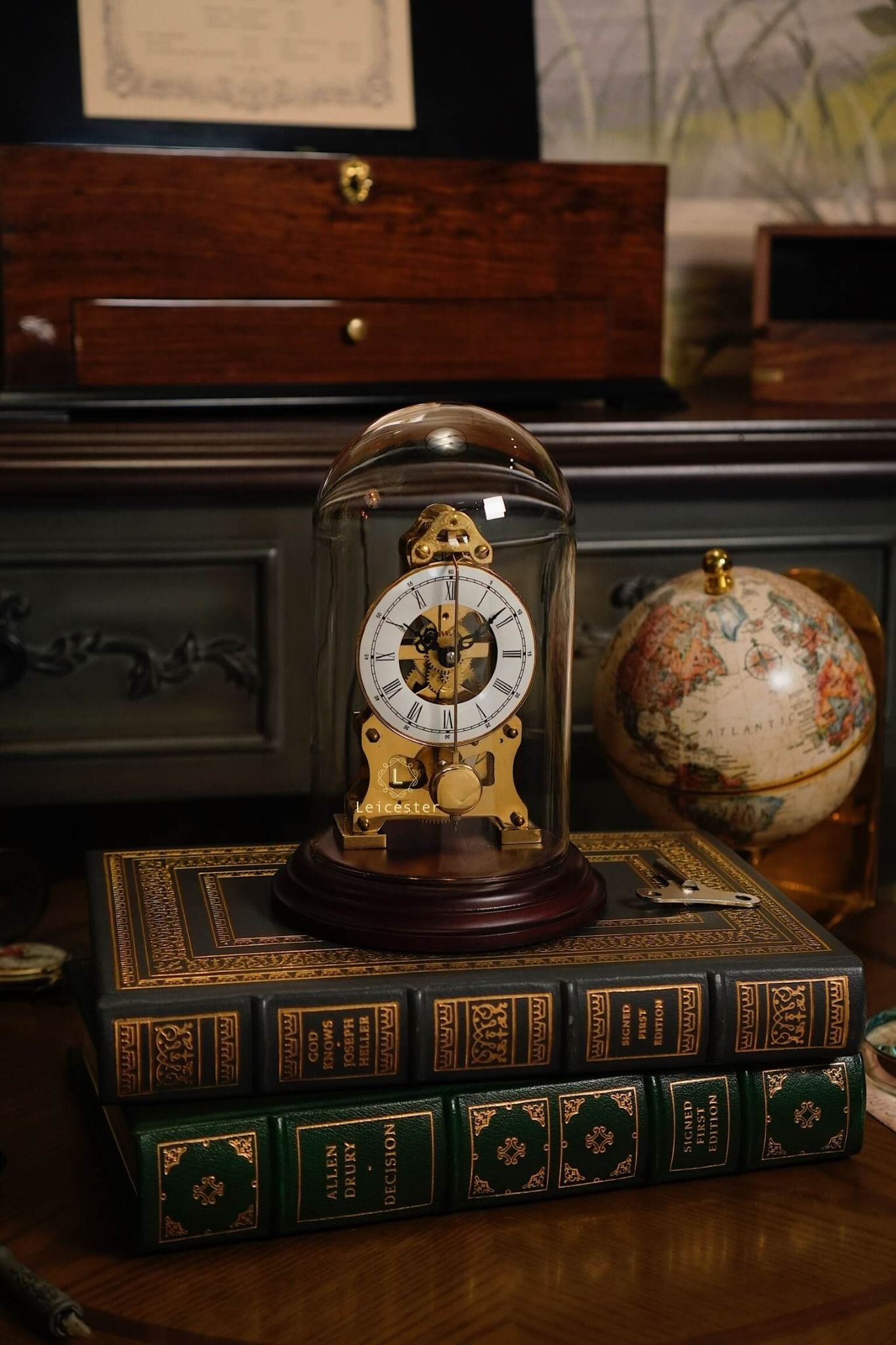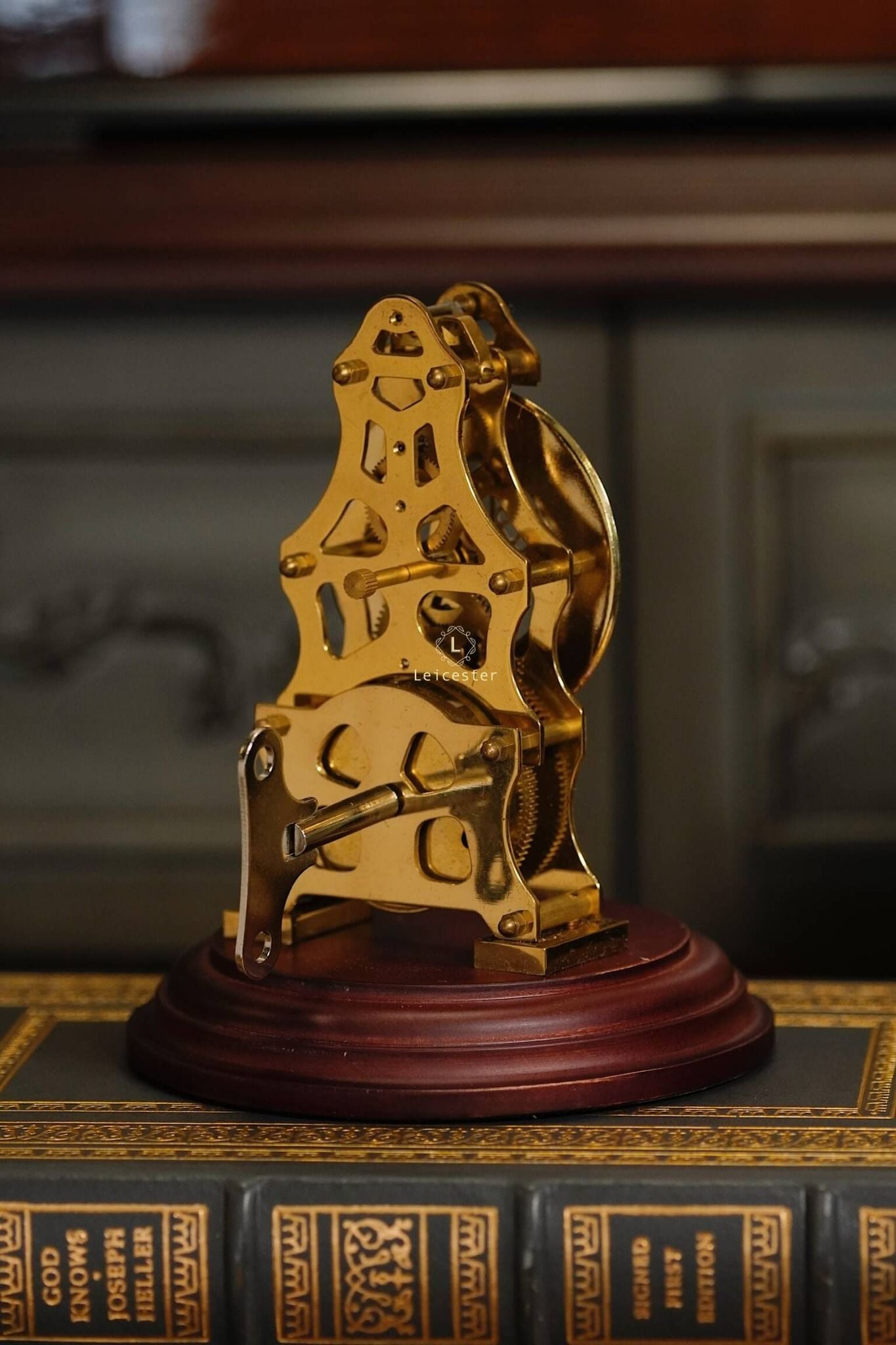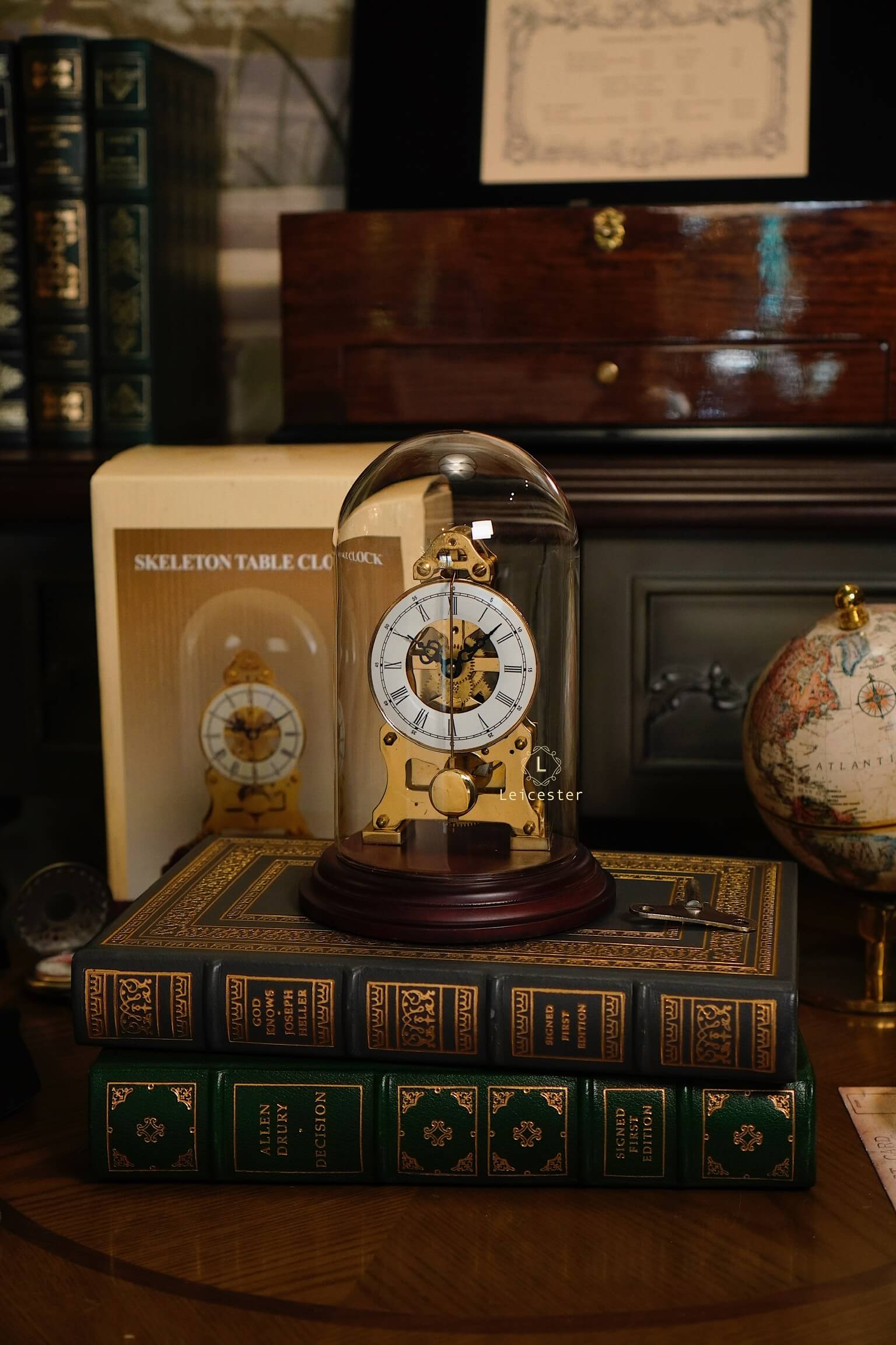 Chiếc Skeleton Table Clock này gây ấn tượng bởi khung kim loại mạ vàng sáng bóng, nổi bật giữa lớp kính dome trong suốt. Mặt số La Mã cổ điển kết hợp với kim đen thanh mảnh, tạo nên sự tương phản đầy cuốn hút. Bộ máy cơ học lên dây bằng chìa khóa có thể ngưỡng từng vòng bánh xe hoạt động, mang lại cảm giác sống động và tràn đầy năng lượng. Tất cả được đặt trên đế gỗ tròn vững chãi, vừa sang trọng vừa tinh tế, phù hợp để làm điểm nhấn trong phòng khách, bàn làm việc hoặc tủ trưng bày.