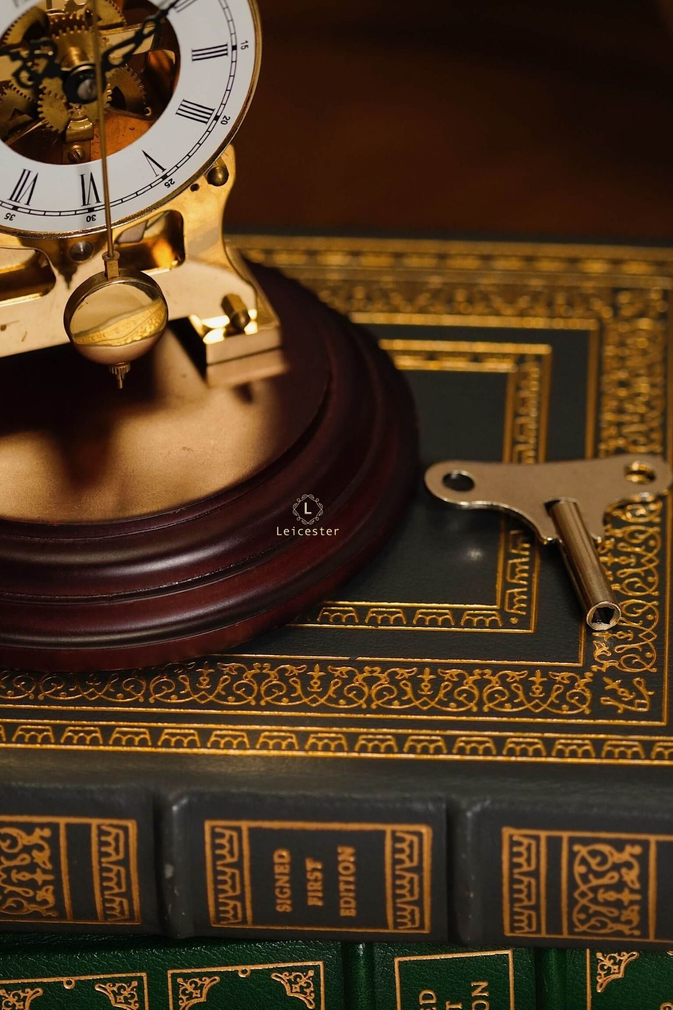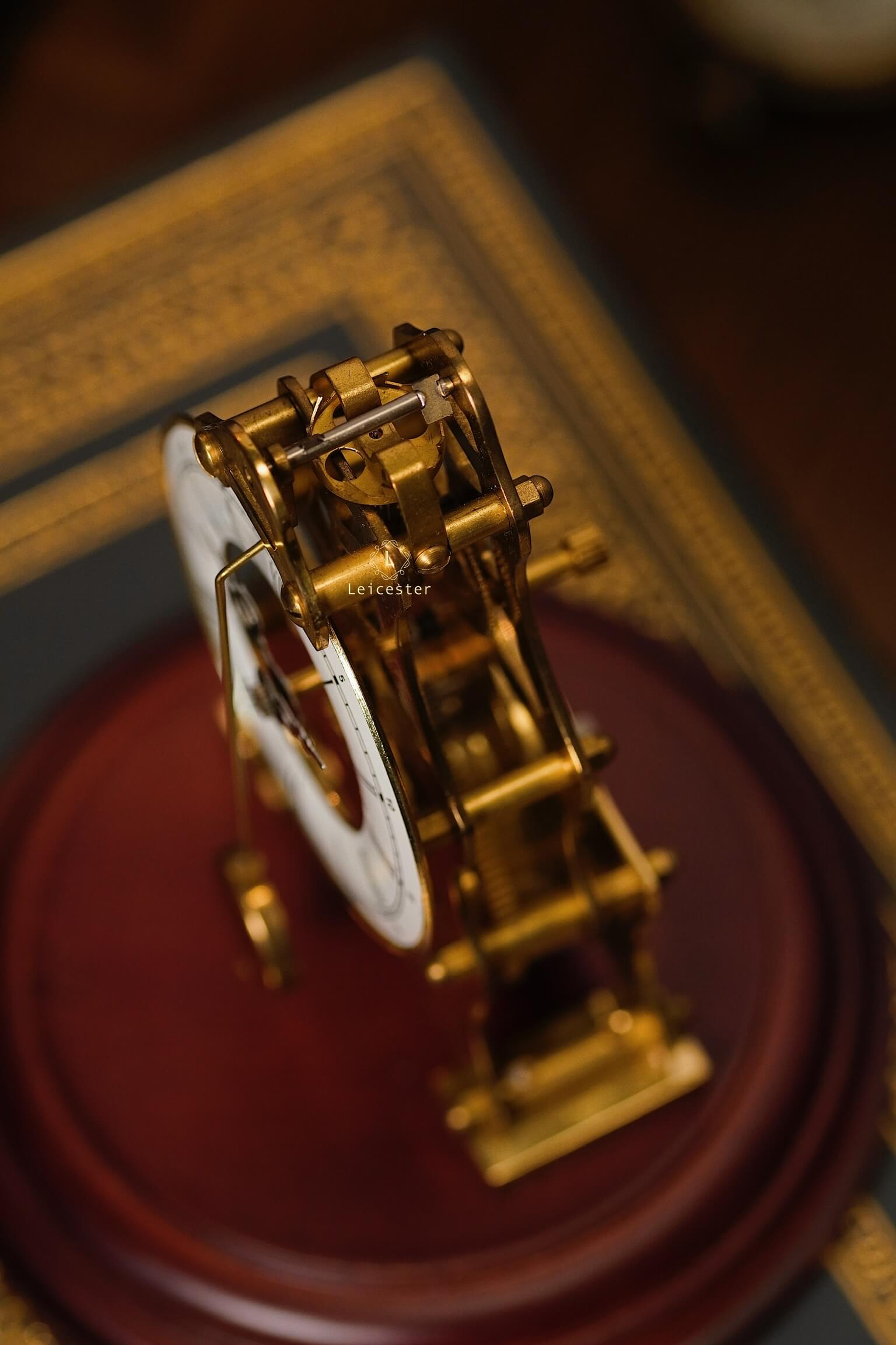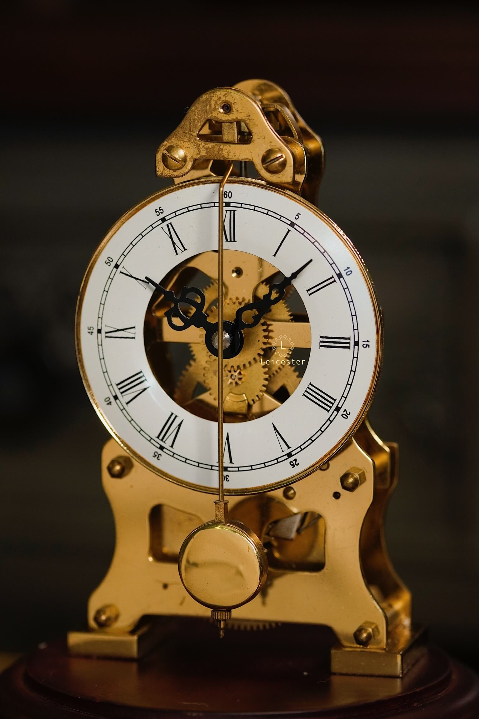 Chiếc Skeleton Table Clock này gây ấn tượng bởi khung kim loại mạ vàng sáng bóng, nổi bật giữa lớp kính dome trong suốt. Mặt số La Mã cổ điển kết hợp với kim đen thanh mảnh, tạo nên sự tương phản đầy cuốn hút. Bộ máy cơ học lên dây bằng chìa khóa có thể ngưỡng từng vòng bánh xe hoạt động, mang lại cảm giác sống động và tràn đầy năng lượng. Tất cả được đặt trên đế gỗ tròn vững chãi, vừa sang trọng vừa tinh tế, phù hợp để làm điểm nhấn trong phòng khách, bàn làm việc hoặc tủ trưng bày.