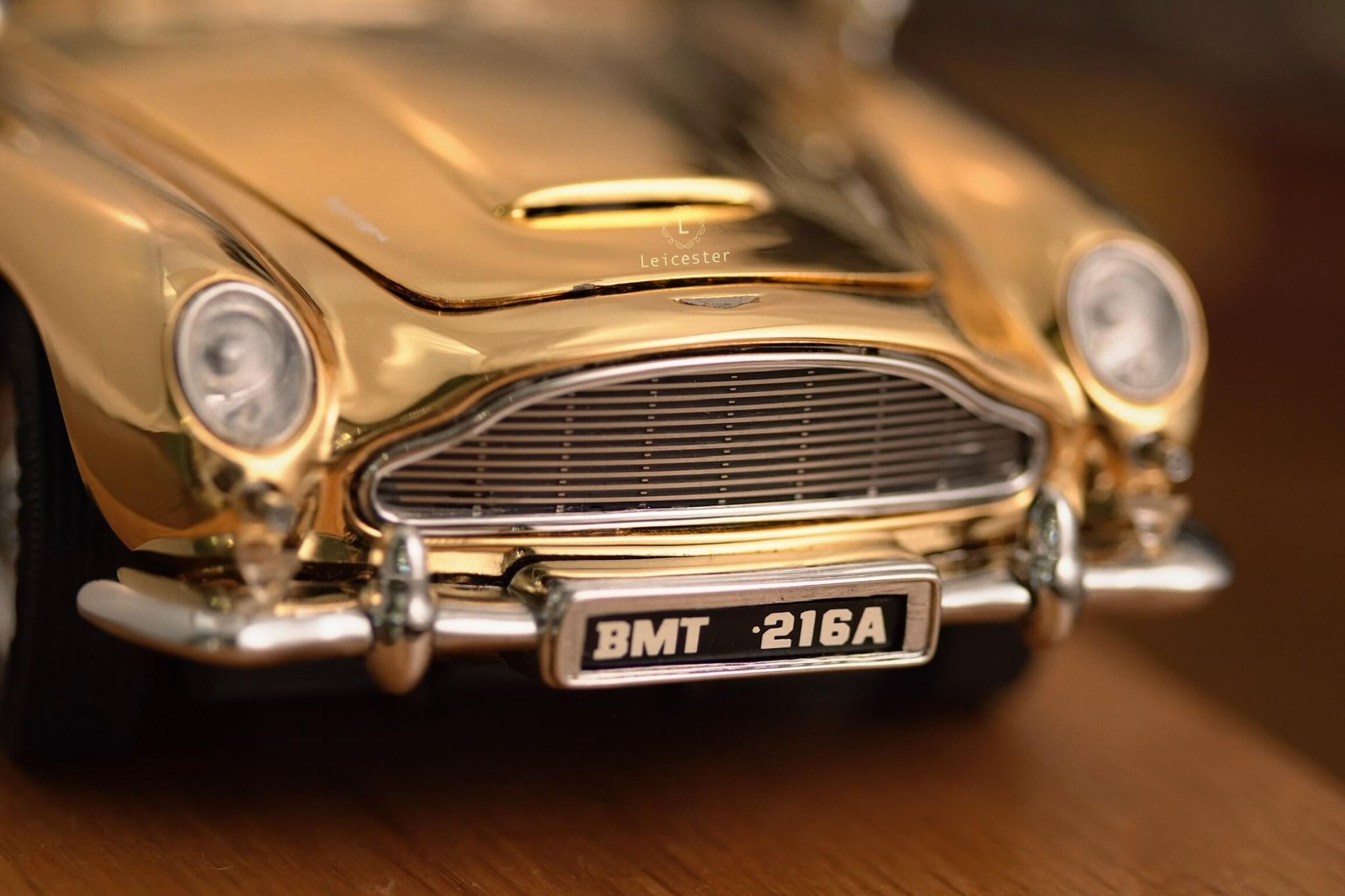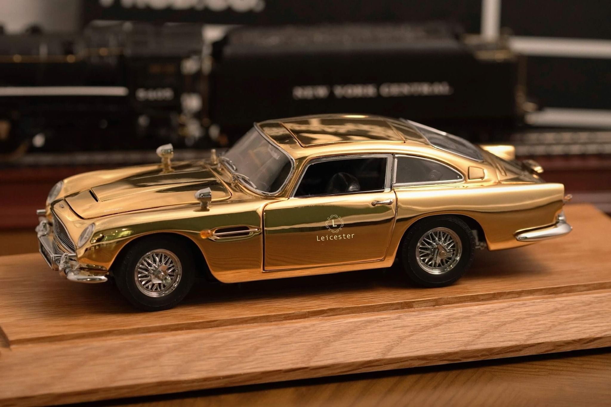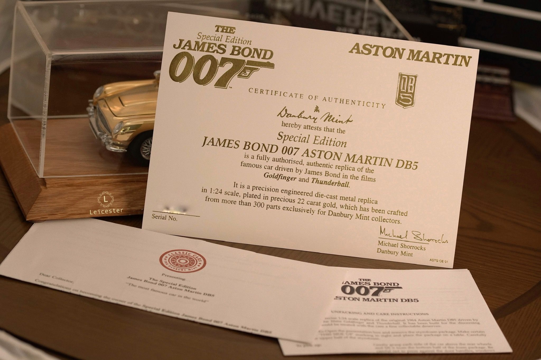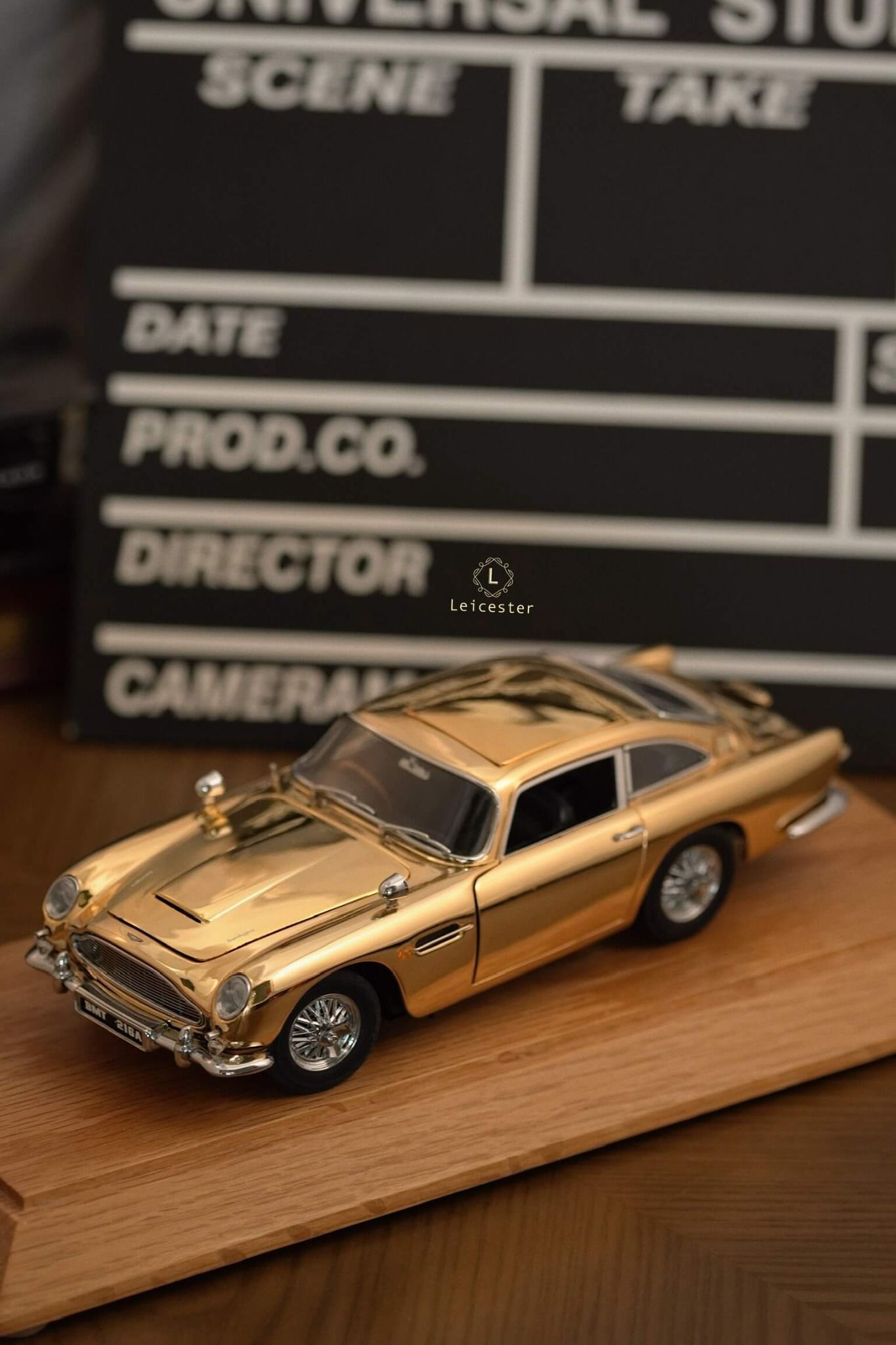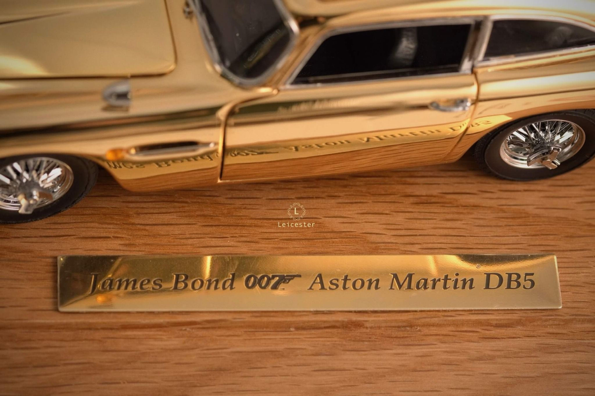 Chiếc xe Aston Martin DB5 với những tiện ích phức tạp như: biển số xe xoay, thiết bị cắt lốp xe được trang bị tại bánh xe, súng máy ẩn trong đèn xe trước, nơi xả dầu và đinh trong đèn xe sau, tấm chắn đạn cho kính sau và thậm chí là cả ghế phóng khẩn cấp cũng được tái tạo lại trong một bản sao phiên bản đặc biệt được mạ vàng 22k, tỷ lệ 1:24 được chế tác, lắp ráp và hoàn thiện bằng tay từ hơn 300 thành phần riêng biệt bởi Danbury Mint.