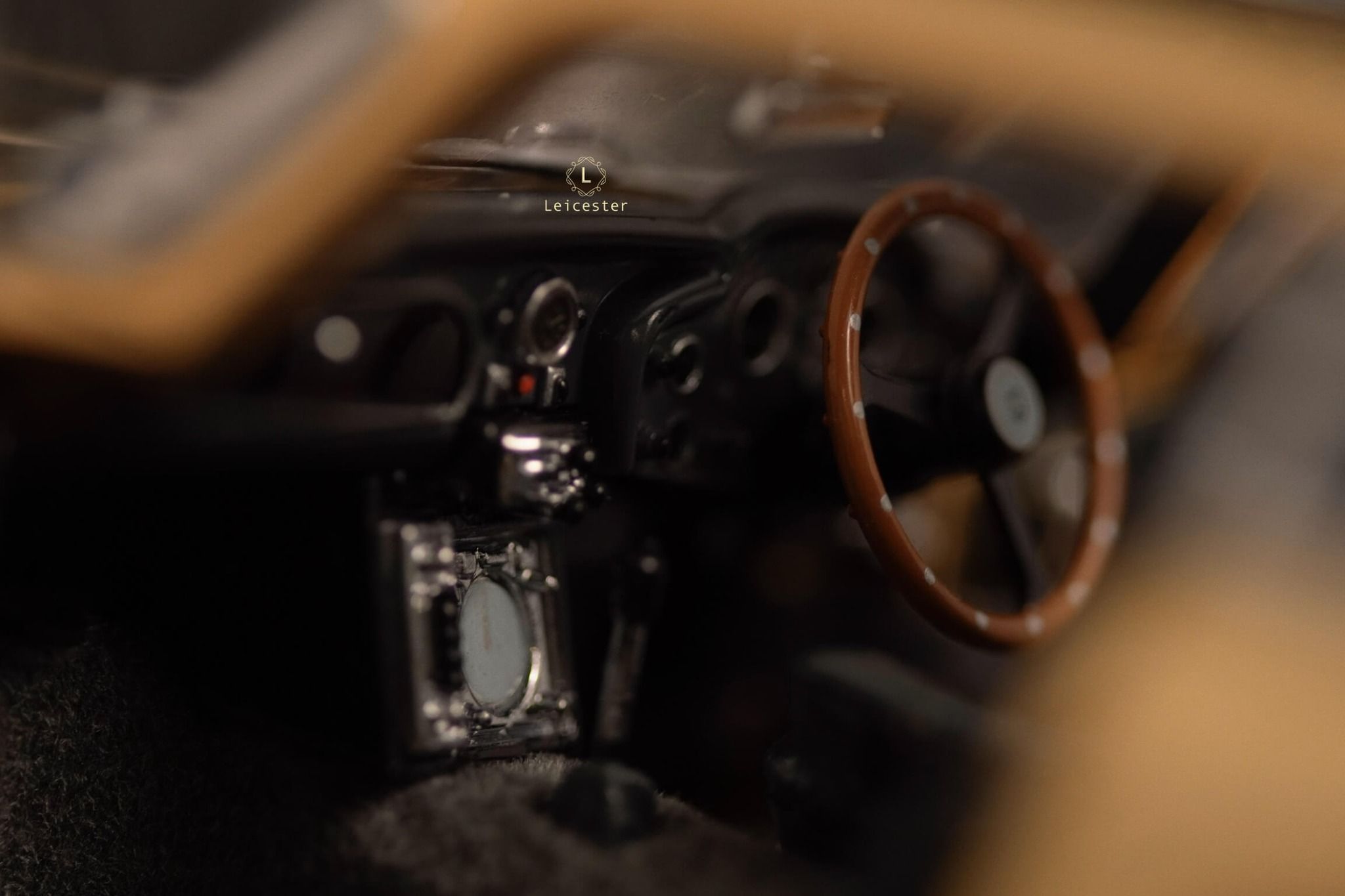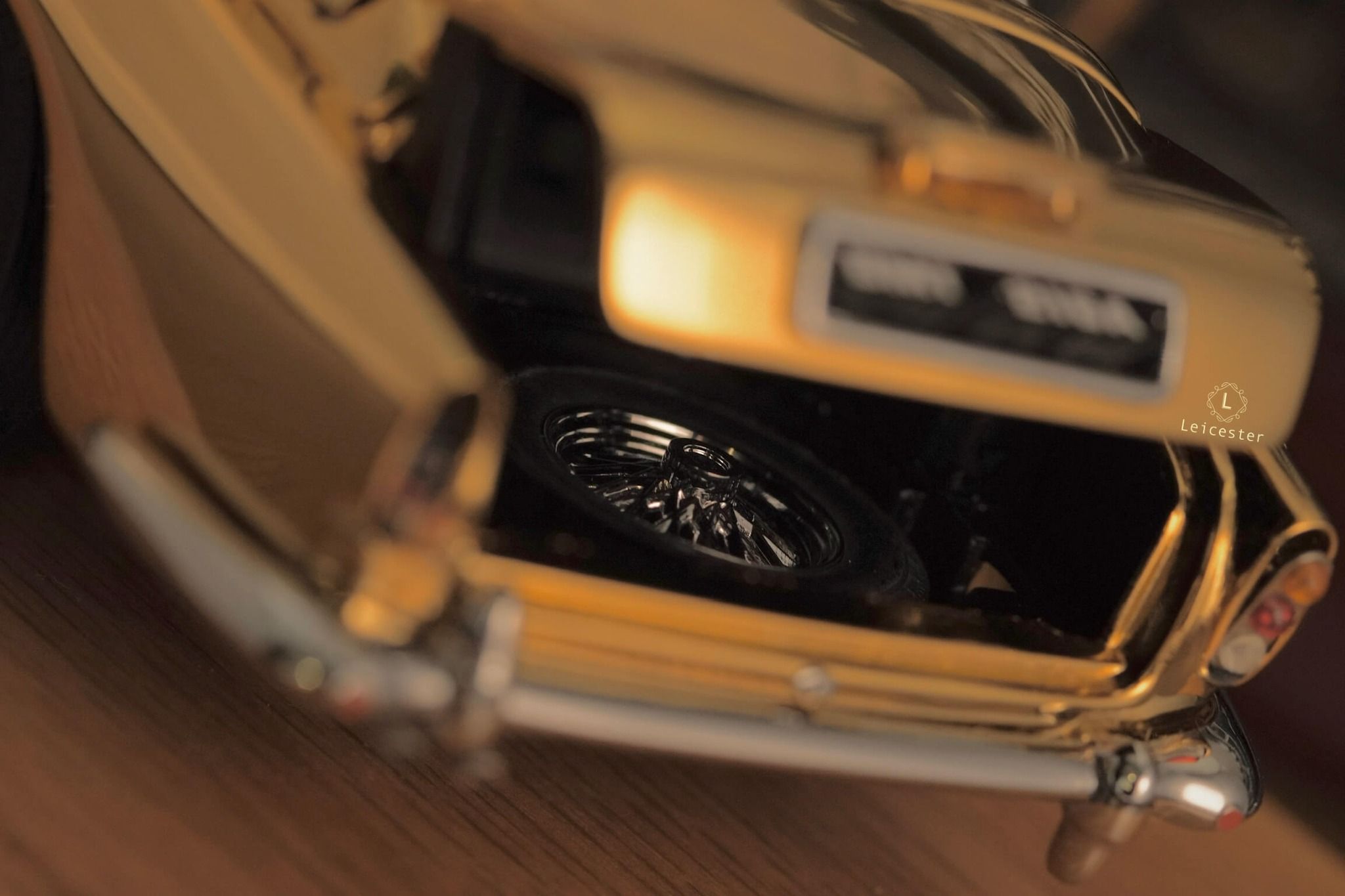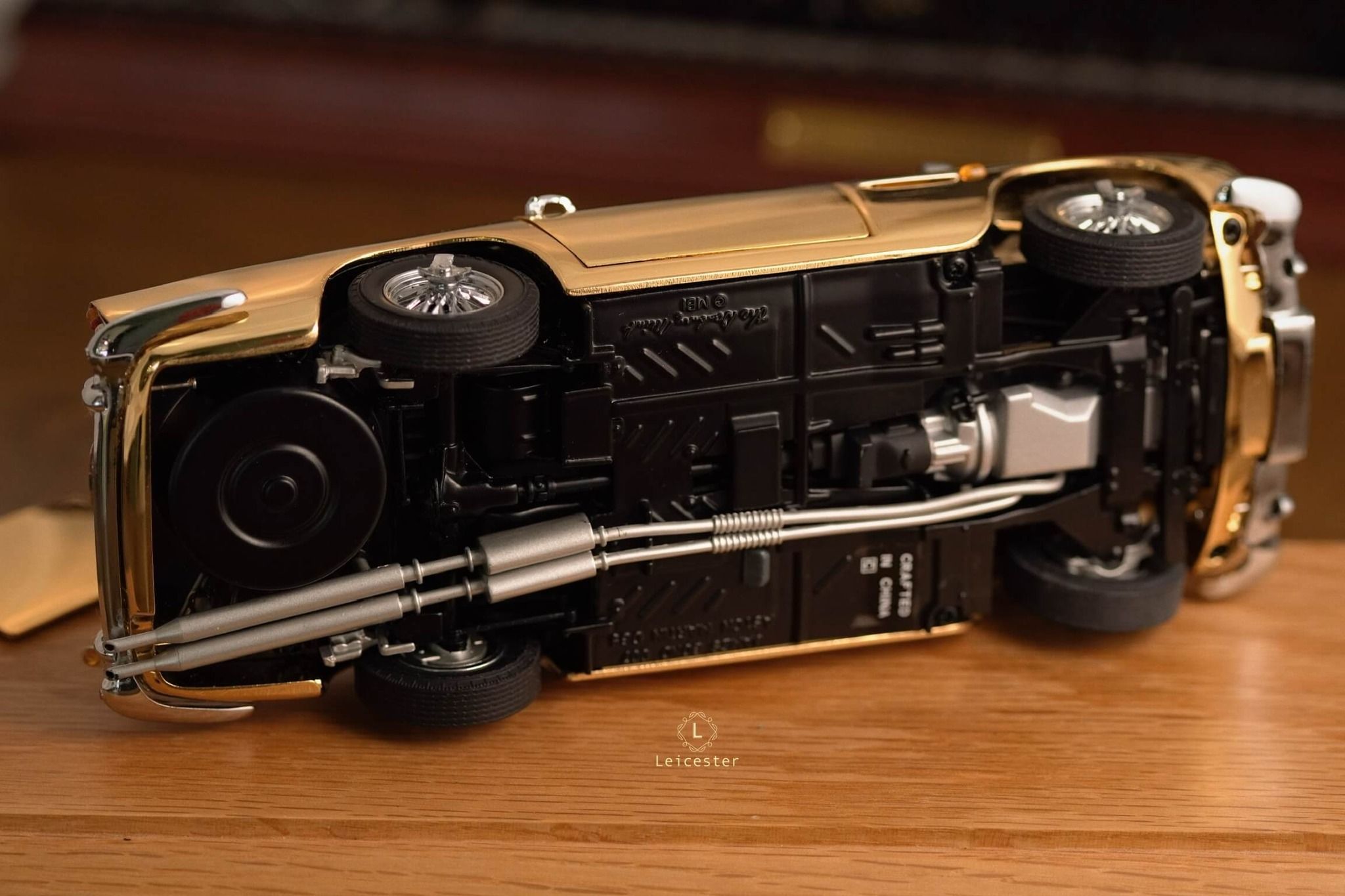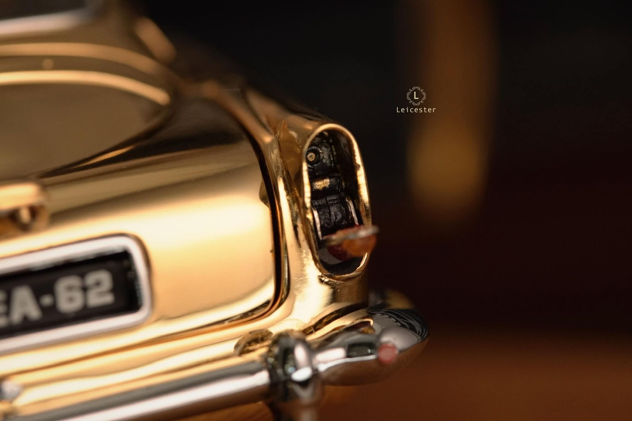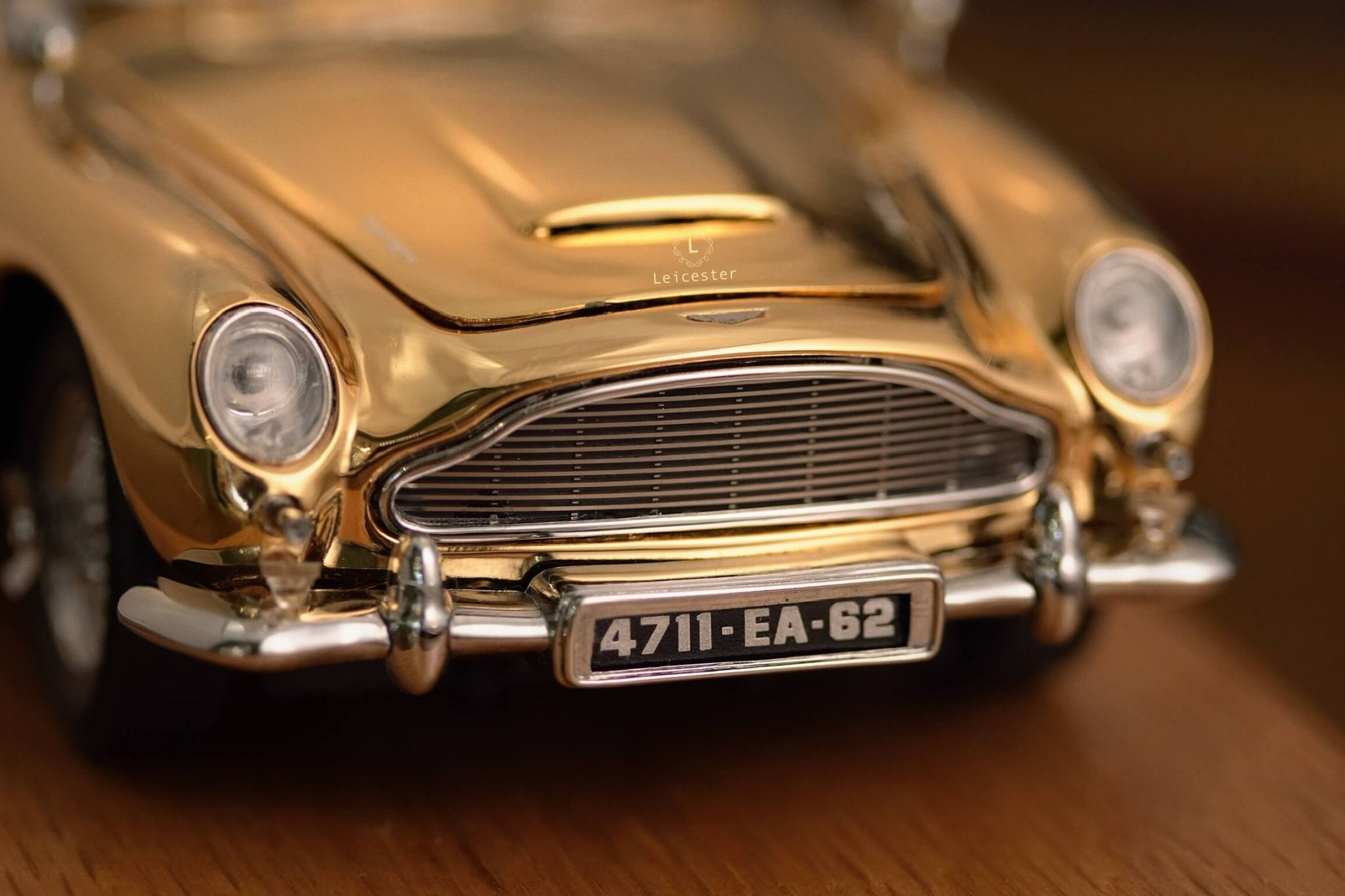 Chiếc xe Aston Martin DB5 với những tiện ích phức tạp như: biển số xe xoay, thiết bị cắt lốp xe được trang bị tại bánh xe, súng máy ẩn trong đèn xe trước, nơi xả dầu và đinh trong đèn xe sau, tấm chắn đạn cho kính sau và thậm chí là cả ghế phóng khẩn cấp cũng được tái tạo lại trong một bản sao phiên bản đặc biệt được mạ vàng 22k, tỷ lệ 1:24 được chế tác, lắp ráp và hoàn thiện bằng tay từ hơn 300 thành phần riêng biệt bởi Danbury Mint.