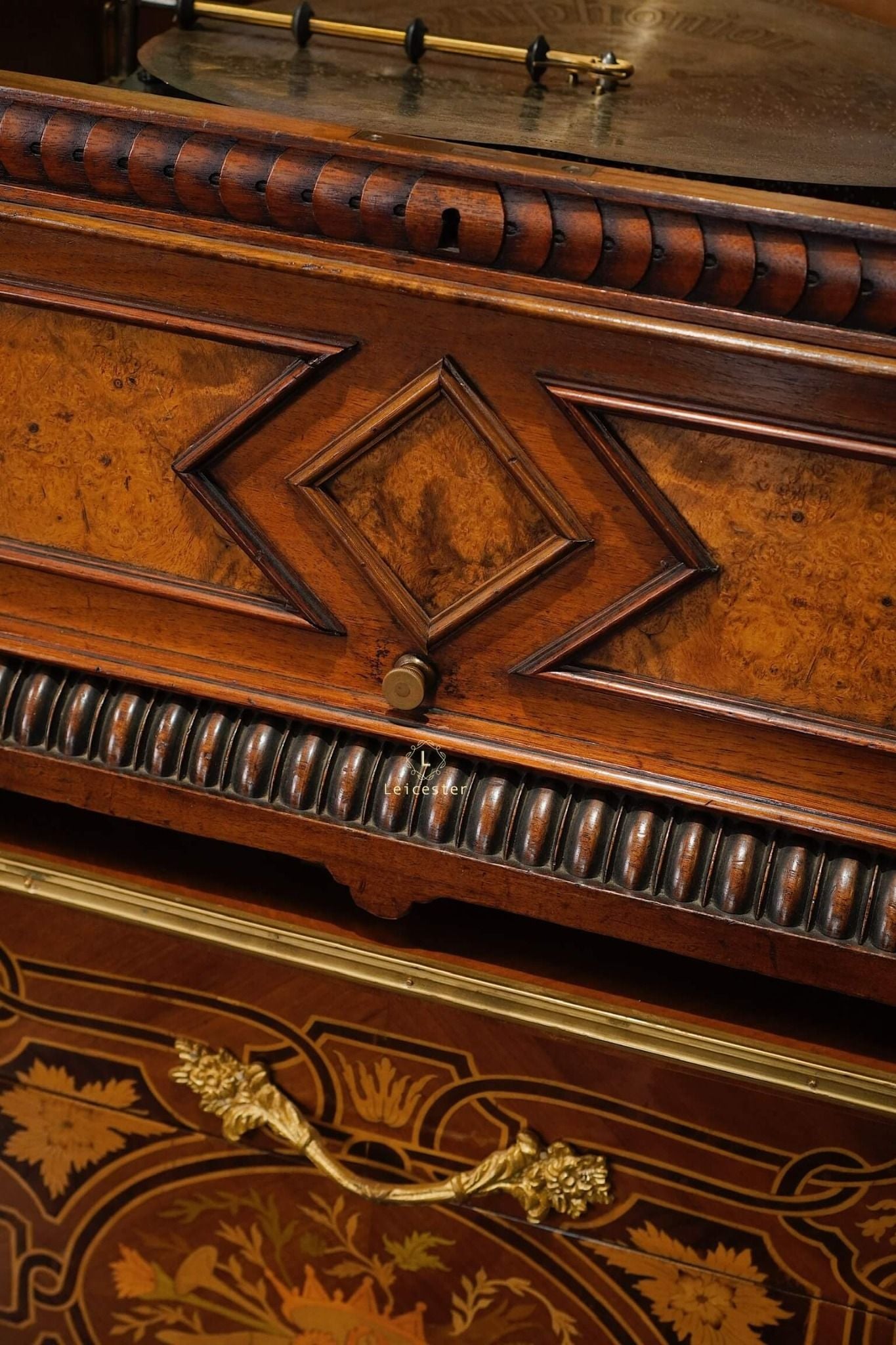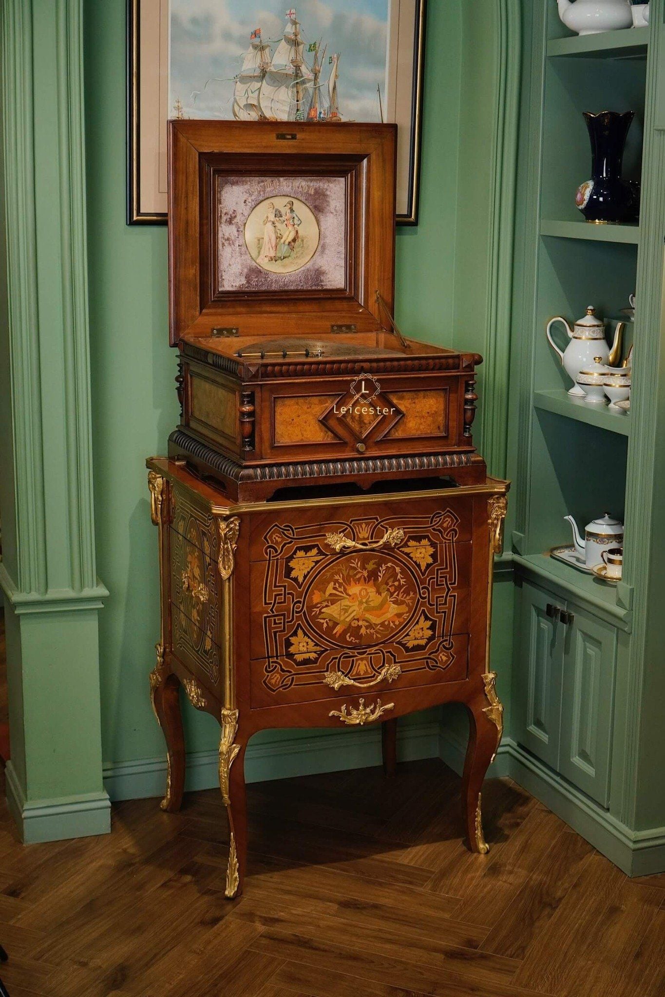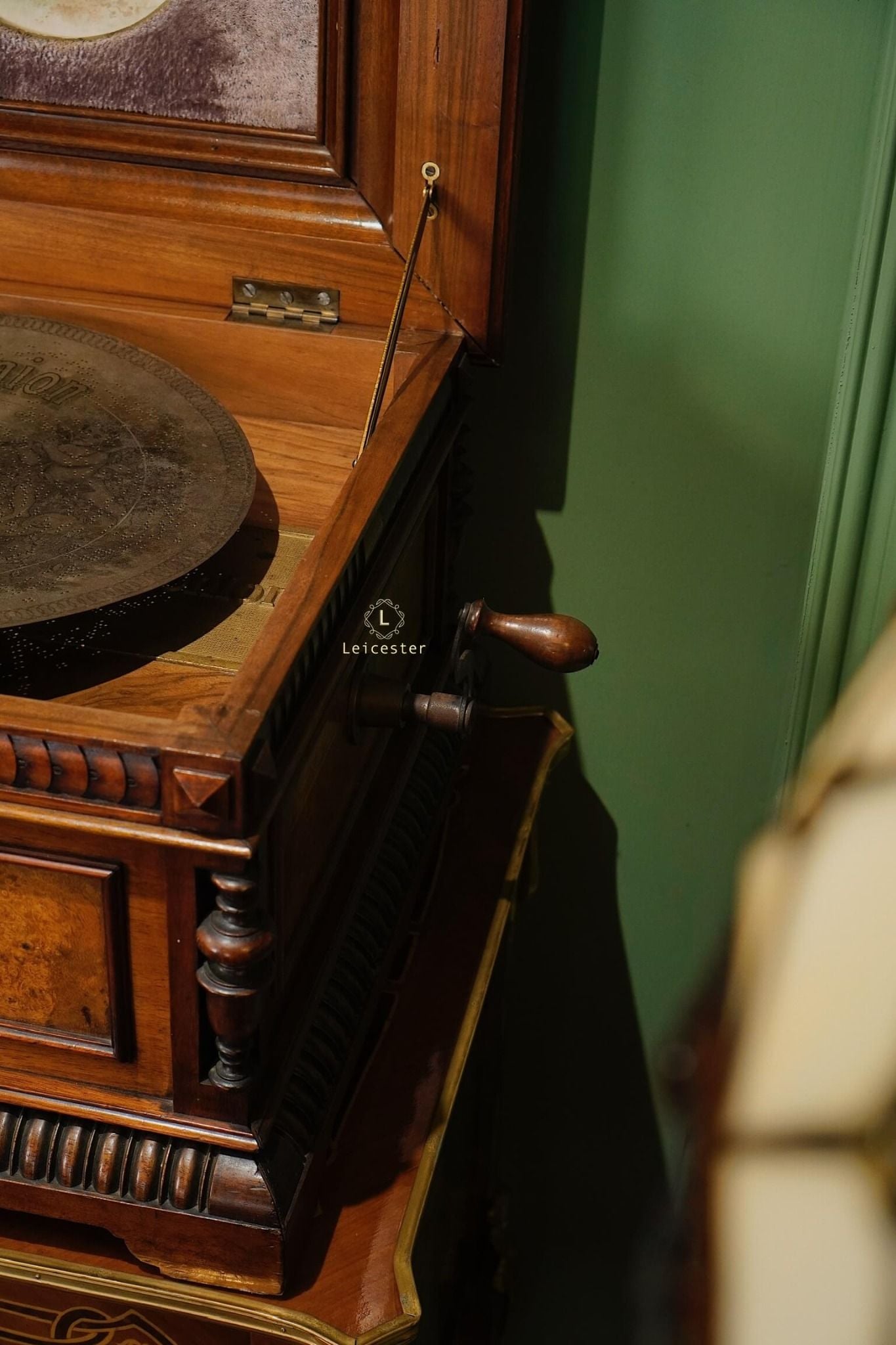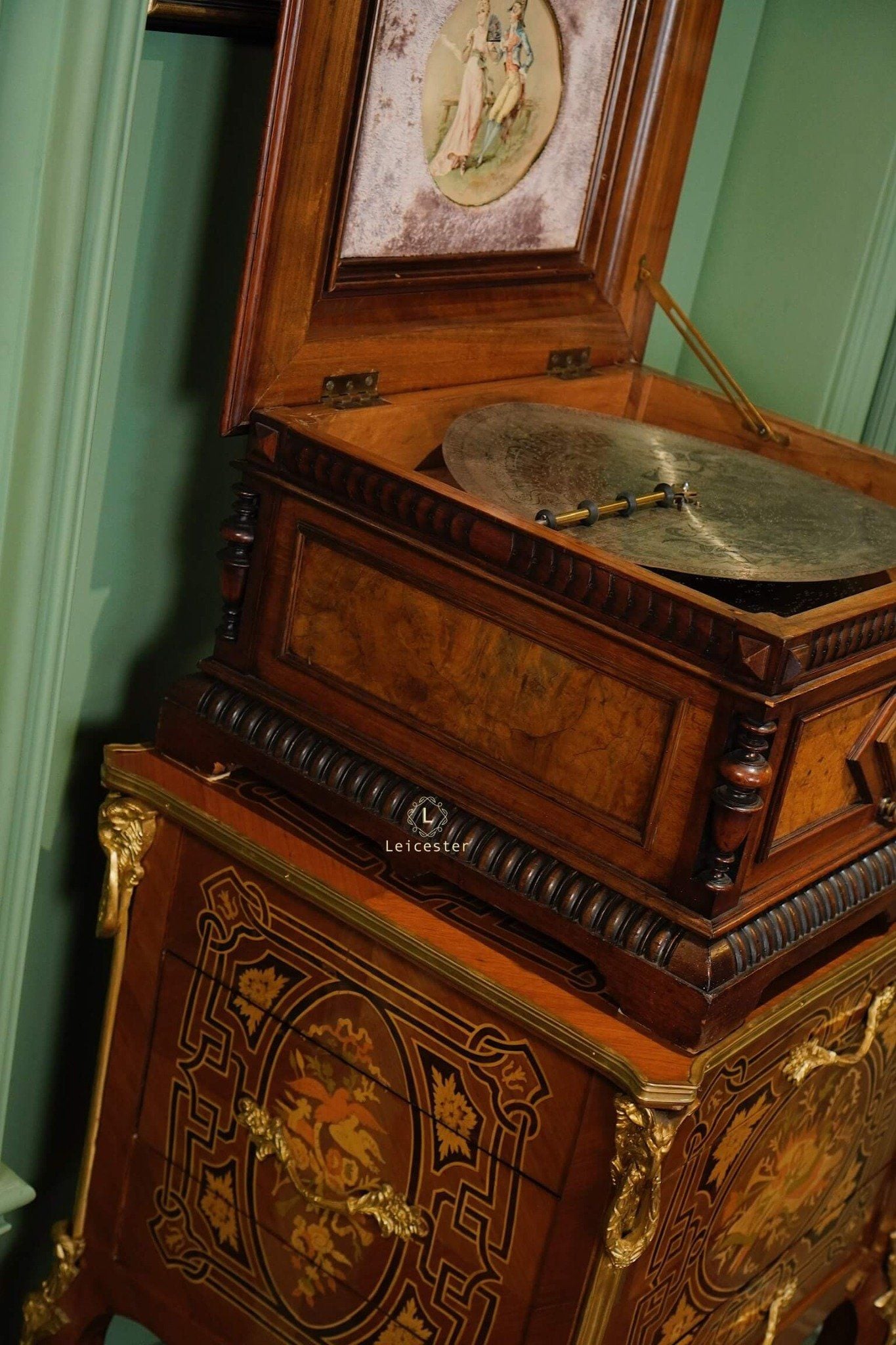 Đây là loại hộp nhạc dạng đĩa để bàn, đường kính đĩa 13.5 inch (34,5 cm), sử dụng loại lược đôi được sắp xếp xen kẻ do hãng Syphonion ở Đức sản xuất cách đây khoảng 120 năm, sản xuất khoảng 1900s (1890-1910).