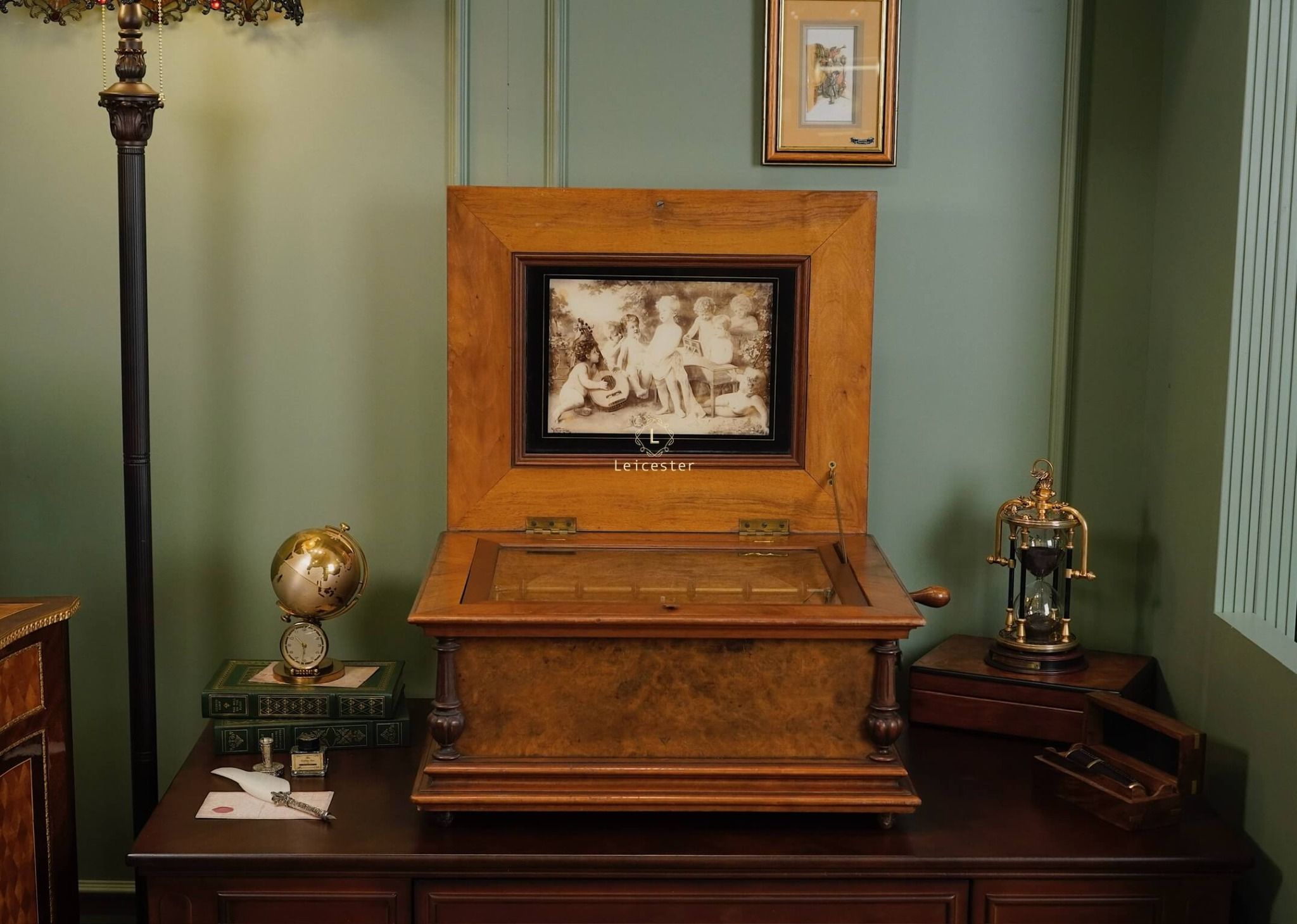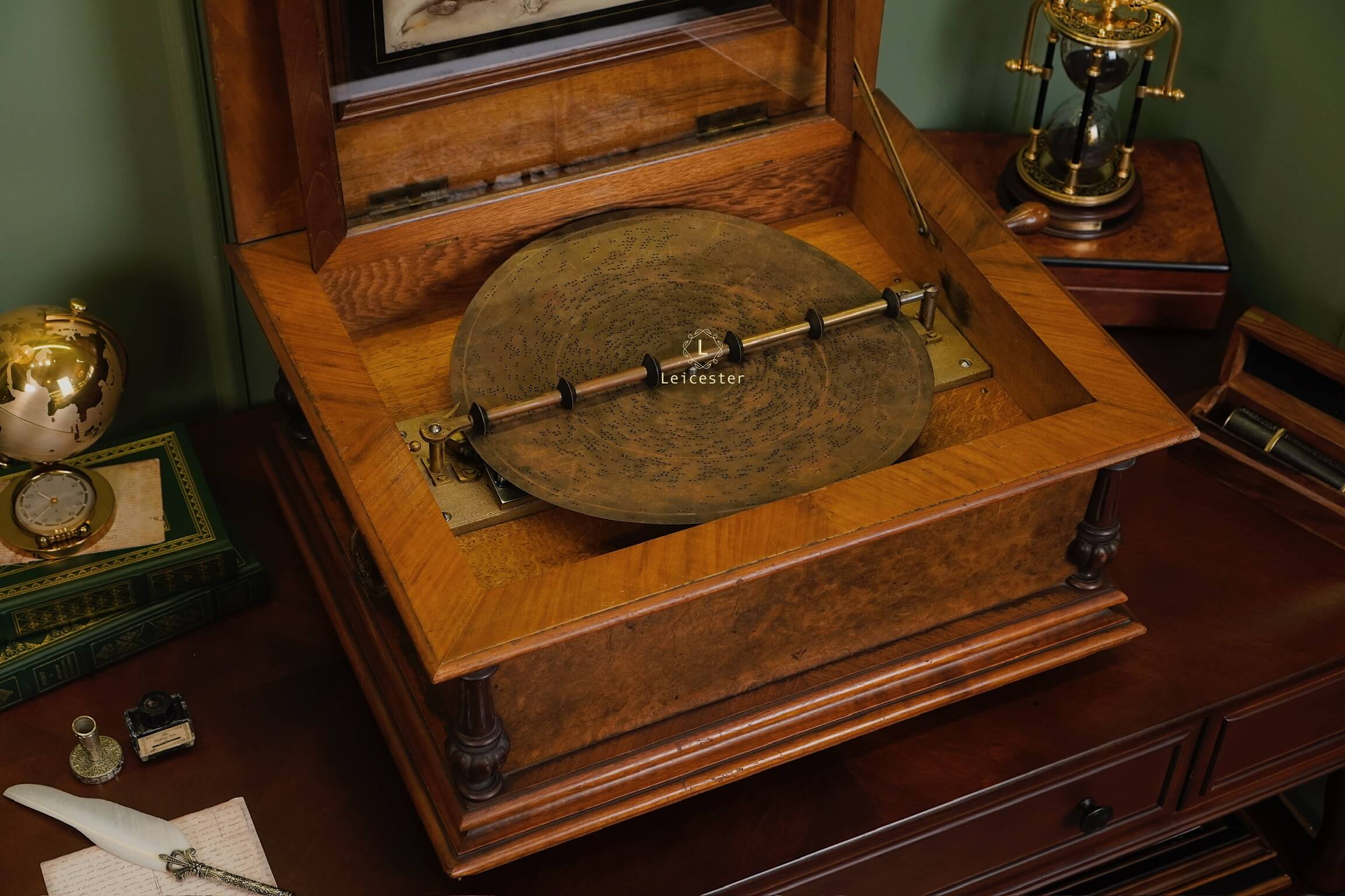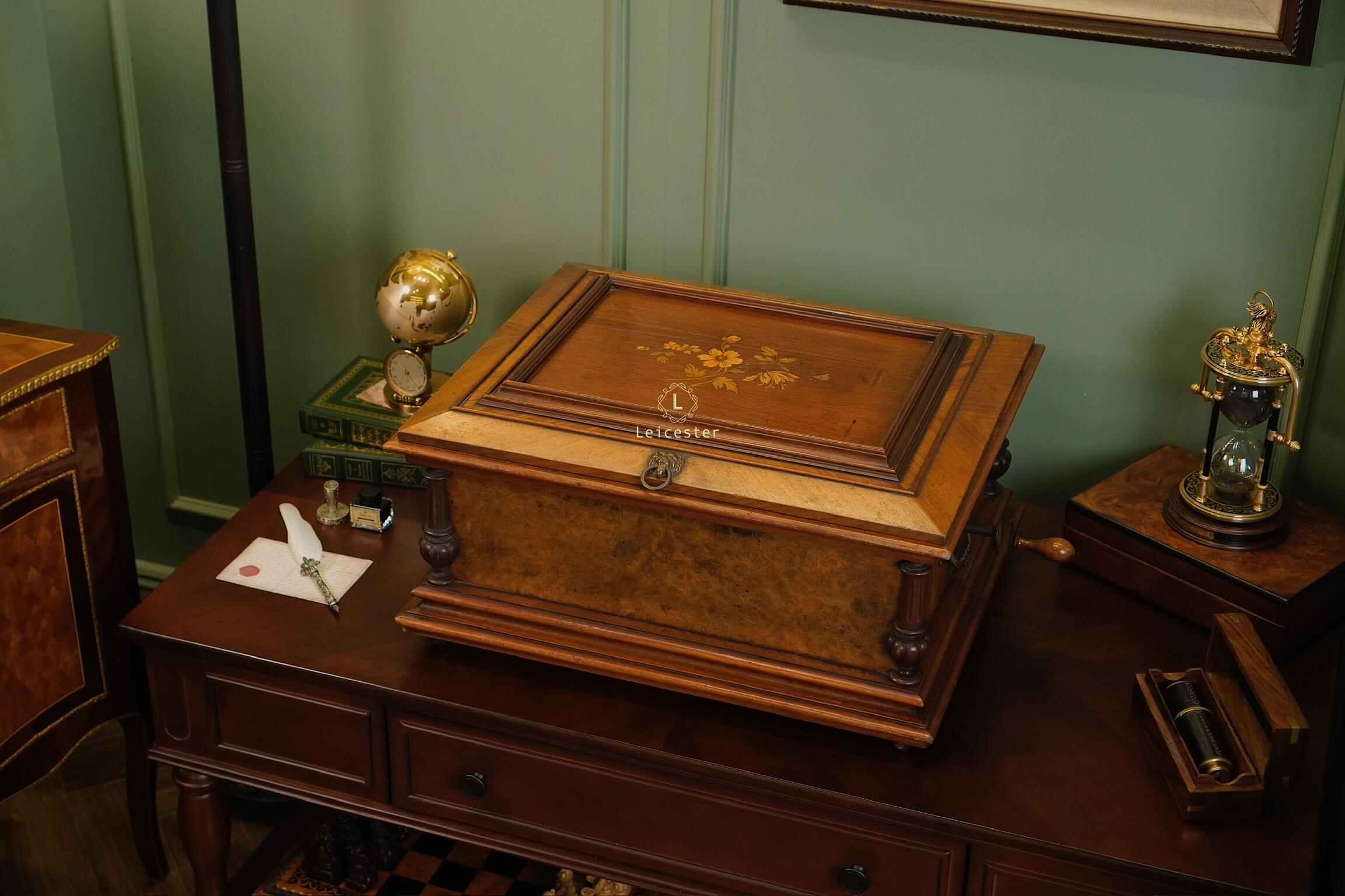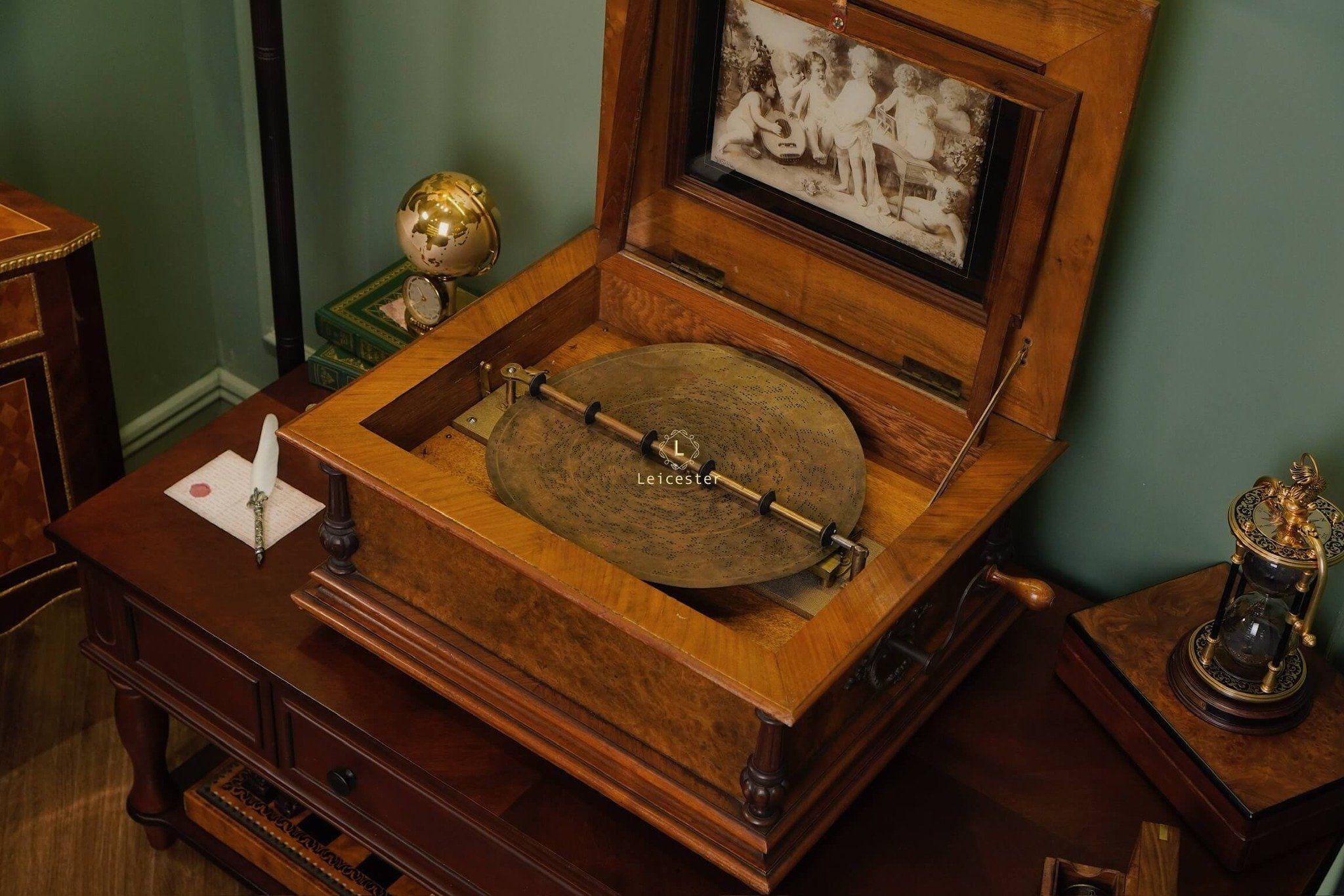 Một tuyệt phẩm kỹ nghệ cơ khí đến từ Leipzig, Đức - mang dấu ấn của sự đổi mới vào cuối thế kỷ 19. Với vẻ ngoài được thiết kế sang trọng bằng gỗ khảm cao cấp, tay cầm đồng thau chạm hình đầu thú và tấm tranh in nghệ thuật bên trong nắp toát nên sự tinh tế trong chế tác. Ngoài ra, bên trong chiếc máy cổ còn sở hữu hai lược âm độc lập và hệ thống bánh xe sao độc quyền của Paul Wendland (được cấp bằng sáng chế năm 1889), mang đến âm thanh hòa âm sâu lắng mà tinh khiết, chuẩn xác hiếm có.