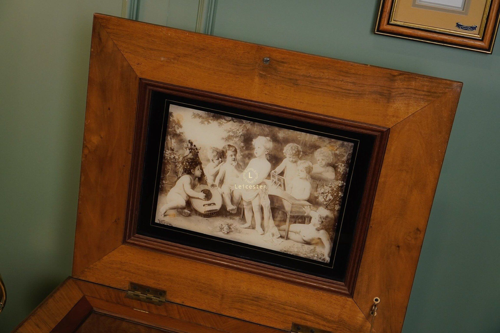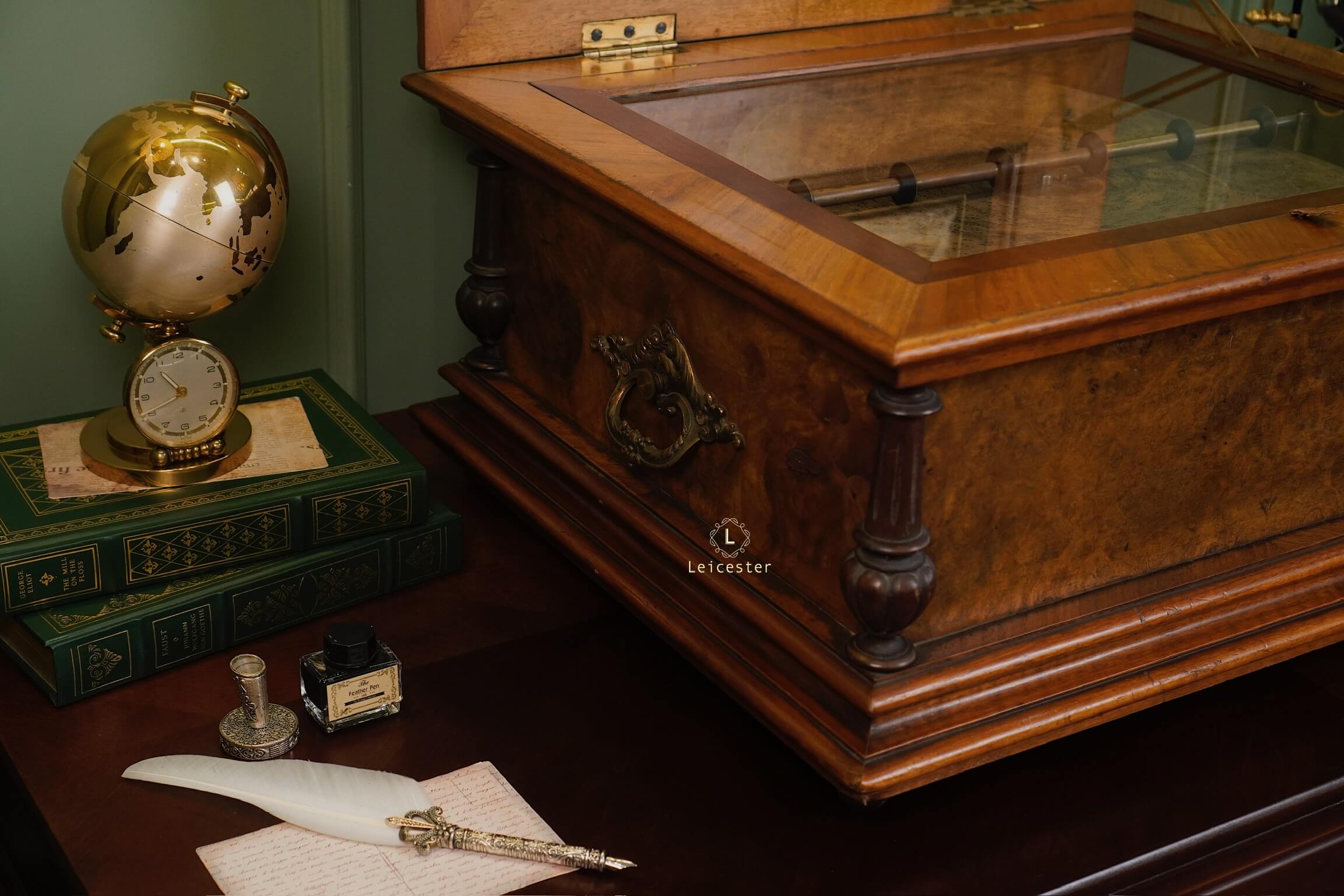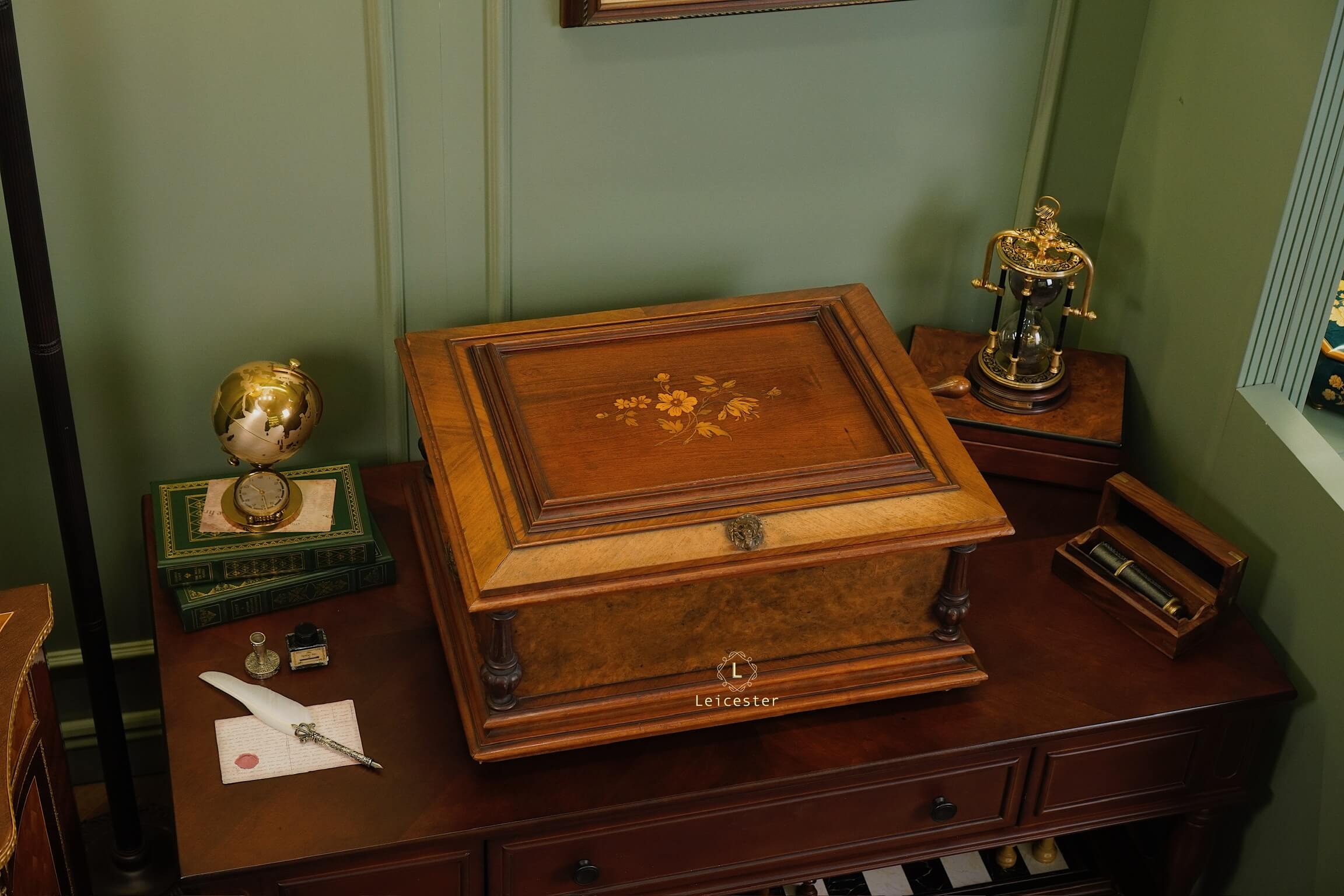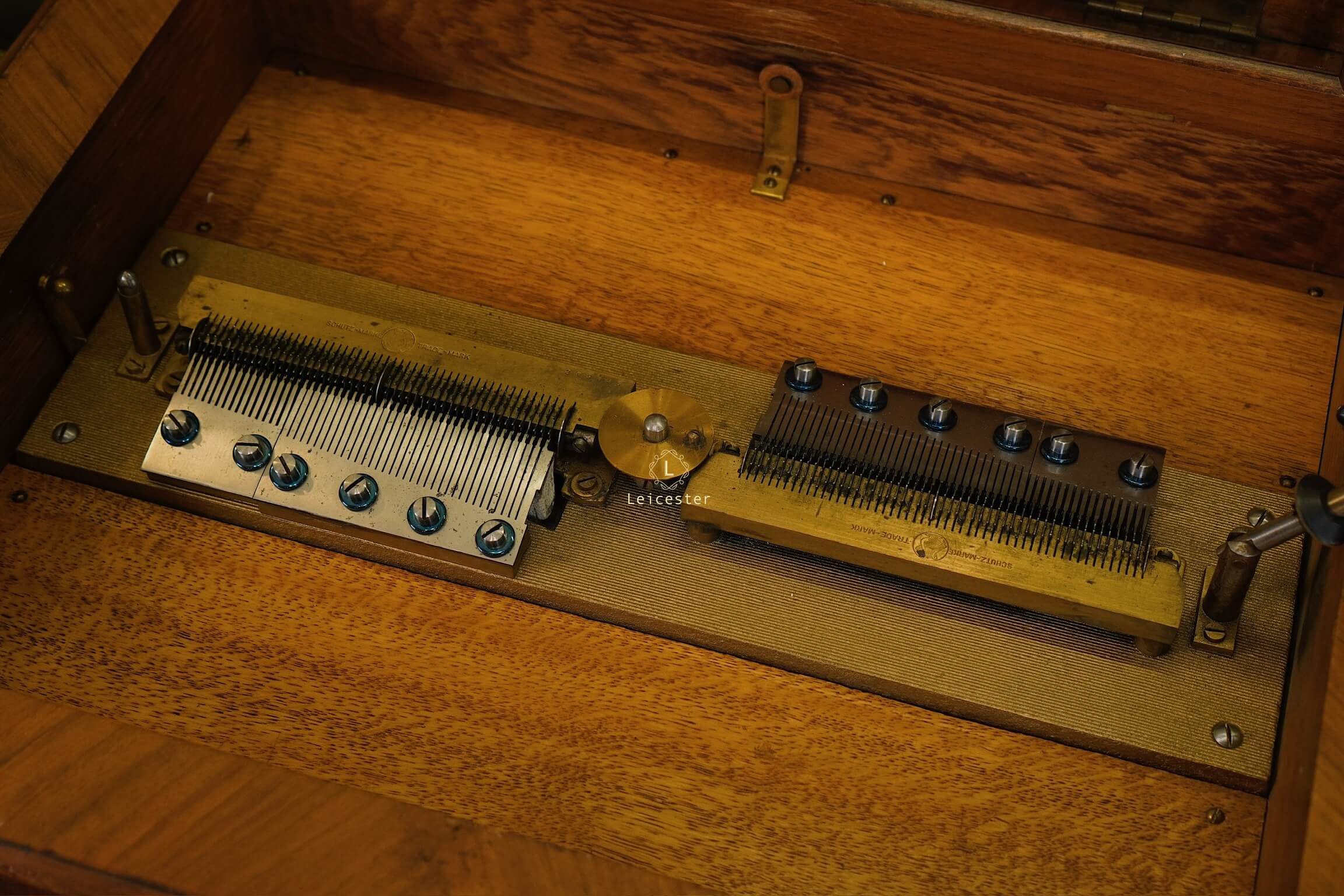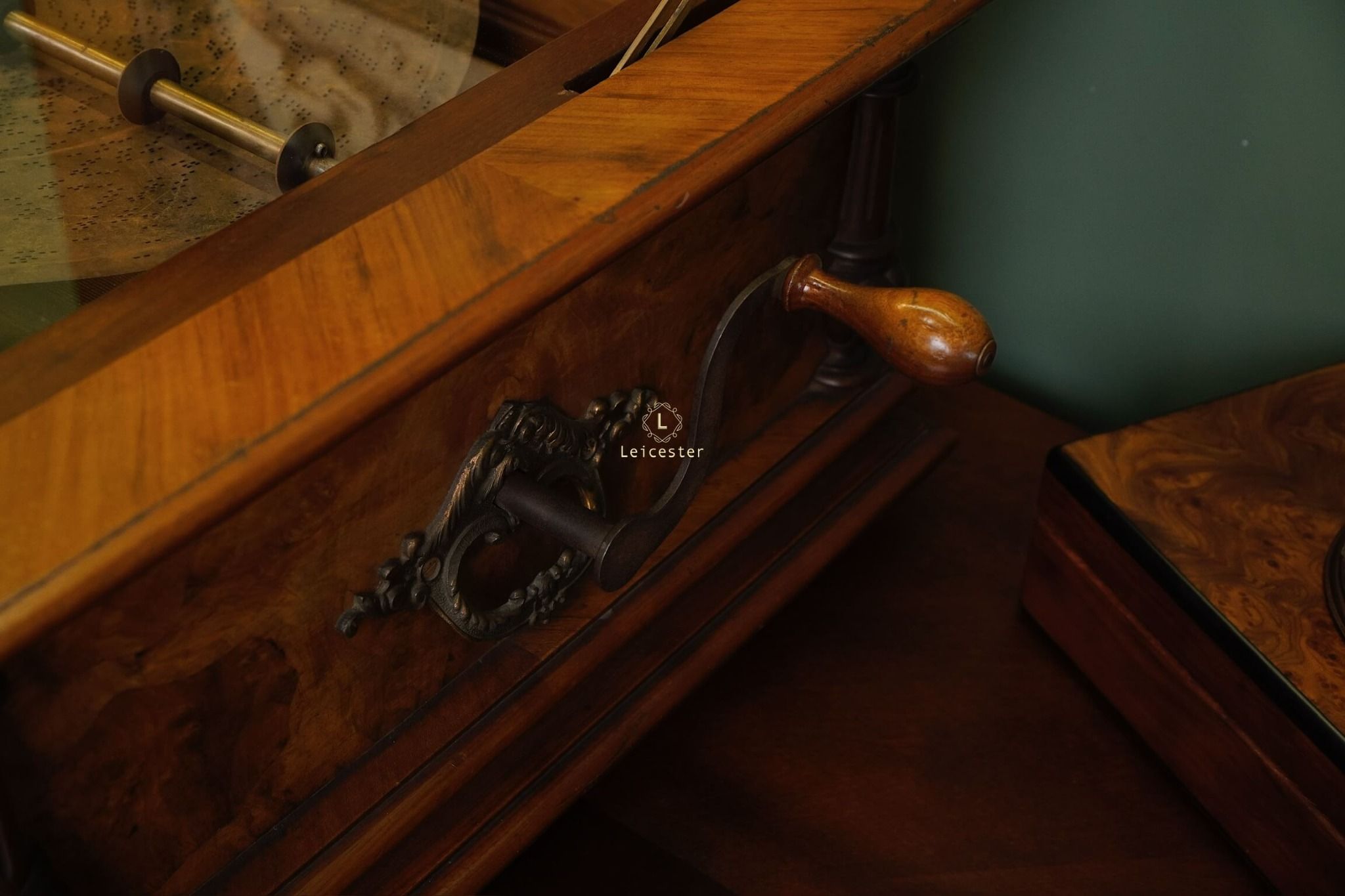 Một tuyệt phẩm kỹ nghệ cơ khí đến từ Leipzig, Đức - mang dấu ấn của sự đổi mới vào cuối thế kỷ 19. Với vẻ ngoài được thiết kế sang trọng bằng gỗ khảm cao cấp, tay cầm đồng thau chạm hình đầu thú và tấm tranh in nghệ thuật bên trong nắp toát nên sự tinh tế trong chế tác. Ngoài ra, bên trong chiếc máy cổ còn sở hữu hai lược âm độc lập và hệ thống bánh xe sao độc quyền của Paul Wendland (được cấp bằng sáng chế năm 1889), mang đến âm thanh hòa âm sâu lắng mà tinh khiết, chuẩn xác hiếm có.