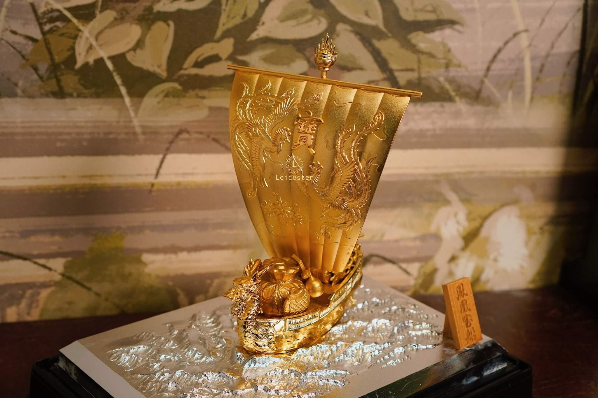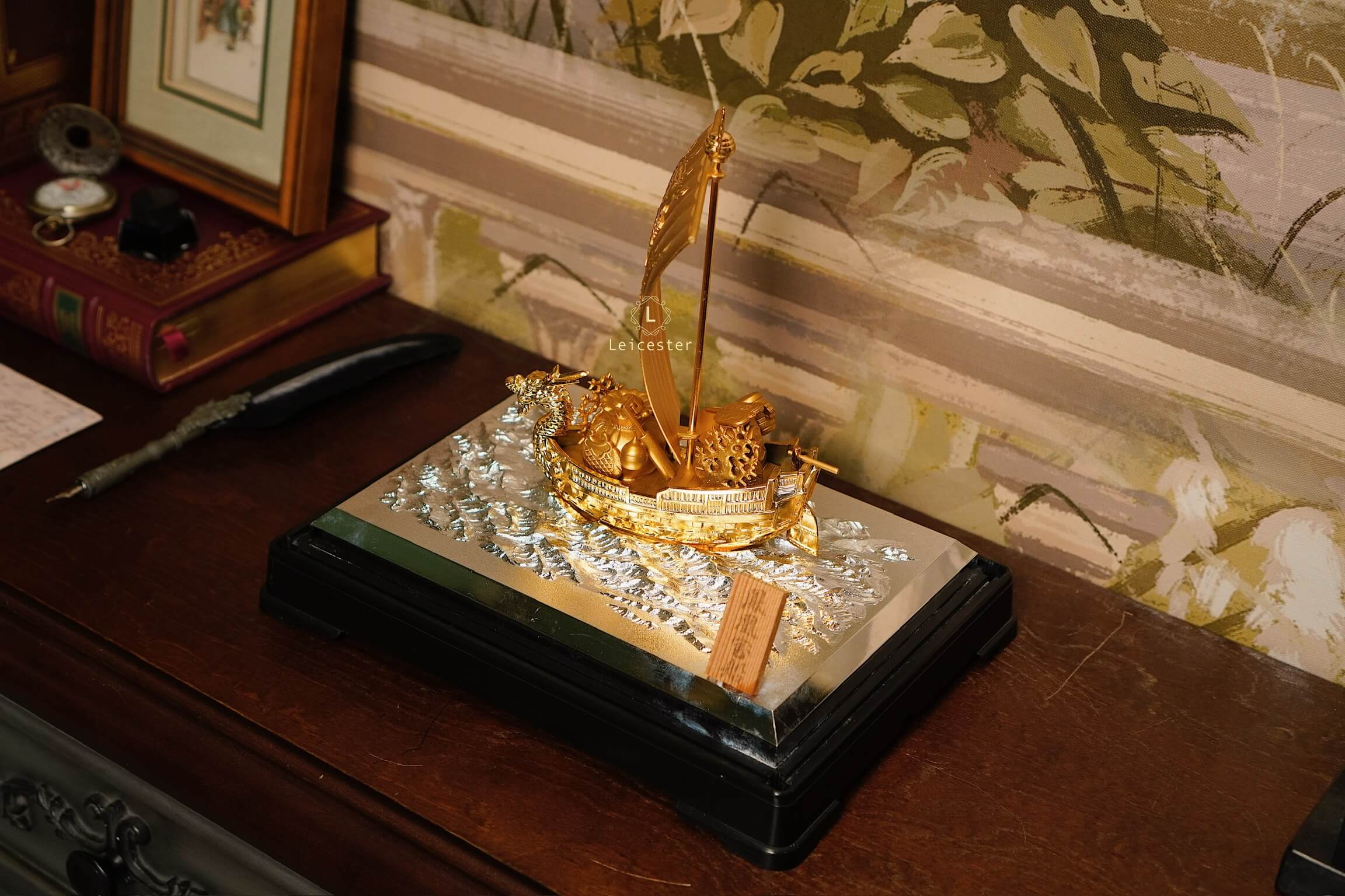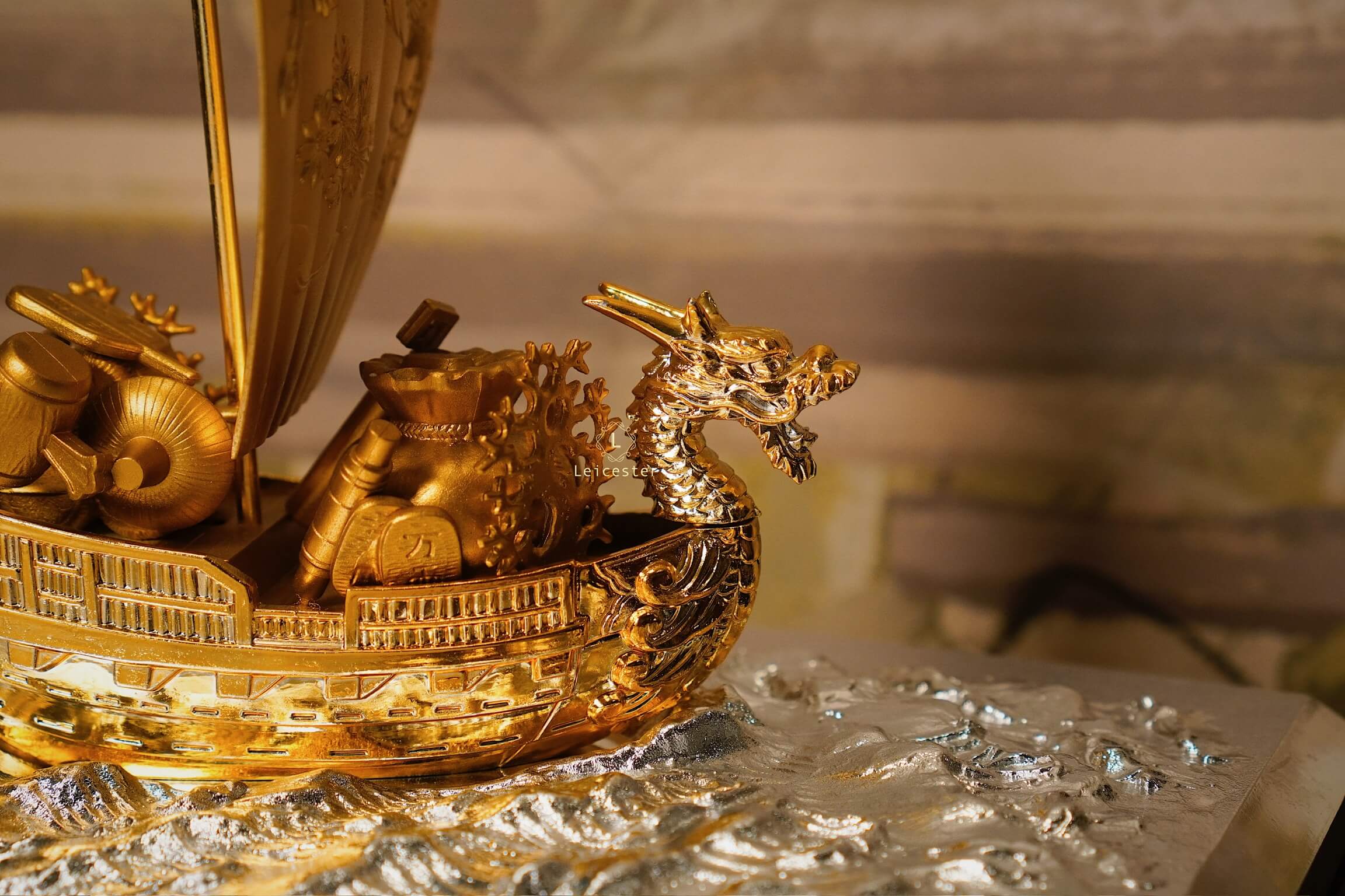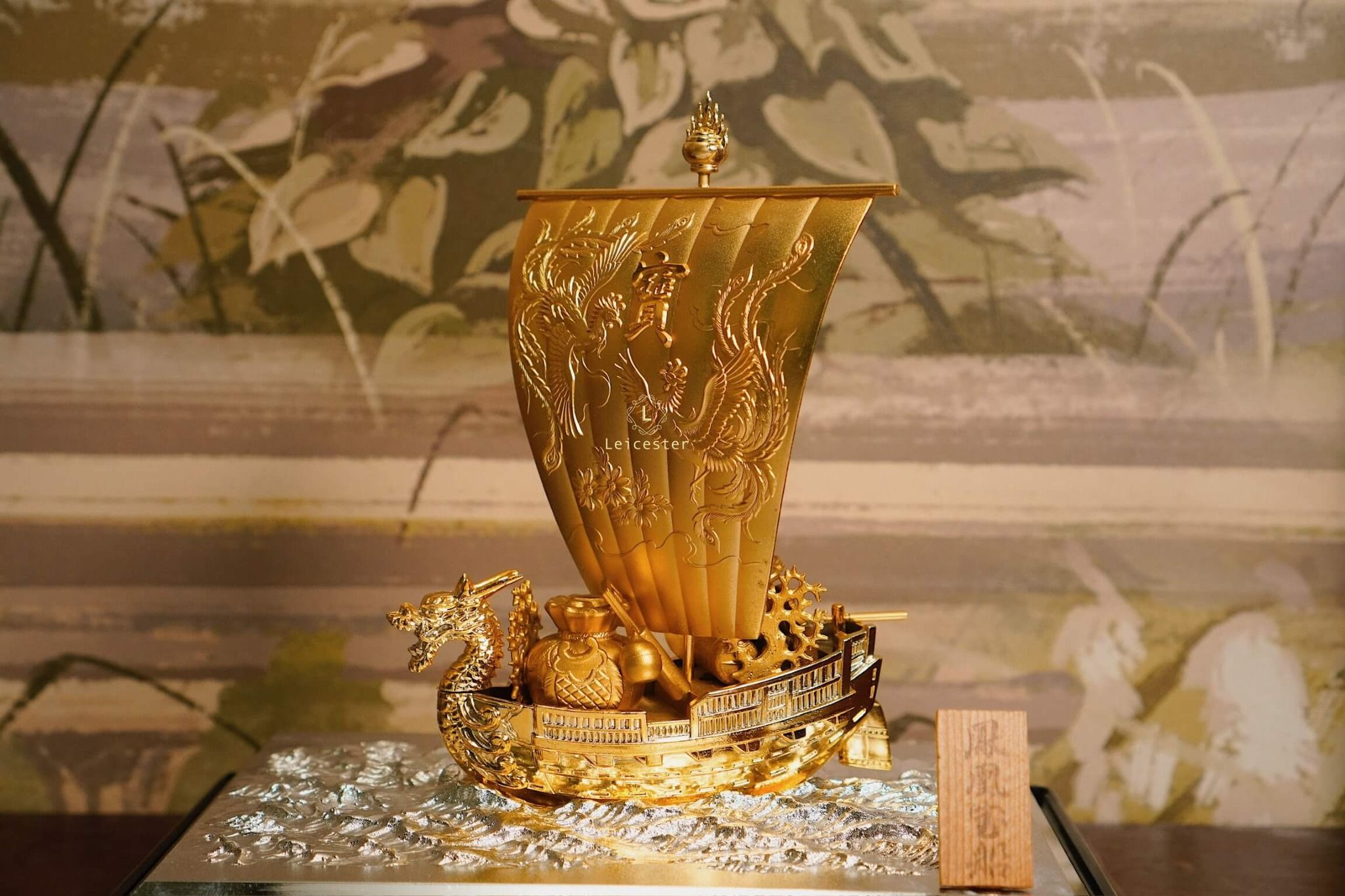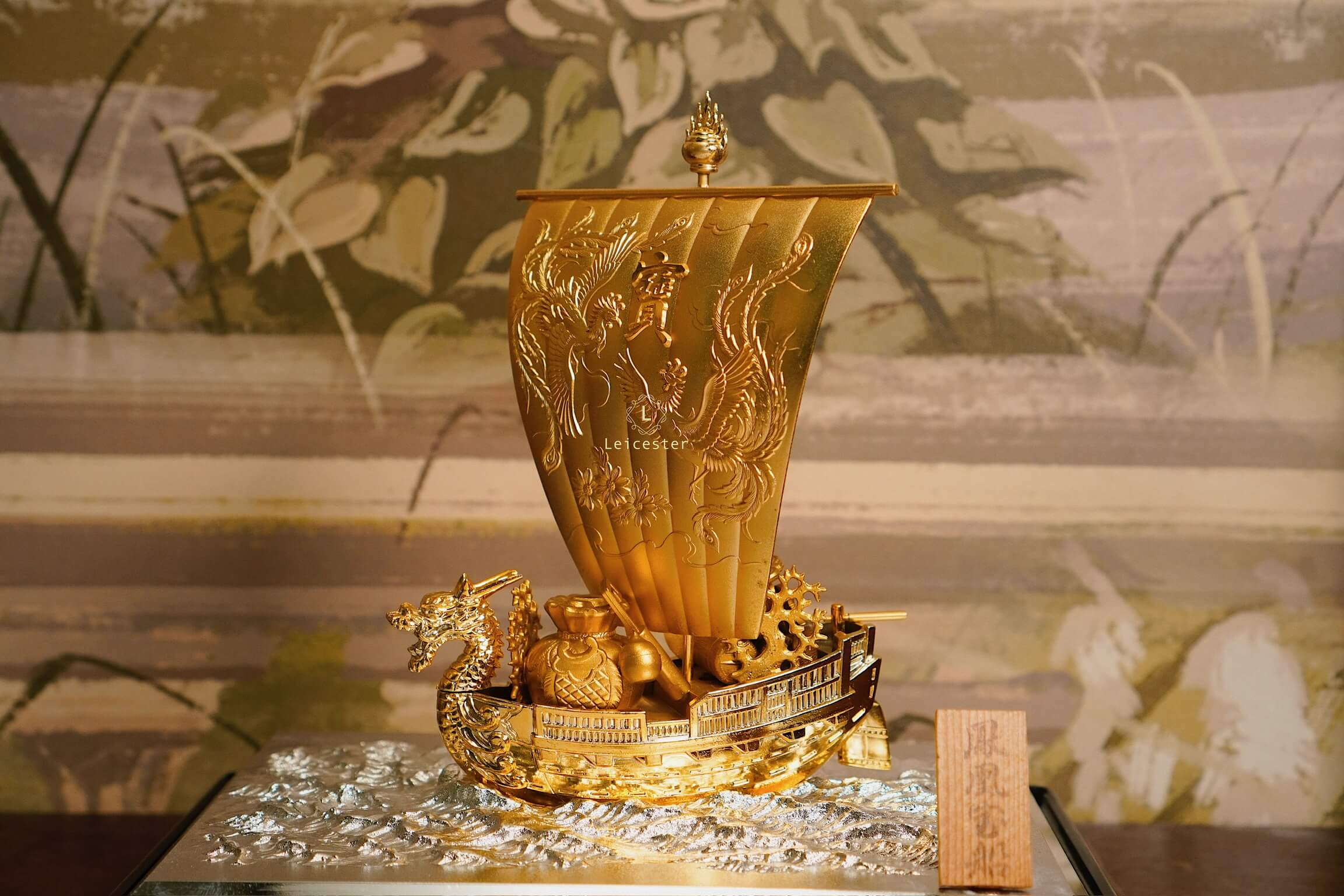 Trong văn hóa Á Đông, đặc biệt là Nhật Bản, hình ảnh “Thuyền Kho Báu” – 宝船 (Takarabune) là biểu tượng thiêng liêng của tài lộc, may mắn và thịnh vượng. Mô hình thuyền được chế tác tinh xảo với sắc vàng óng ánh, đầu rồng chạm trổ uy nghi và cánh buồm lớn khắc chữ “宝” – nghĩa là “bảo vật”, tượng trưng cho của cải dồi dào, kho báu đầy ắp.