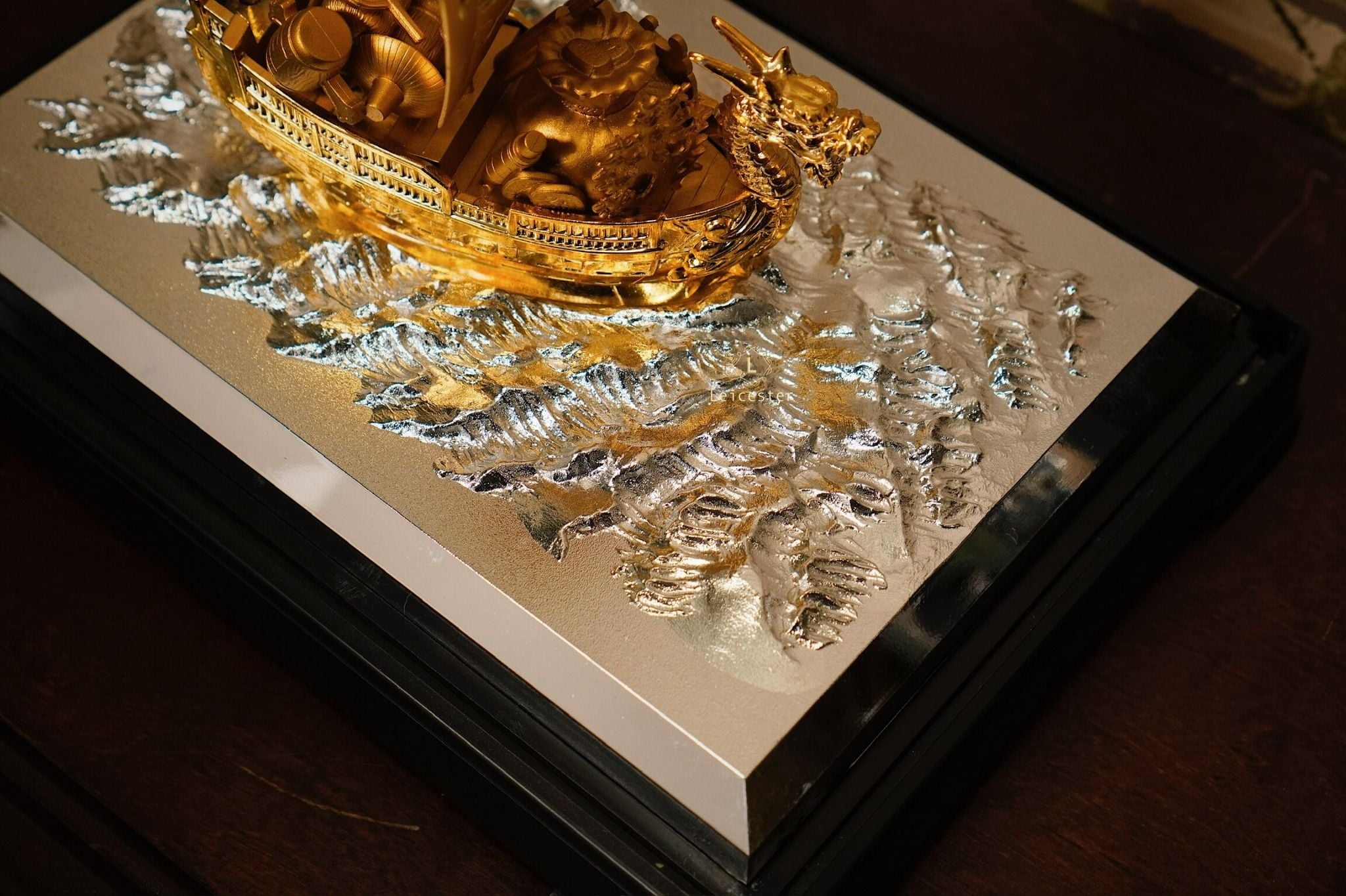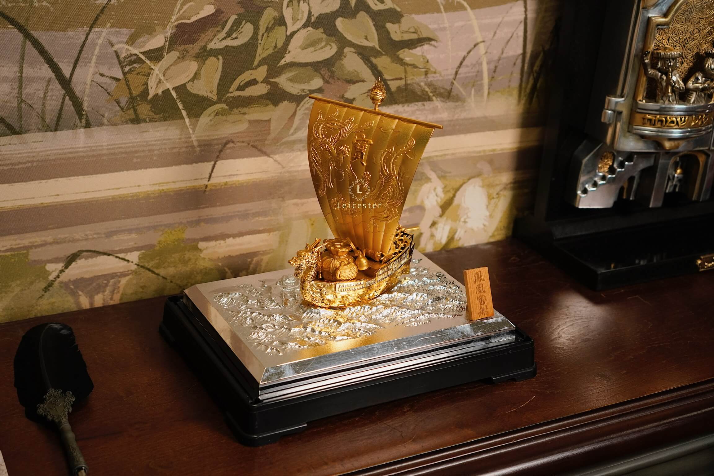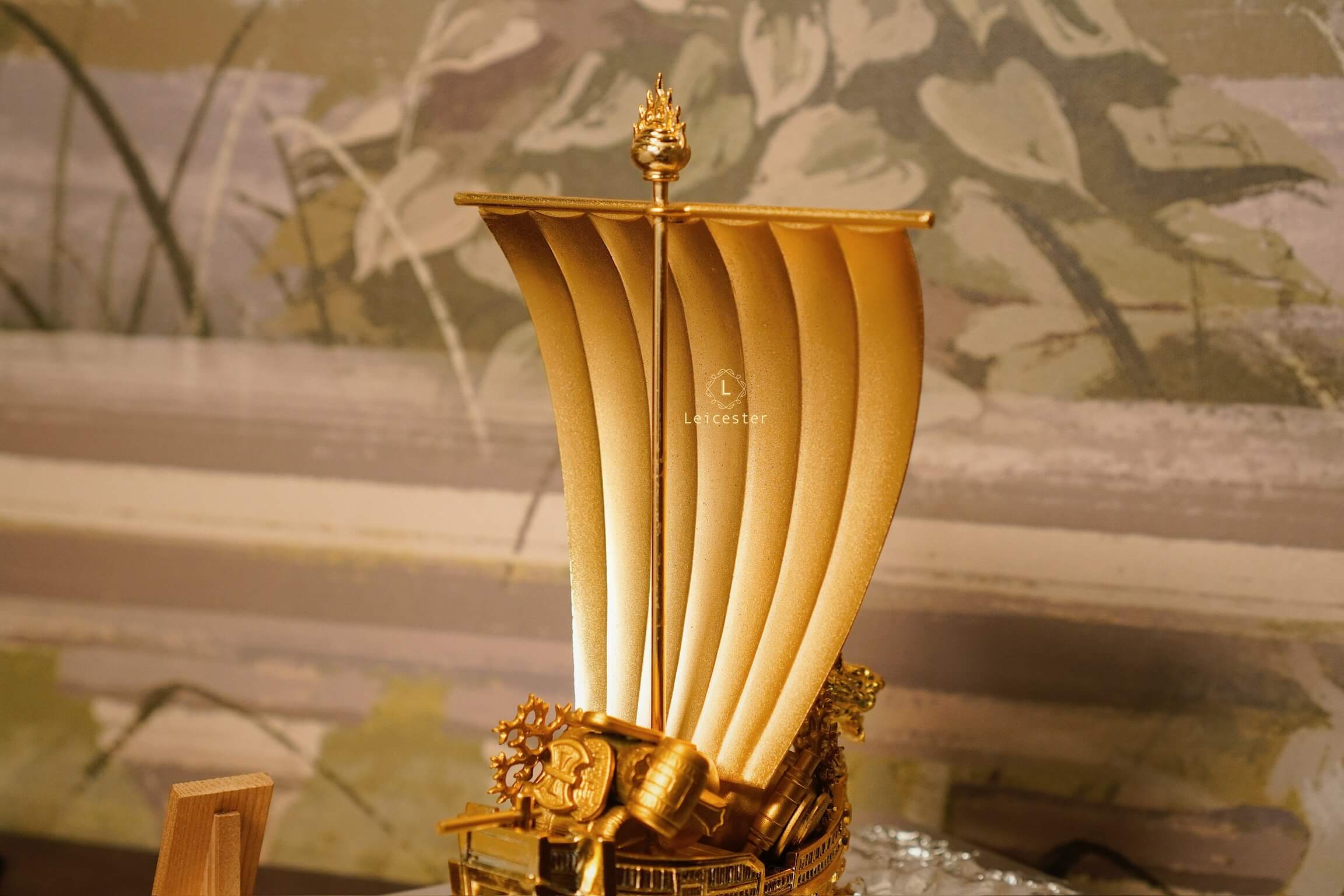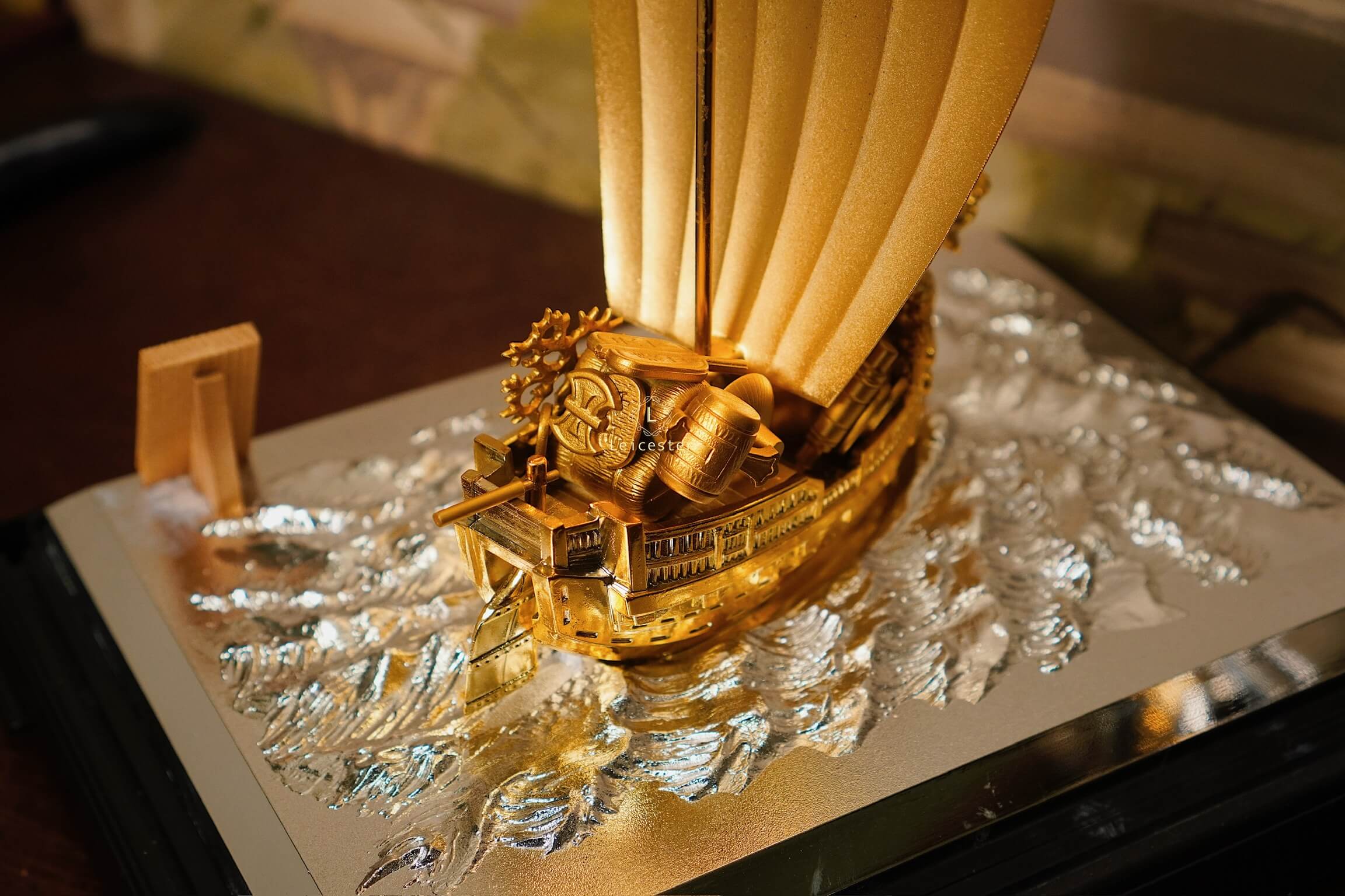 Trong văn hóa Á Đông, đặc biệt là Nhật Bản, hình ảnh “Thuyền Kho Báu” – 宝船 (Takarabune) là biểu tượng thiêng liêng của tài lộc, may mắn và thịnh vượng. Mô hình thuyền được chế tác tinh xảo với sắc vàng óng ánh, đầu rồng chạm trổ uy nghi và cánh buồm lớn khắc chữ “宝” – nghĩa là “bảo vật”, tượng trưng cho của cải dồi dào, kho báu đầy ắp.