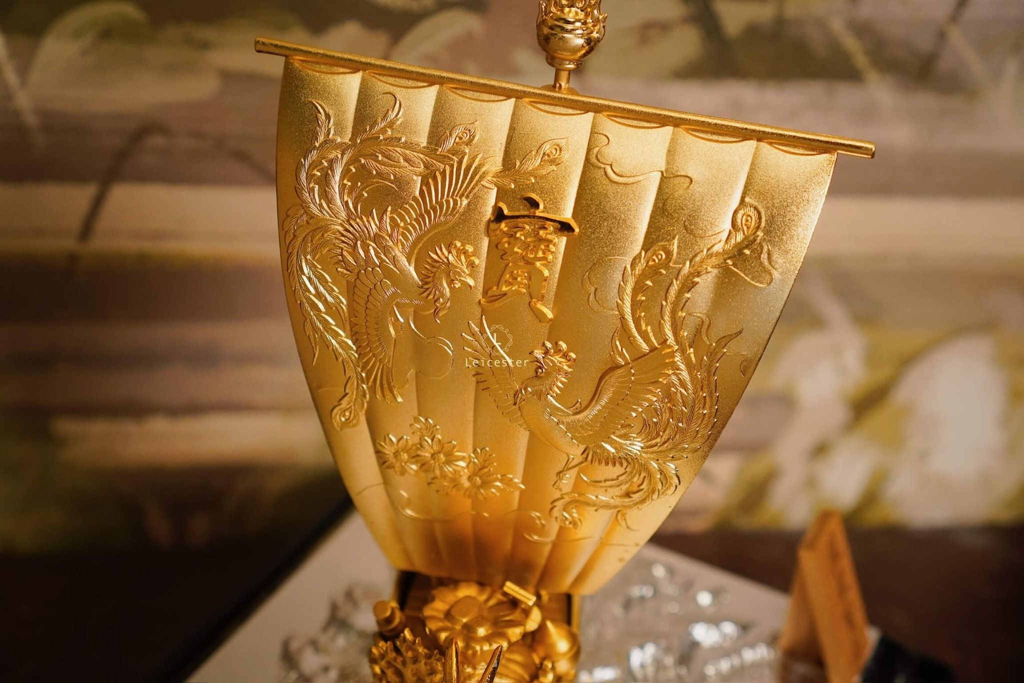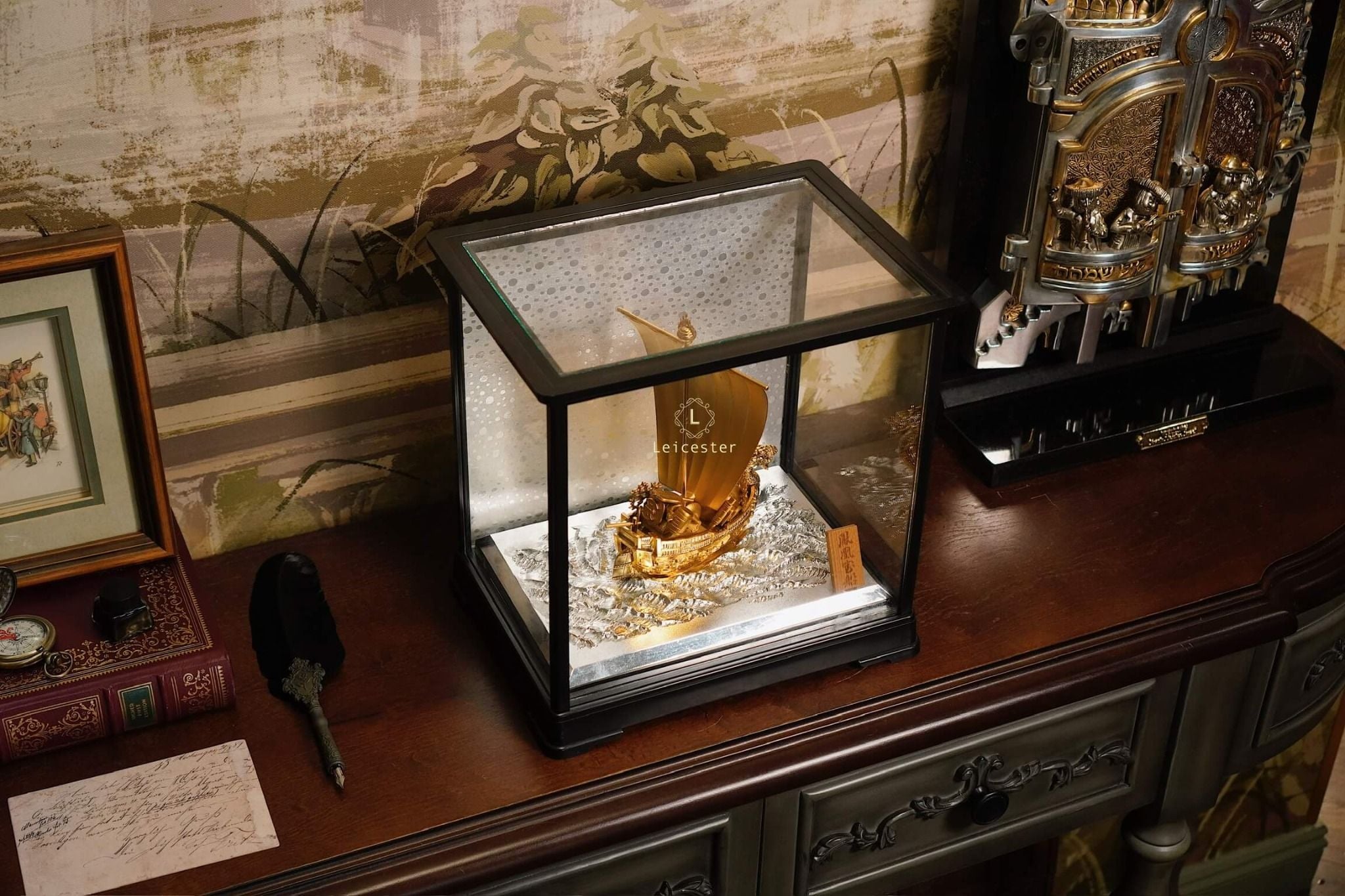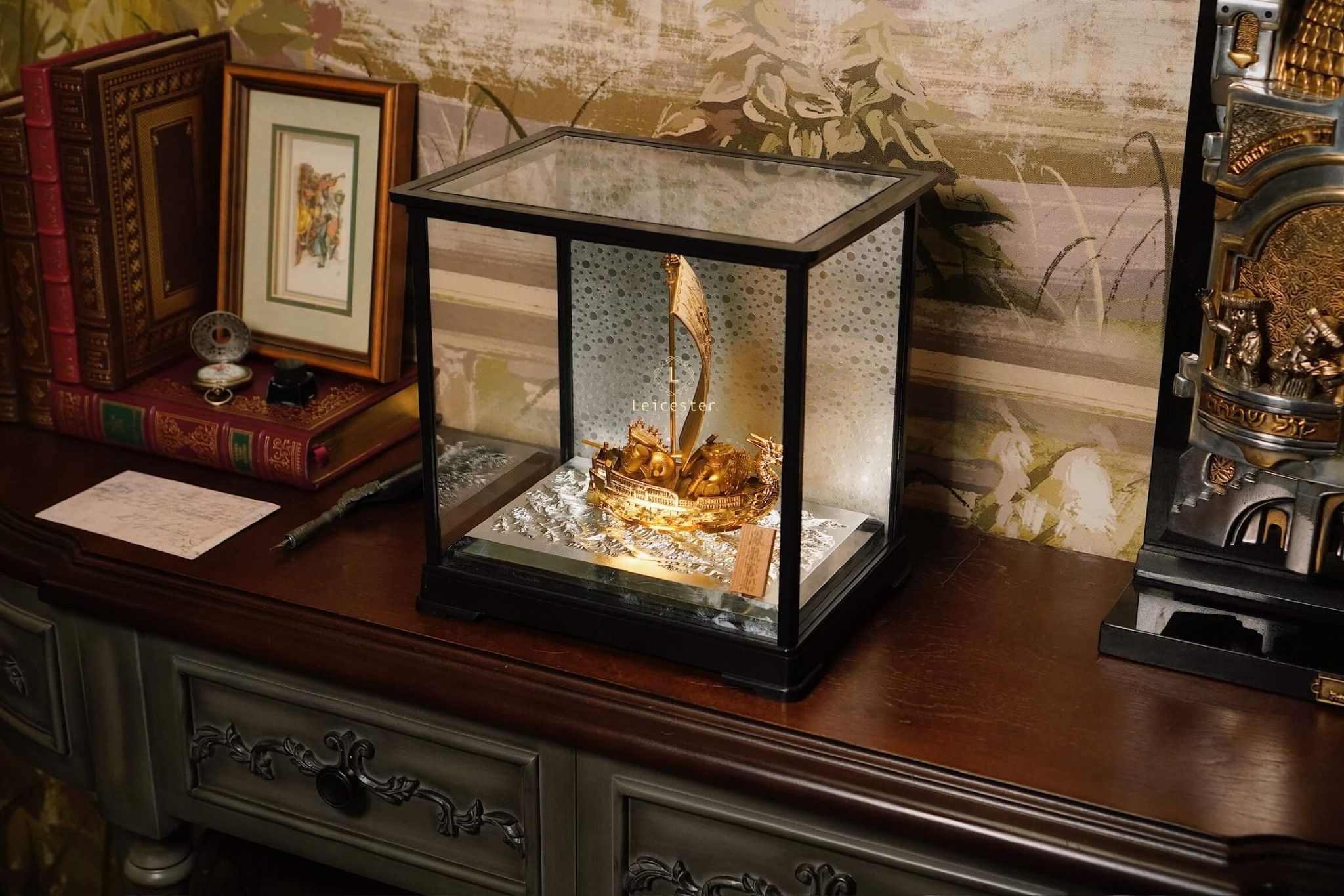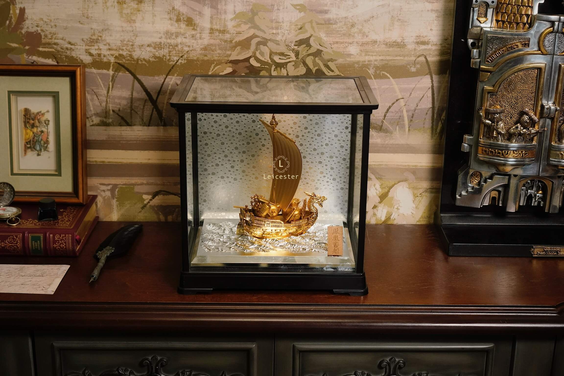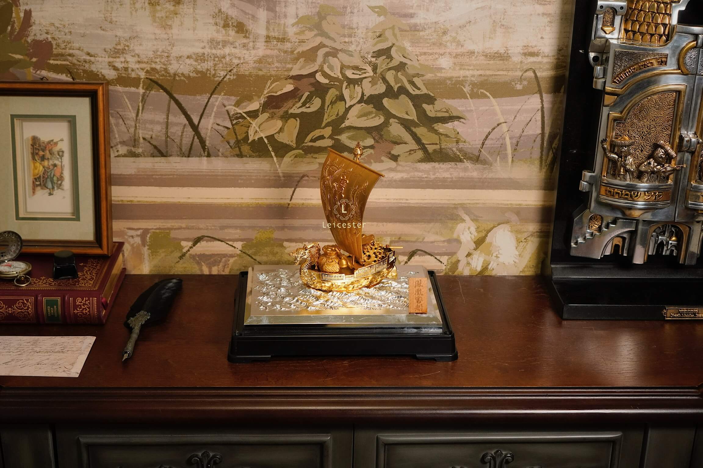 Trong văn hóa Á Đông, đặc biệt là Nhật Bản, hình ảnh “Thuyền Kho Báu” – 宝船 (Takarabune) là biểu tượng thiêng liêng của tài lộc, may mắn và thịnh vượng. Mô hình thuyền được chế tác tinh xảo với sắc vàng óng ánh, đầu rồng chạm trổ uy nghi và cánh buồm lớn khắc chữ “宝” – nghĩa là “bảo vật”, tượng trưng cho của cải dồi dào, kho báu đầy ắp.