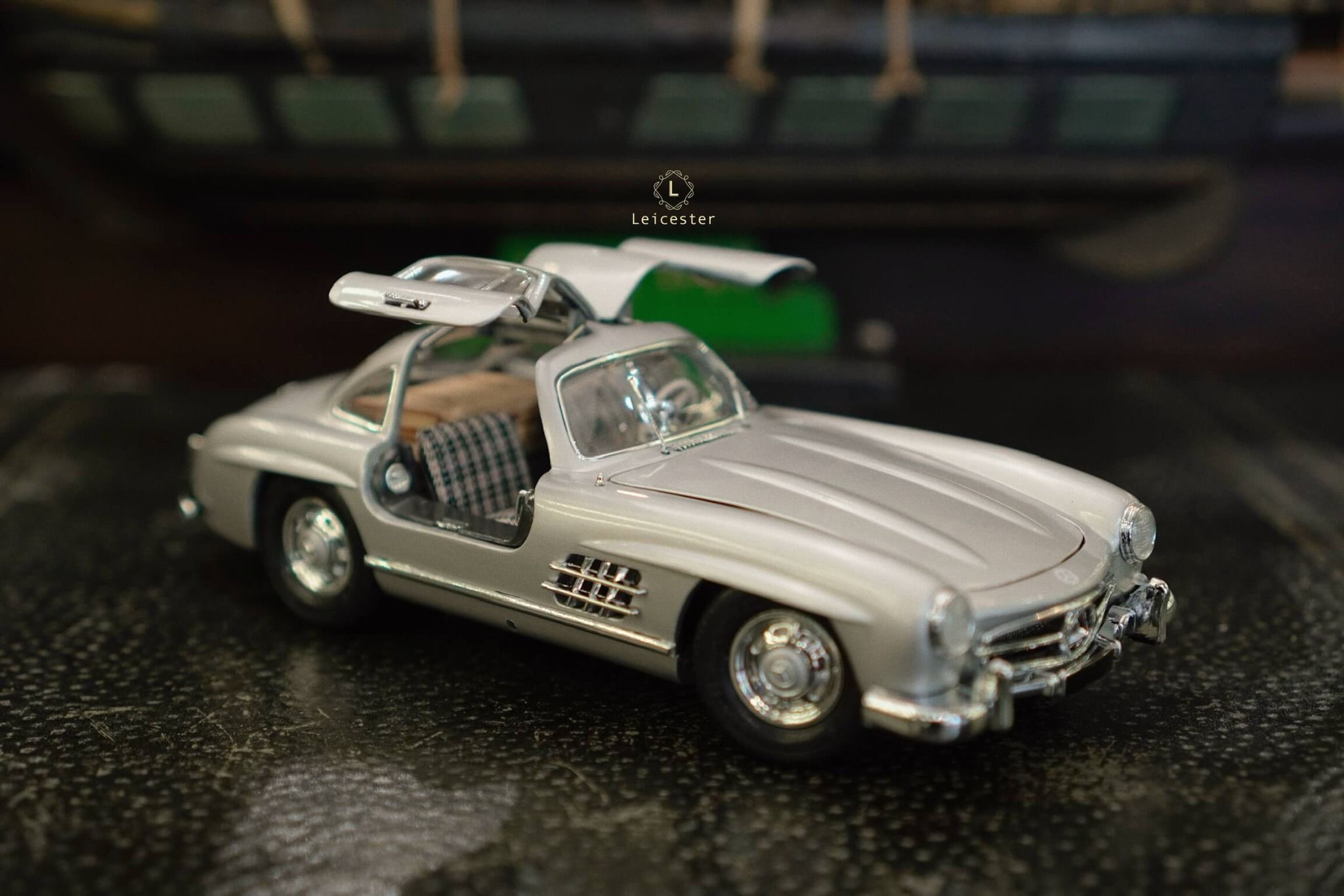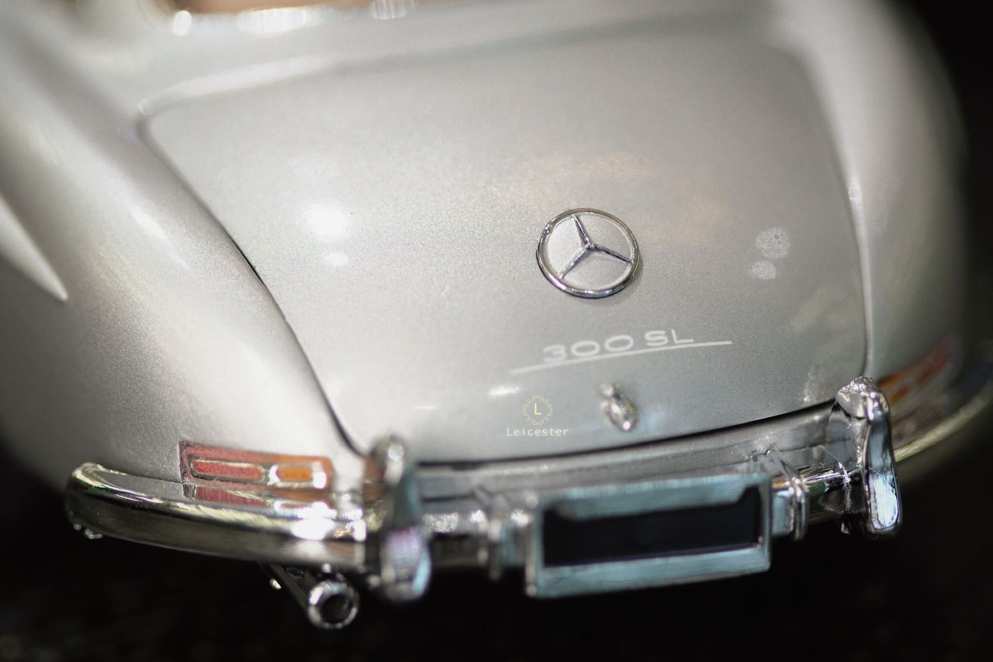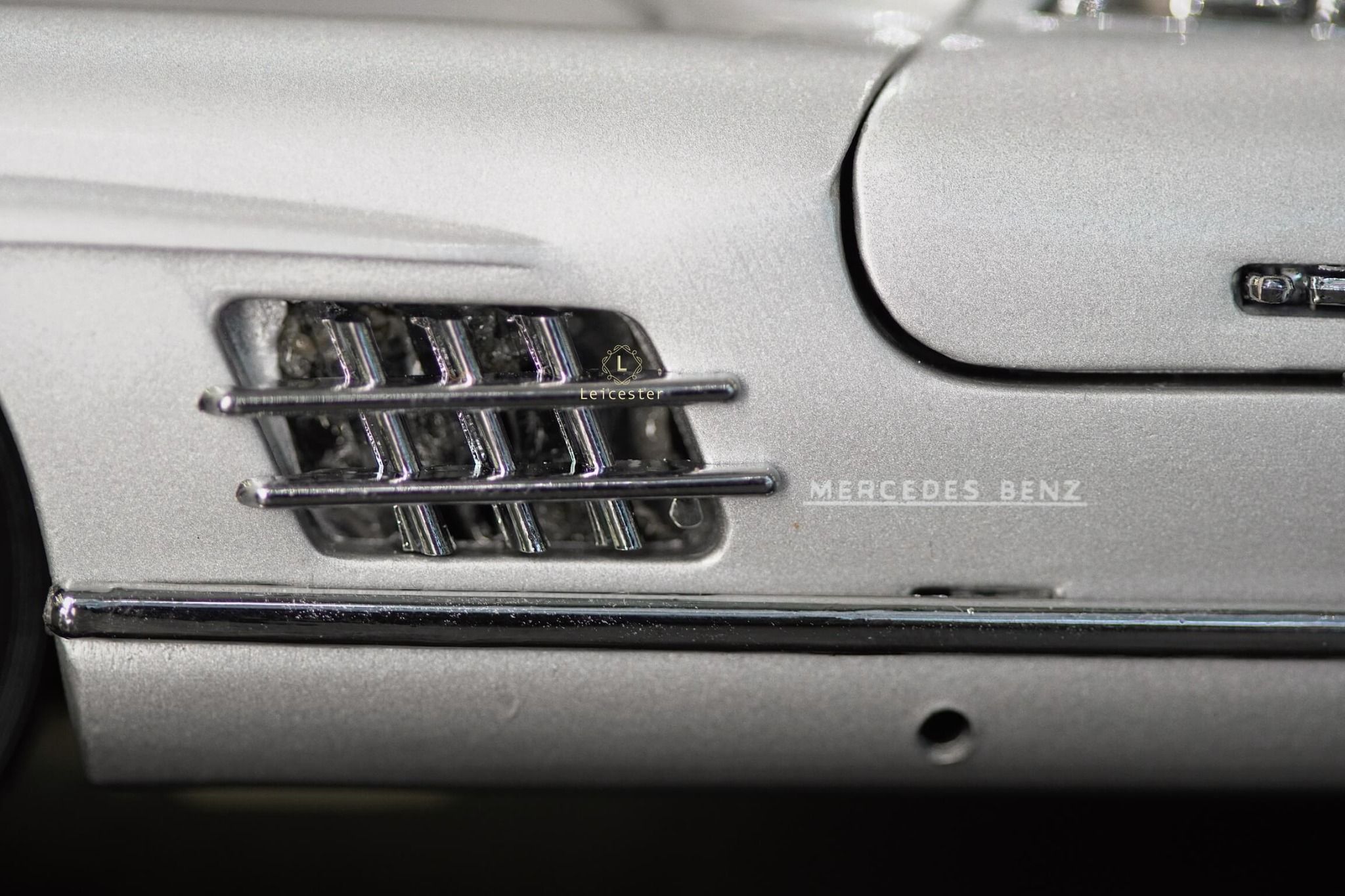 Chiếc Gullwing được săn đón này được tái tạo lại trong một bản sao tỷ lệ 1:24 được thiết kế chính xác, lắp ráp bằng tay từ hơn 150 thành phần riêng biệt từ lớp sơn thể thao hoàn thiện đến động cơ, cánh cửa độc đáo cho đến nội thất sang trọng, hành lý cũng được trang bị tùy chỉnh trong cốp xe.