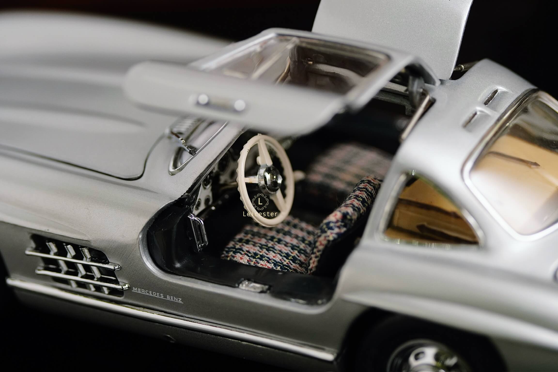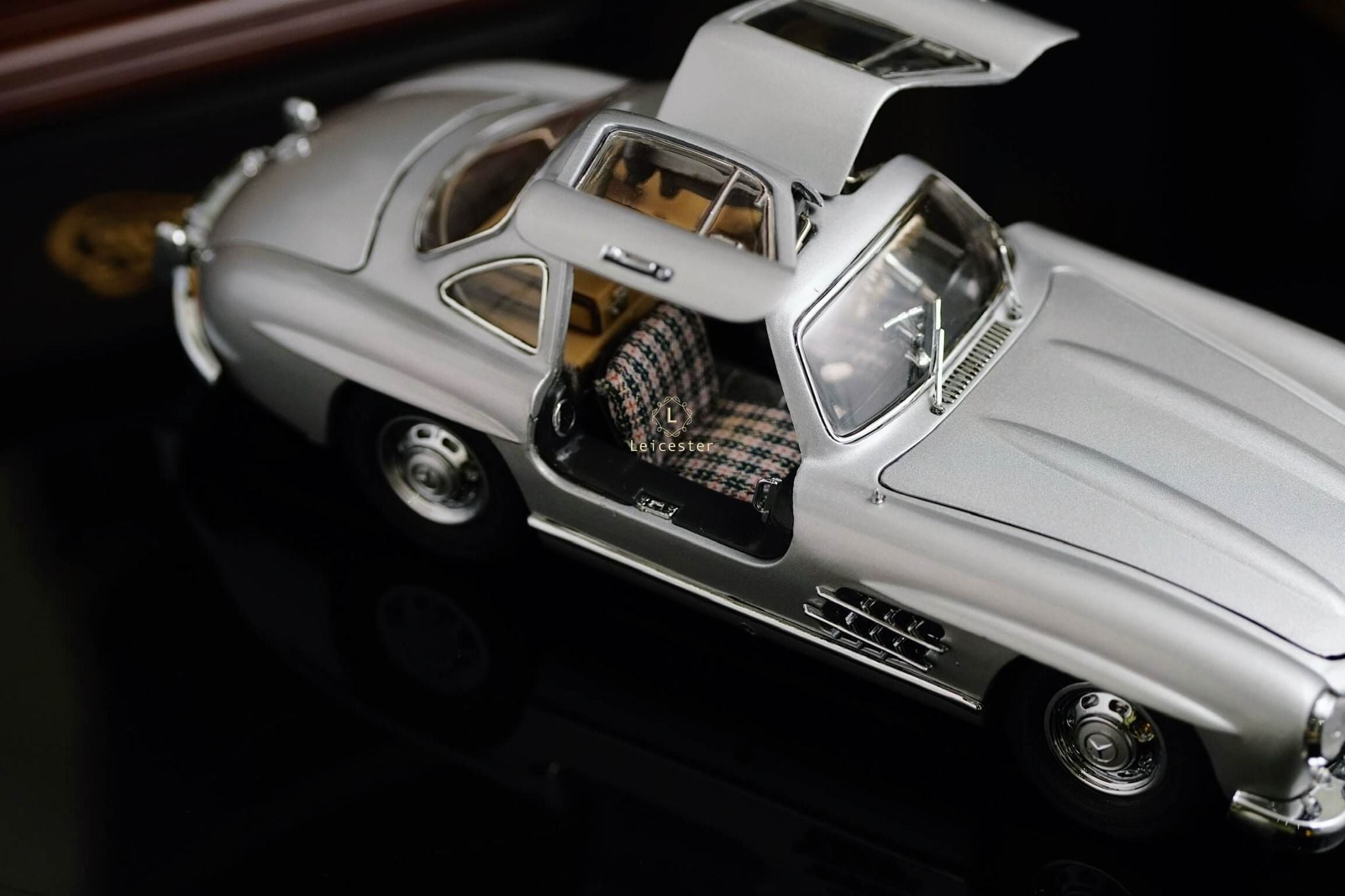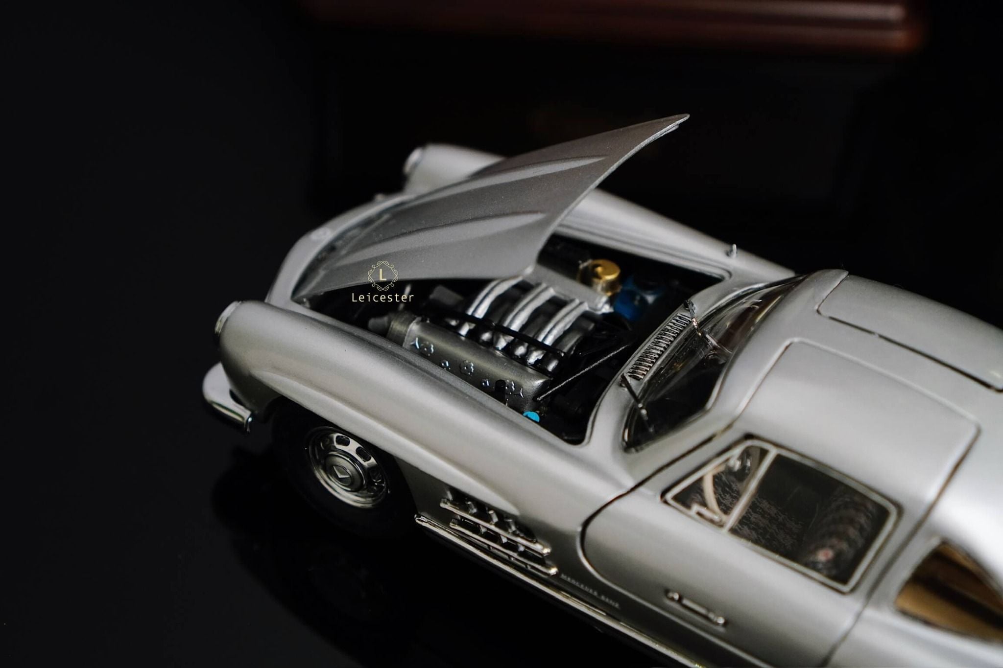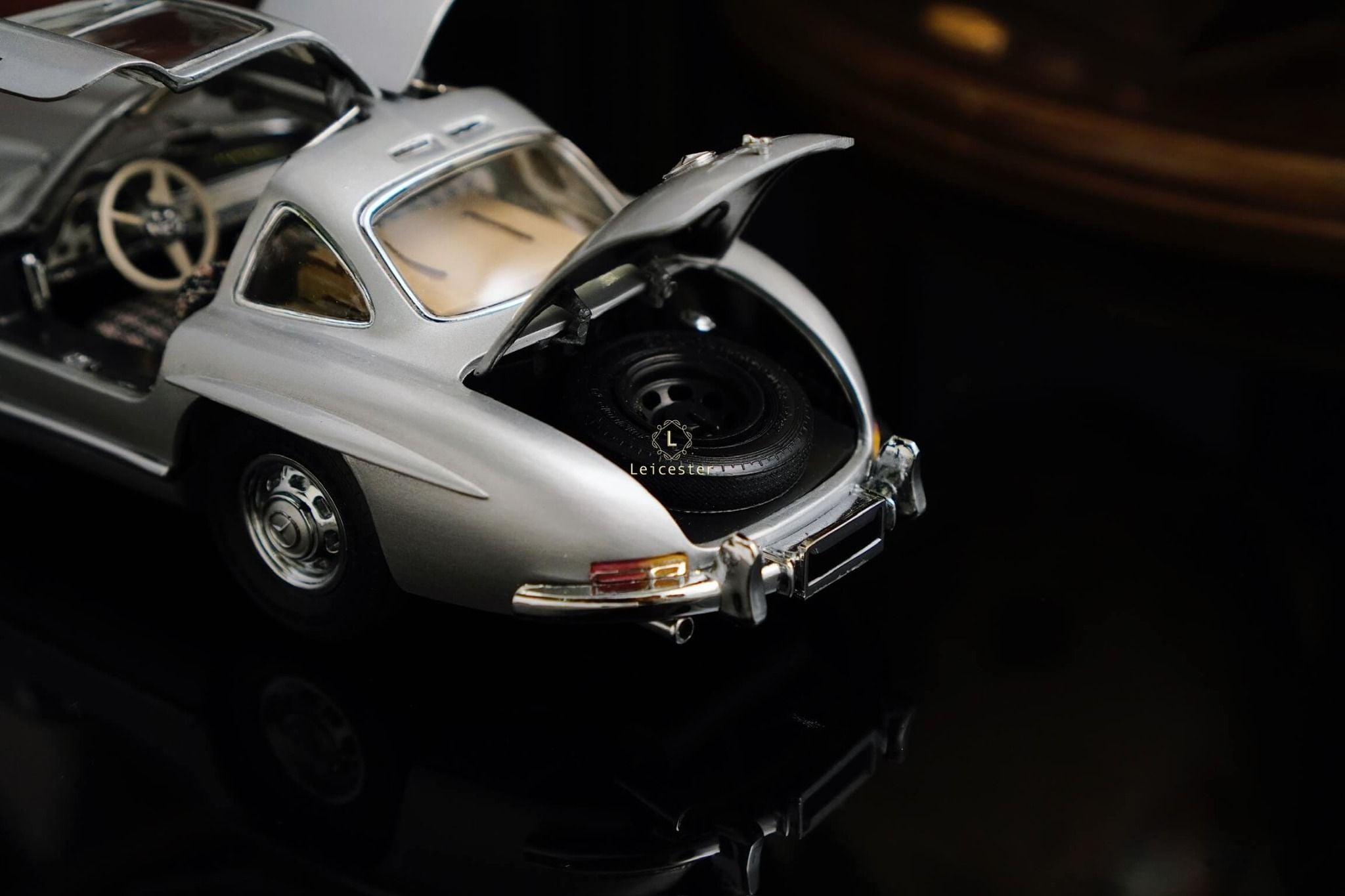 Chiếc Gullwing được săn đón này được tái tạo lại trong một bản sao tỷ lệ 1:24 được thiết kế chính xác, lắp ráp bằng tay từ hơn 150 thành phần riêng biệt từ lớp sơn thể thao hoàn thiện đến động cơ, cánh cửa độc đáo cho đến nội thất sang trọng, hành lý cũng được trang bị tùy chỉnh trong cốp xe.