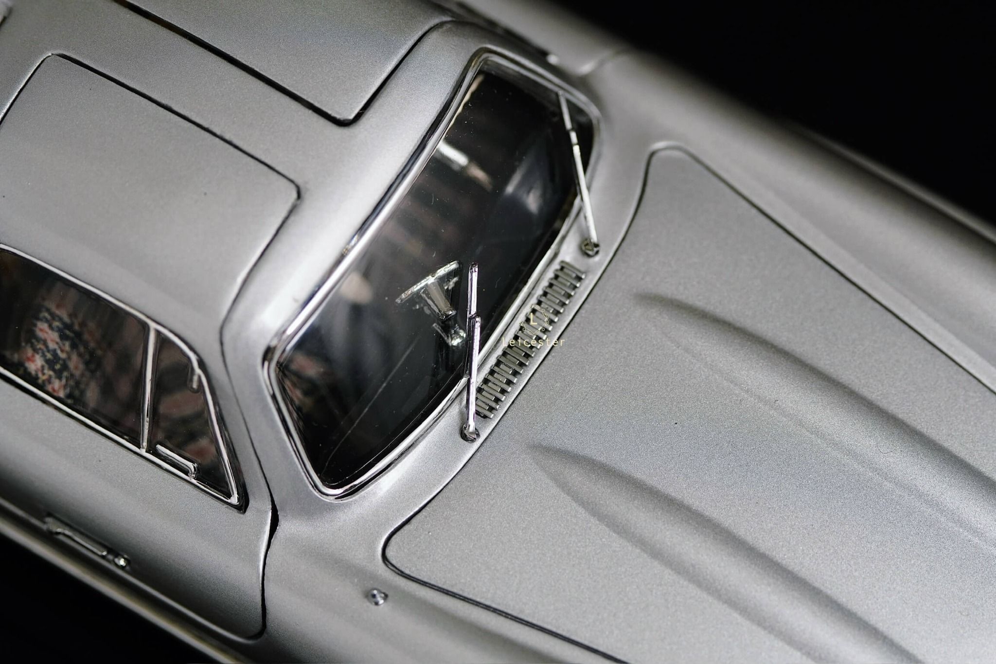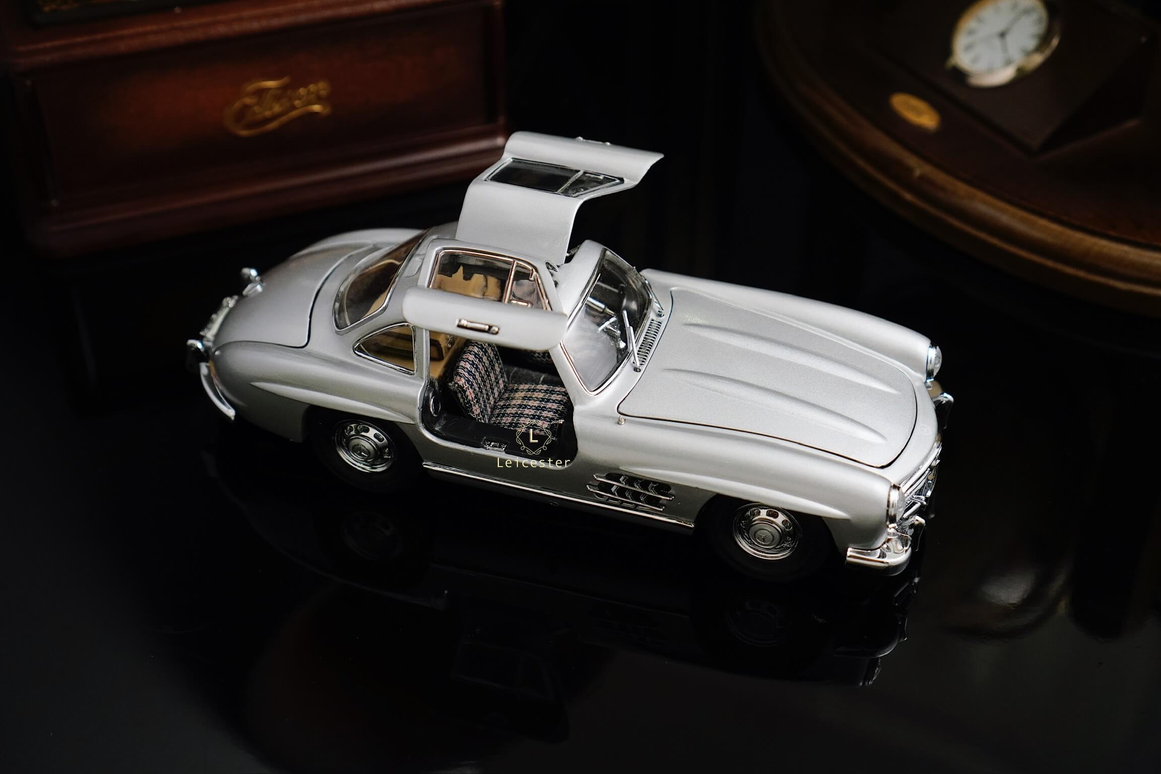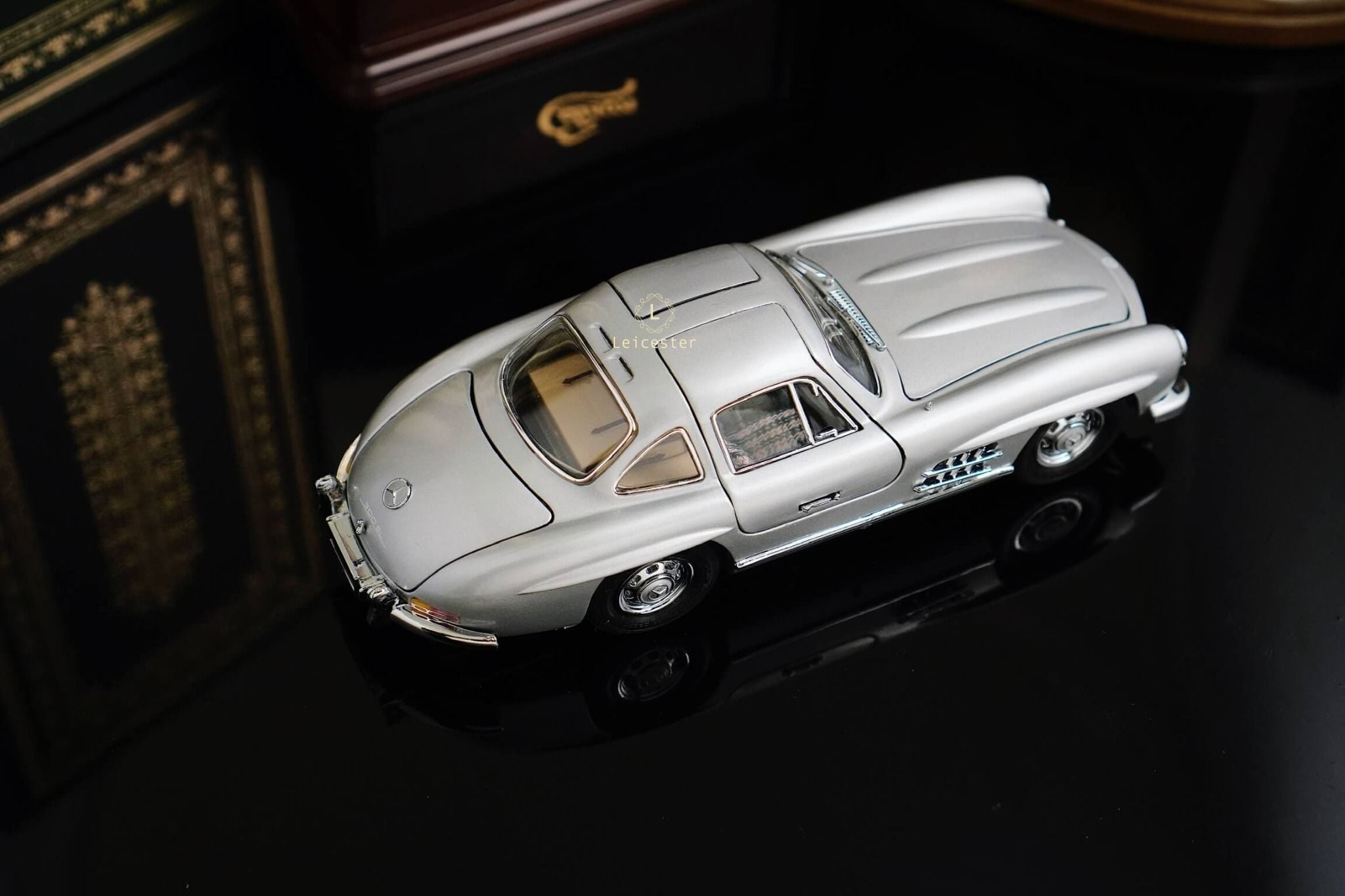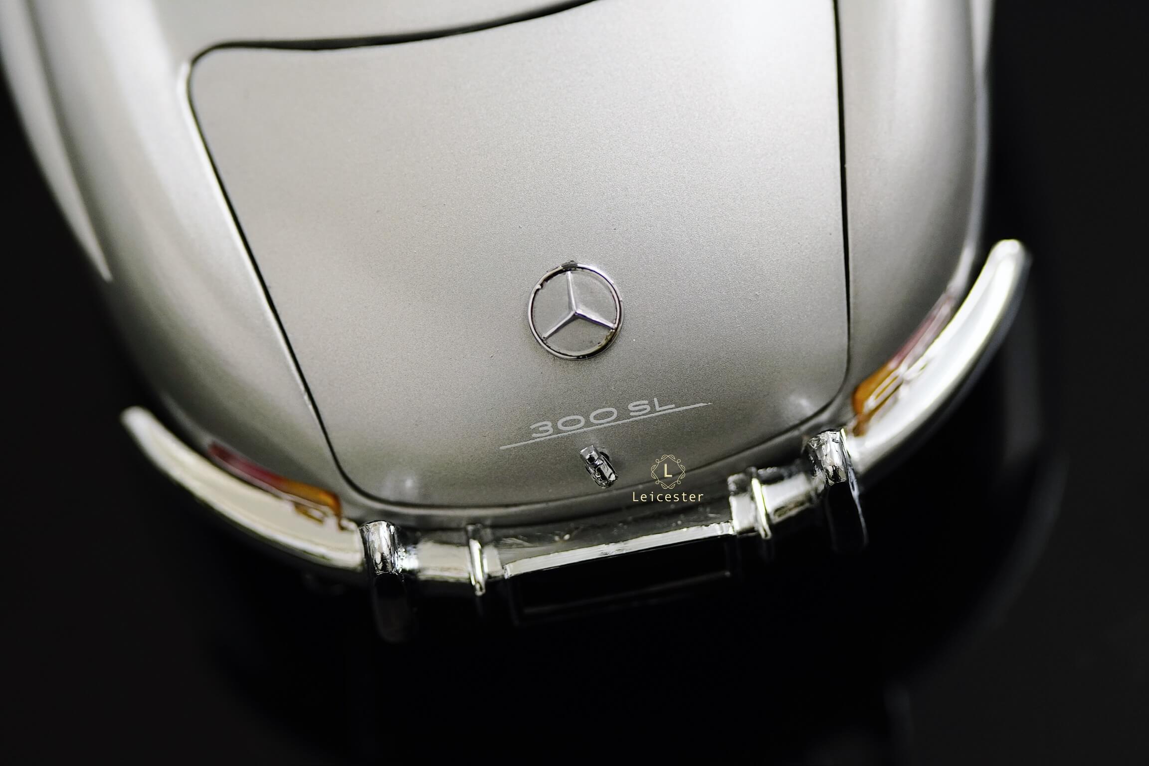 Chiếc Gullwing được săn đón này được tái tạo lại trong một bản sao tỷ lệ 1:24 được thiết kế chính xác, lắp ráp bằng tay từ hơn 150 thành phần riêng biệt từ lớp sơn thể thao hoàn thiện đến động cơ, cánh cửa độc đáo cho đến nội thất sang trọng, hành lý cũng được trang bị tùy chỉnh trong cốp xe.