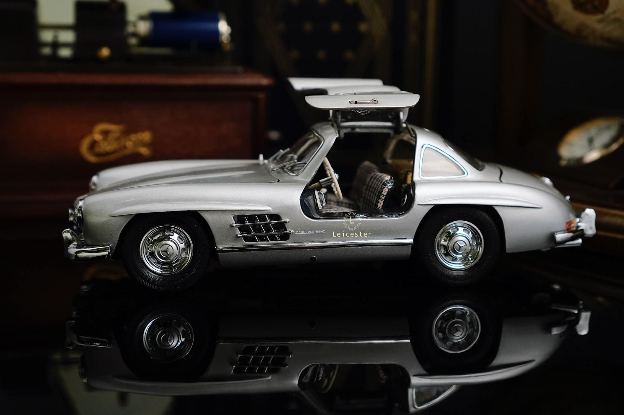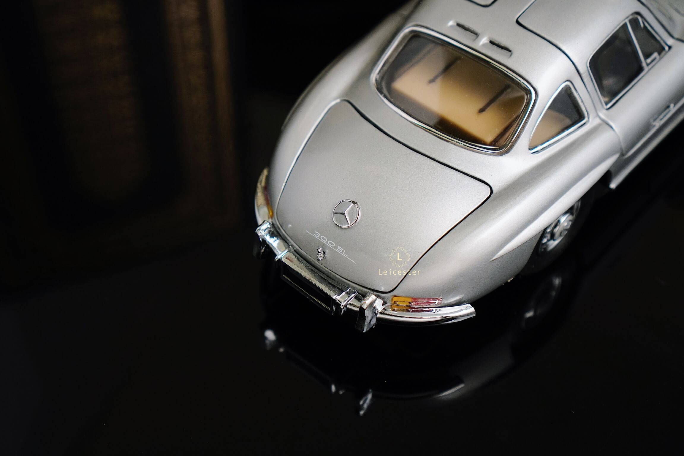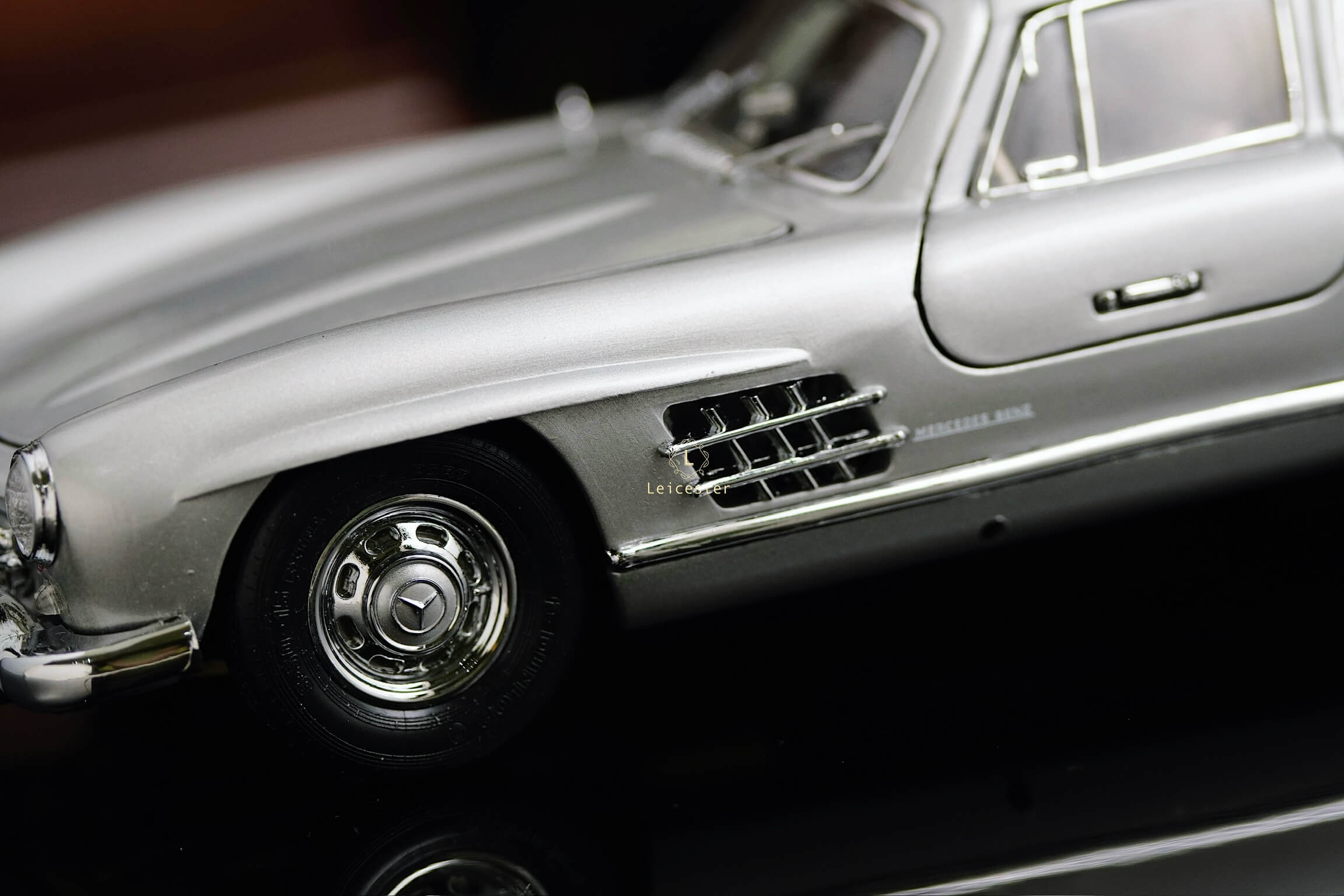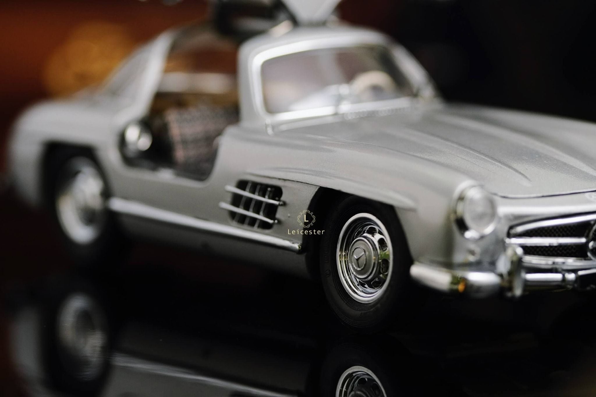 Chiếc Gullwing được săn đón này được tái tạo lại trong một bản sao tỷ lệ 1:24 được thiết kế chính xác, lắp ráp bằng tay từ hơn 150 thành phần riêng biệt từ lớp sơn thể thao hoàn thiện đến động cơ, cánh cửa độc đáo cho đến nội thất sang trọng, hành lý cũng được trang bị tùy chỉnh trong cốp xe.