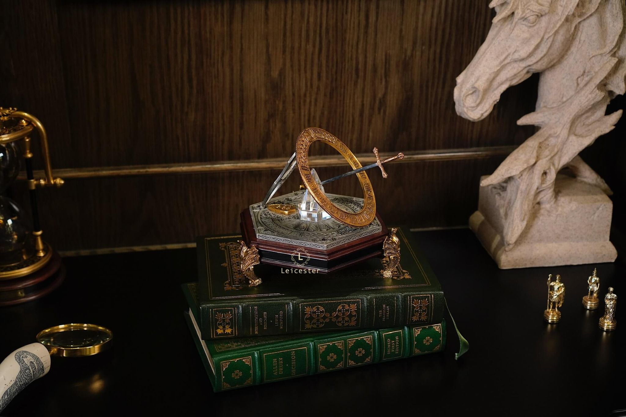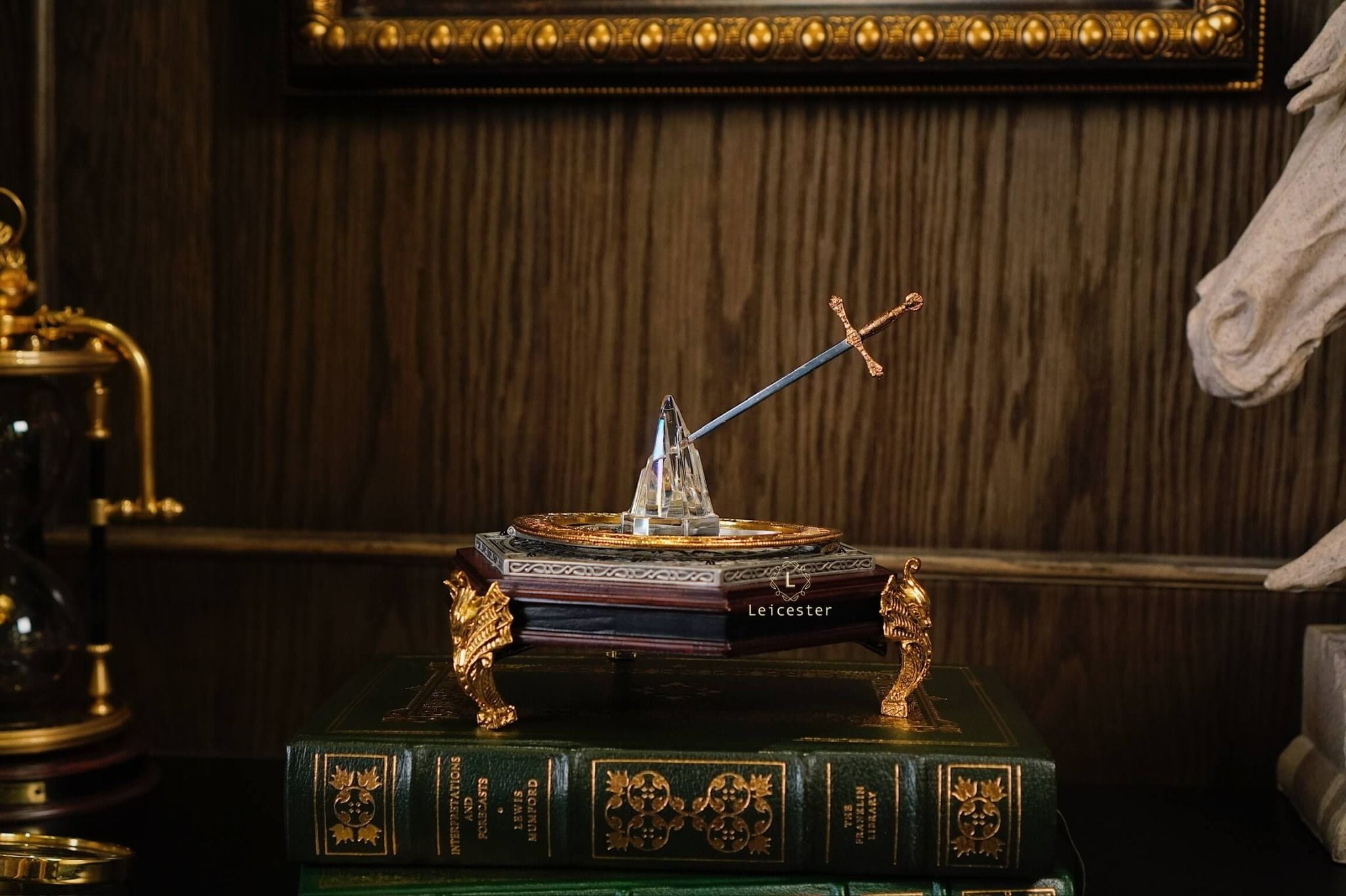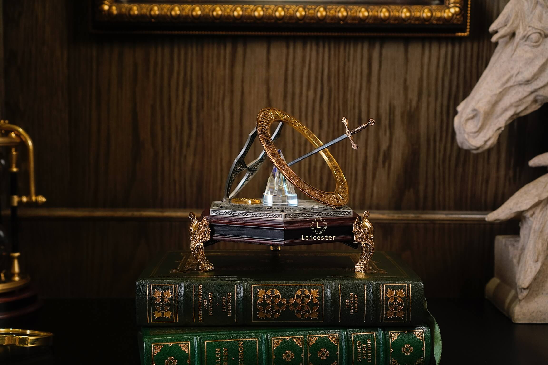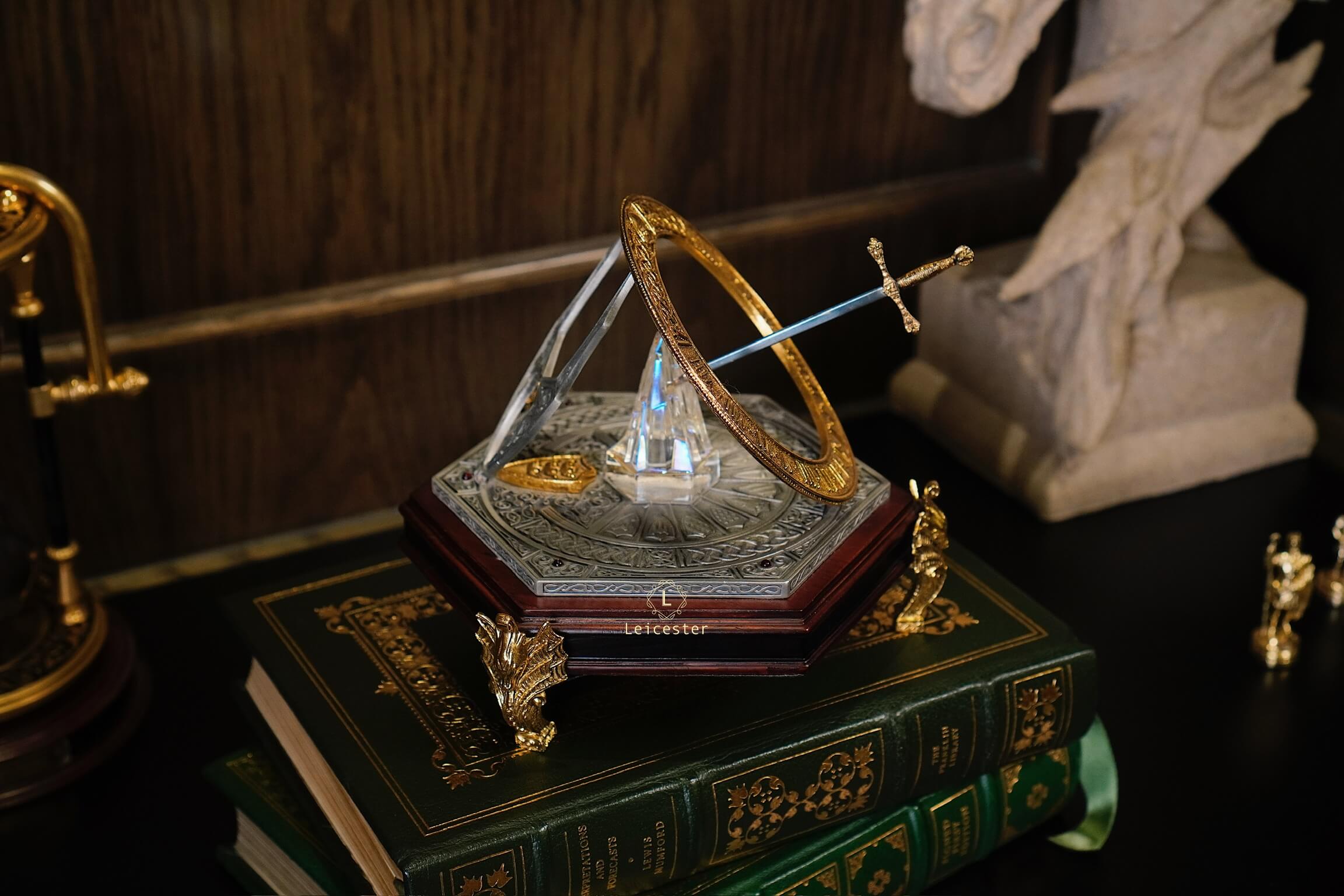The Excalibur Sundial của The Franklin Mint được chế tác tỉ mỉ với thanh kiếm Excalibur như một gnomon được ghim trong 1 tảng đá, phần đế khắc những biểu tượng và họa tiết liên quan đến Vua Arthur và Hiệp sĩ Bàn tròn, giúp sản phẩm không chỉ là một tác phẩm trang trí mà còn là thiết bị đo thời gian, là sự kết hợp giữa nghệ thuật, lịch sử và chức năng.