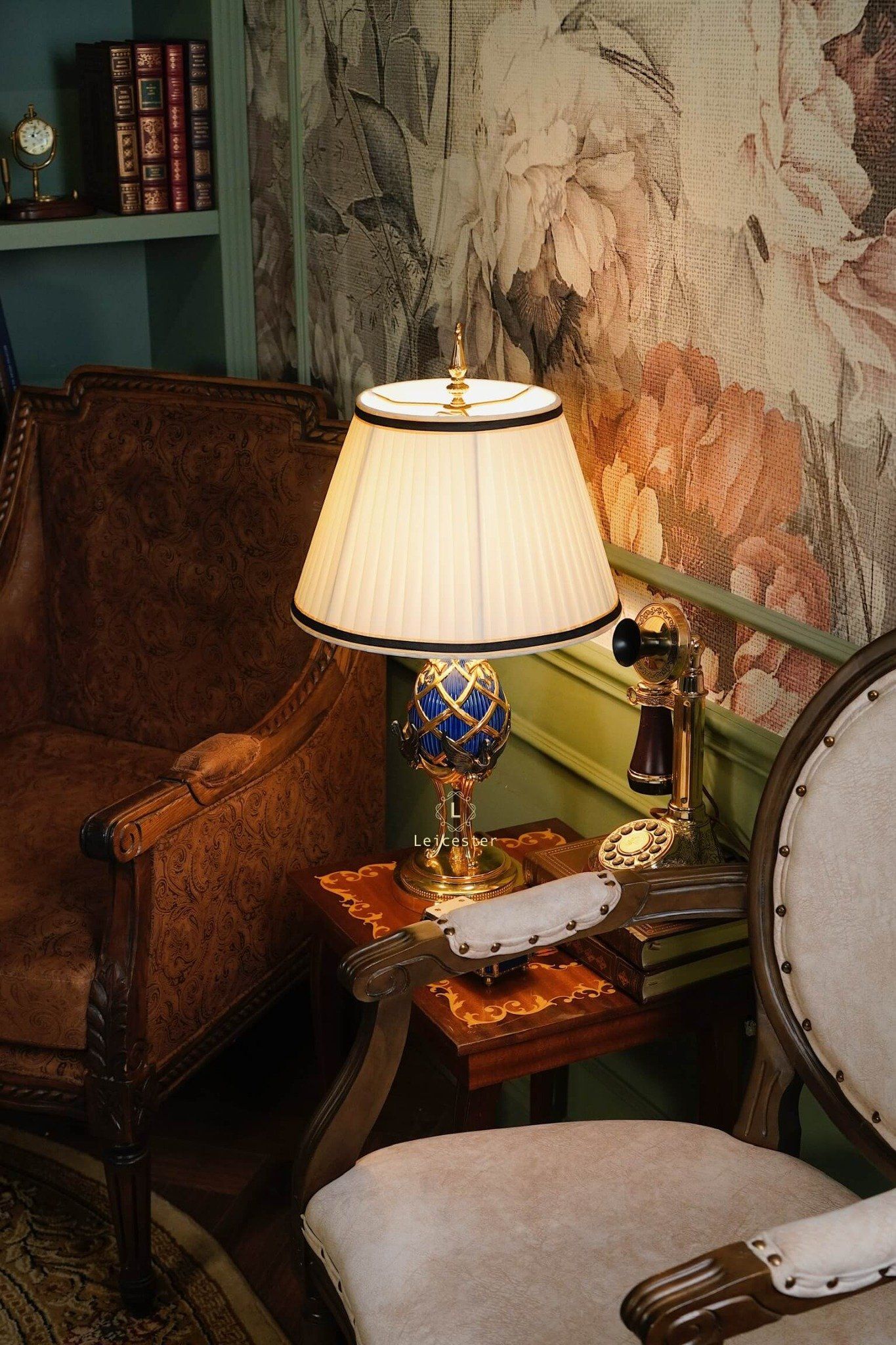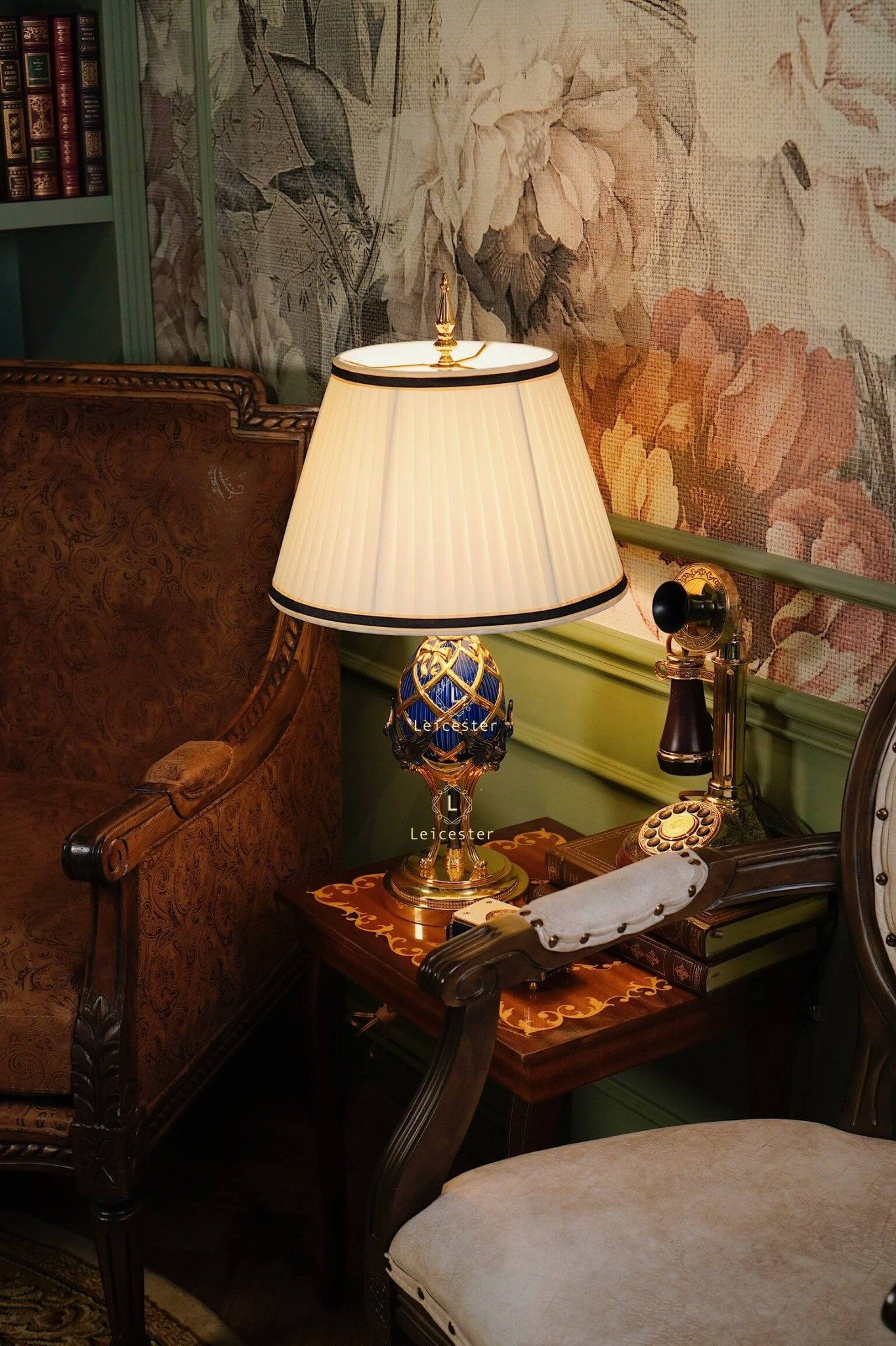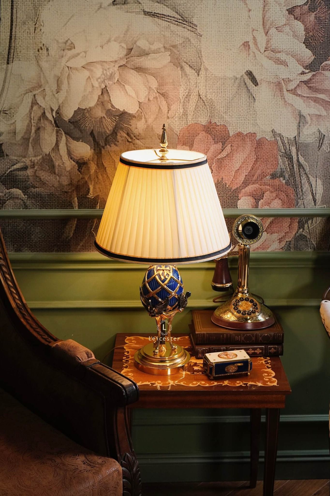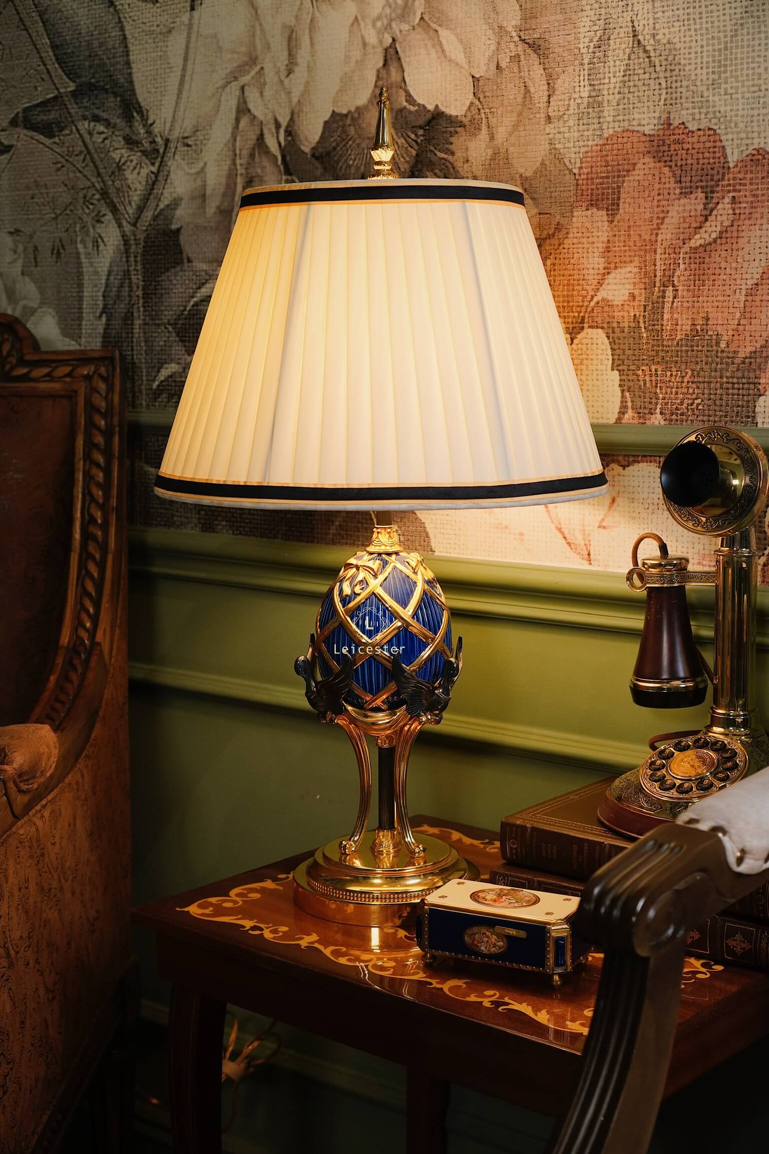 Phần thân đèn mô phỏng quả trứng hoàng gia – biểu tượng của sự thịnh vượng, trường tồn và sang trọng tuyệt đối. Họa tiết lưới vàng đan quanh thân trứng kết hợp hình chim đại bàng ôm giữ tạo nên vẻ đẹp quyền lực và đầy nghệ thuật. Đế đèn chế tác từ kim loại mạ vàng, độ hoàn thiện sắc nét, mang đến vẻ đẹp hài hòa, vừa cổ điển vừa quý phái theo đúng tinh thần vintage châu Âu.