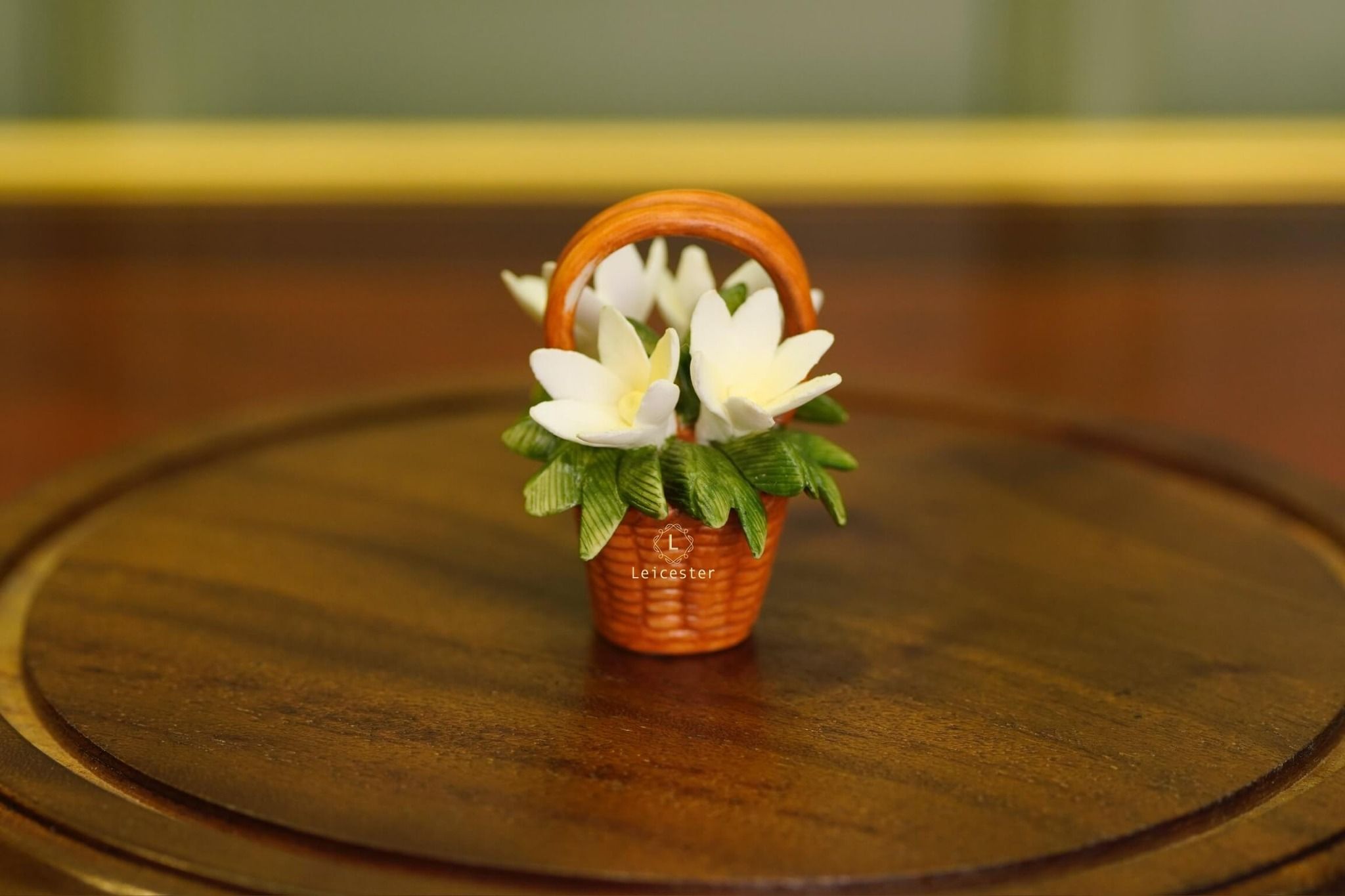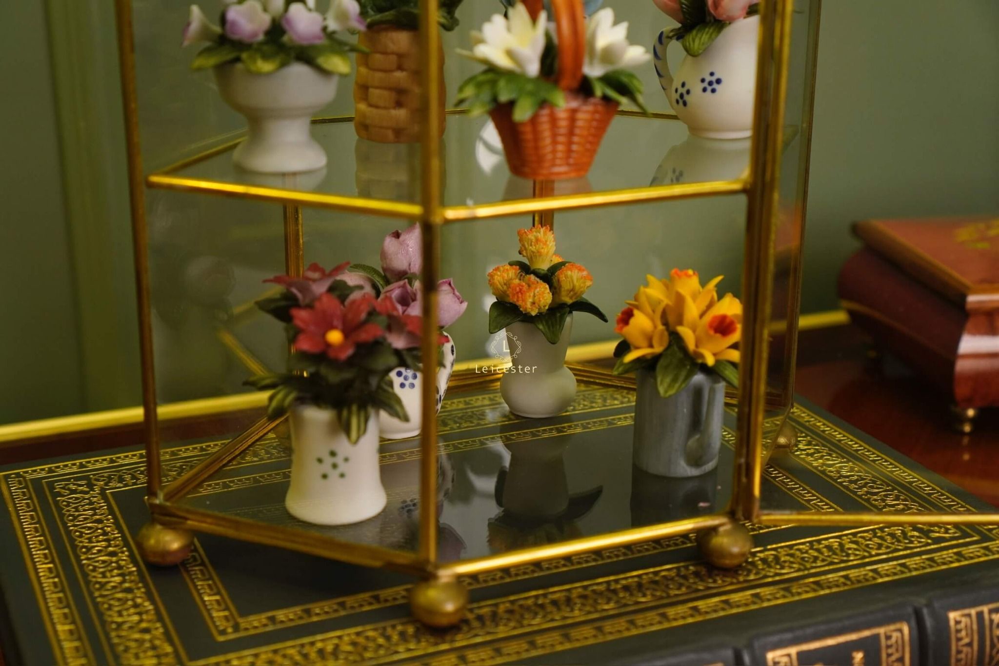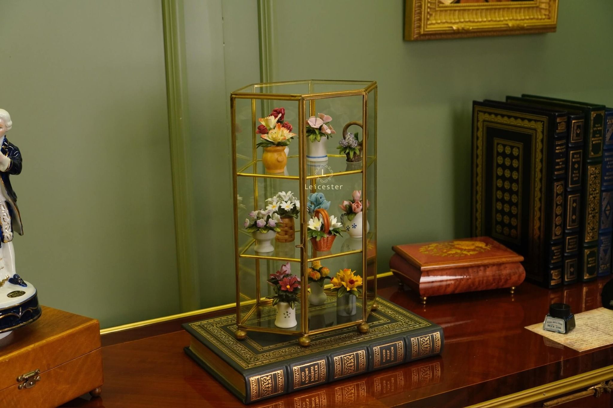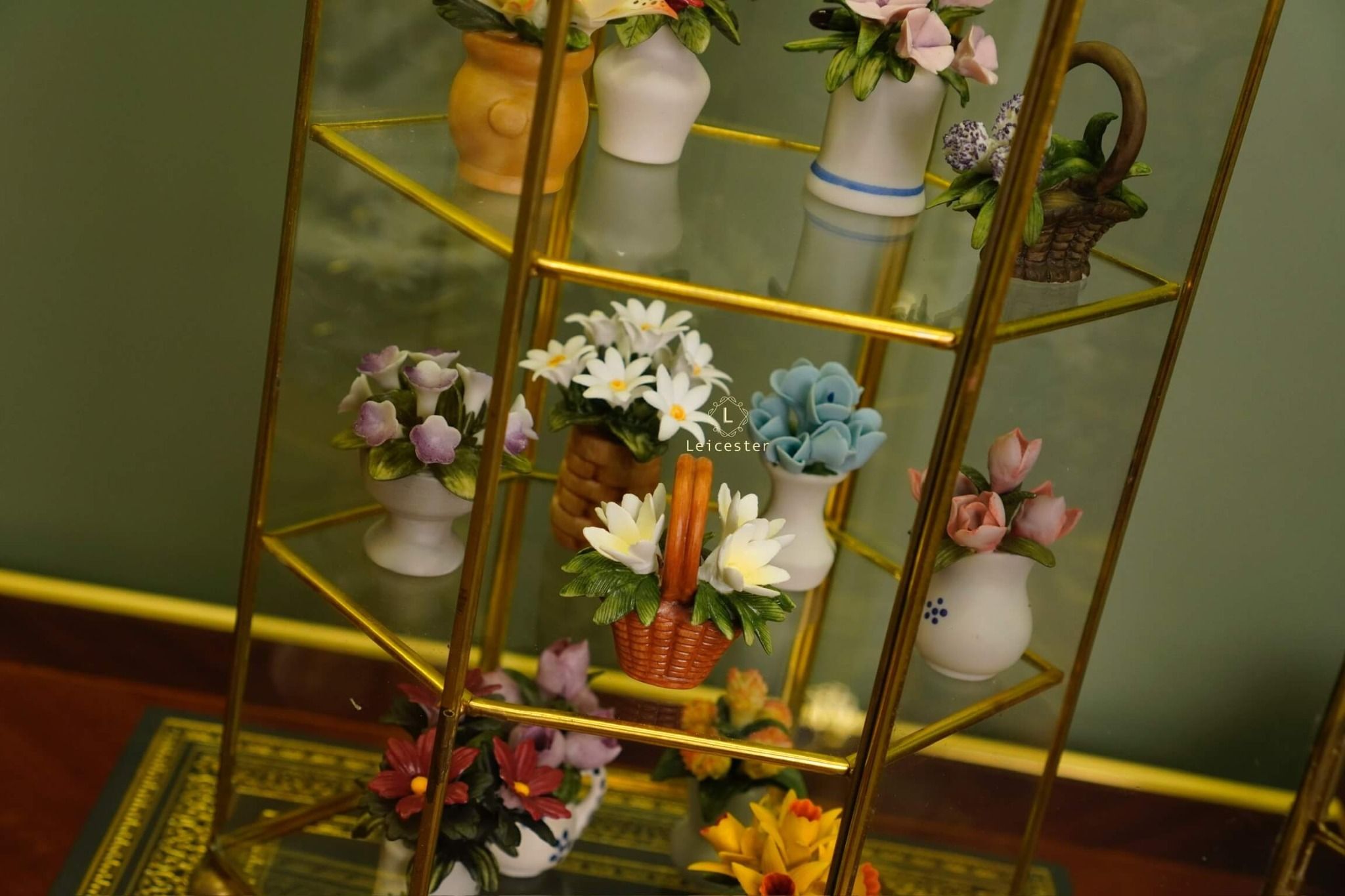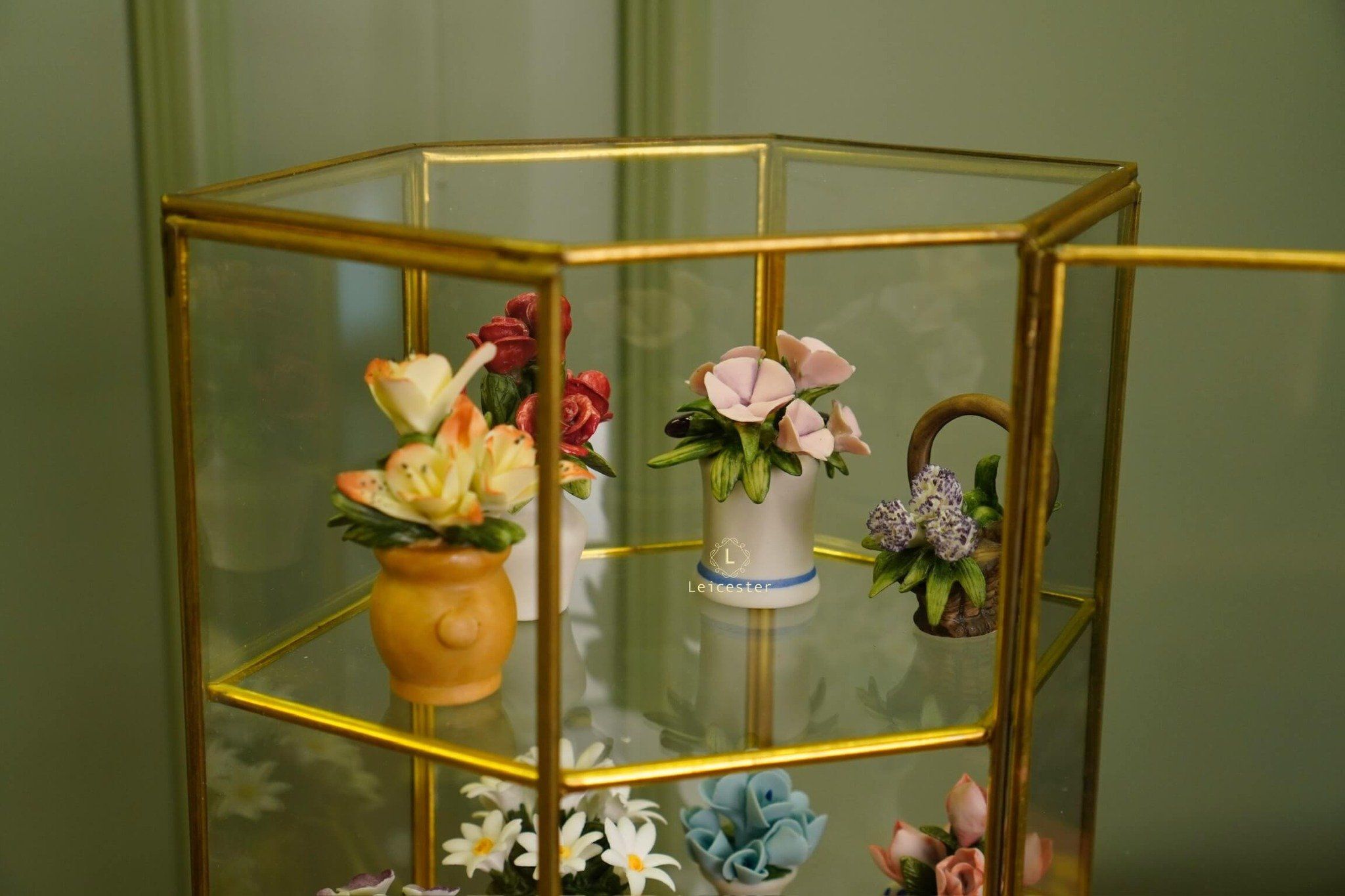 Bộ sưu tập gồm 13 mô hình hoa sứ thủ công, đại diện cho 12 tháng trong năm, được chế tác bằng gốm sứ cao cấp, nhuộm màu thủ công và tạo hình mềm mại đến từng cánh hoa. Từ giỏ hoa thủ công đến những chiếc bình mini, mỗi mẫu đều mang sắc thái riêng biệt, như một lát cắt tinh tế của bốn mùa. Tất cả được trưng bày trong một tủ kính 6 cạnh viền đồng ánh kim, tạo nên bố cục trang nhã và thanh lịch như một góc triển lãm thu nhỏ giữa đời sống hiện đại.
