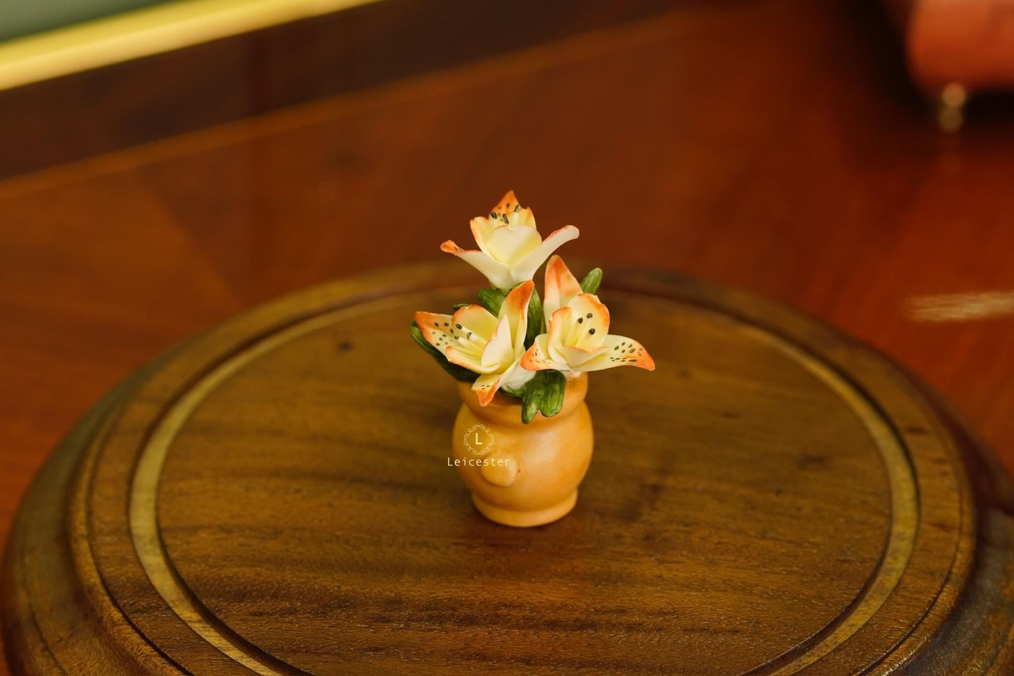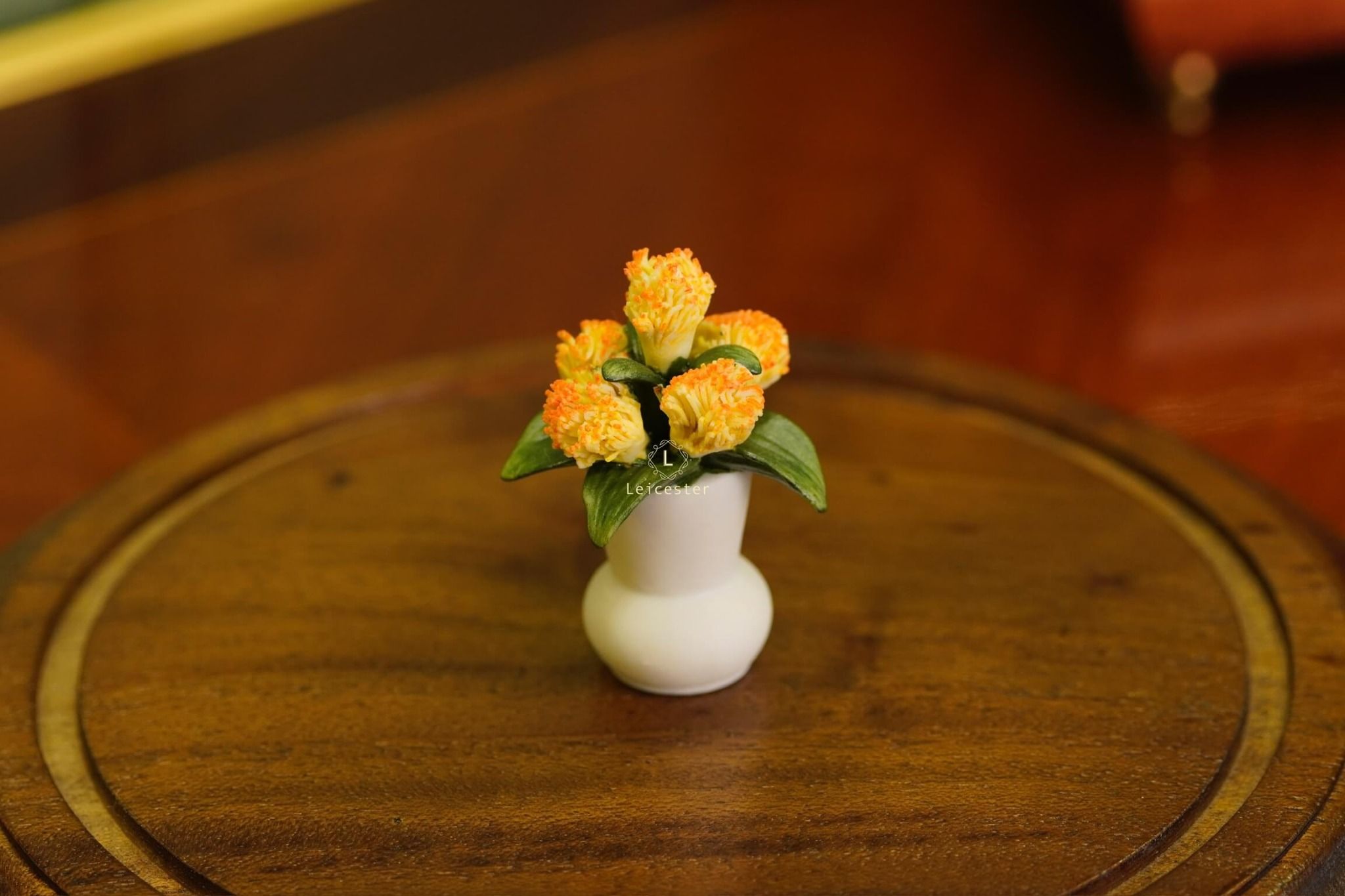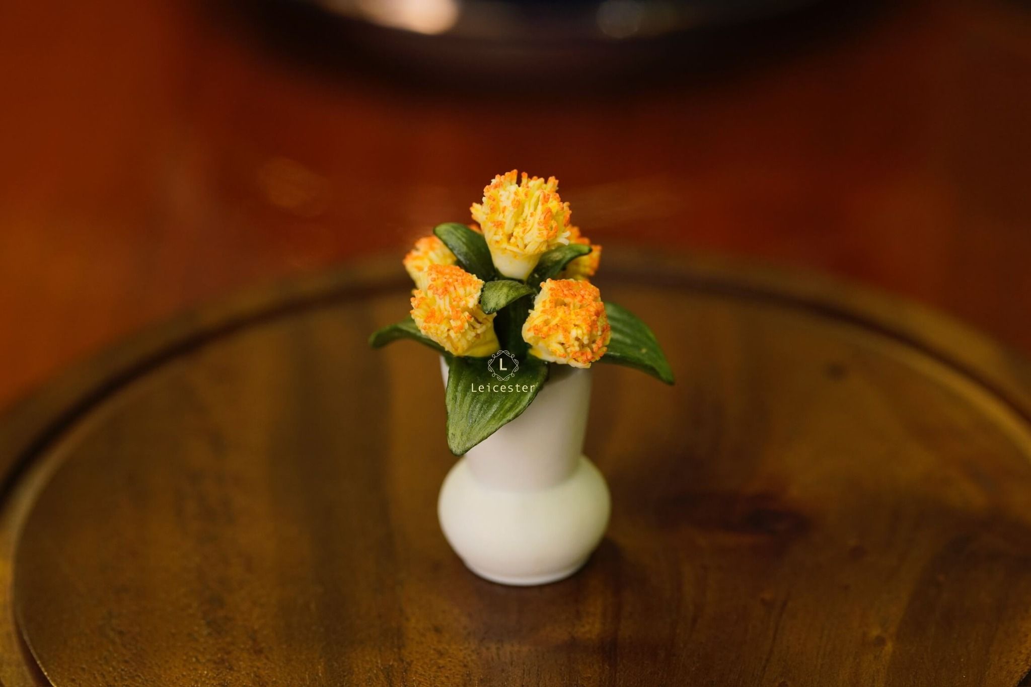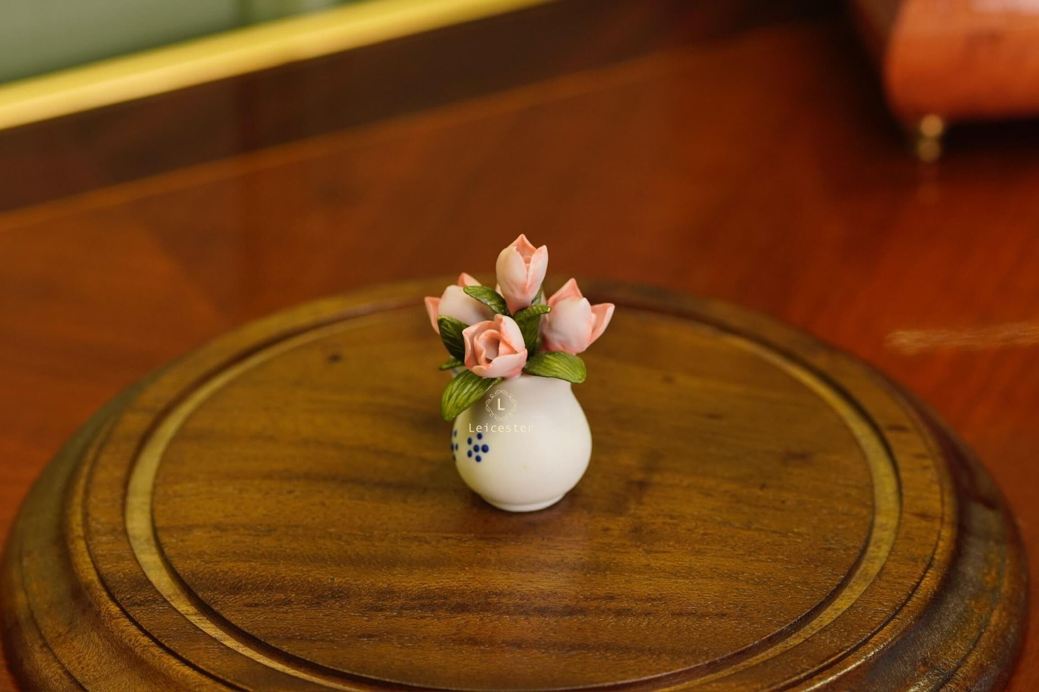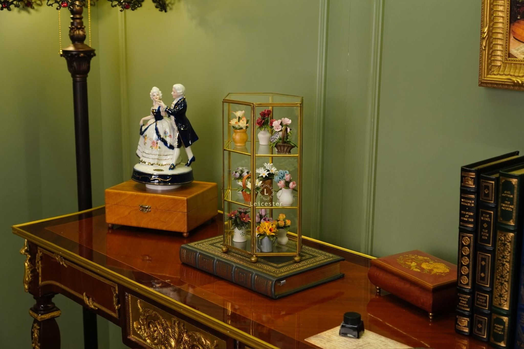 Bộ sưu tập gồm 13 mô hình hoa sứ thủ công, đại diện cho 12 tháng trong năm, được chế tác bằng gốm sứ cao cấp, nhuộm màu thủ công và tạo hình mềm mại đến từng cánh hoa. Từ giỏ hoa thủ công đến những chiếc bình mini, mỗi mẫu đều mang sắc thái riêng biệt, như một lát cắt tinh tế của bốn mùa. Tất cả được trưng bày trong một tủ kính 6 cạnh viền đồng ánh kim, tạo nên bố cục trang nhã và thanh lịch như một góc triển lãm thu nhỏ giữa đời sống hiện đại.